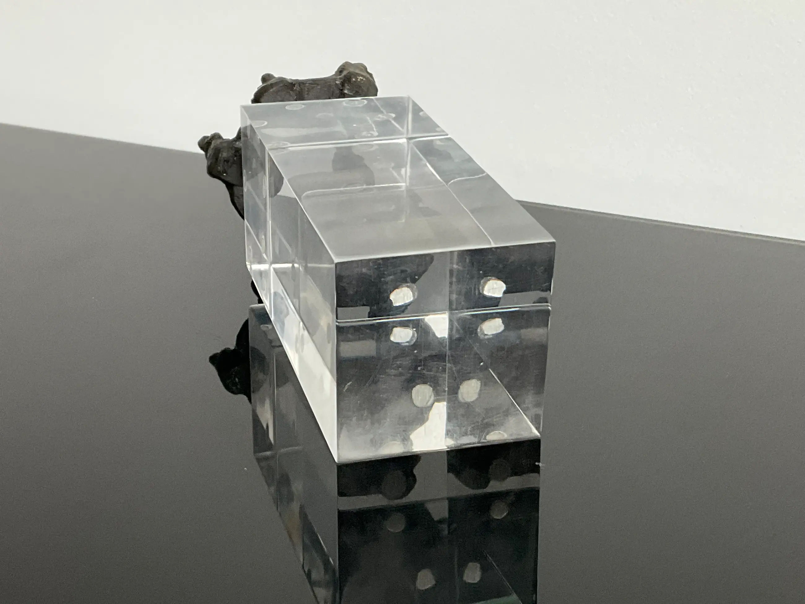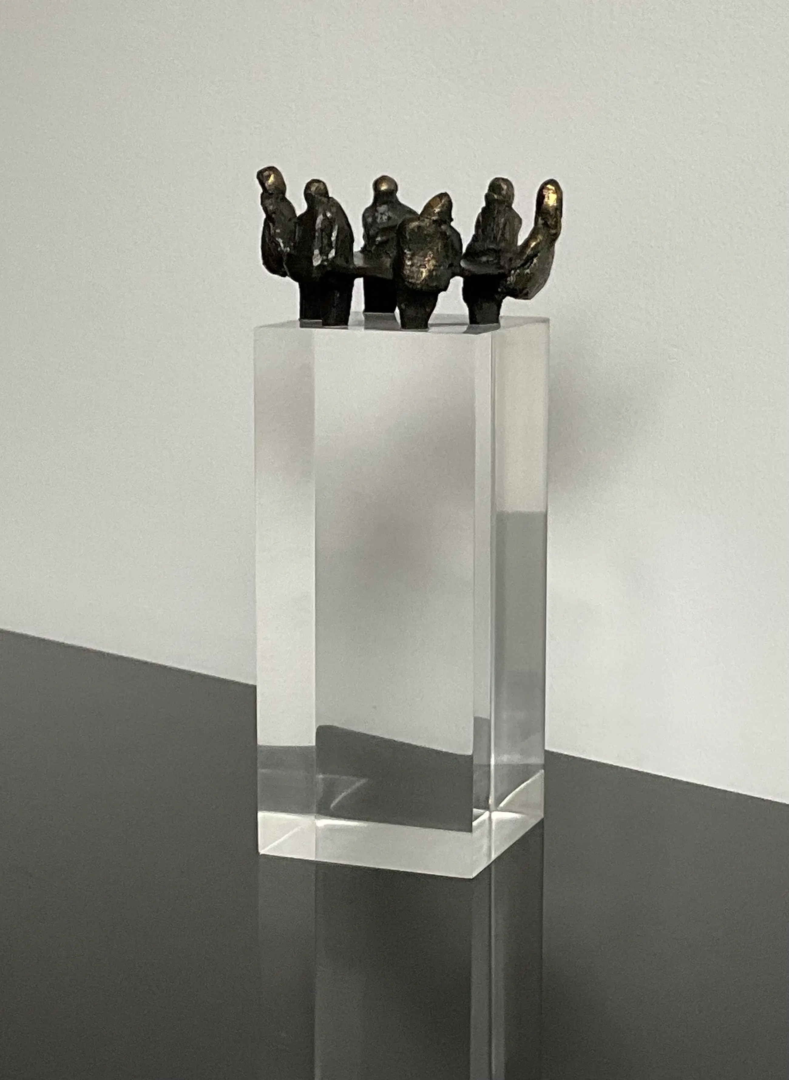 Een verbronsd beeldje van Corry Ammerlaan op een perspex sokkel van 4 cm x 4 cm x 9 cm.