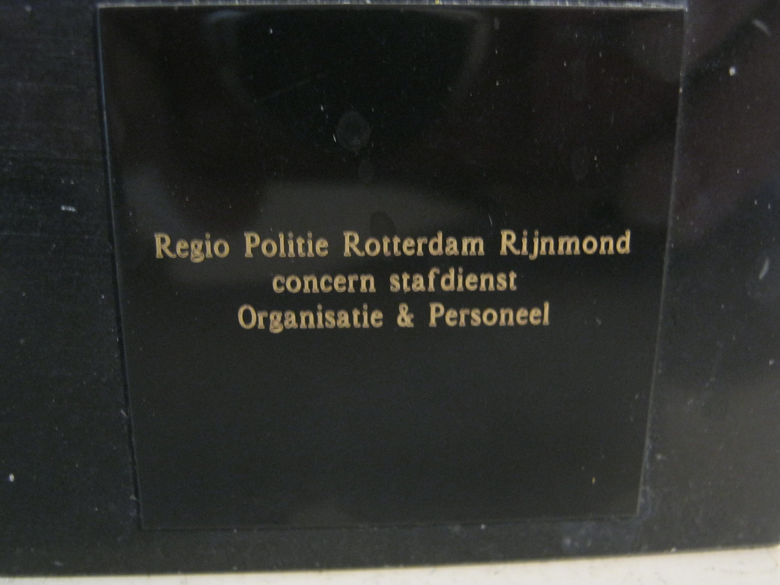 In opdracht vervaardigd voor Regio Politie Rotterdam Rijnmond. Er zit een plaatje hiervan op de sokkel, dit kan desgewenst verwijderd worden.