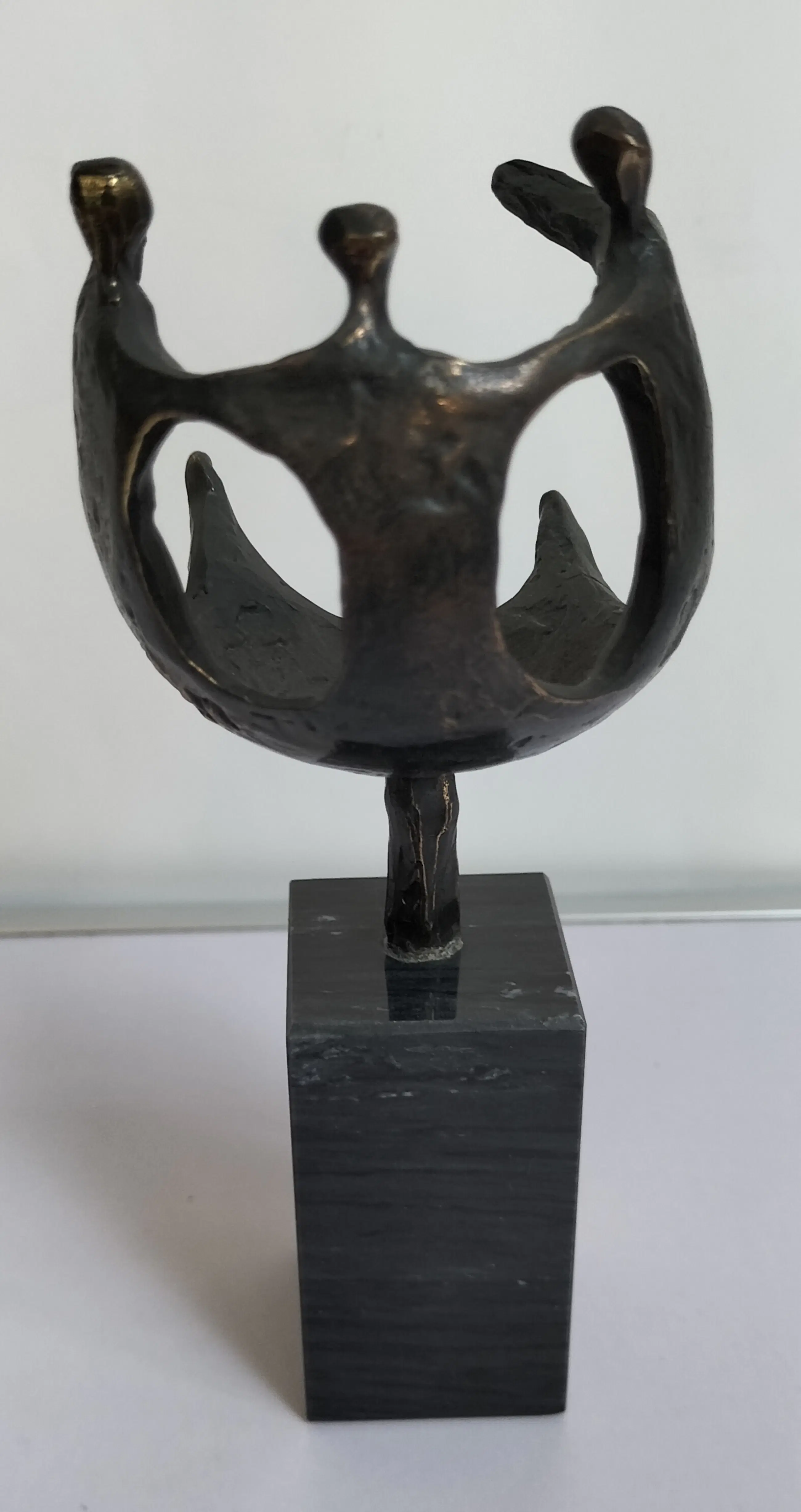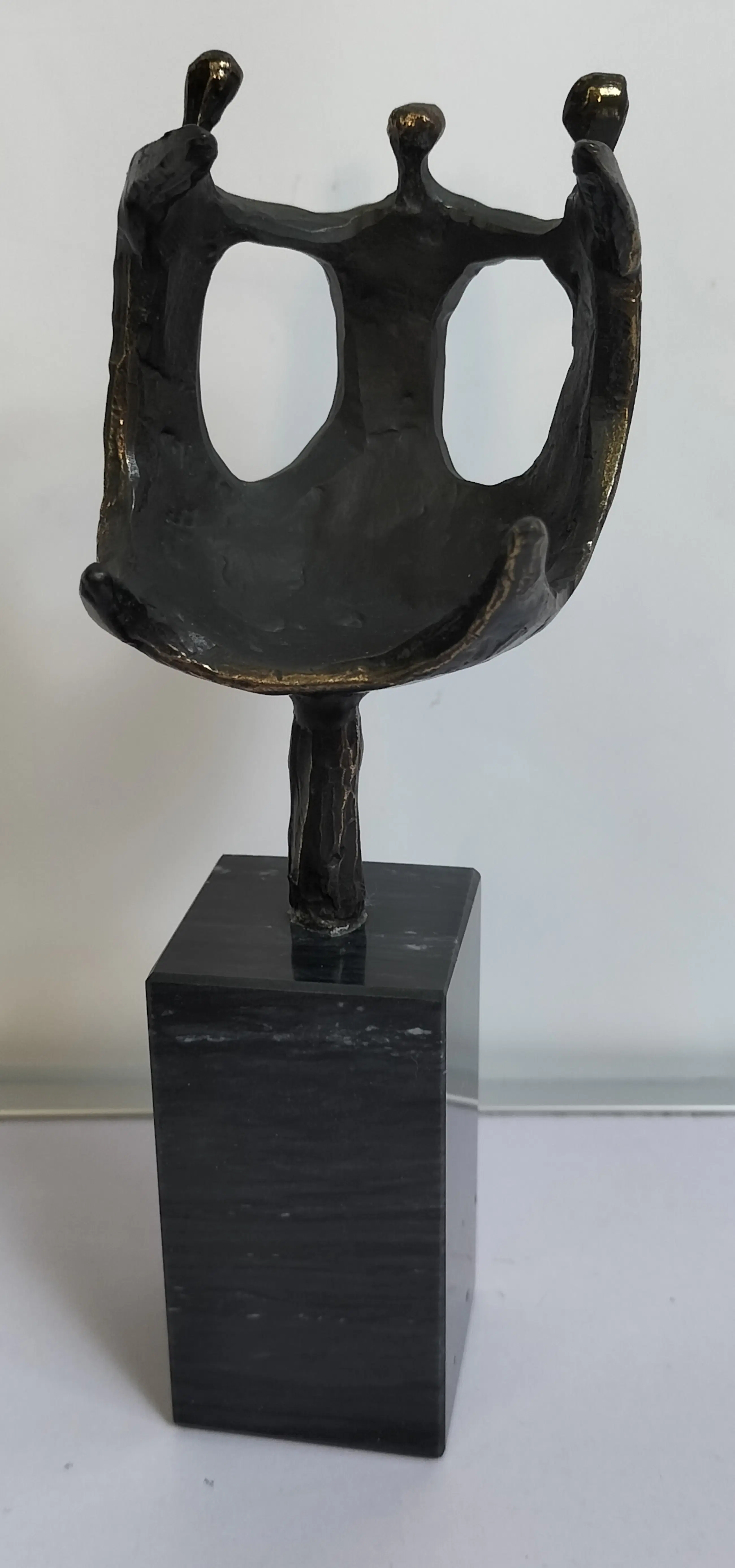 Fraai beeldje van Corry Ammerlaan, voorstellend drie menselijke figuren die hand in hand staan. De titels lopen nogal uiteen, "Samen" lijkt mij de meest toepasselijke. Het beeldje staat op een rechthoekige marmeren voet, waarvan het fluweel aan de onderzijde wat afgesleten is (zie laatste foto).