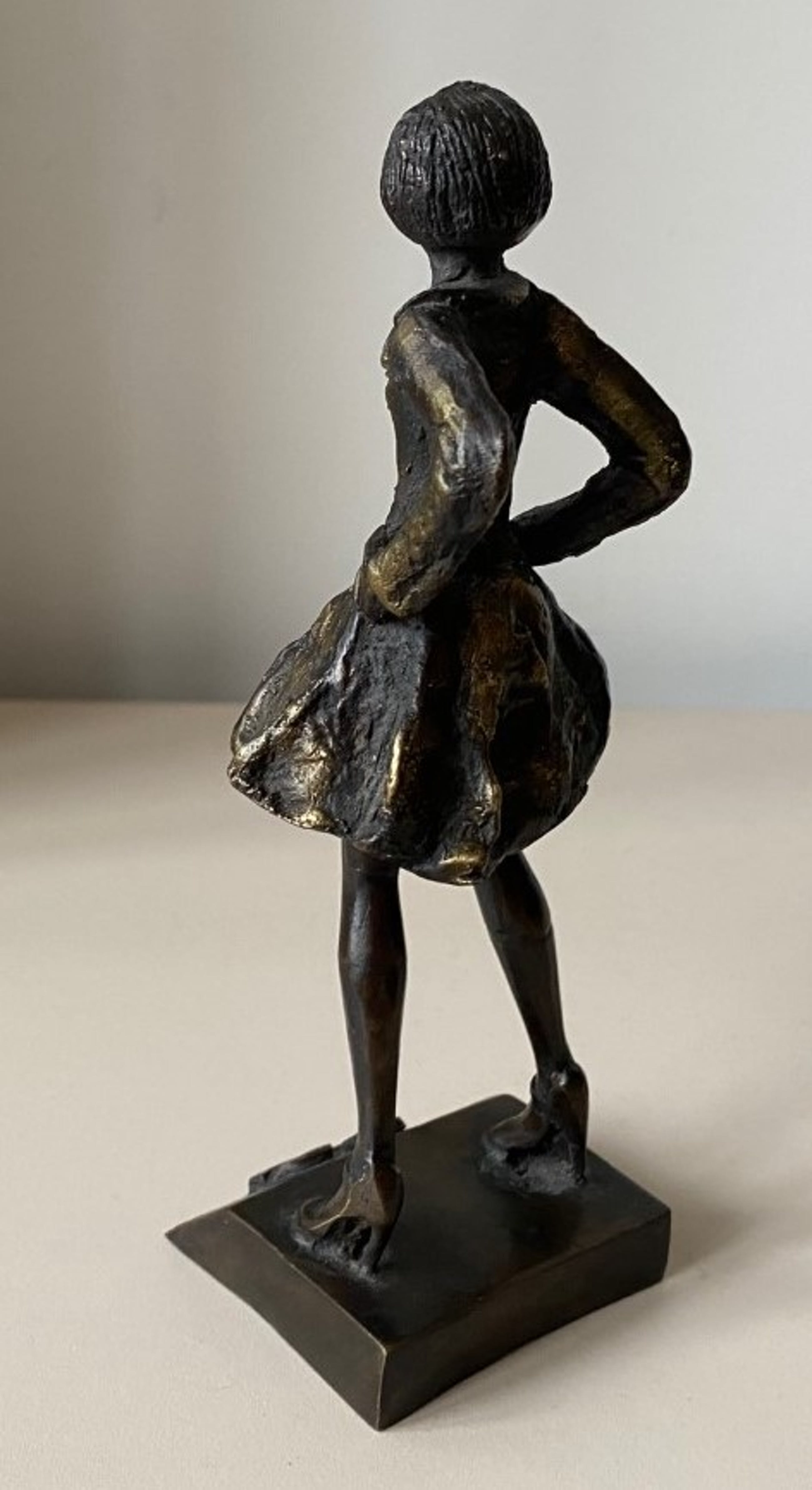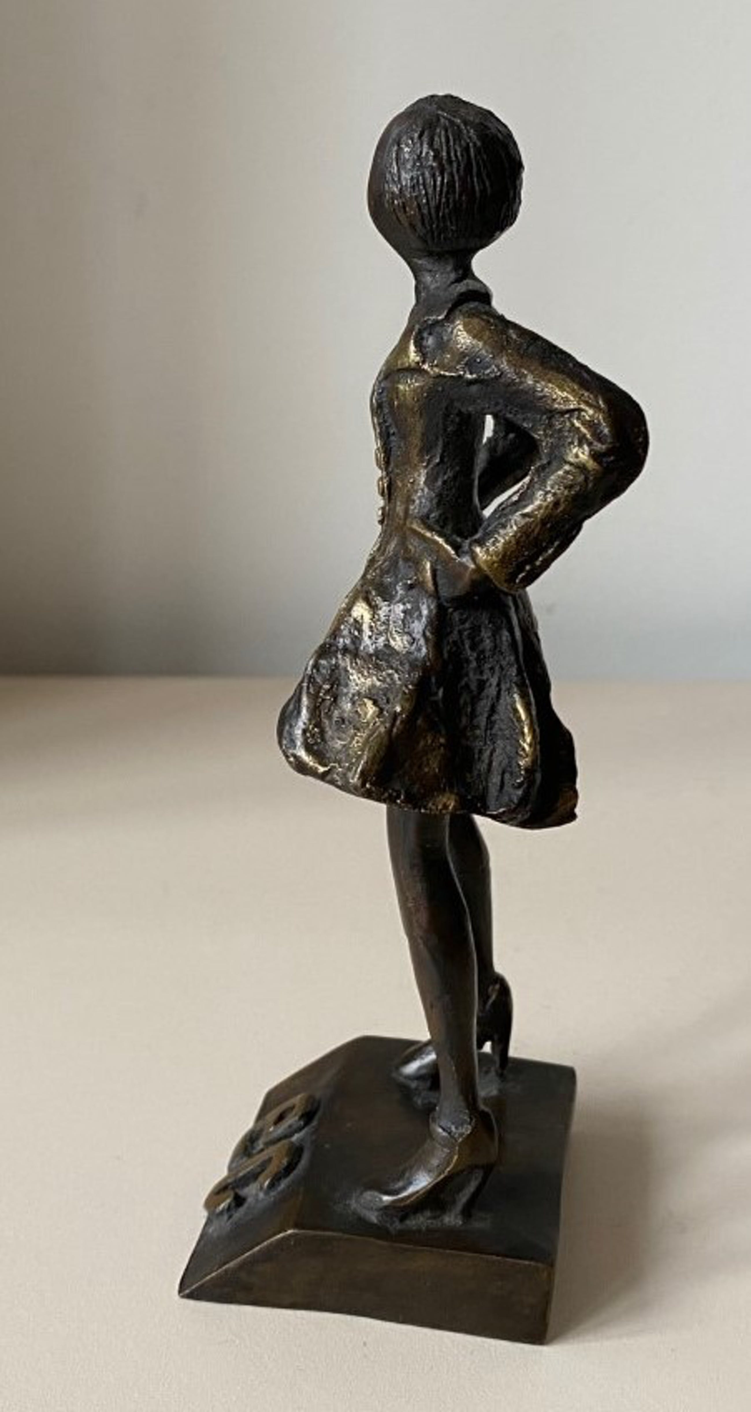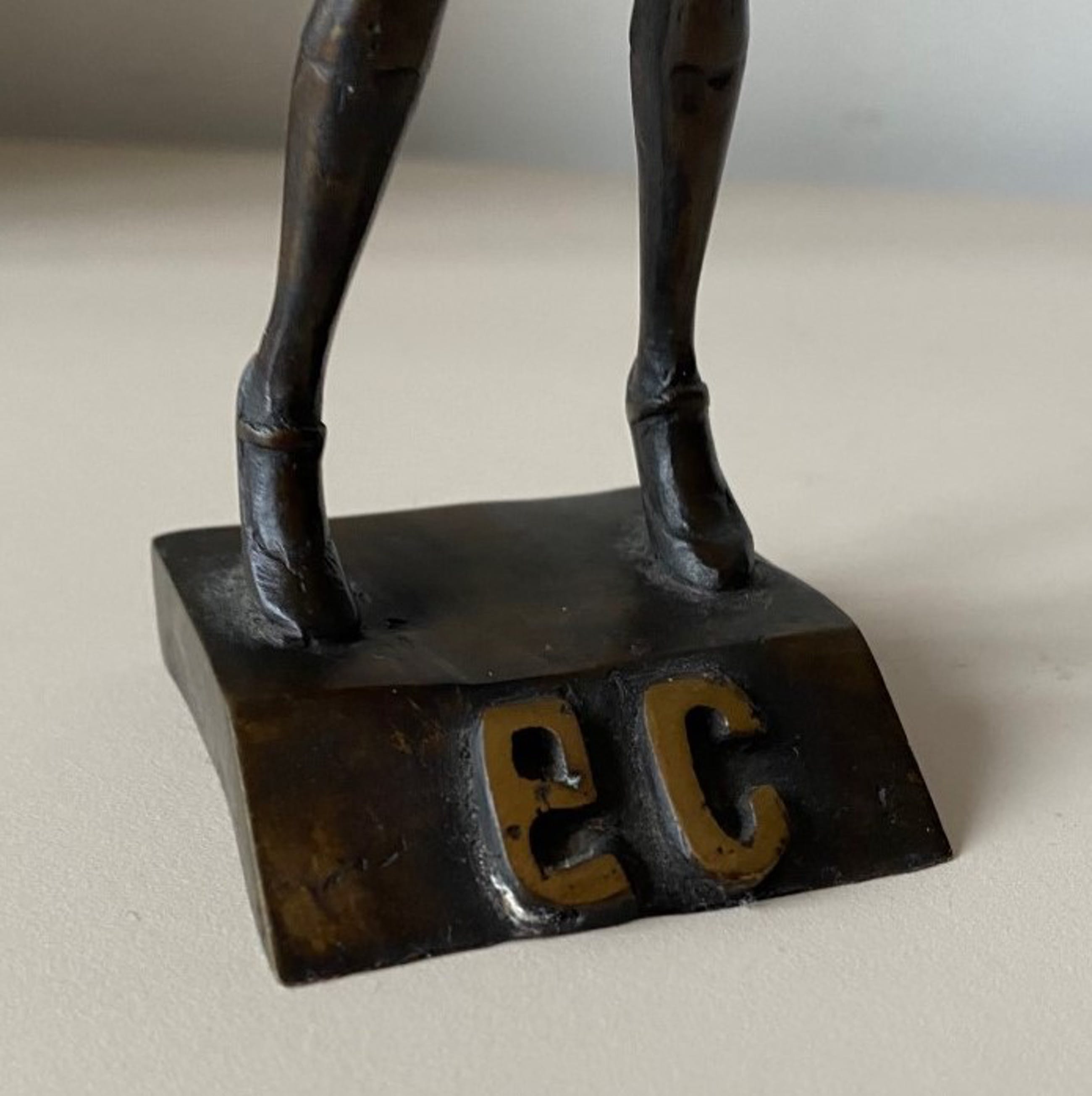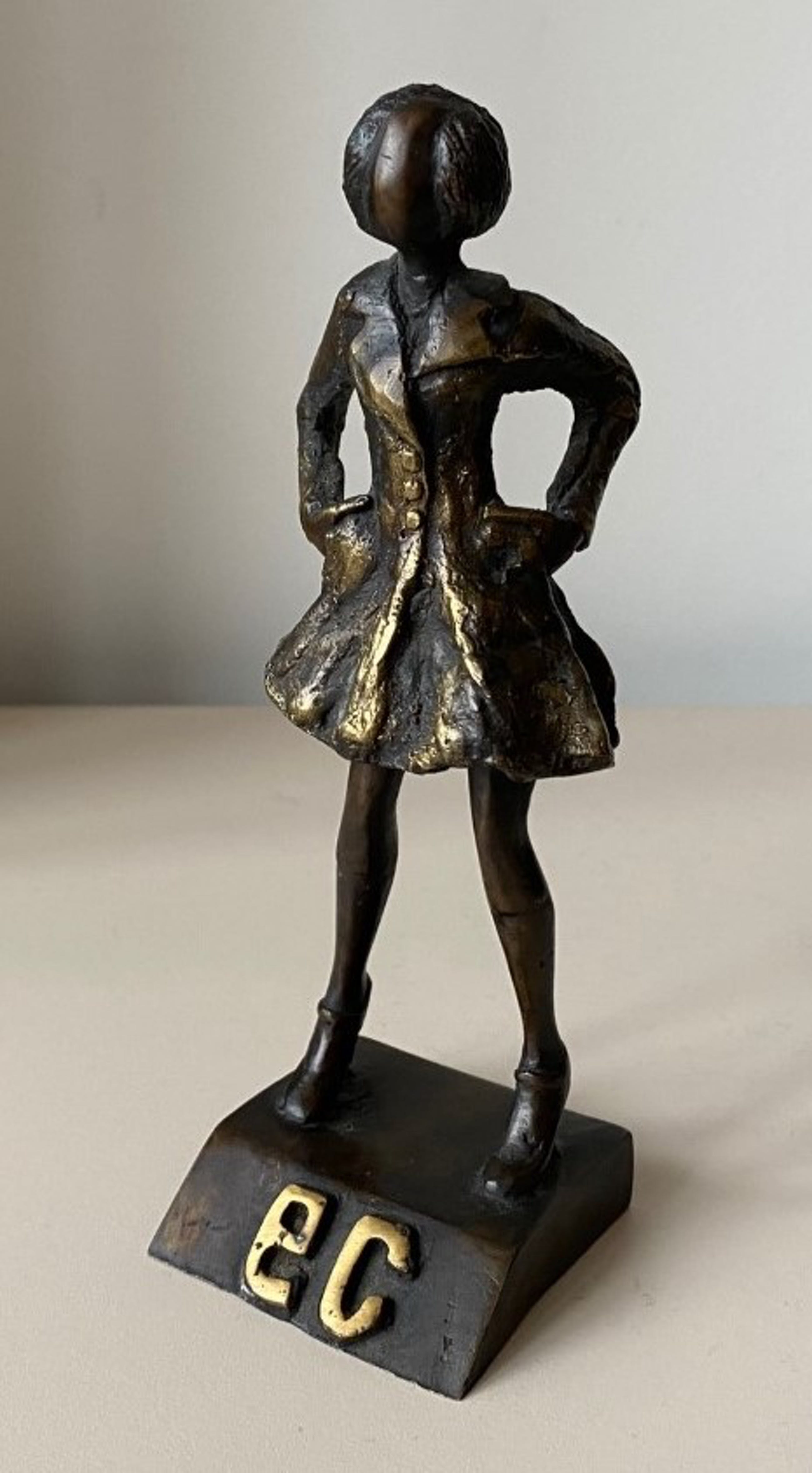 Bronzen beeld van Corry Ammerlaan van een dame op hoge hakken (mogelijk Florence Nightingale?) met een rok en jasje op sokkel welke de letters EC (Europese Commissie?) ingegraveerd heeft en met de hand gesigneerd CA aan de achterzijde.