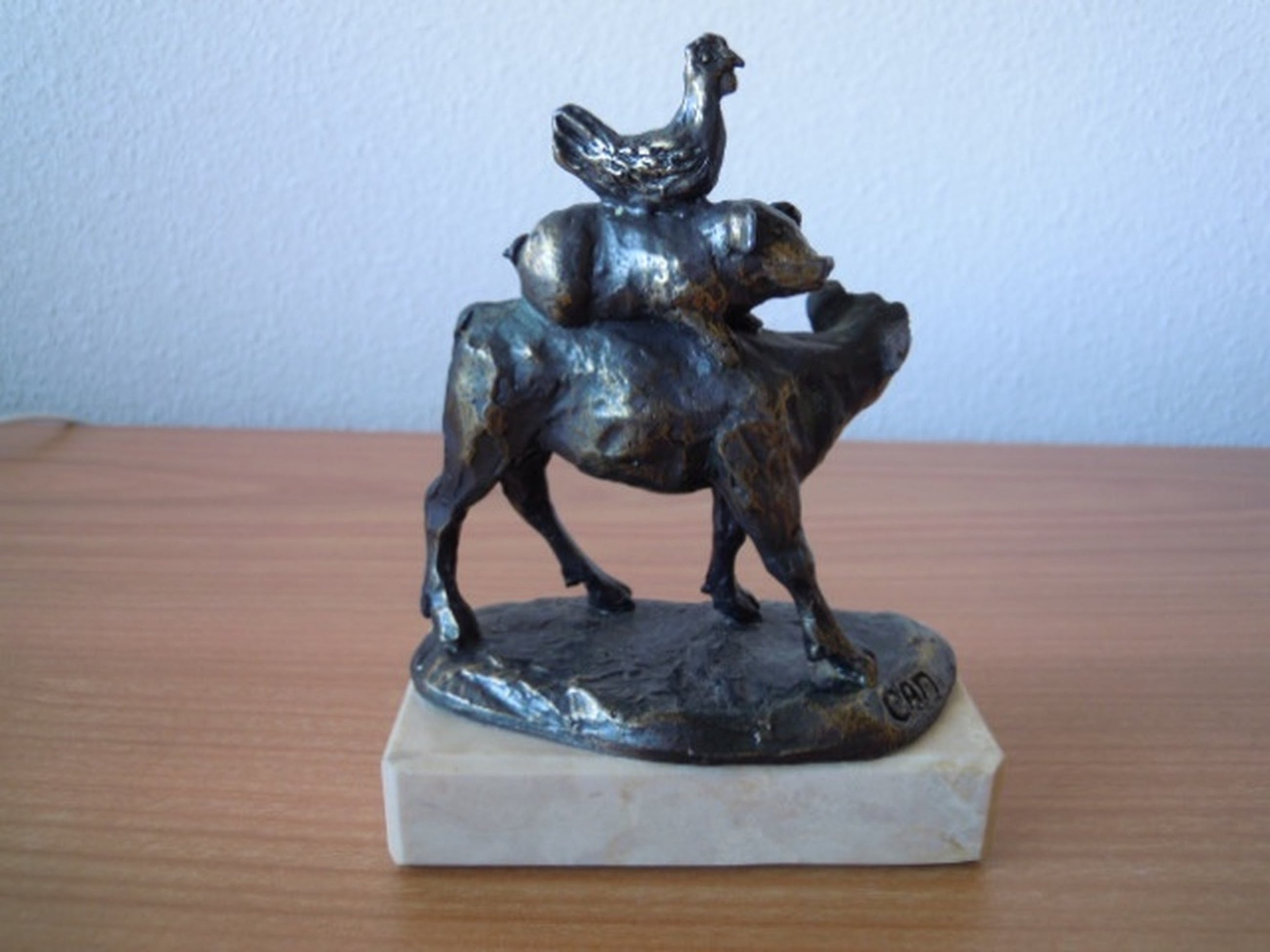 Bronzen beeldje CORRY AMMERLAAN - koe varken en kip op marmeren voet - 14 cm = gesigneerd