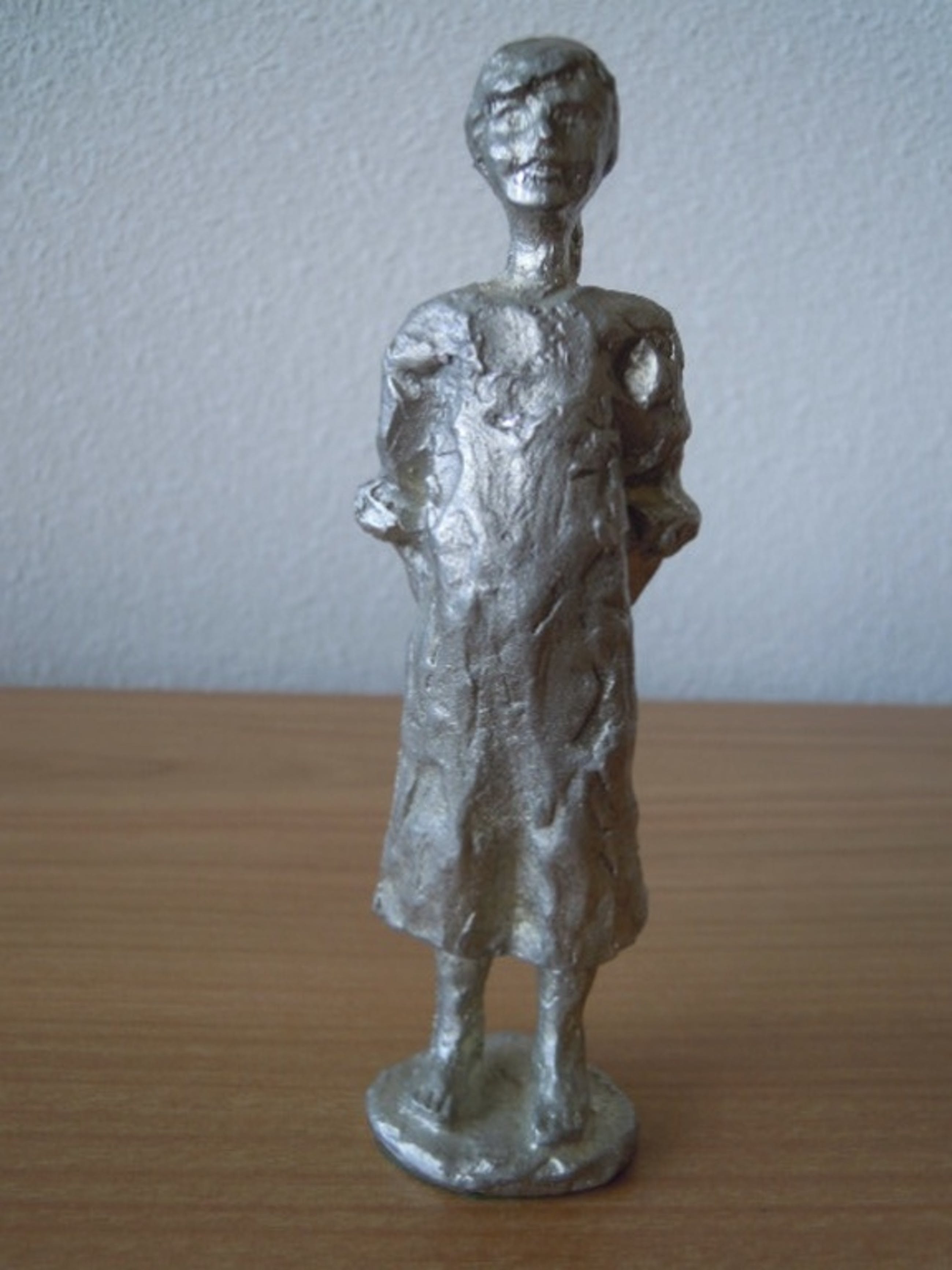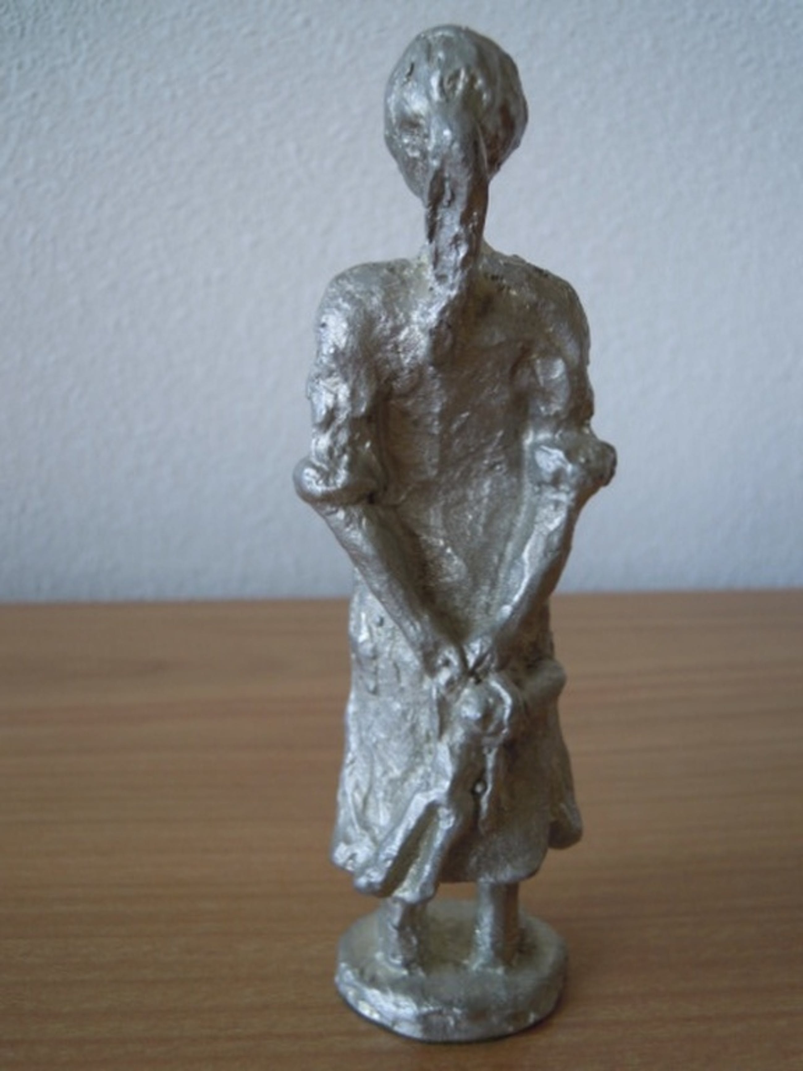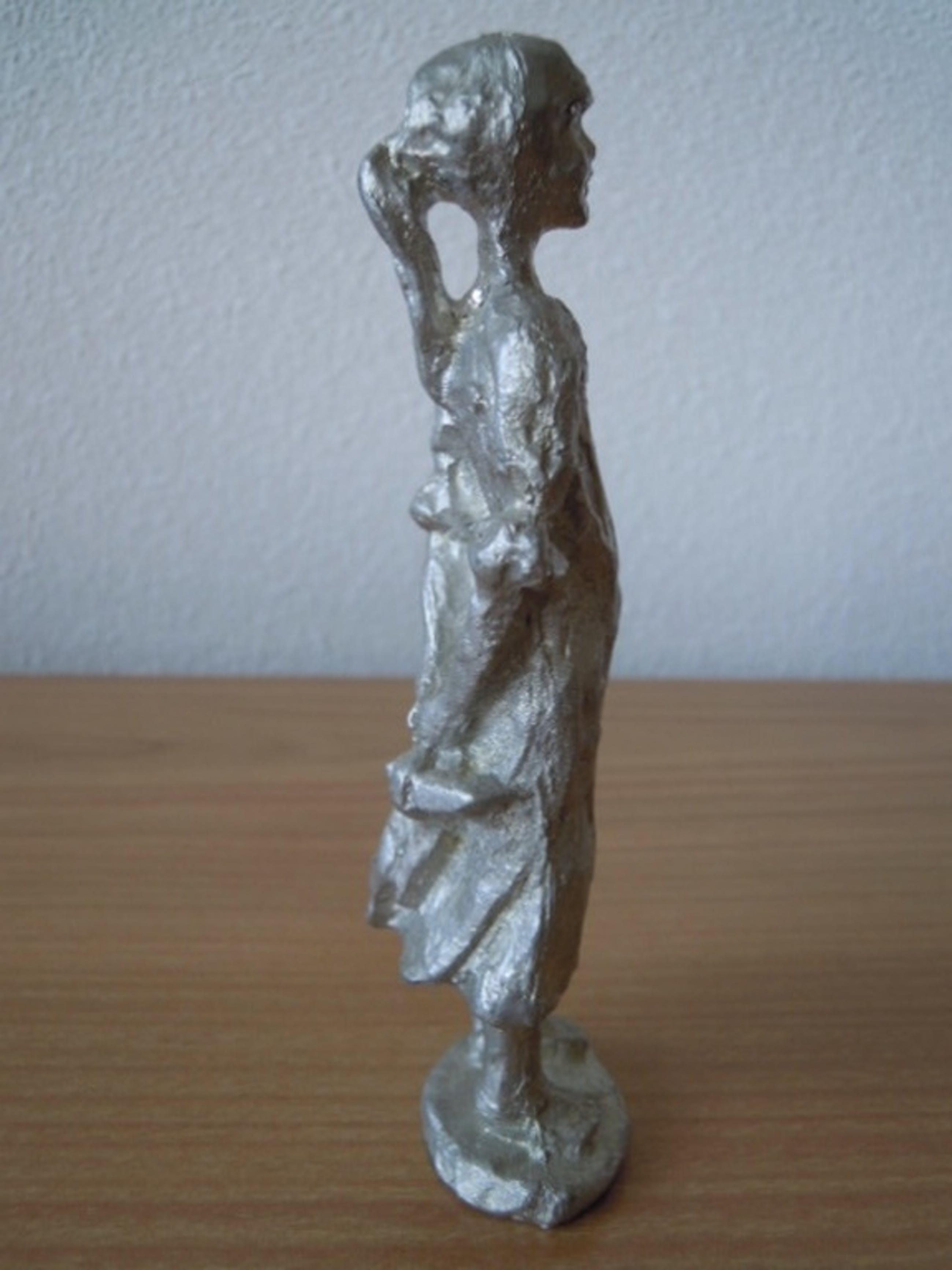 Het betreft een zwaar massief zilver kleurig beeldje in zeer mooie staat .