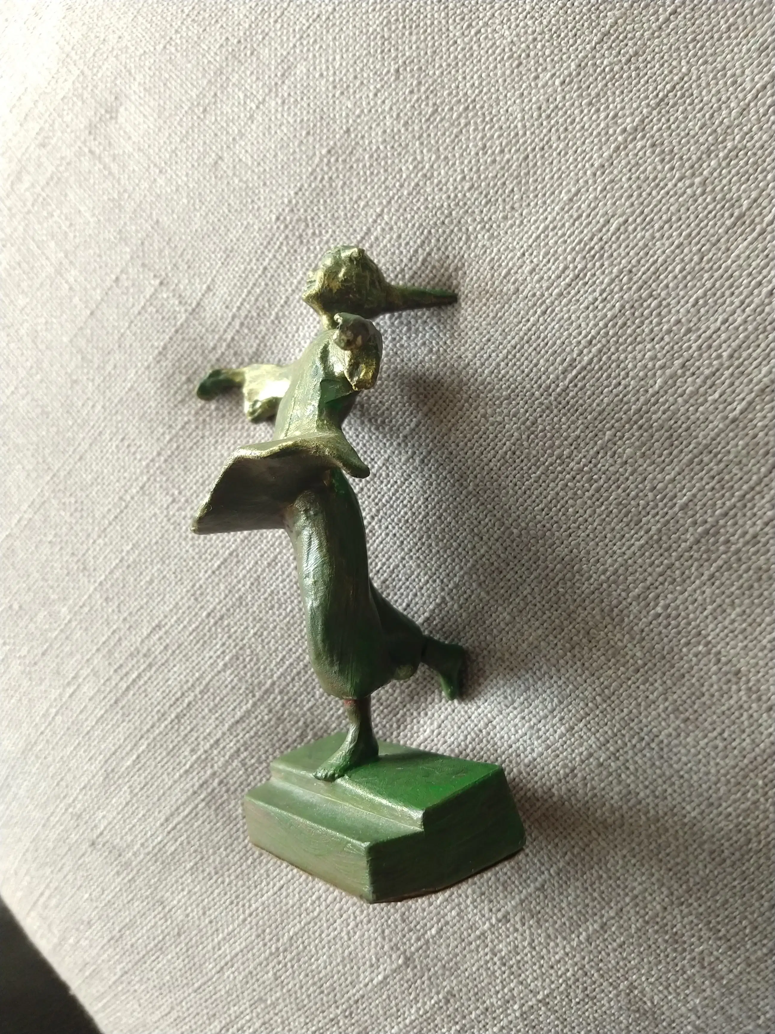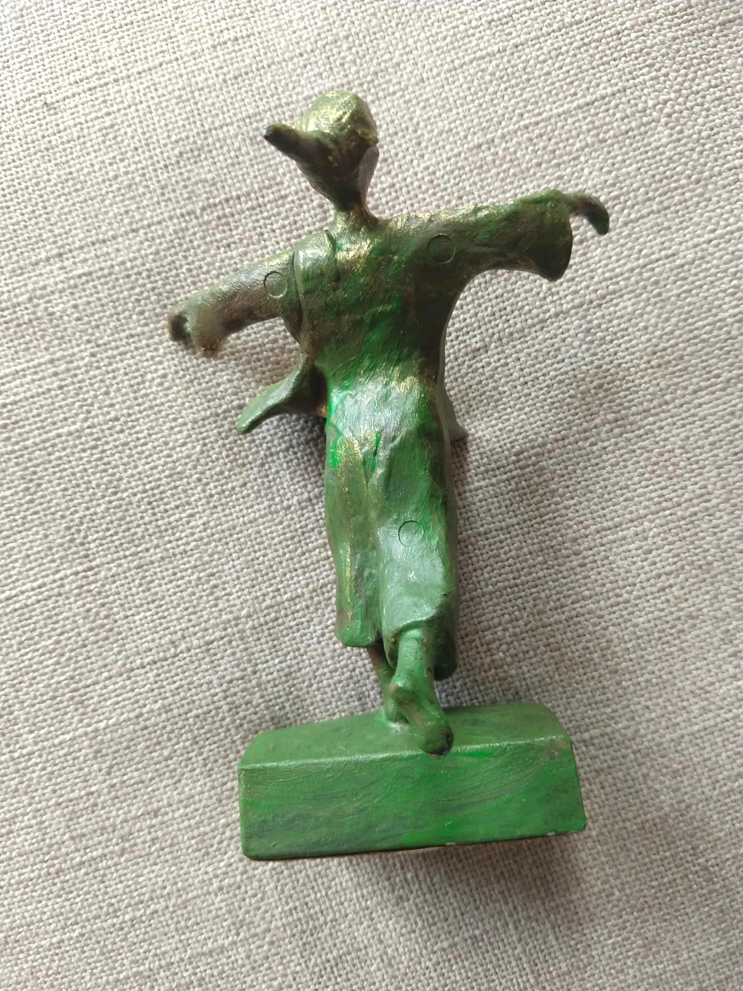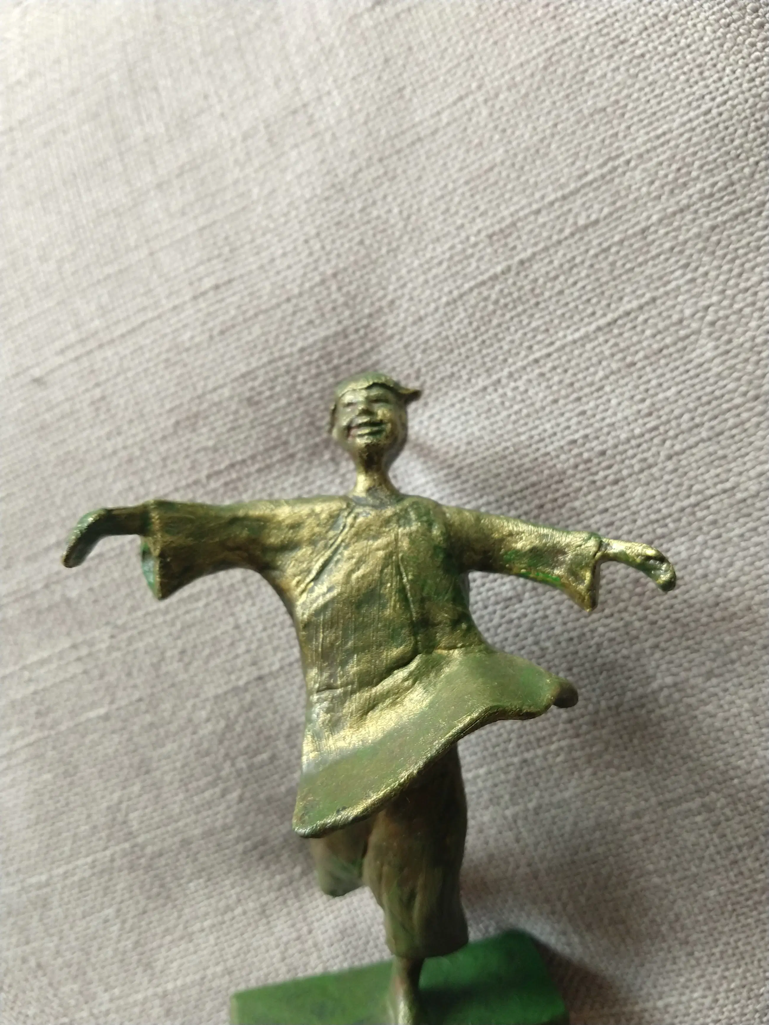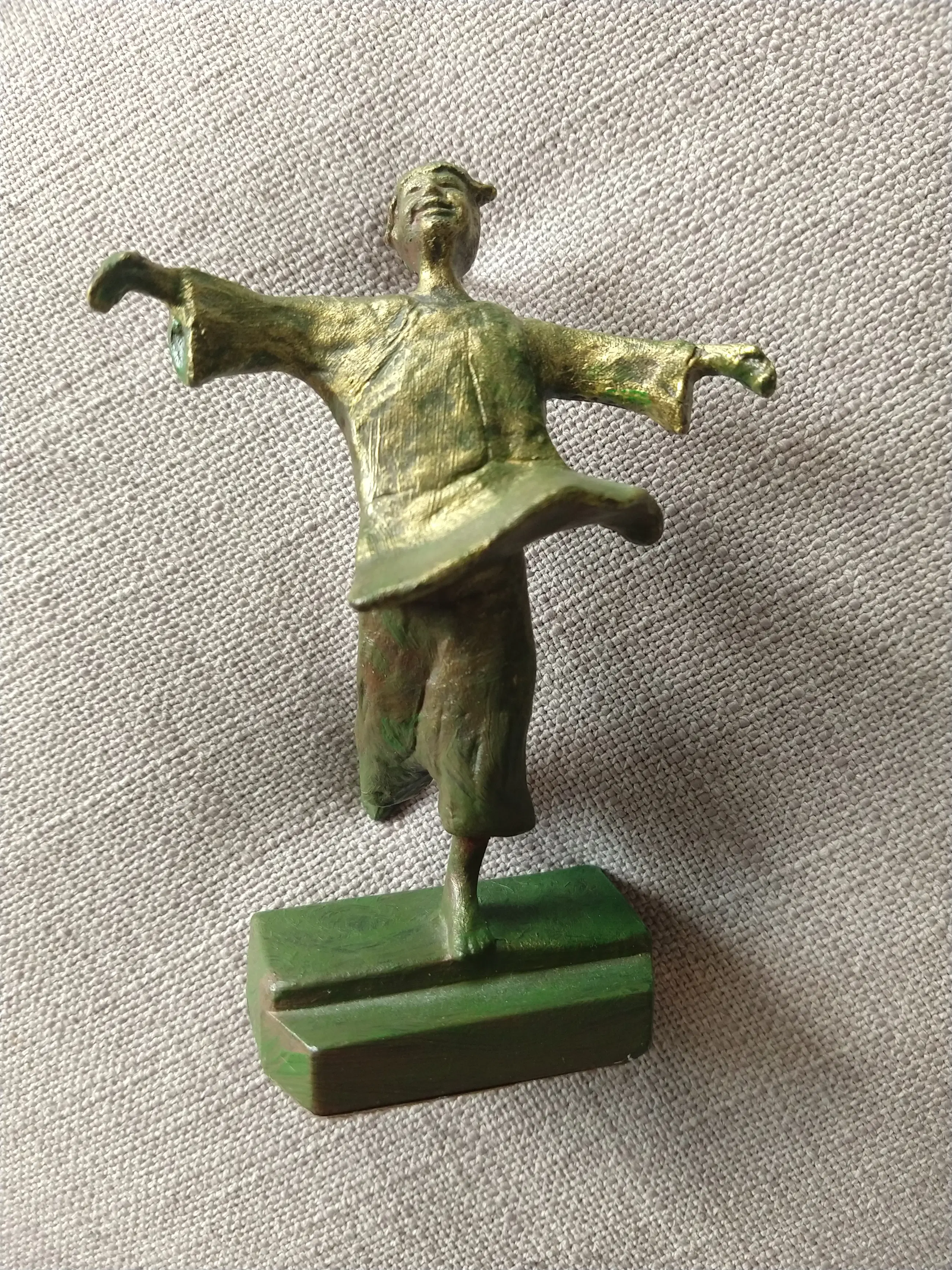 Sculptuur van een vrolijke, dansende figuur met uitgestrekte armen. Uitgevoerd in brons met groene patina en geplaatst op een sokkel. De speelse houding en expressieve vormgeving geven het beeld een levendige en positieve uitstraling. In goede staat.