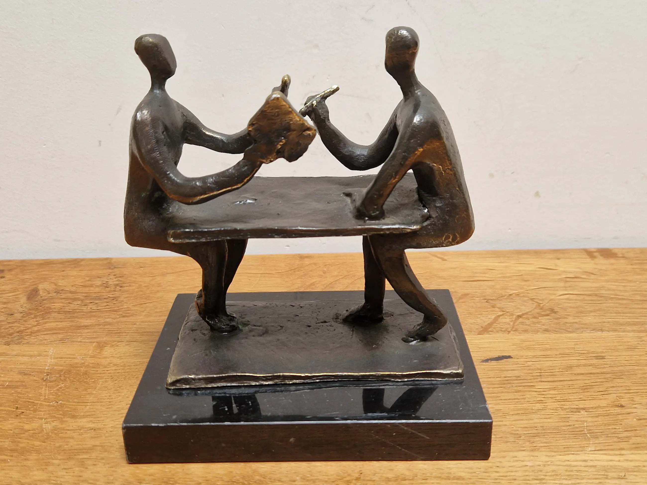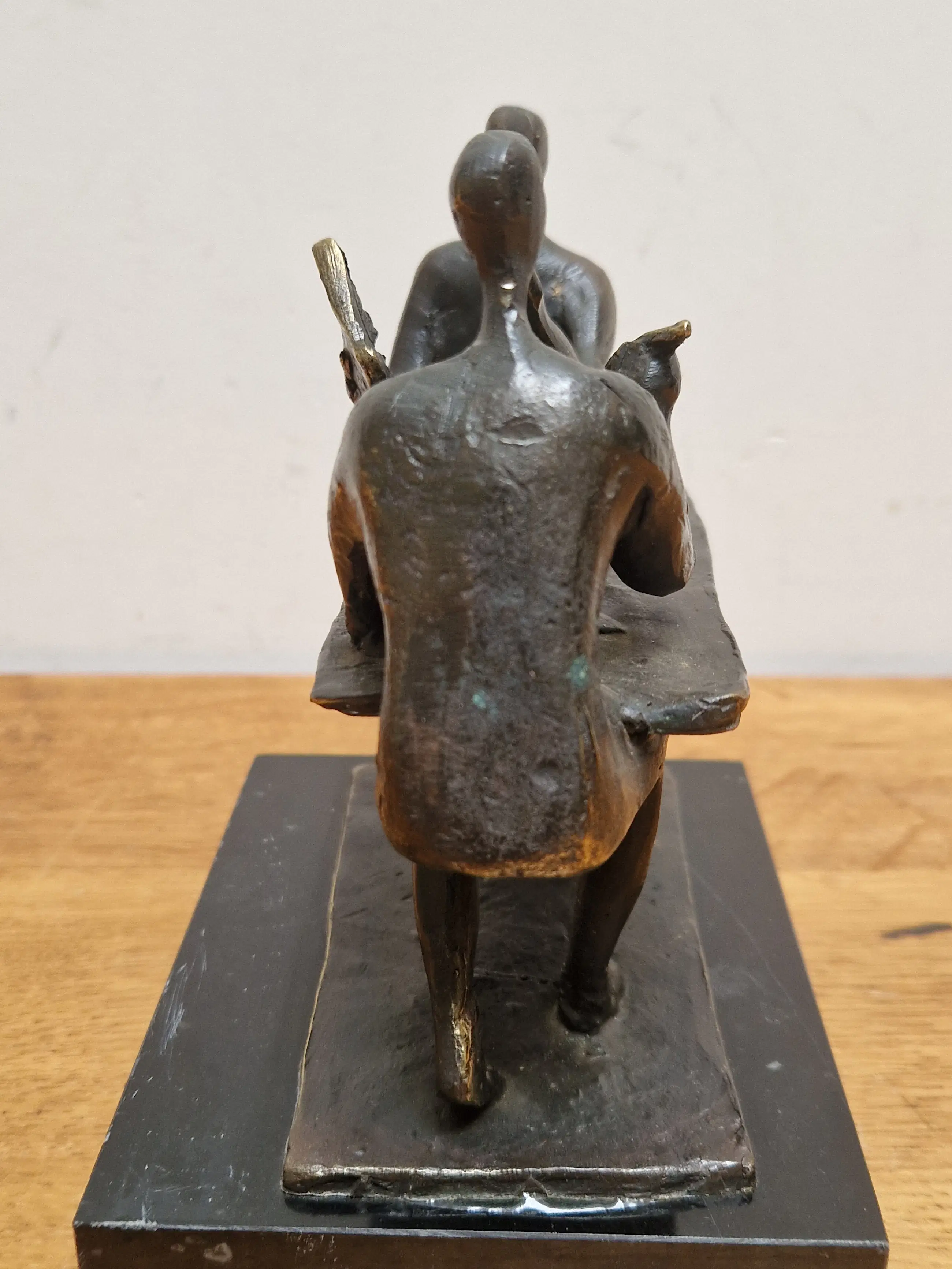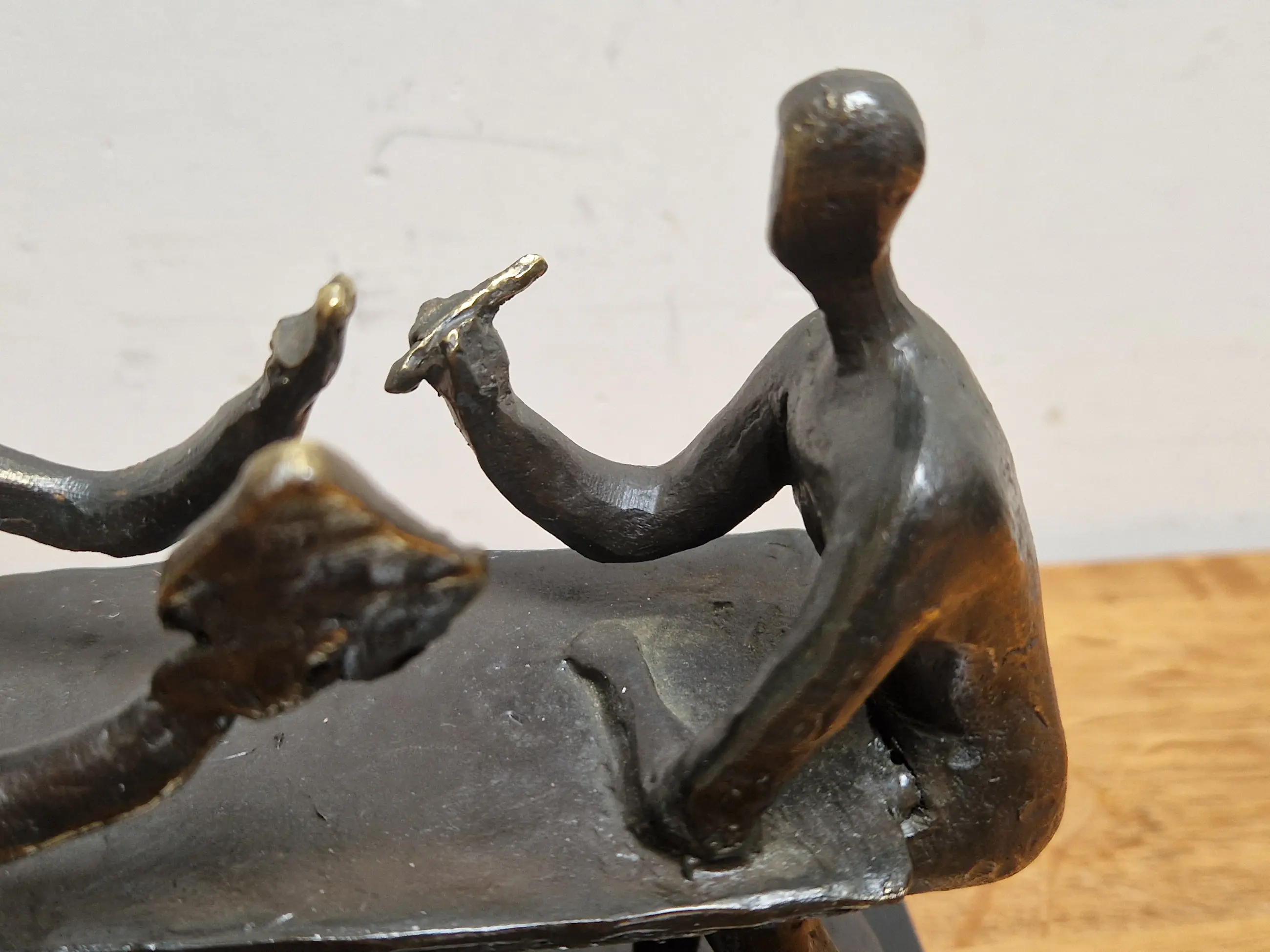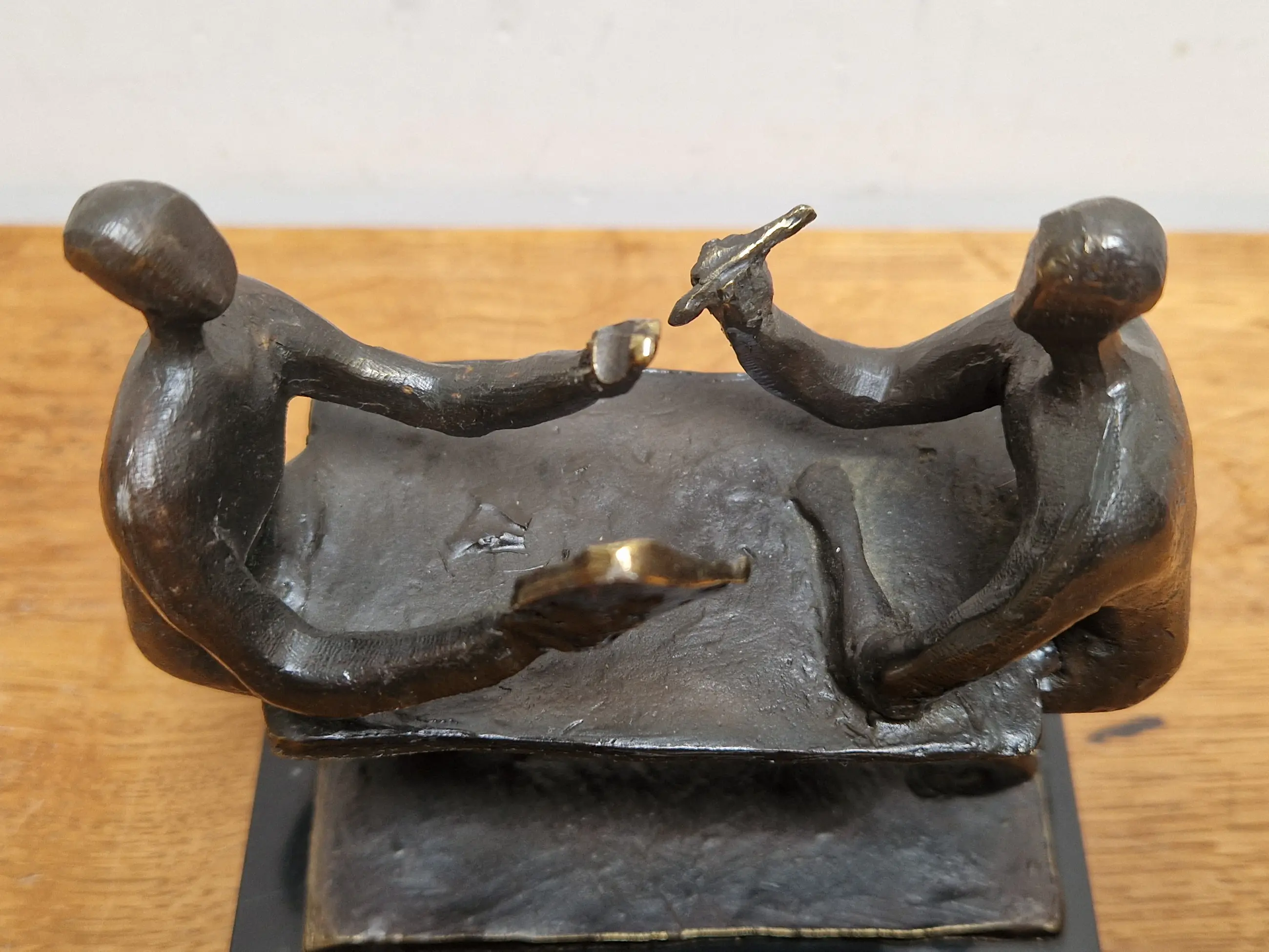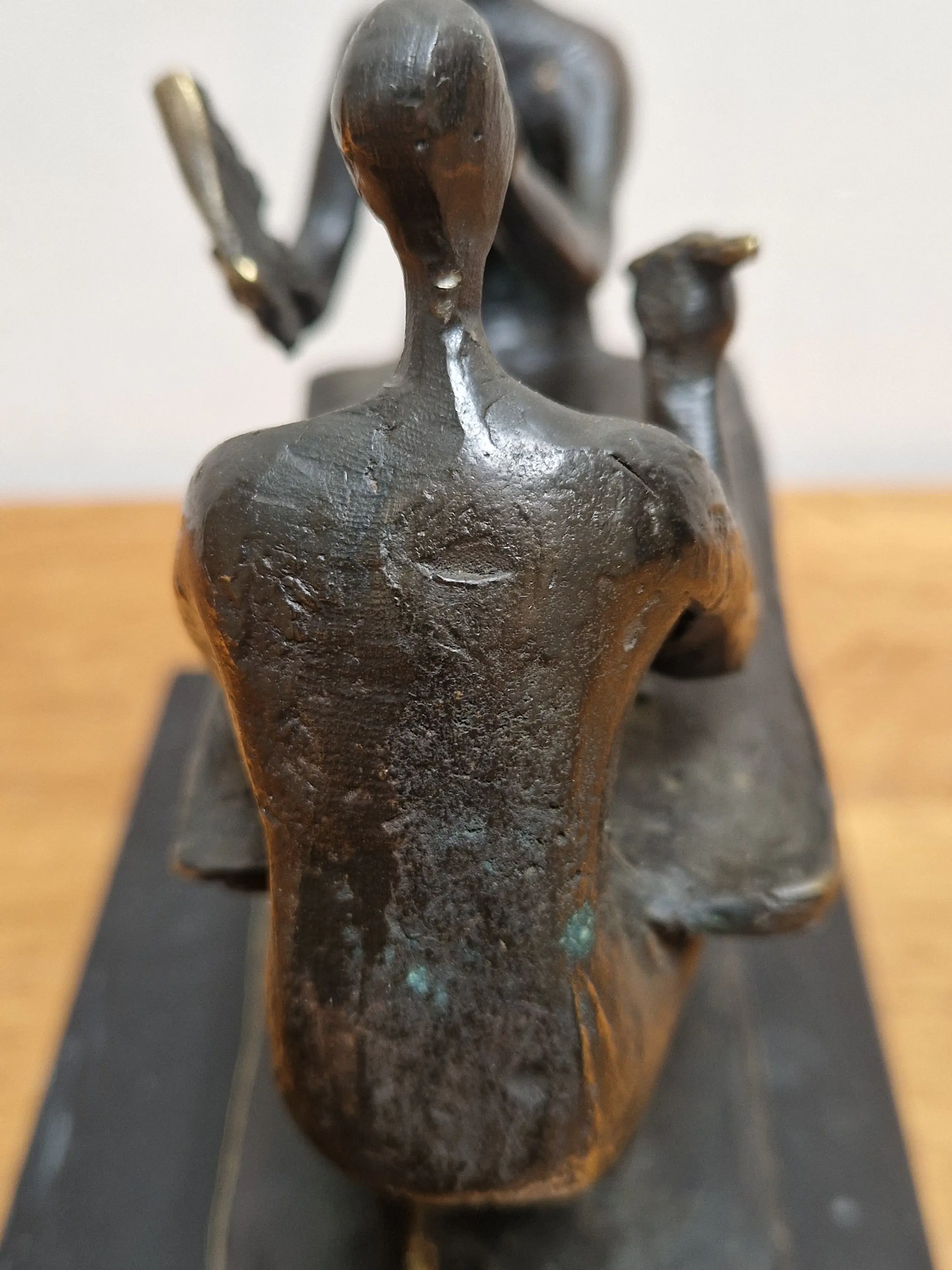 Bronzen beeld door Corry Ammerlaan. Het beeld is gemonteerd op een hardstenen voetstuk. Totale hoogte 15 x breedte 13.5 x diepte 10cm. Monogram in de voetplaat: 'CAN'.