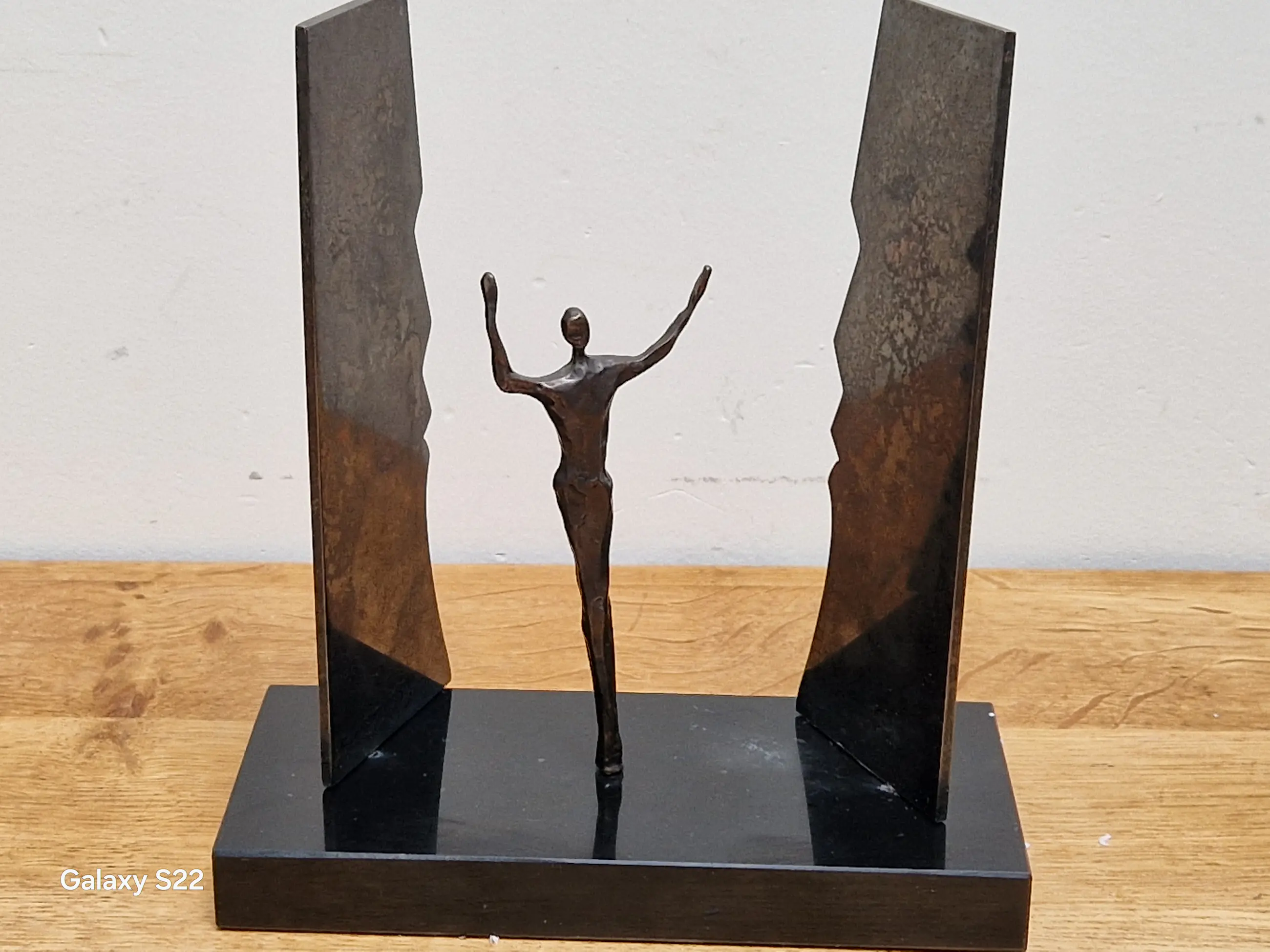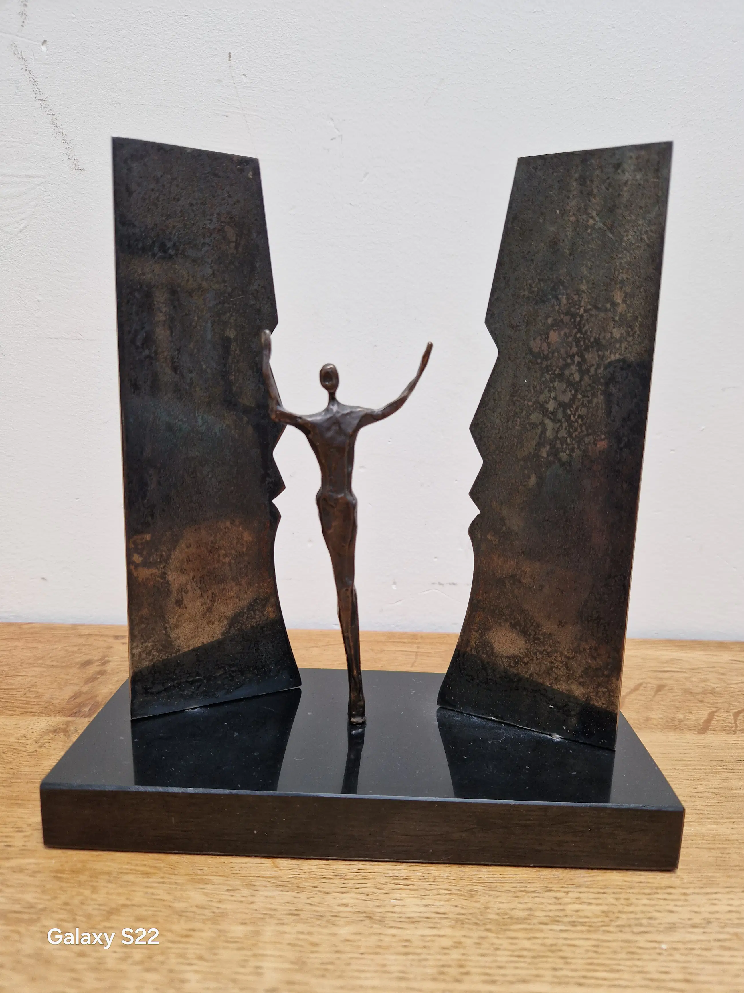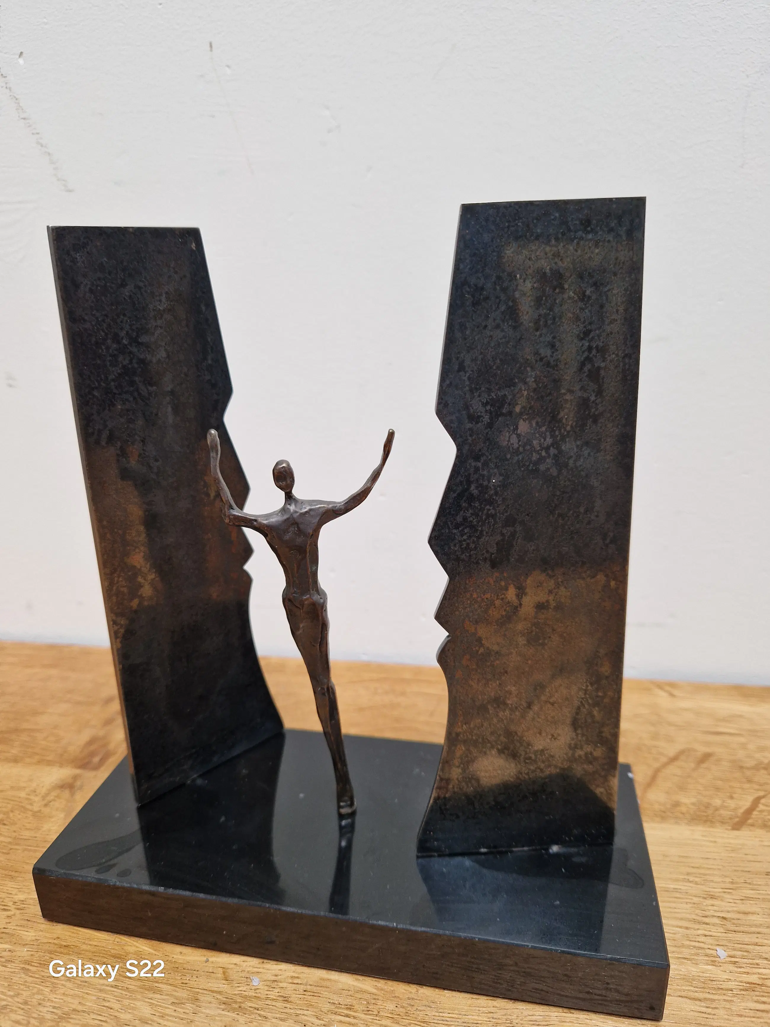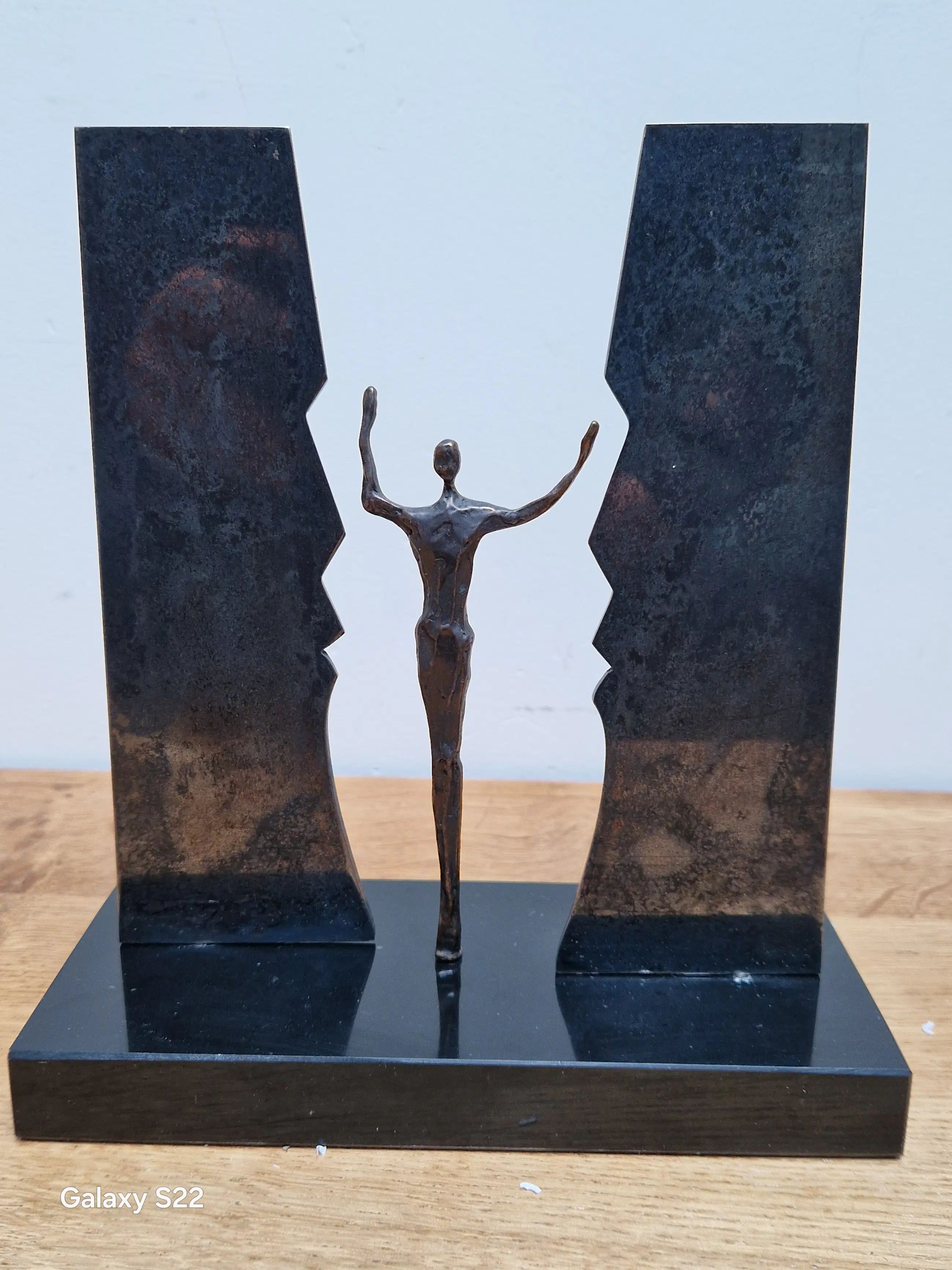 Fraaie, symbolische sculptuur van een mensfiguur met de armen in de lucht staande tussen twee schermen in de vorm van gezichten. De schermen zijn gedeeltelijk draaibaar, het figuur is 380° draaibaar.
