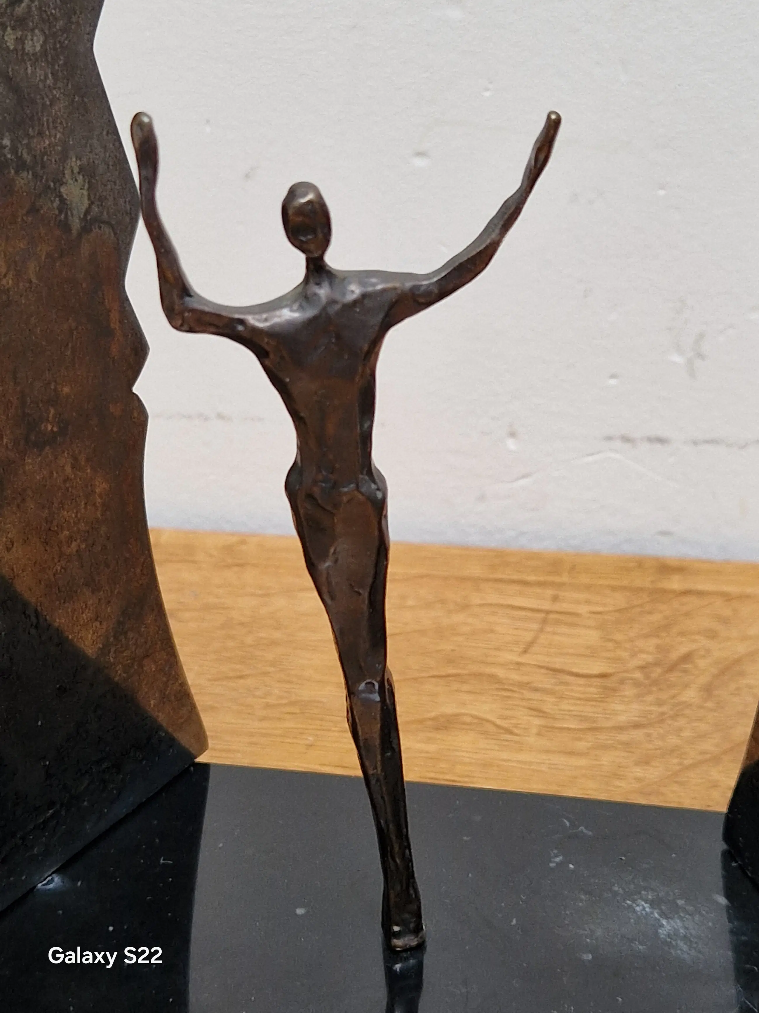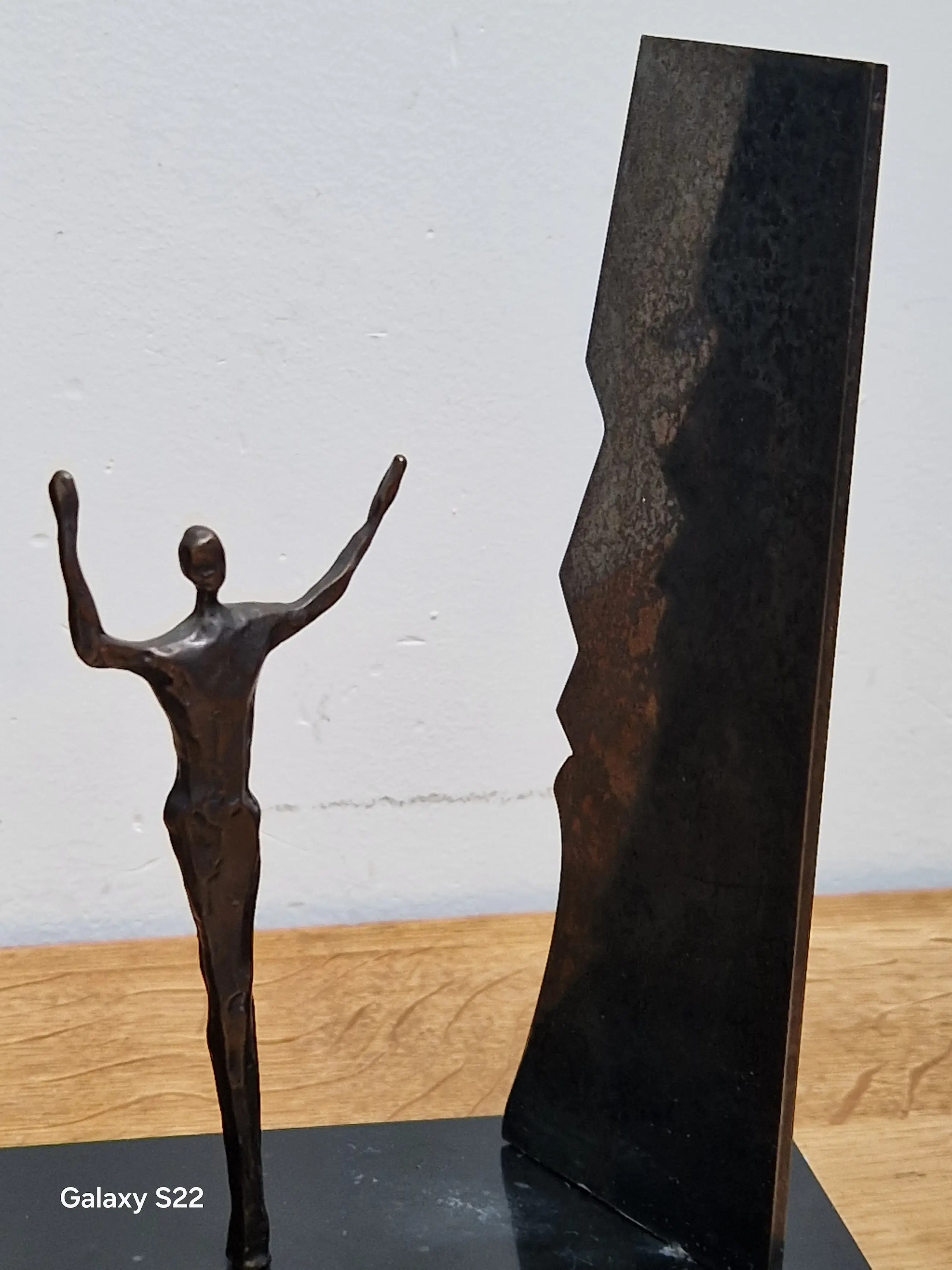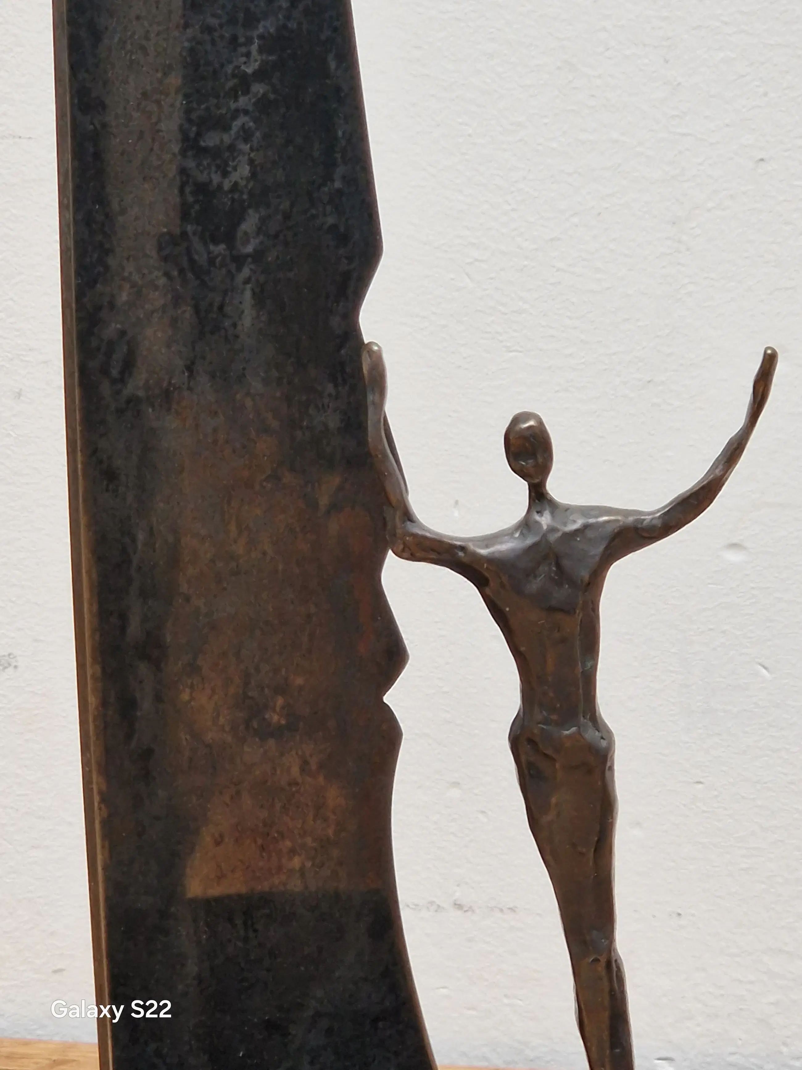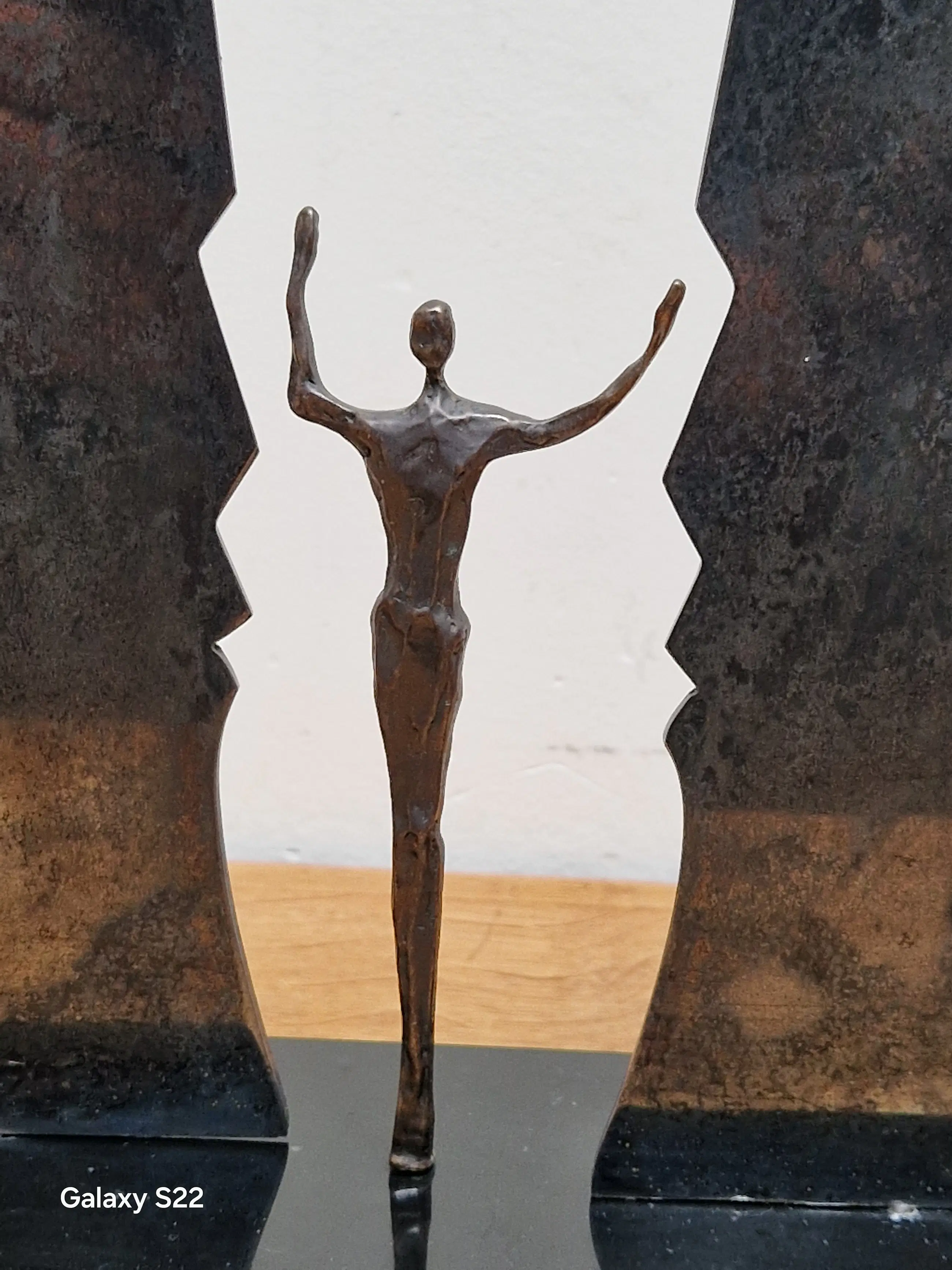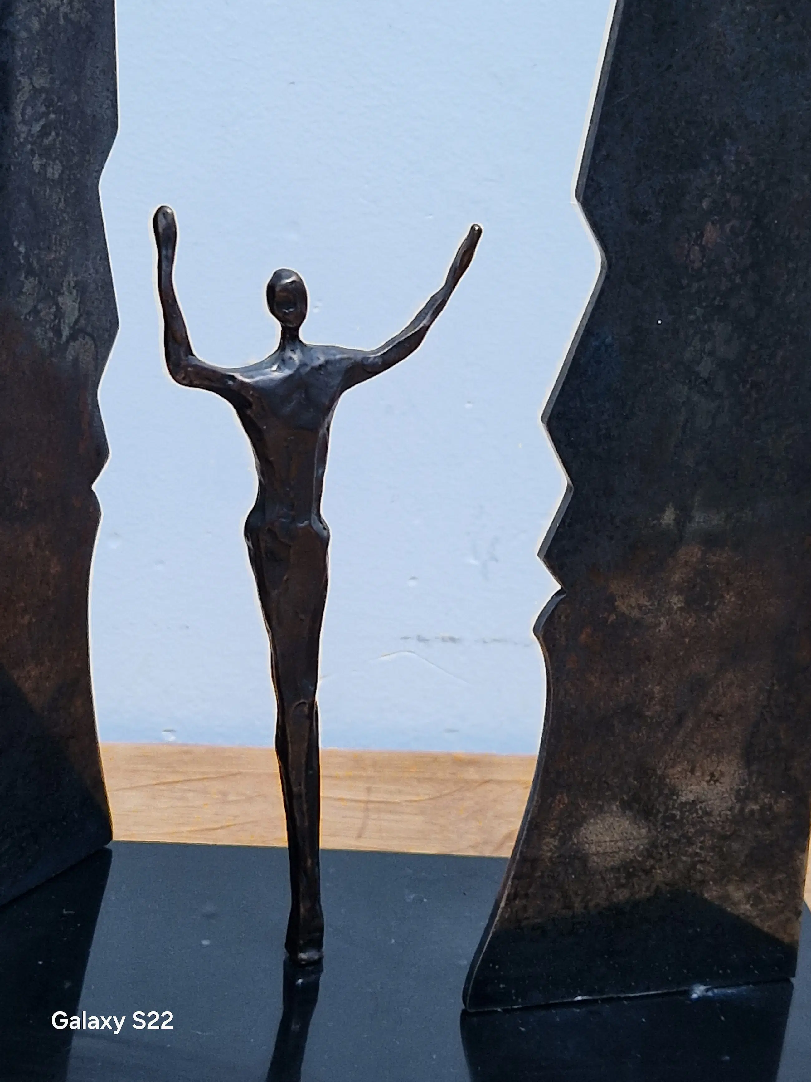 Fraaie, symbolische sculptuur van een mensfiguur met de armen in de lucht staande tussen twee schermen in de vorm van gezichten. De schermen zijn gedeeltelijk draaibaar, het figuur is 380° draaibaar.