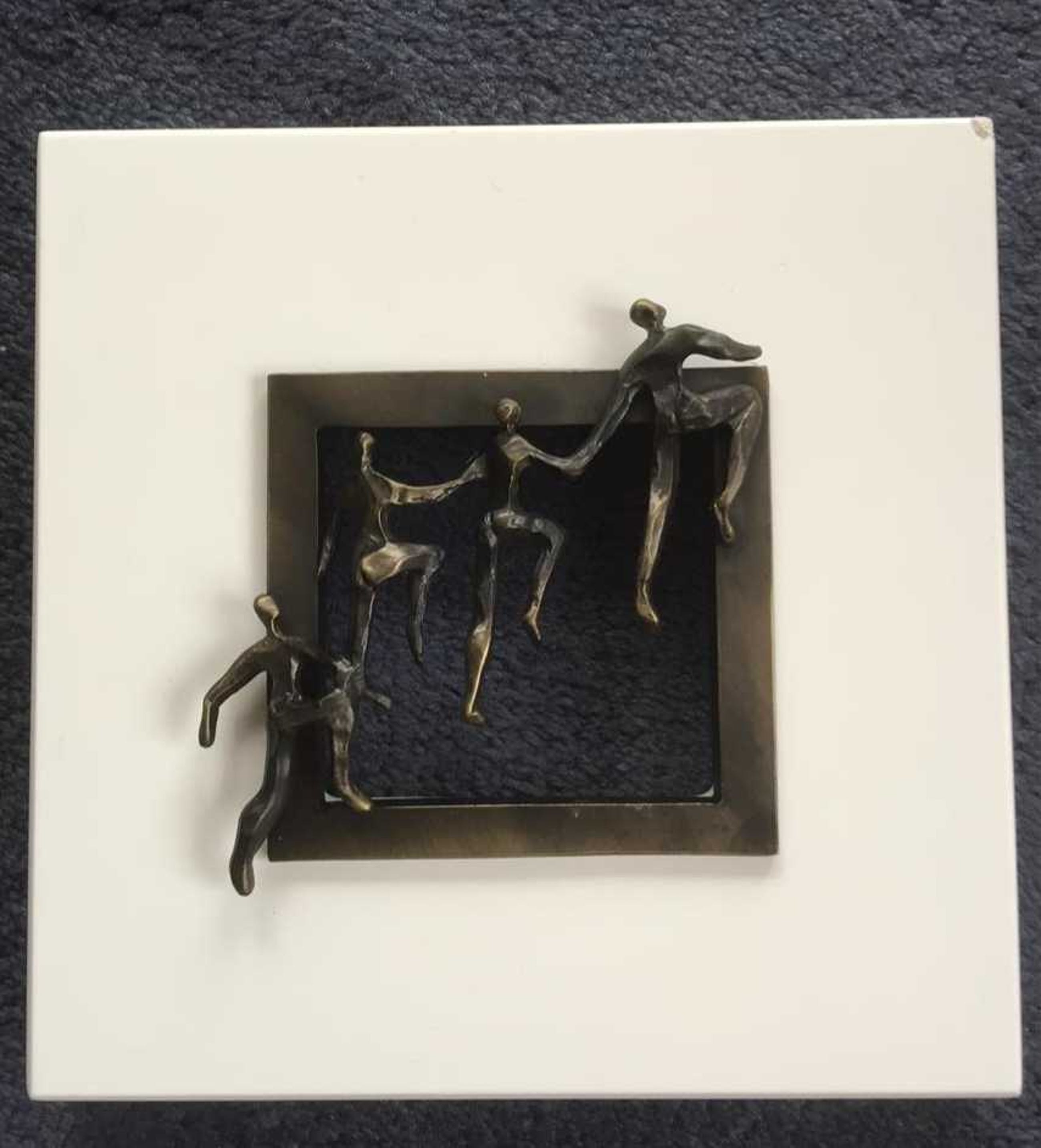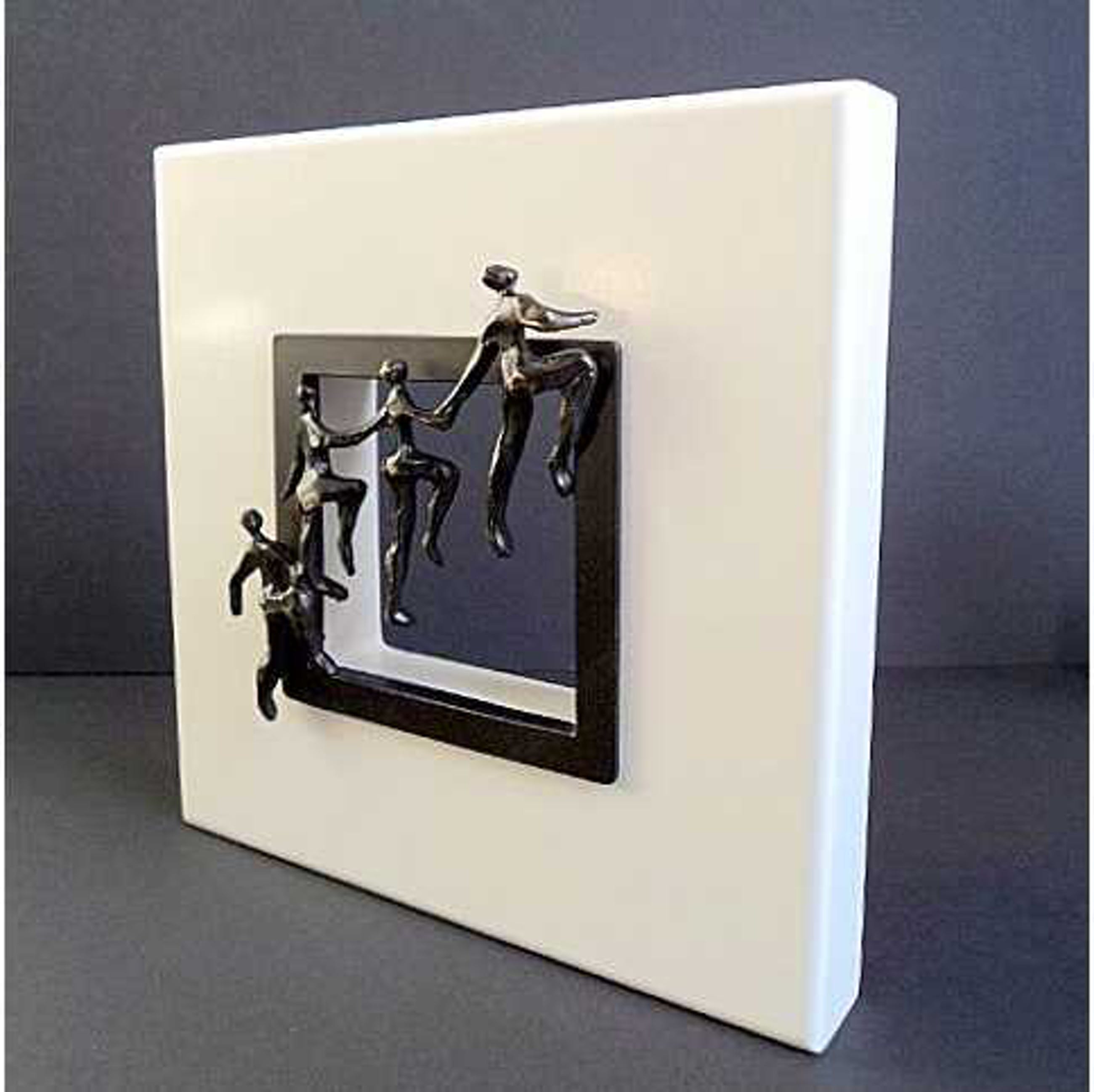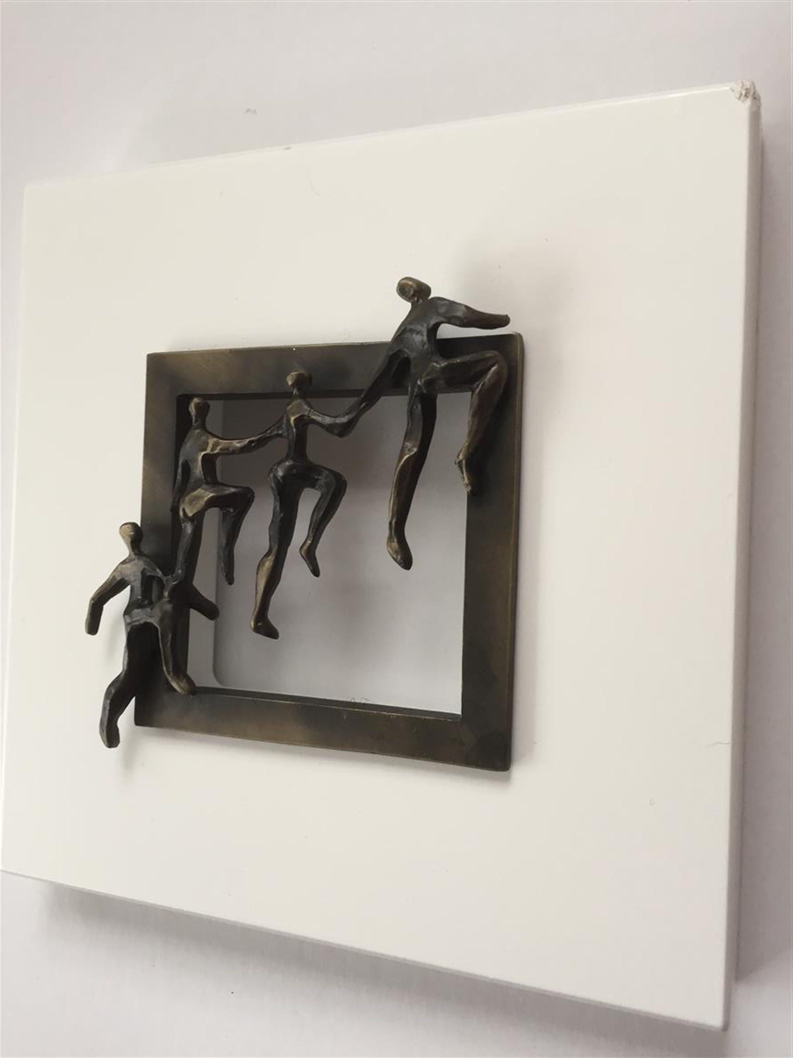 Wanddecoratie in 3d in wit houten raam Een erg mooi en zeer apart kunstwerk waarin de kunstenares de combinatie van verbronsde figuren en een ruimtelijk houten raamwerk op een verrassende manier heeft gecombineerd . Het geheel geeft een erg mooi ruimtelijk effect.