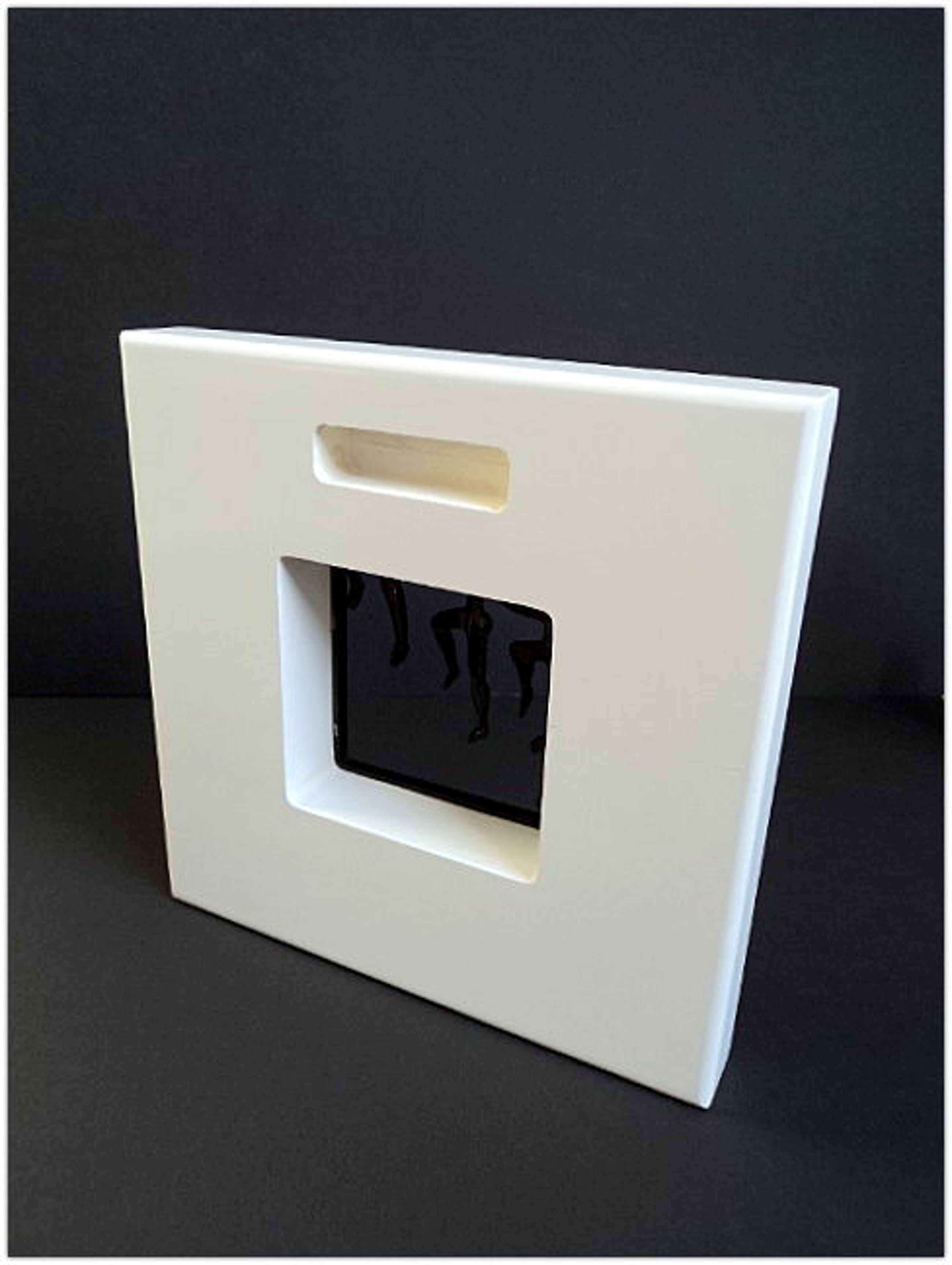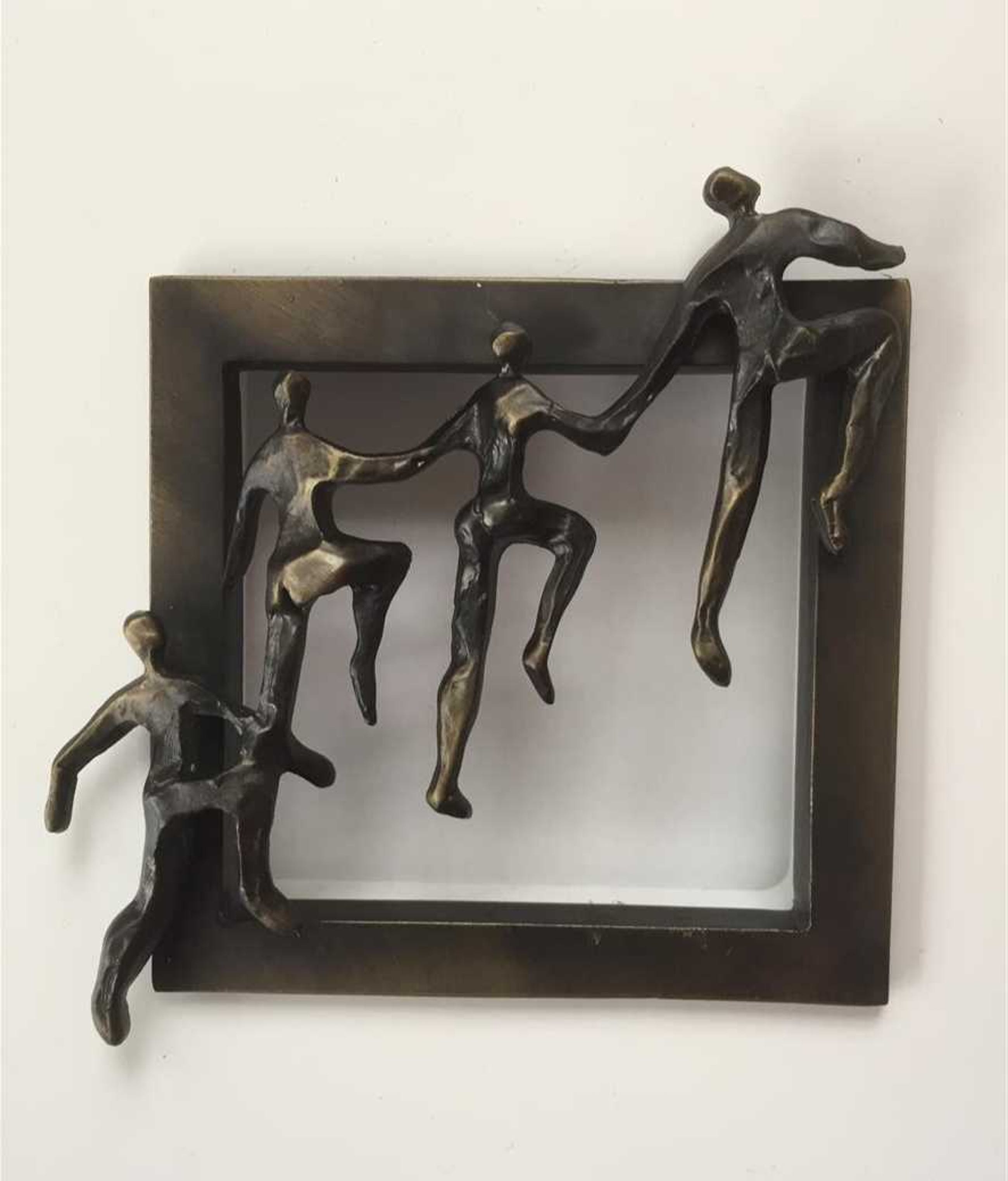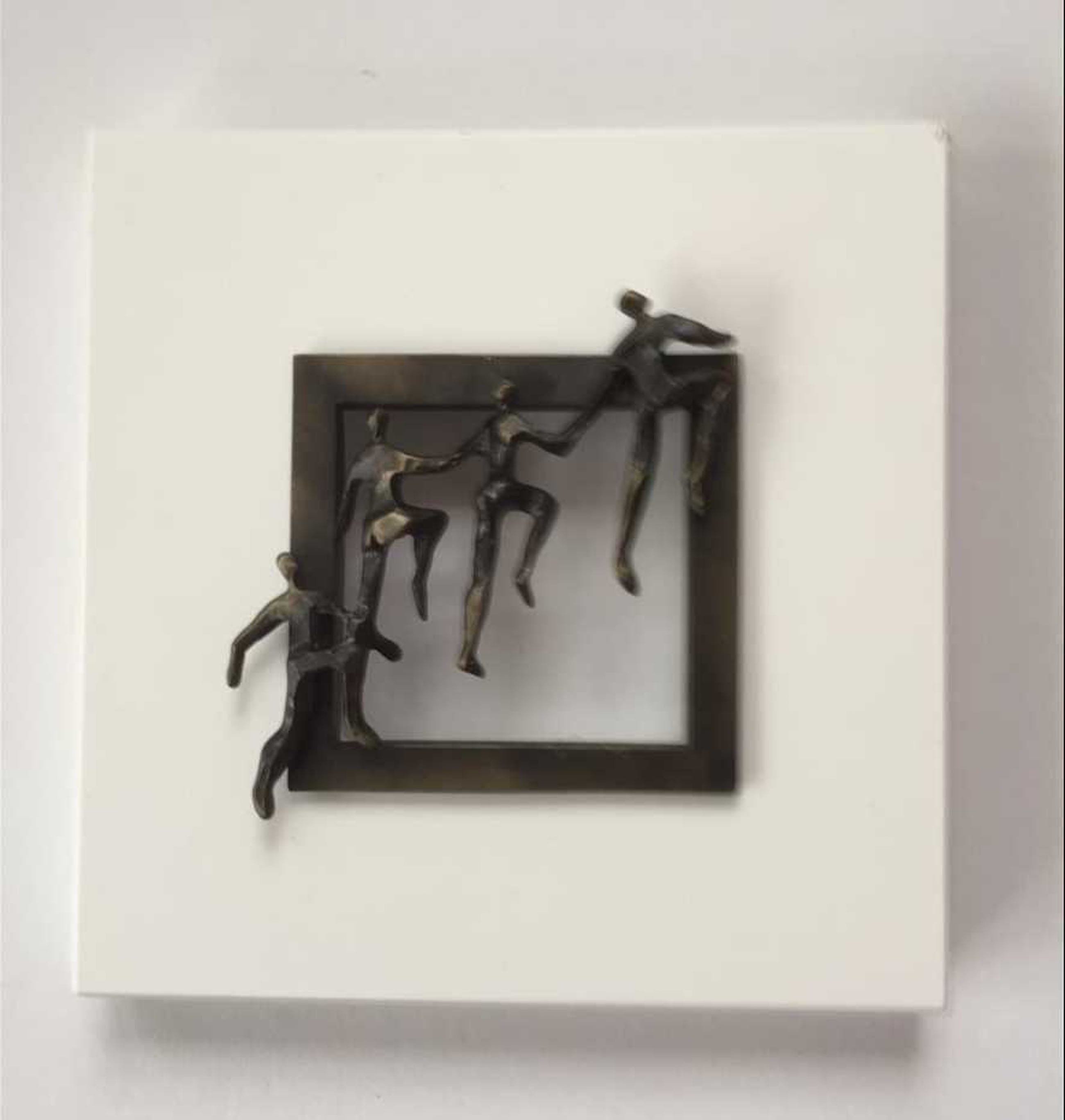 Wanddecoratie in 3d in wit houten raam Een erg mooi en zeer apart kunstwerk waarin de kunstenares de combinatie van verbronsde figuren en een ruimtelijk houten raamwerk op een verrassende manier heeft gecombineerd . Het geheel geeft een erg mooi ruimtelijk effect.