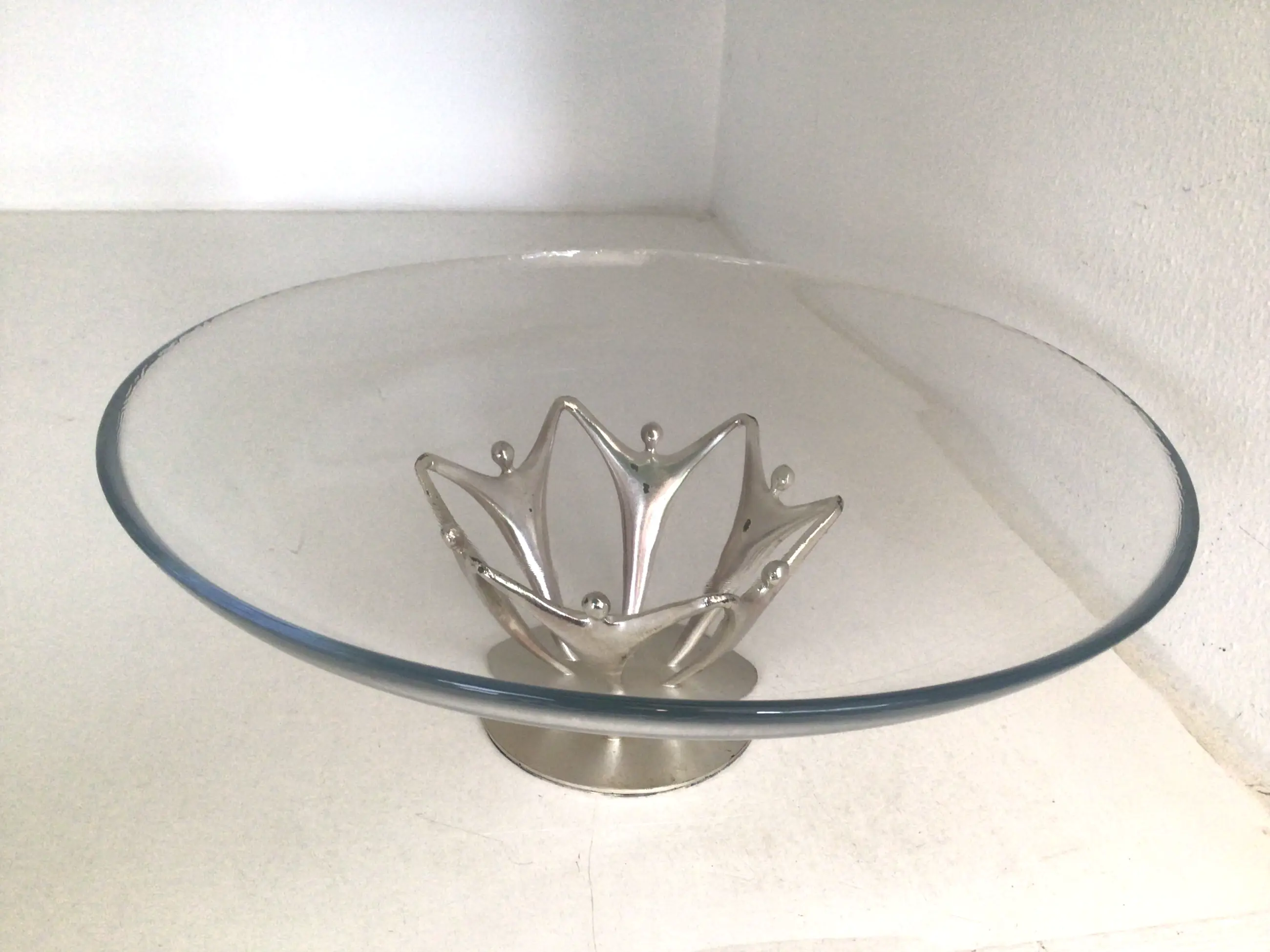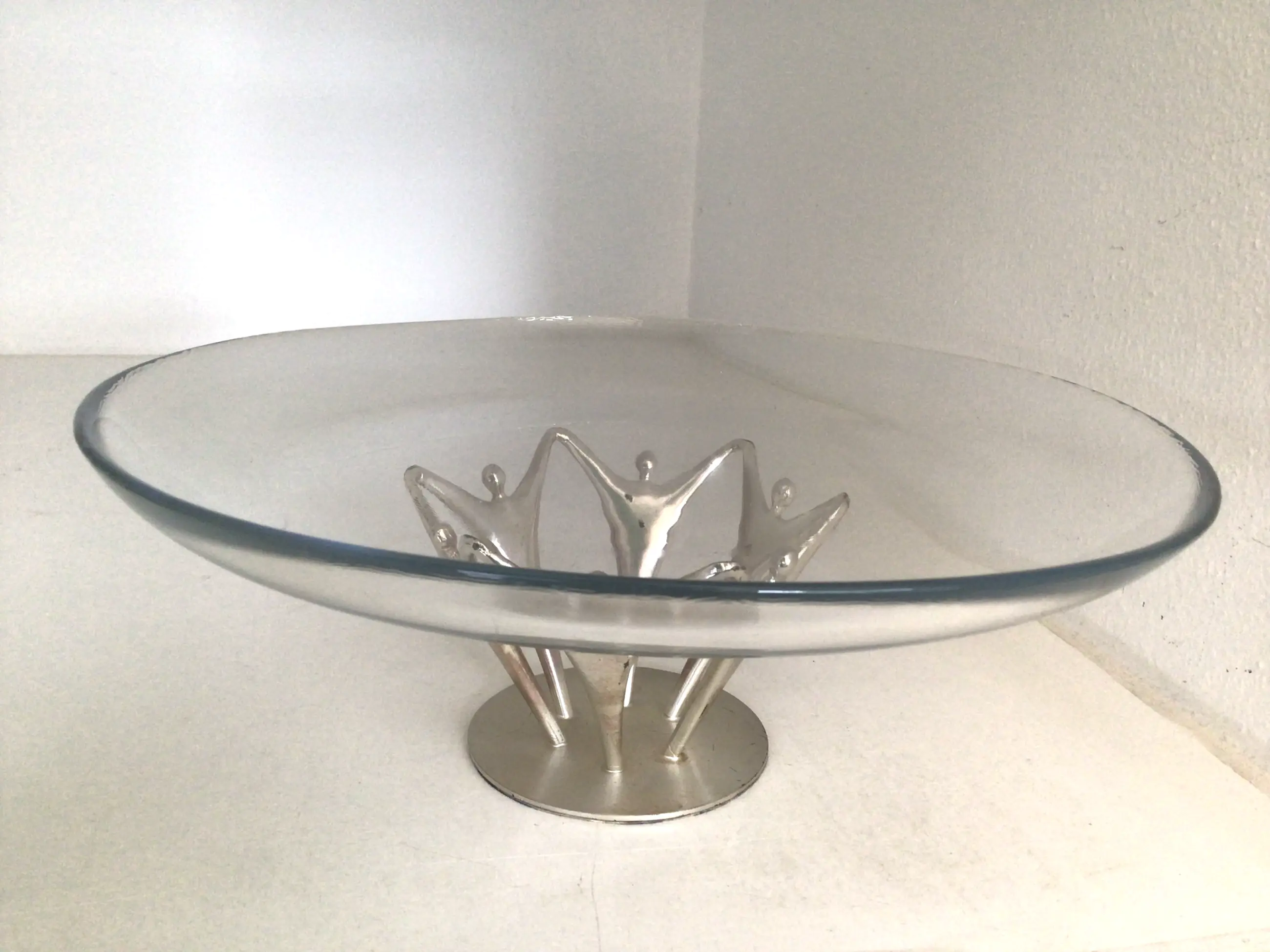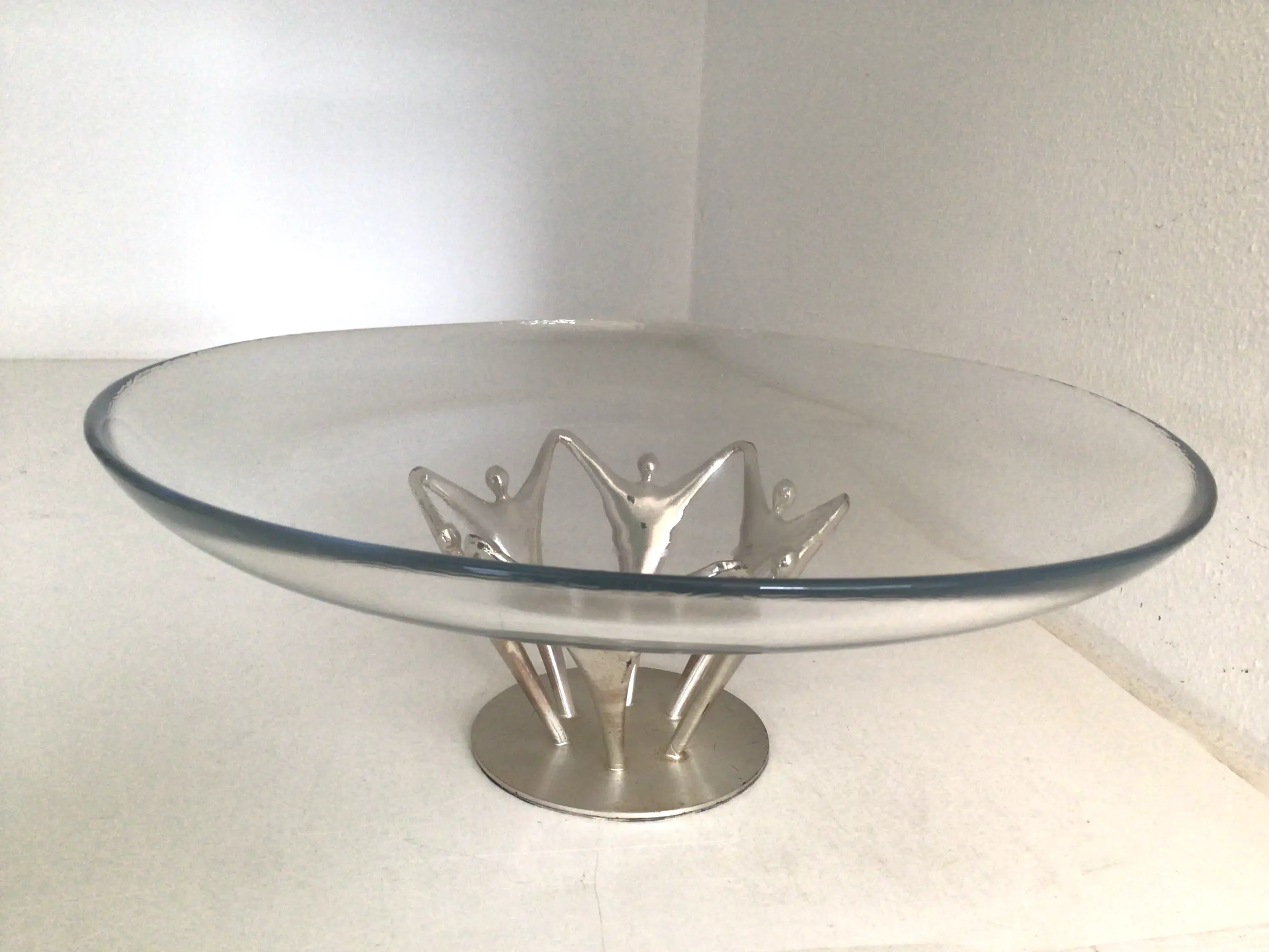 Zeer fraai en symbolisch sculptuur van een zestal mensfiguren die samen een glazen schaal dragen Kunstenares: Corry Ammerlaan Titel “ Samen de handen ineen “ Hoogte : 10 cm Doorsnee schaal: 28 cm Materiaal: Verzilverd metaal en glas De schaal verkeert in goede staat en wordt zorgvuldig verpakt verzonden.