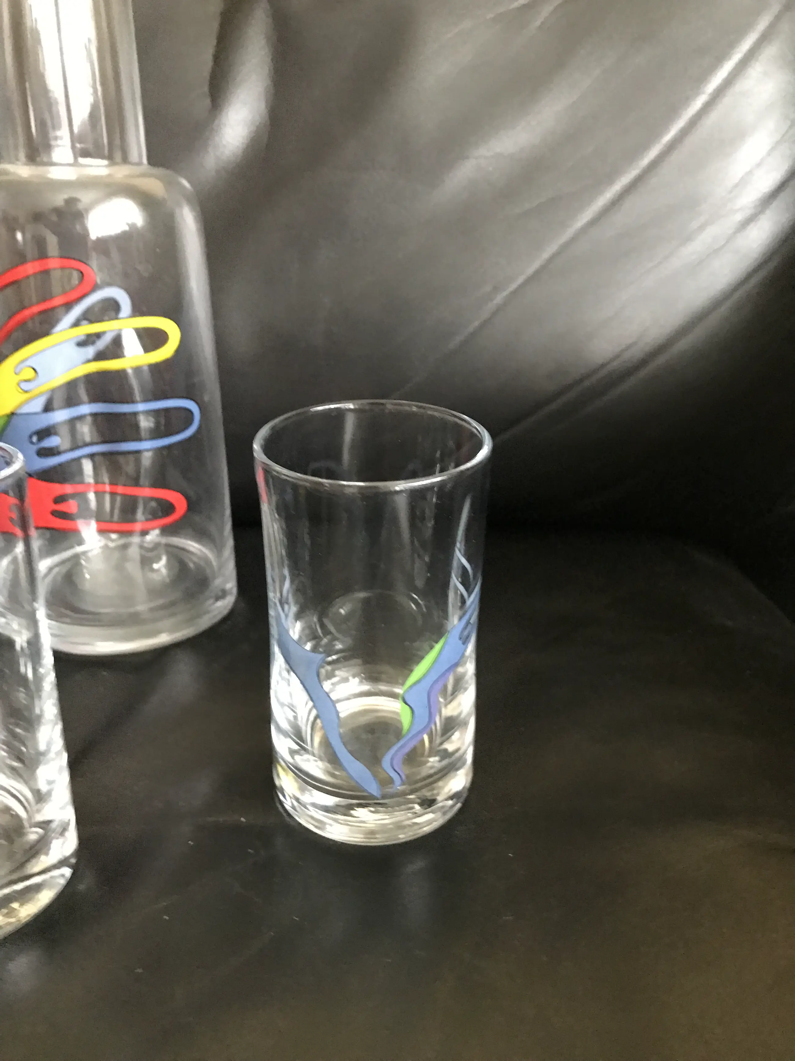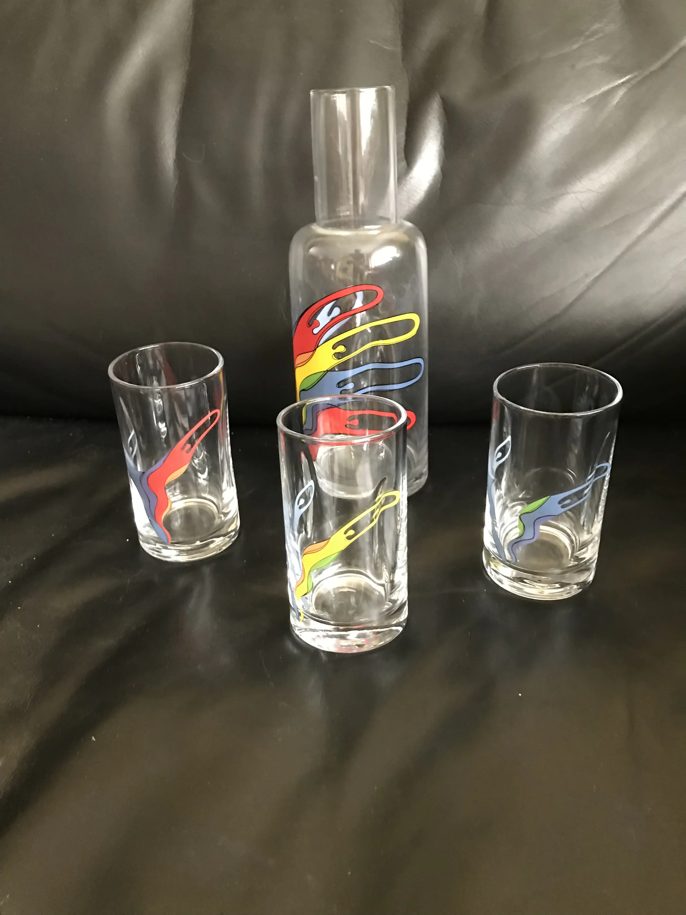 Gemerkt Ongesigneerd/Drukgesigneerd Omschrijving De glazen, en de karaf tonen karakteristieke “Ammerlaan-afbeeldingen”. Glazen: 11 x 6cm, met twee vasthouddeukjes per glas. Karaf: 25 x 14cm.