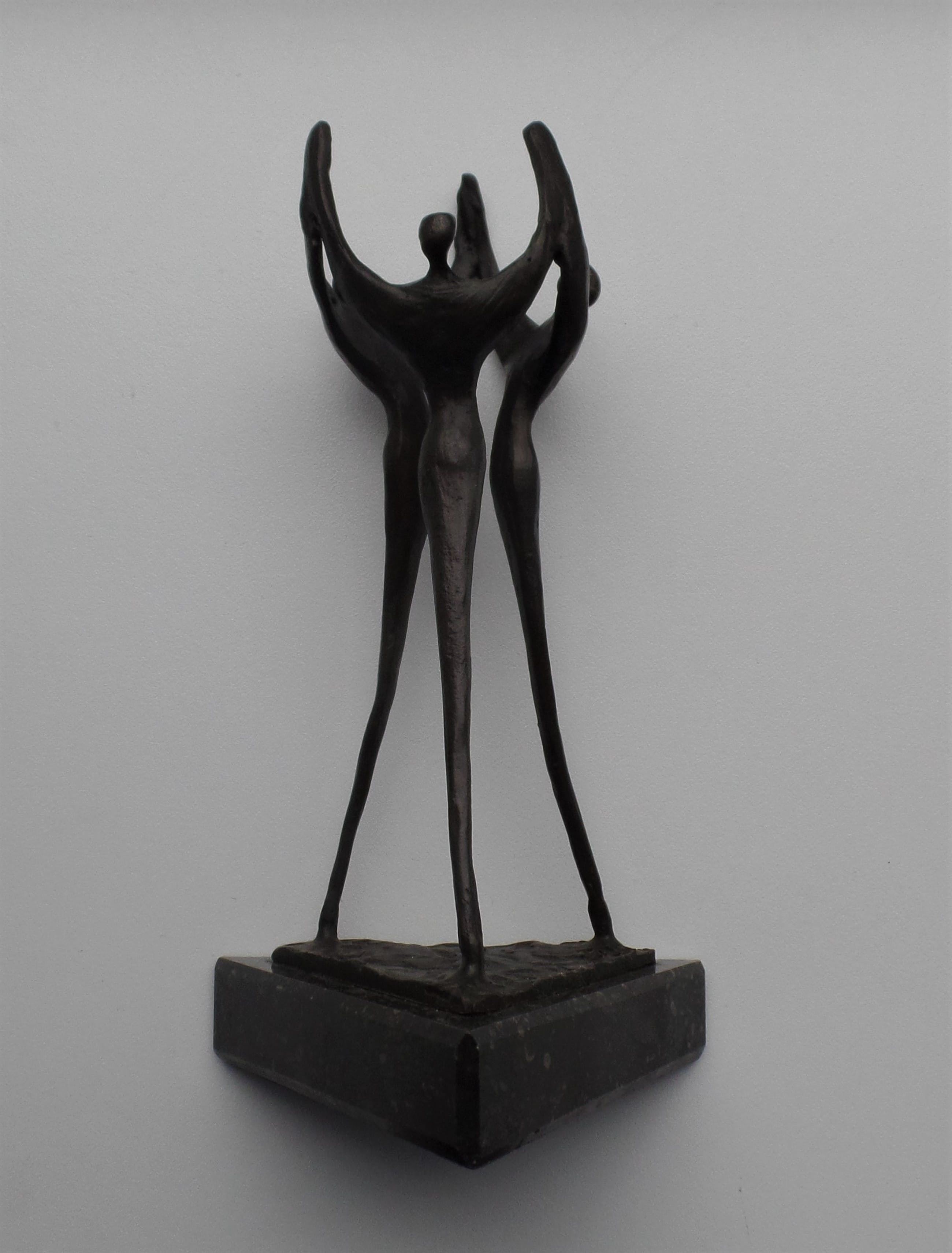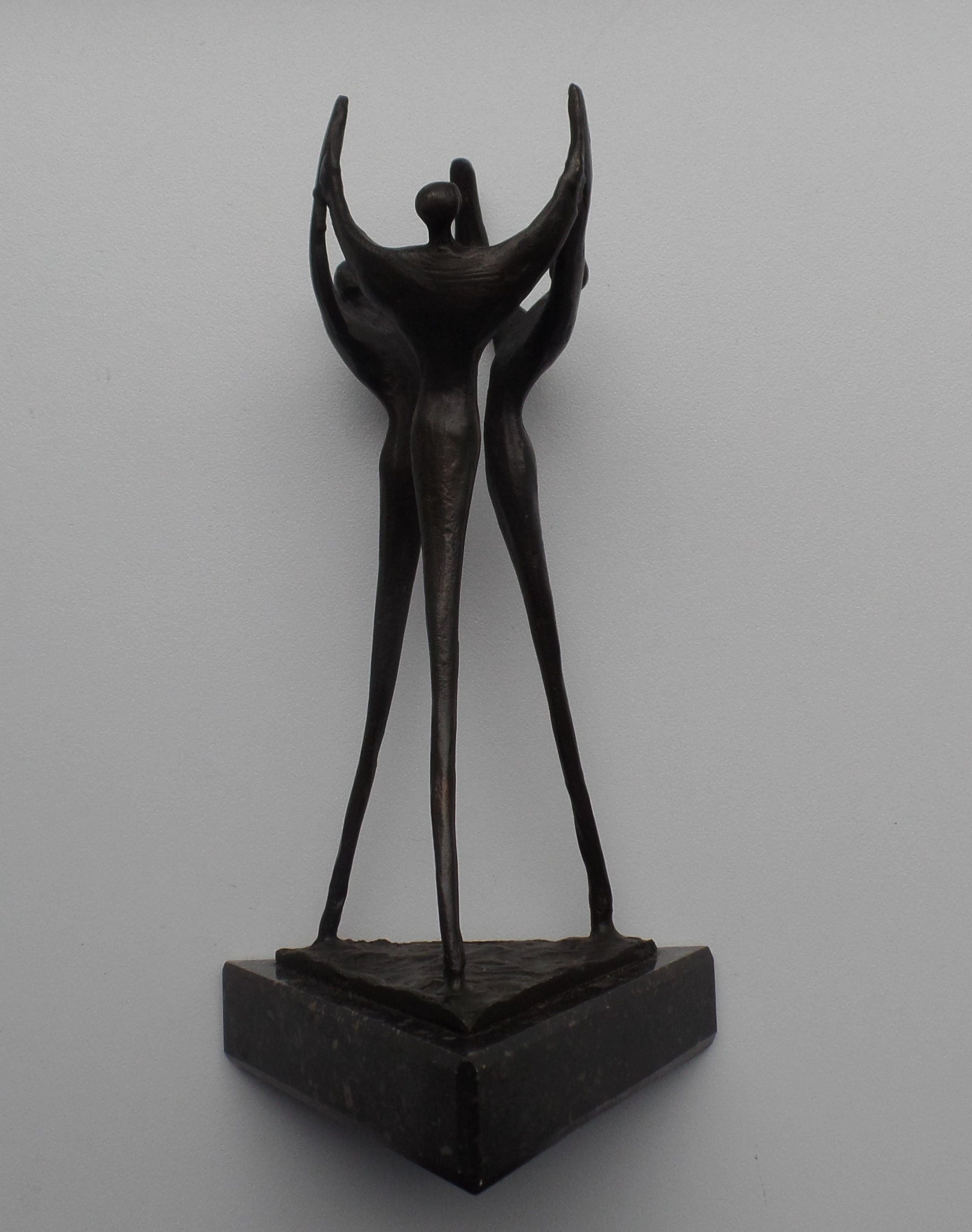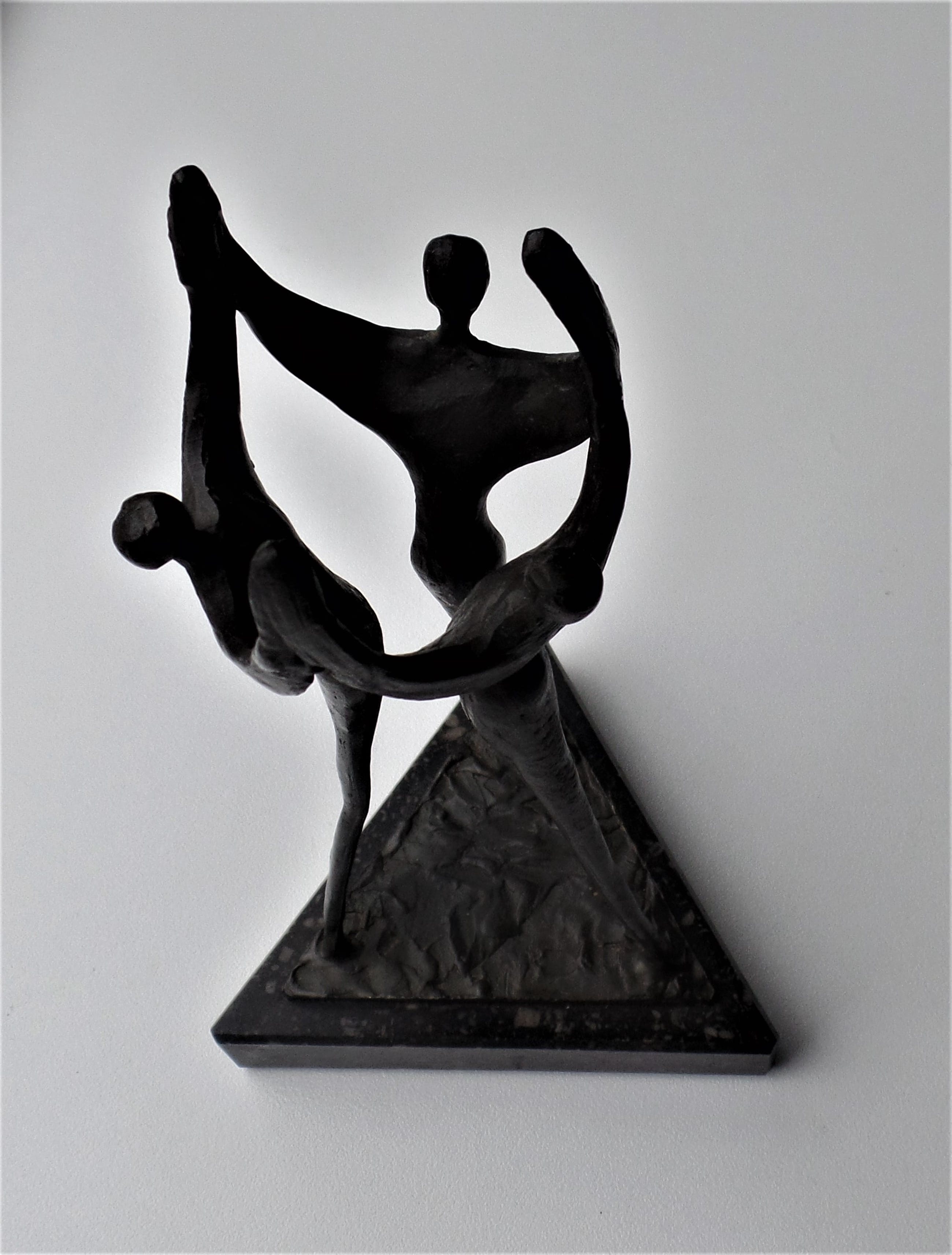 Prachtig bronzen beeld van drie mensen met monogram (can) Object is geplaatst op een origineel granieten sokkel.