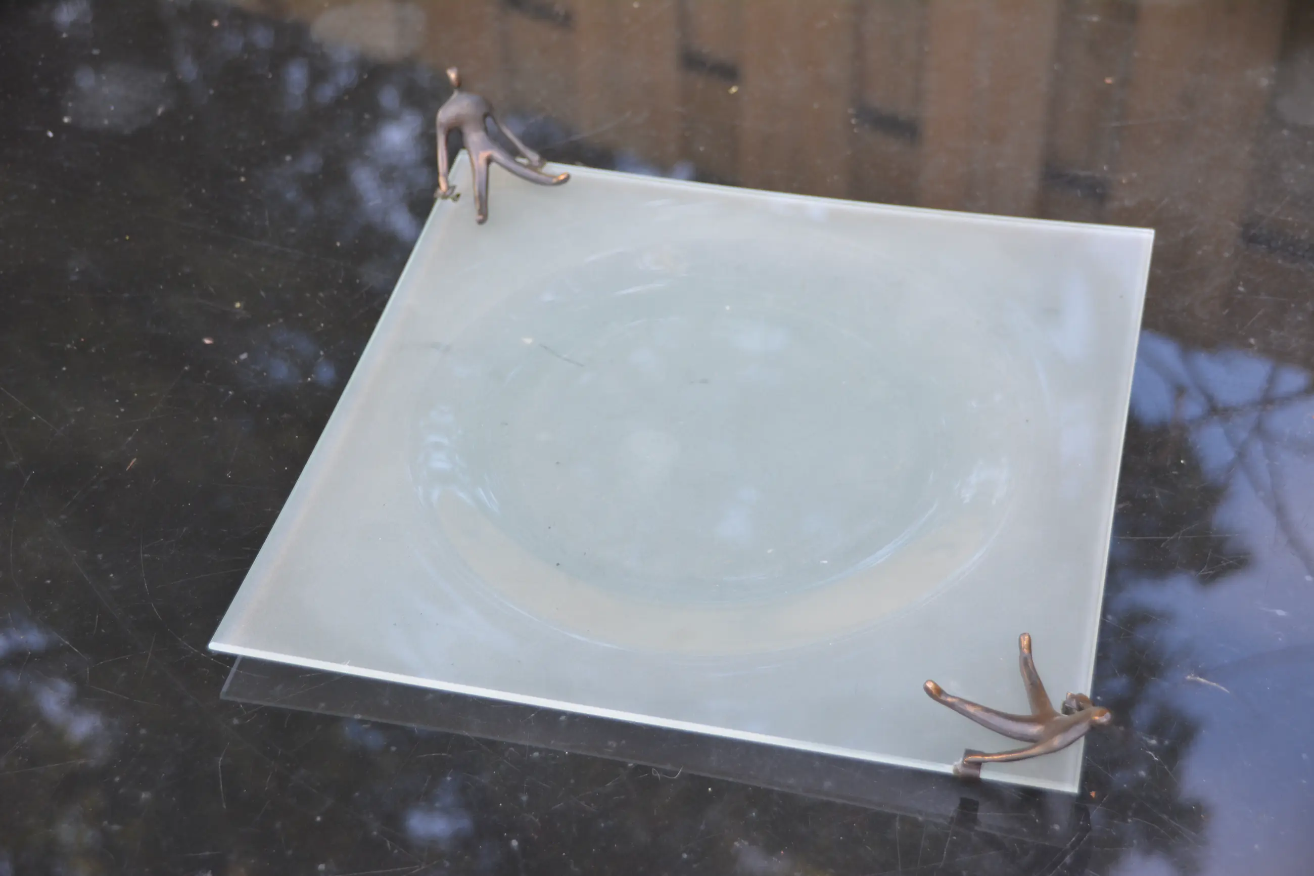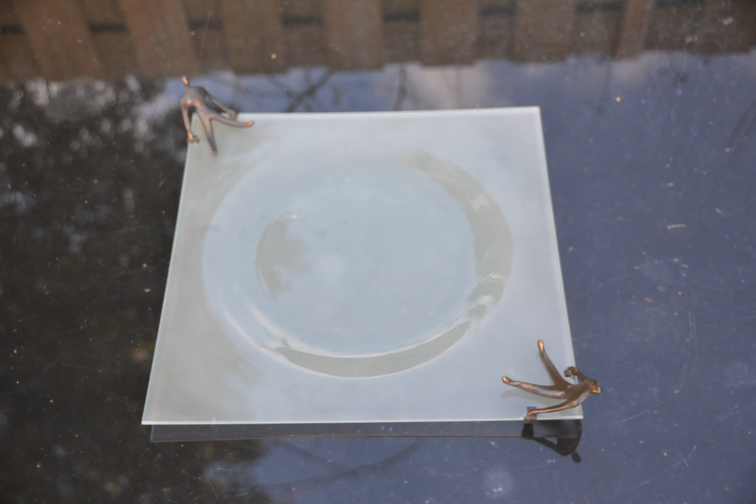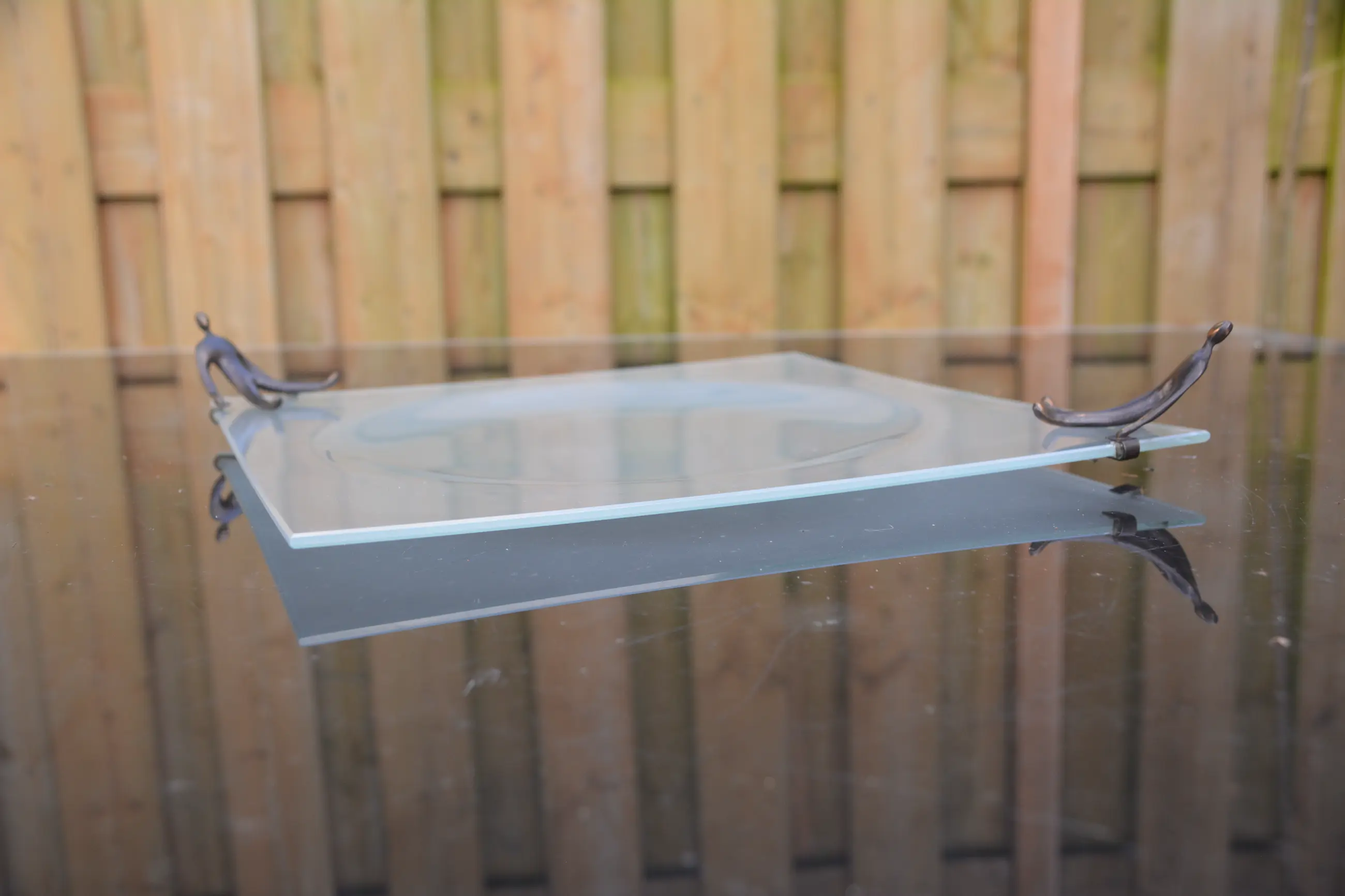 De vierkante schaal heeft in het midden een ronde verdieping van ongeveer een centimeter en is aan de onderzijde ruw ongepolijst en aan de bovenzijde glanzend gepolijst.