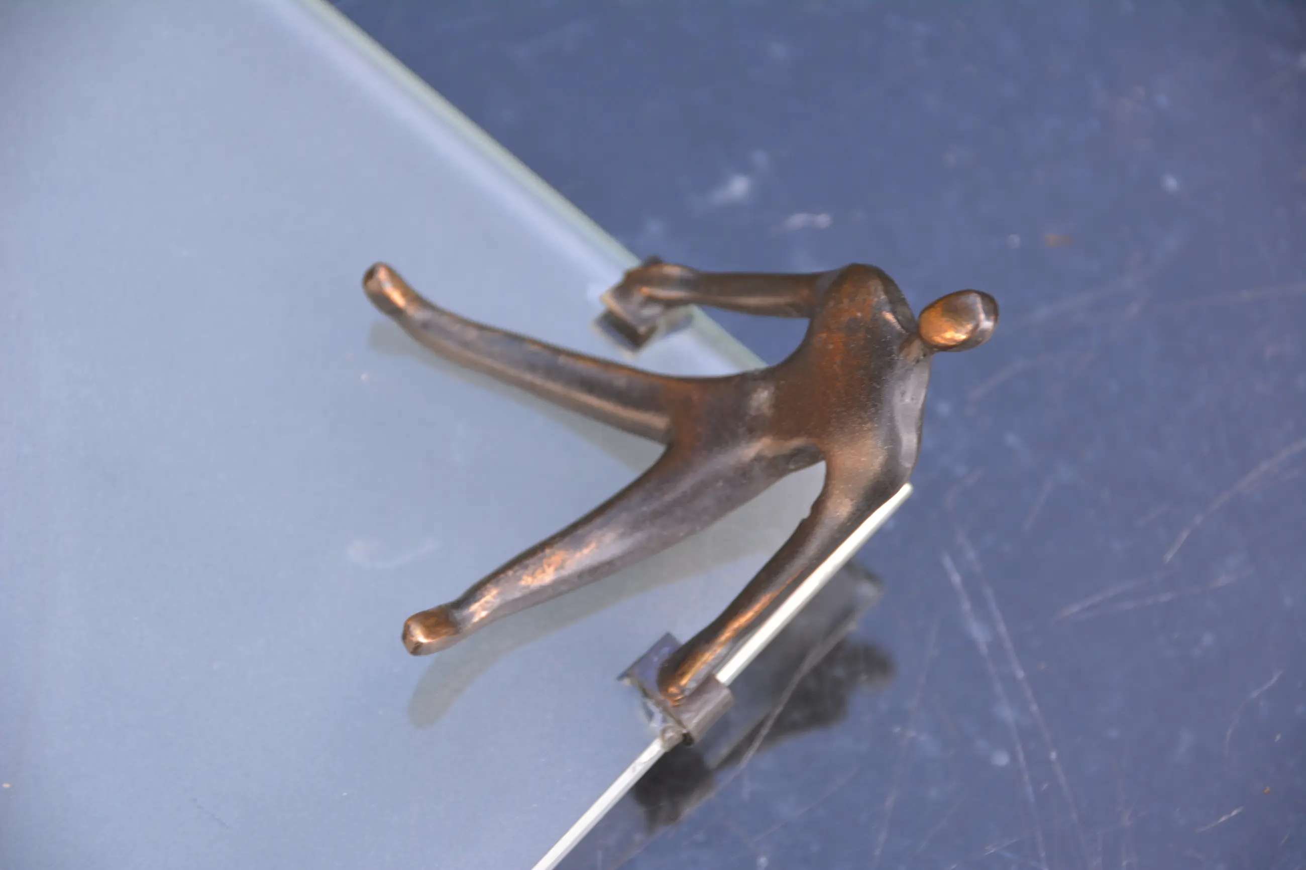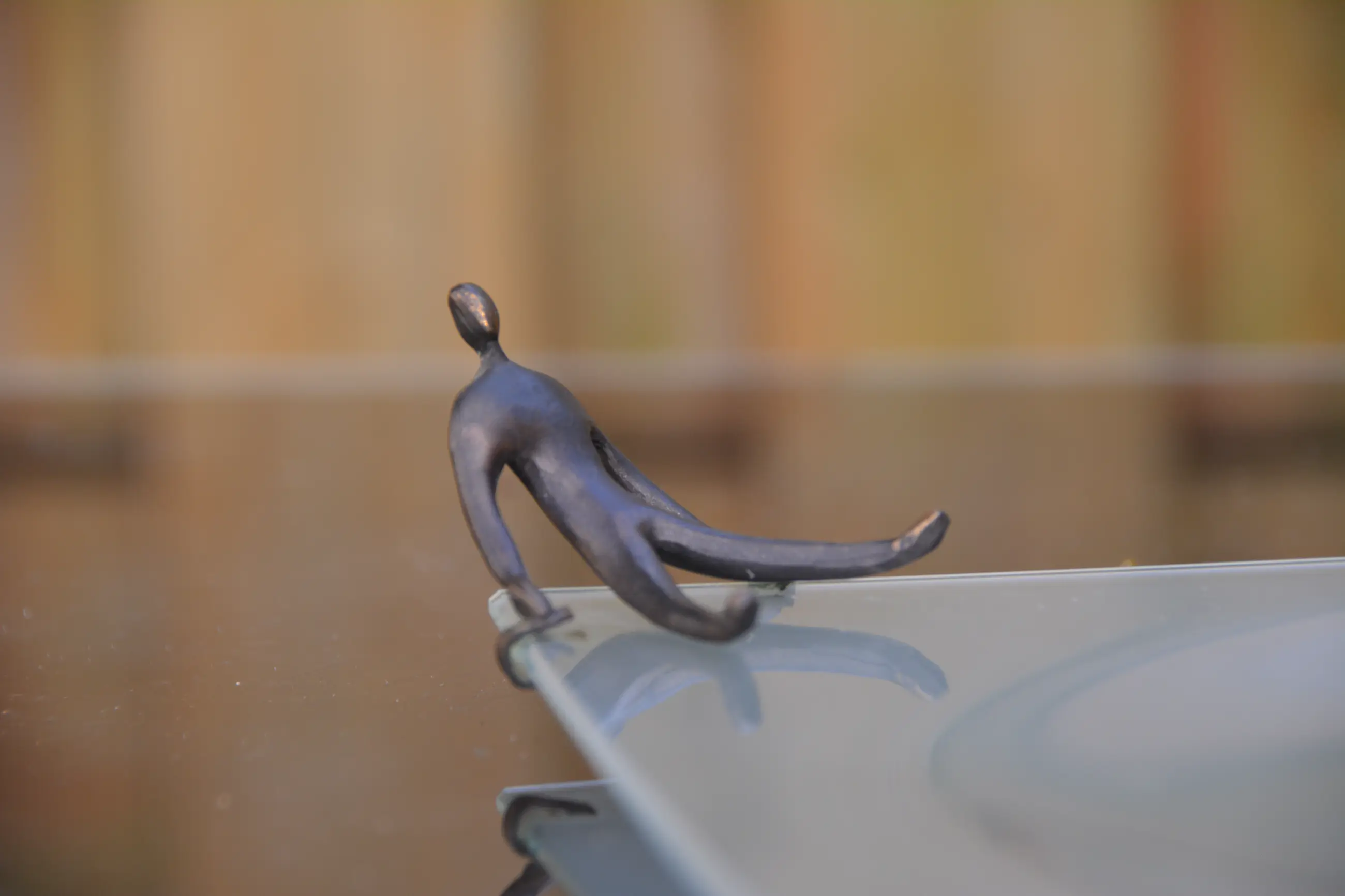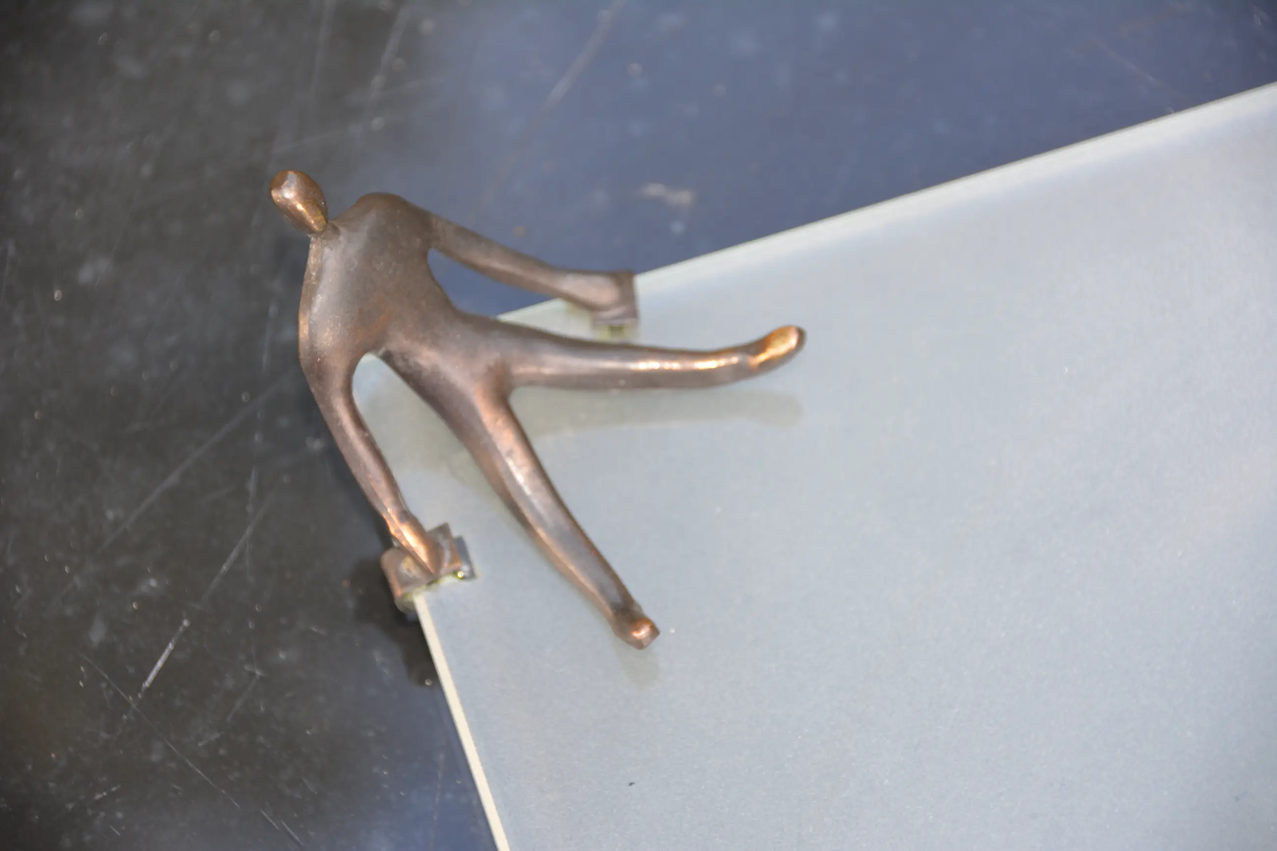 Aan twee zijden zijn twee zittende verbronsd metalen figuren bevestigd van 5 centimeter hoog die ook als handvat dienst kunnen doen.