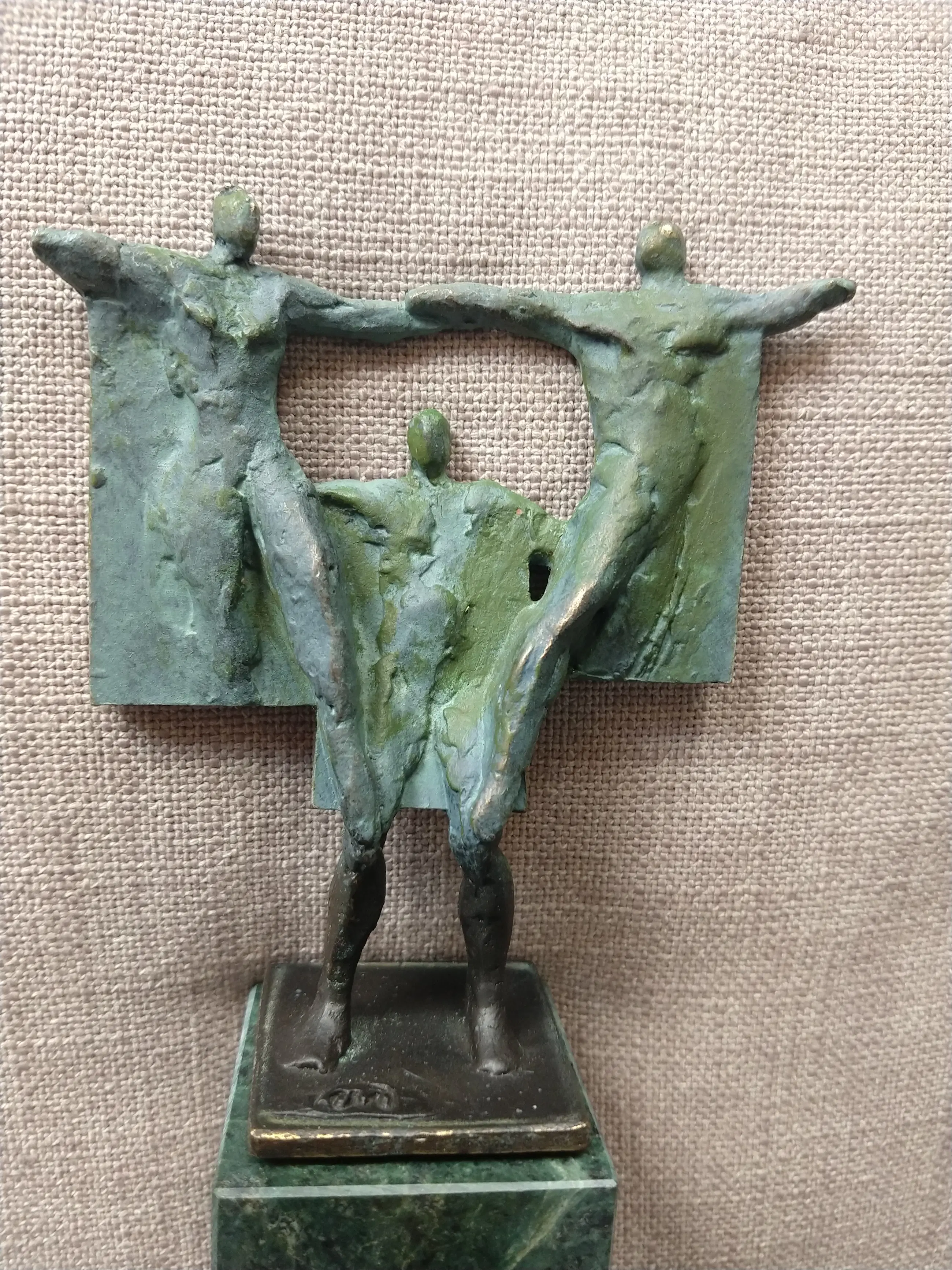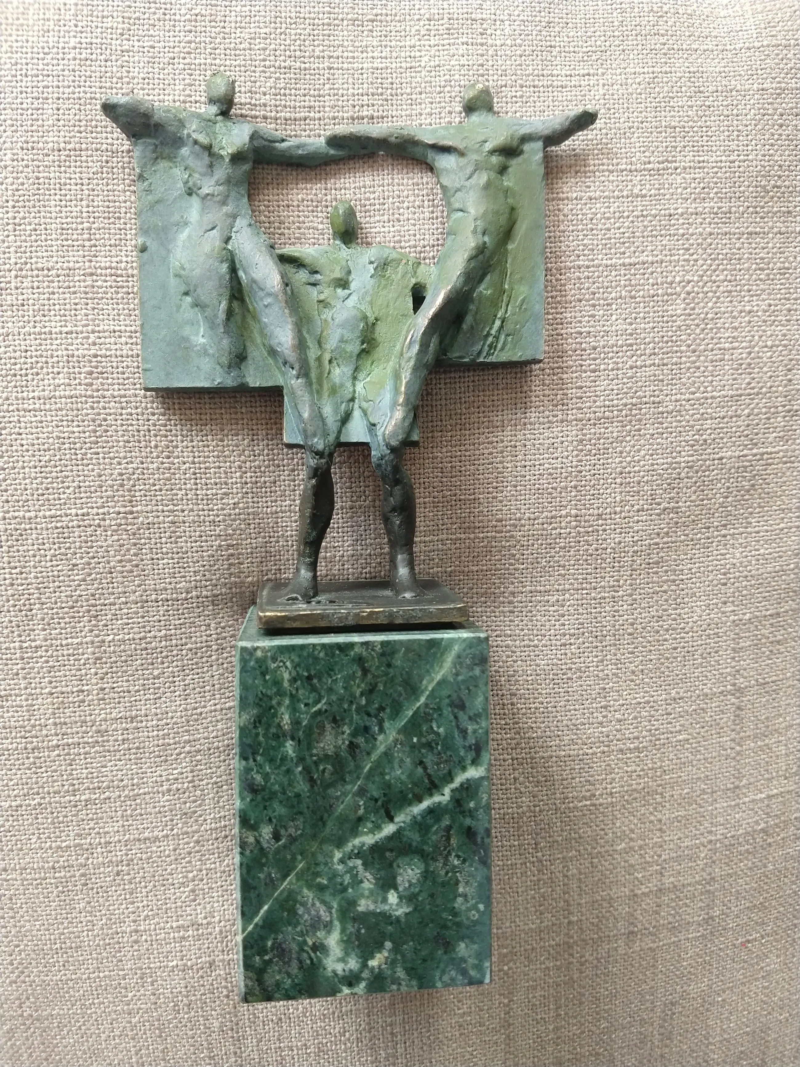 Corry Ammerlaan beeld Bijzonder beeld van Corry Ammerlaan, uitgevoerd in bronskleur met groene patina en geplaatst op een natuurstenen sokkel. Het kunstwerk toont drie gestileerde figuren die verbondenheid en samenwerking uitbeelden. In goede staat.
