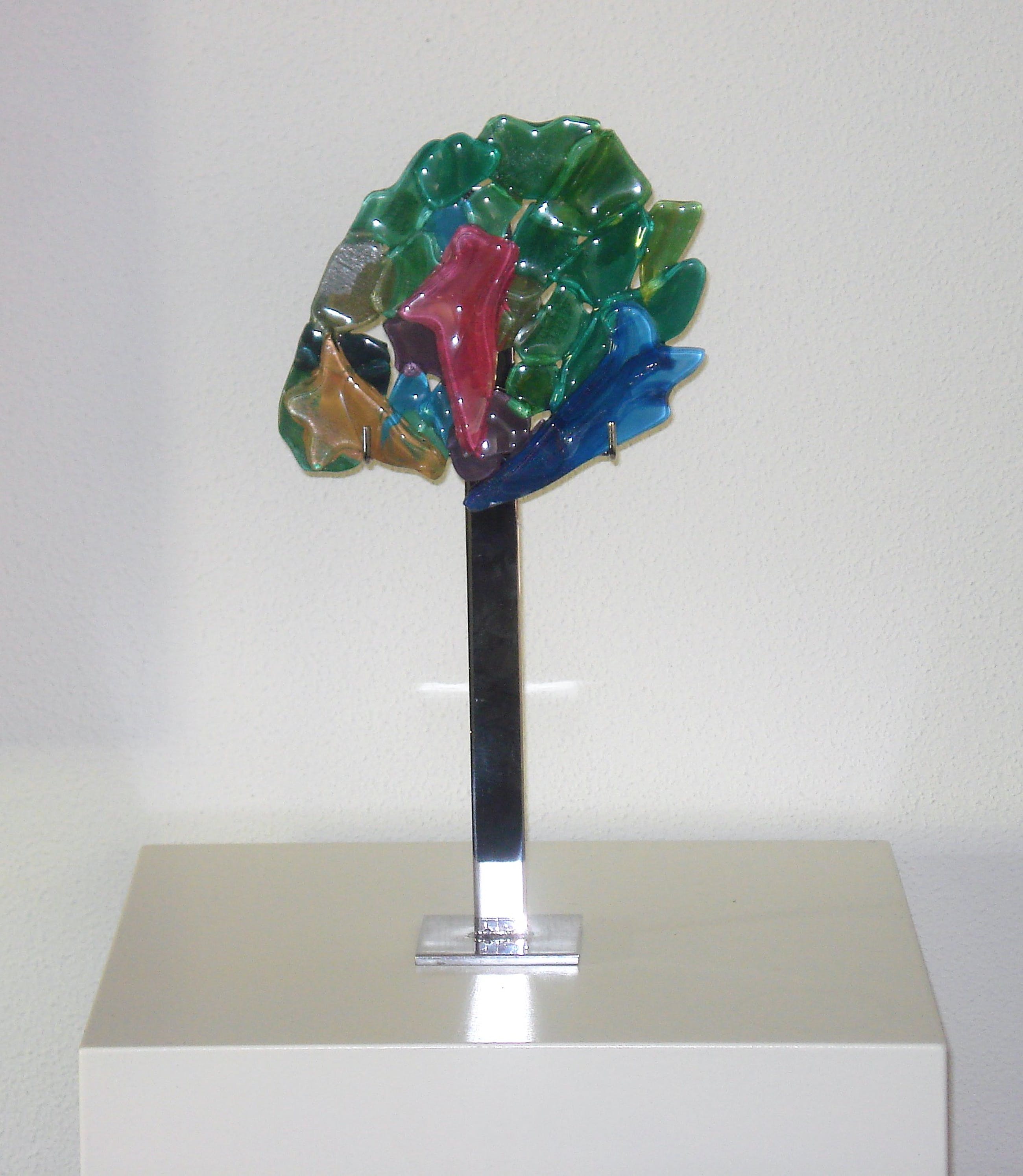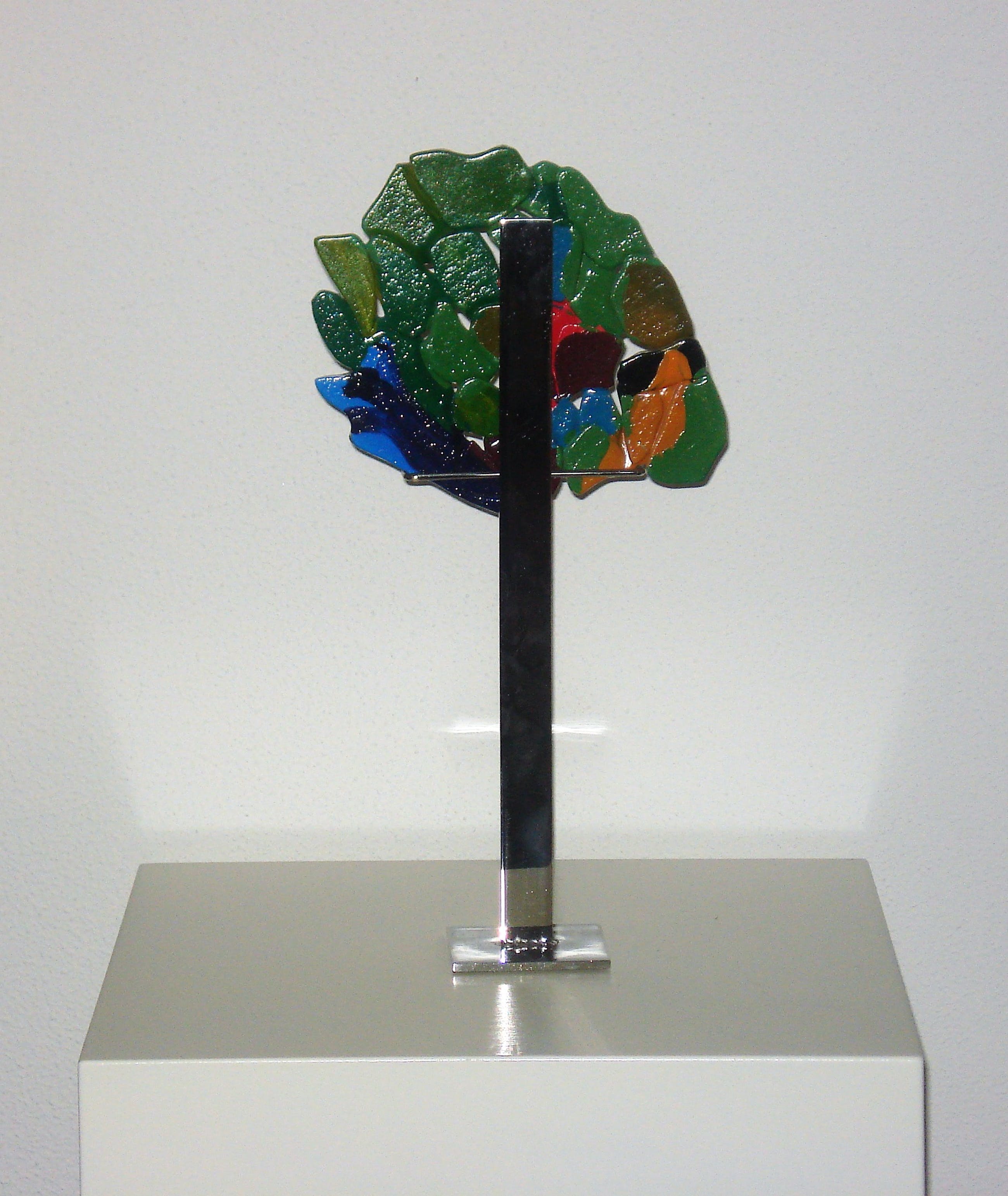 Glasfusie art object op roestvrijstalen sokkel, gemaakt door de bekende kunstenares Corry Ammerlaan-van Niekerk voor galerie Artihove. Het kunstwerk is voorzien van certificaat. Hoogte ca. 33 cm. Afmetingen plaquette ca. 15 x 15 cm. Materiaal glas en RVS. In super conditie. Wordt geleverd in originele doos.