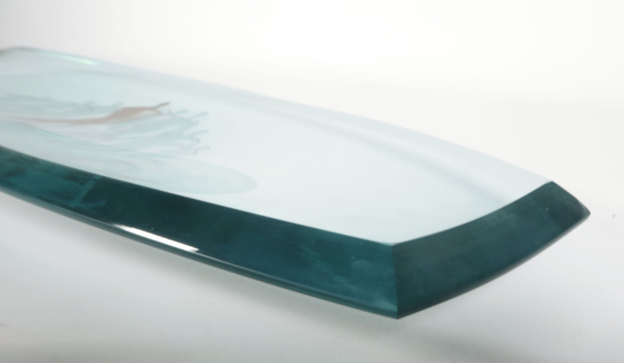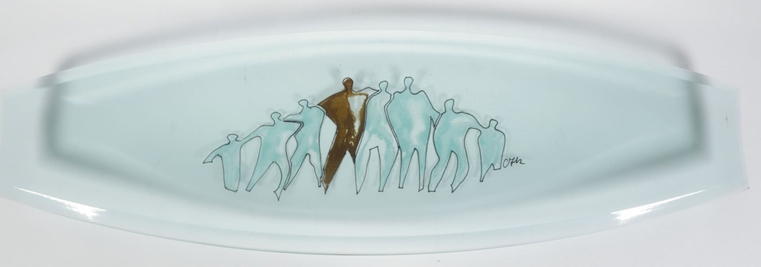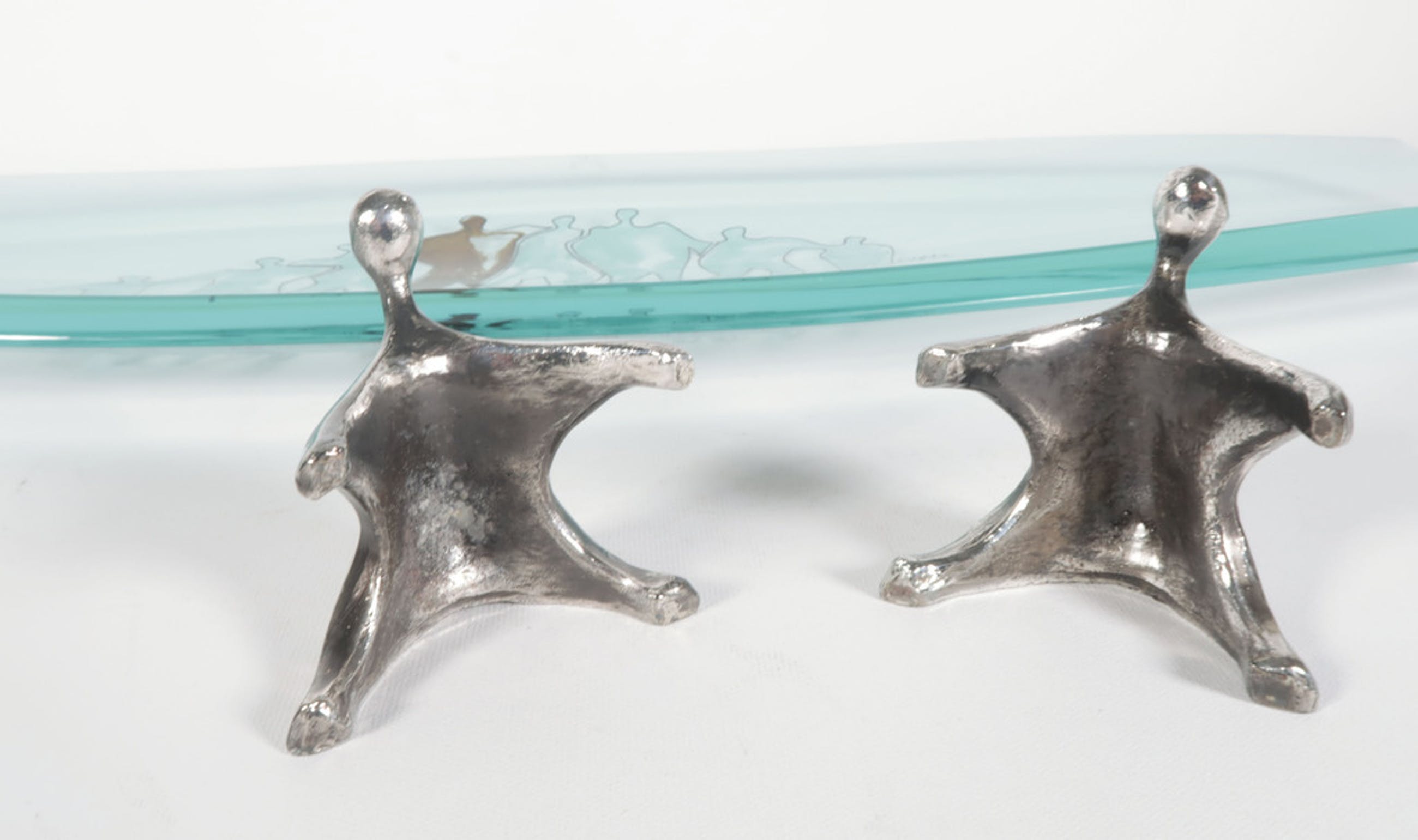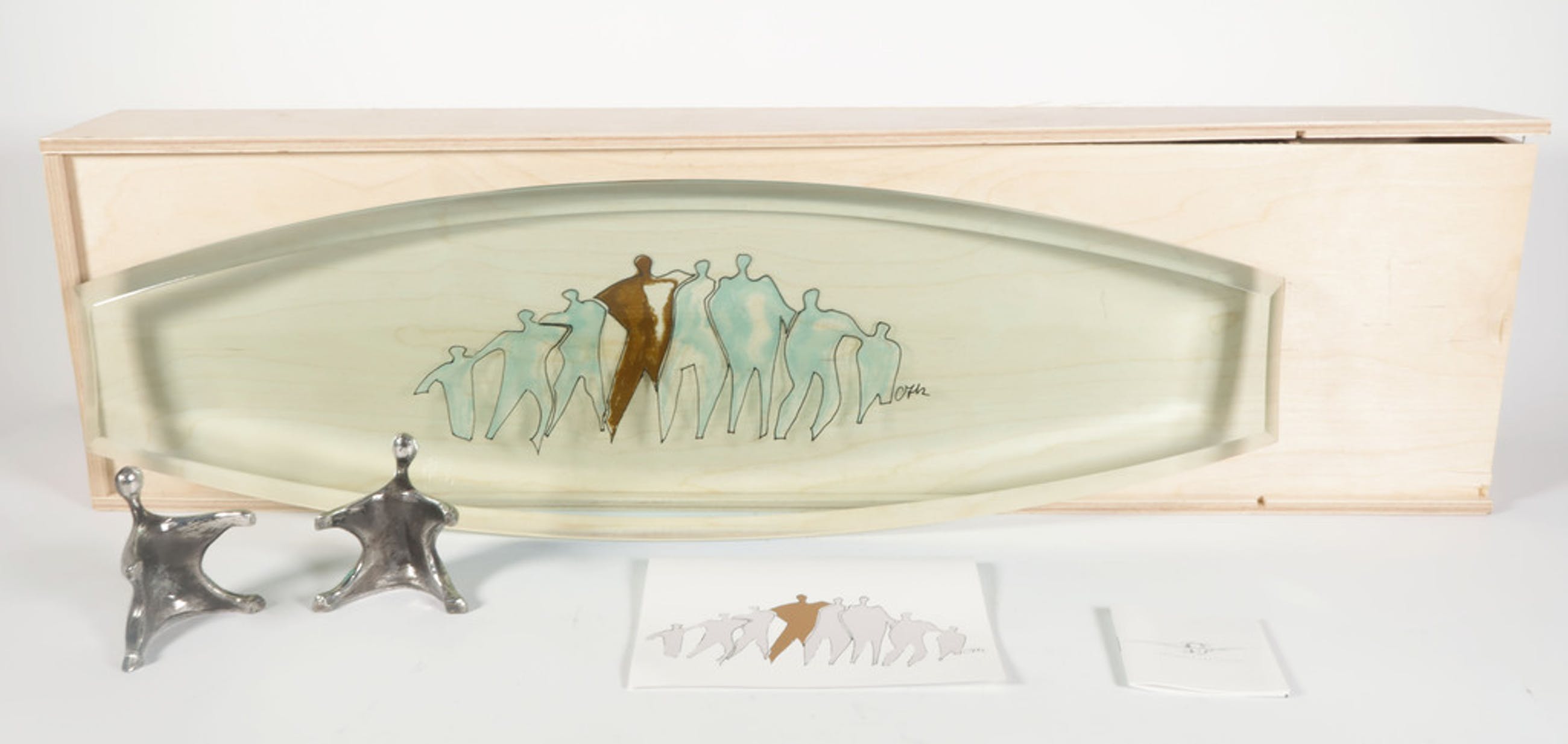 Titel: Glazen schaal met twee metalen sculpturen in houten bewaarbox met documentatie