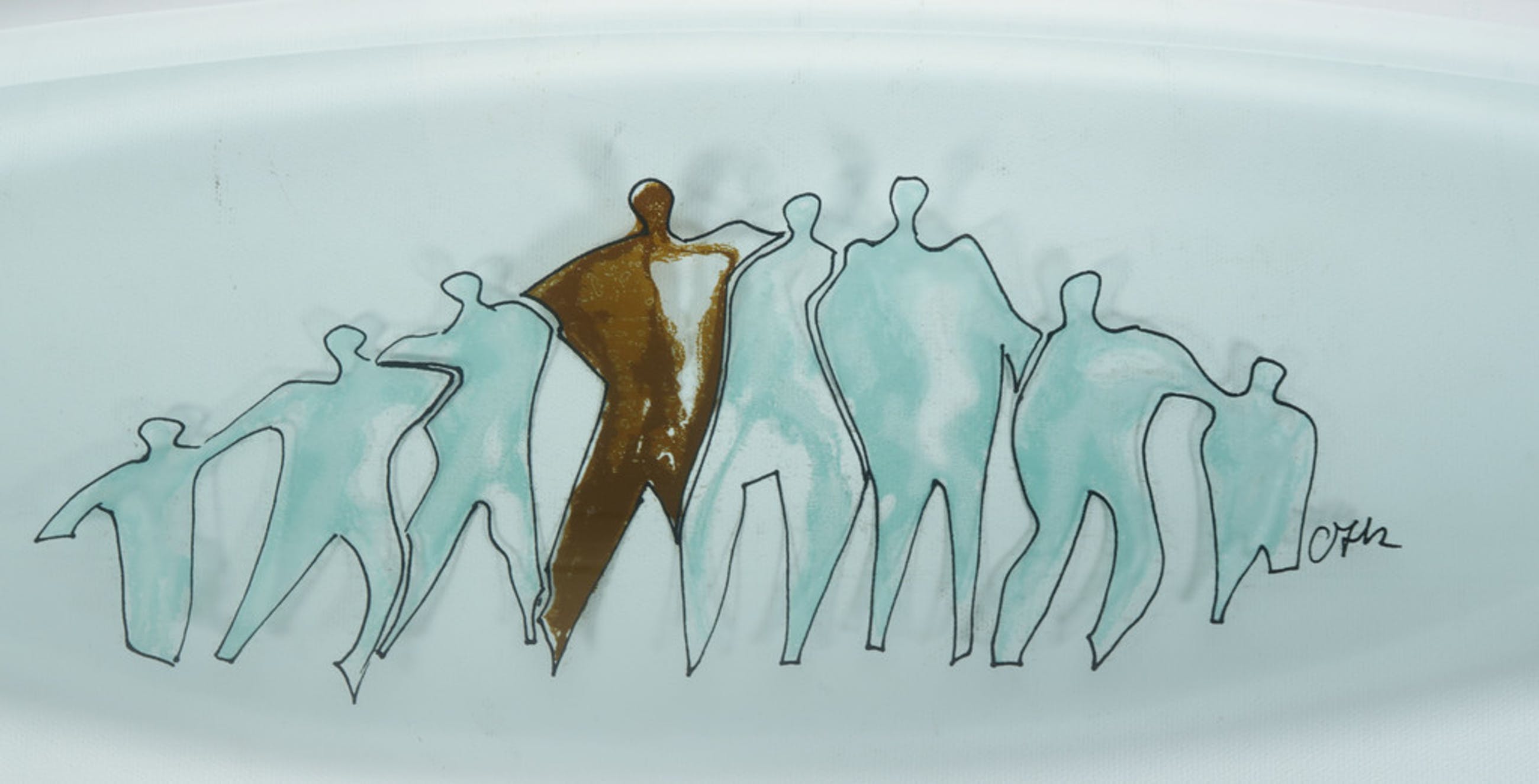 Afmetingen: Schaal 21 cm x 65 cm, sculpturen 8 cm x 7,5 cm, bewaarbox 80 cm x 10 cm