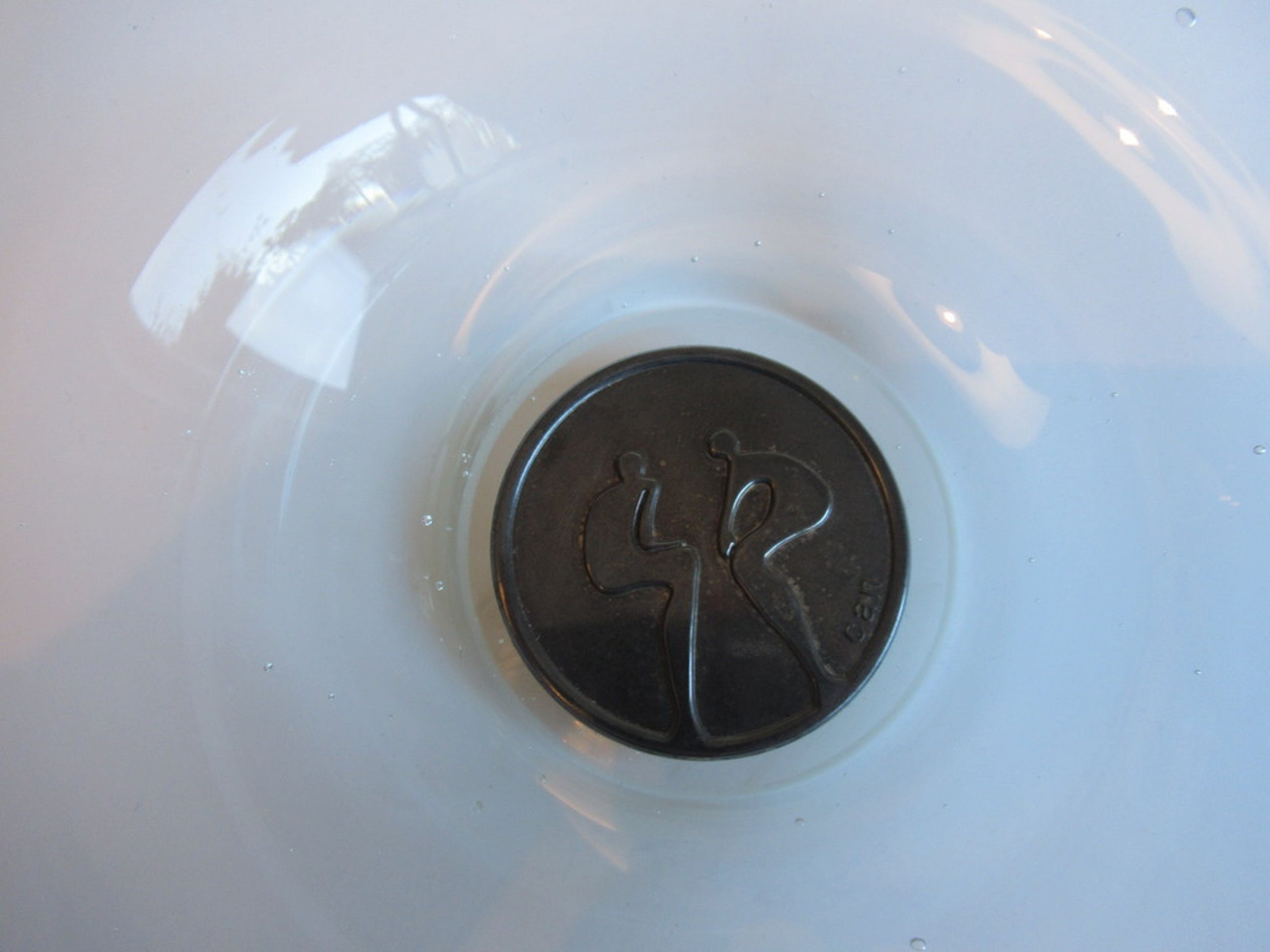In het midden van een schaal zit een munt met twee zittende figuren.