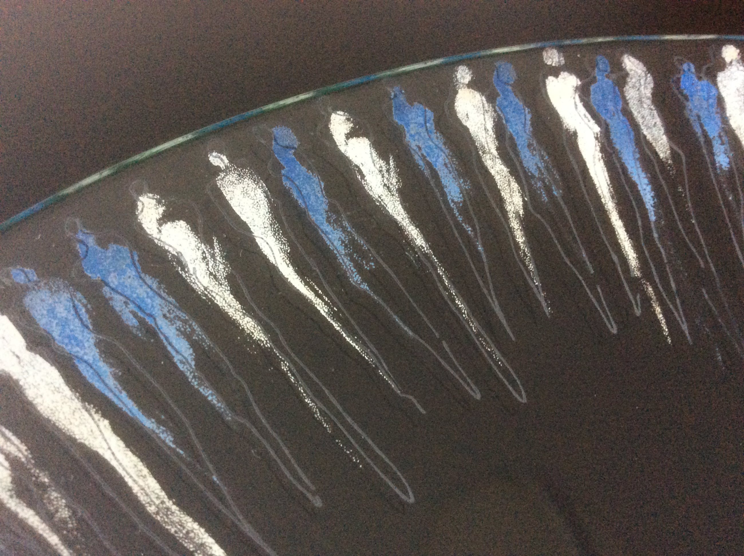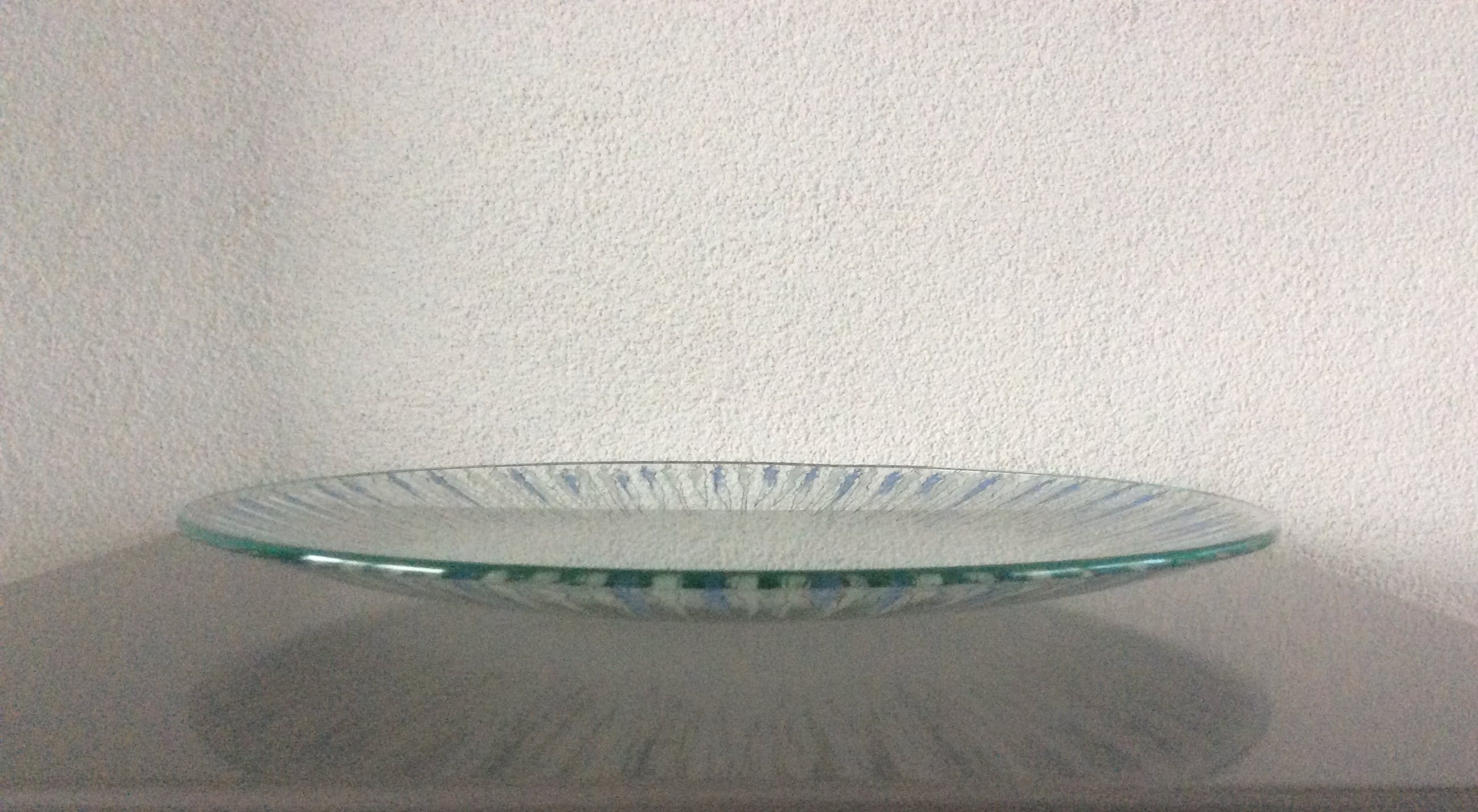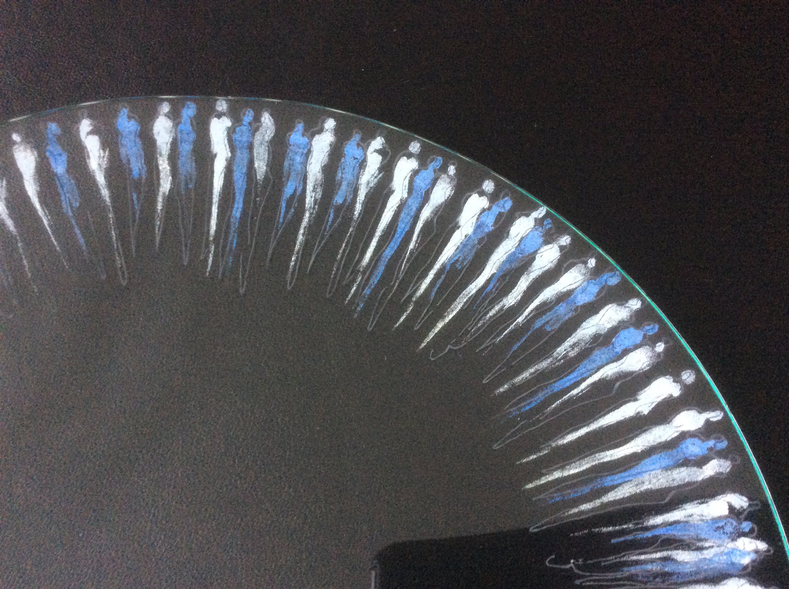 Glazen schaal met de voor Corry Ammerlaan kenmerkende mensfiguren. De schaal heeft bij strijklicht een enkel oppervlakkig, nauwelijks zichtbaar gebruiksspoortje.