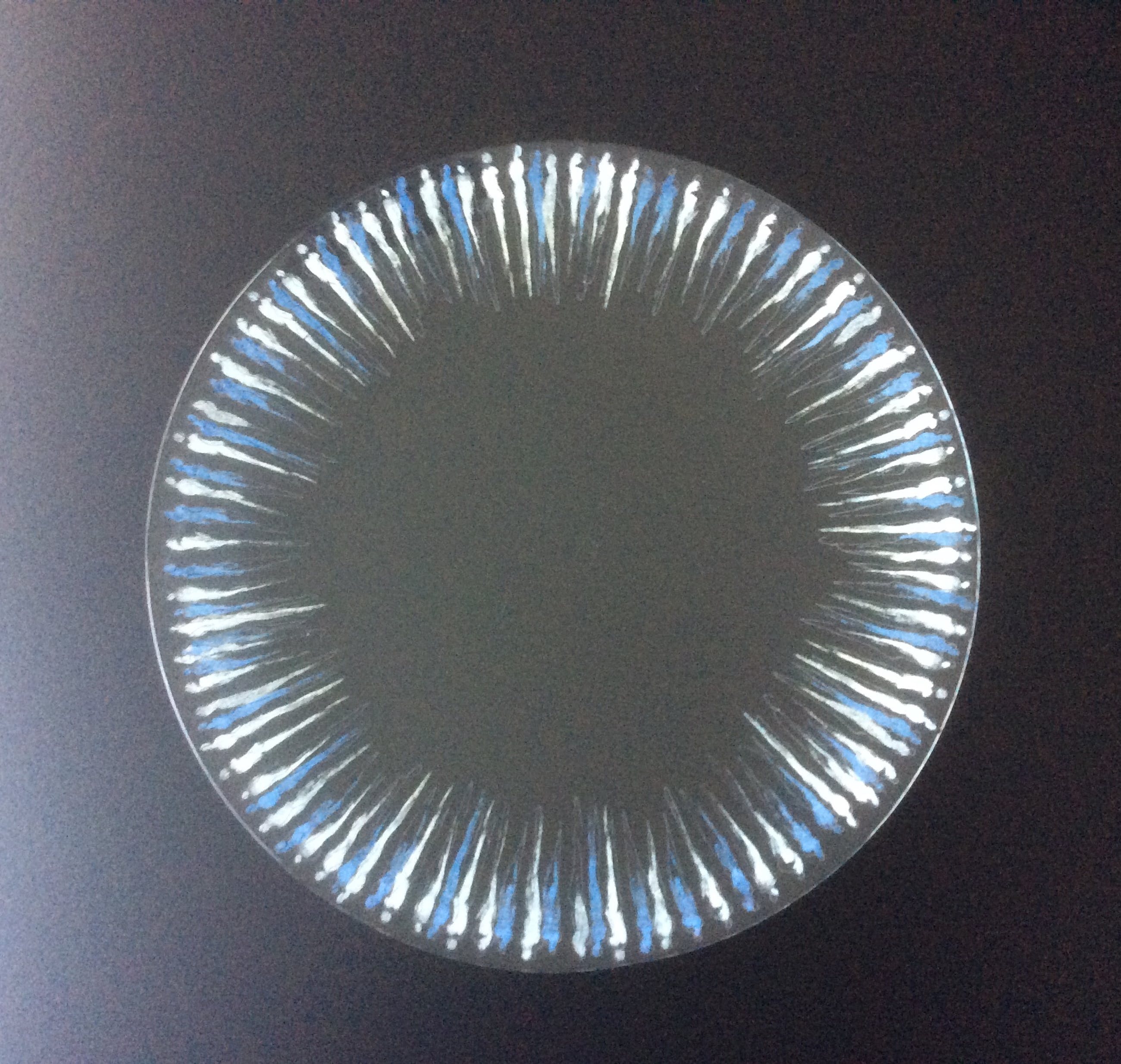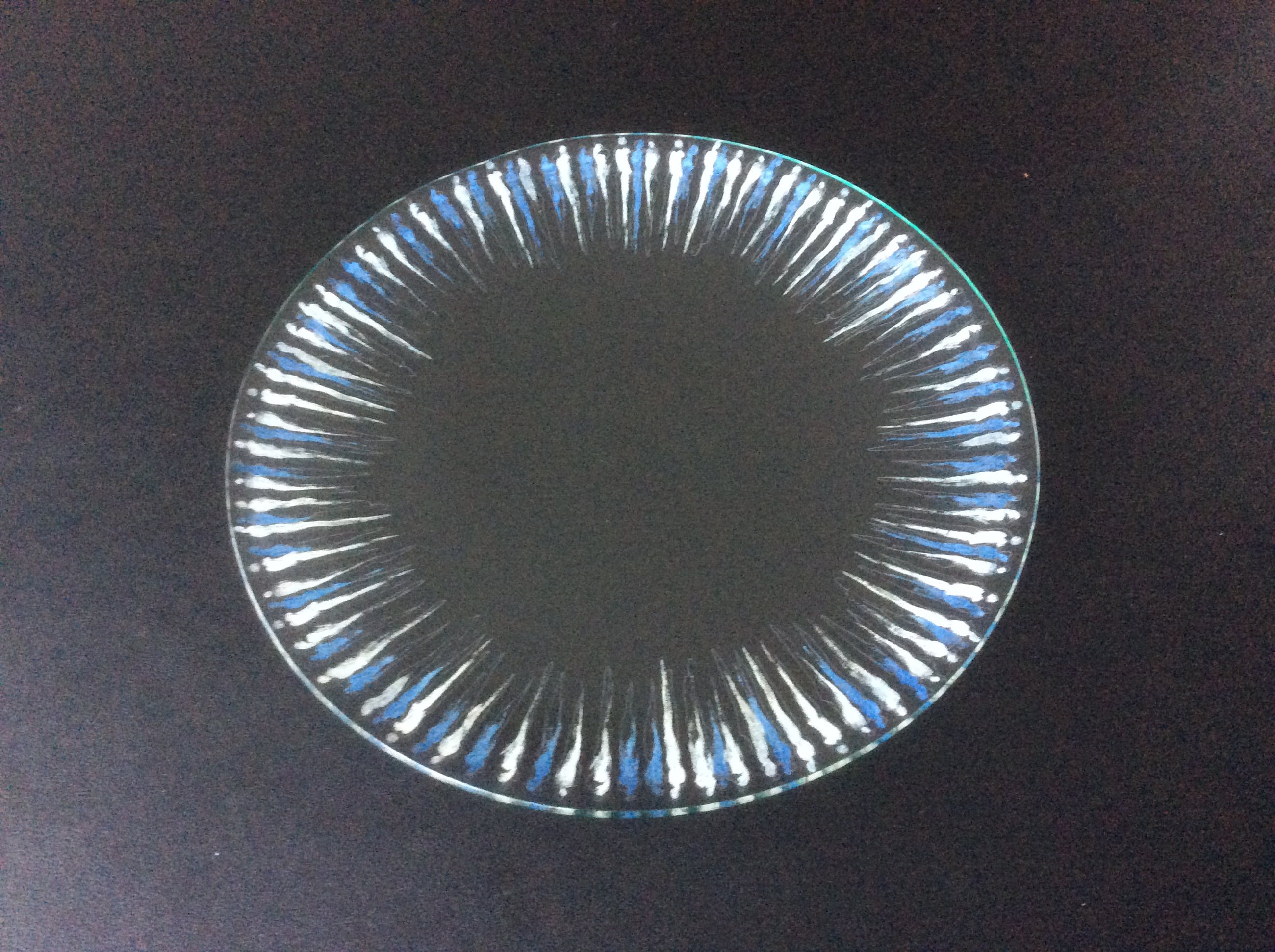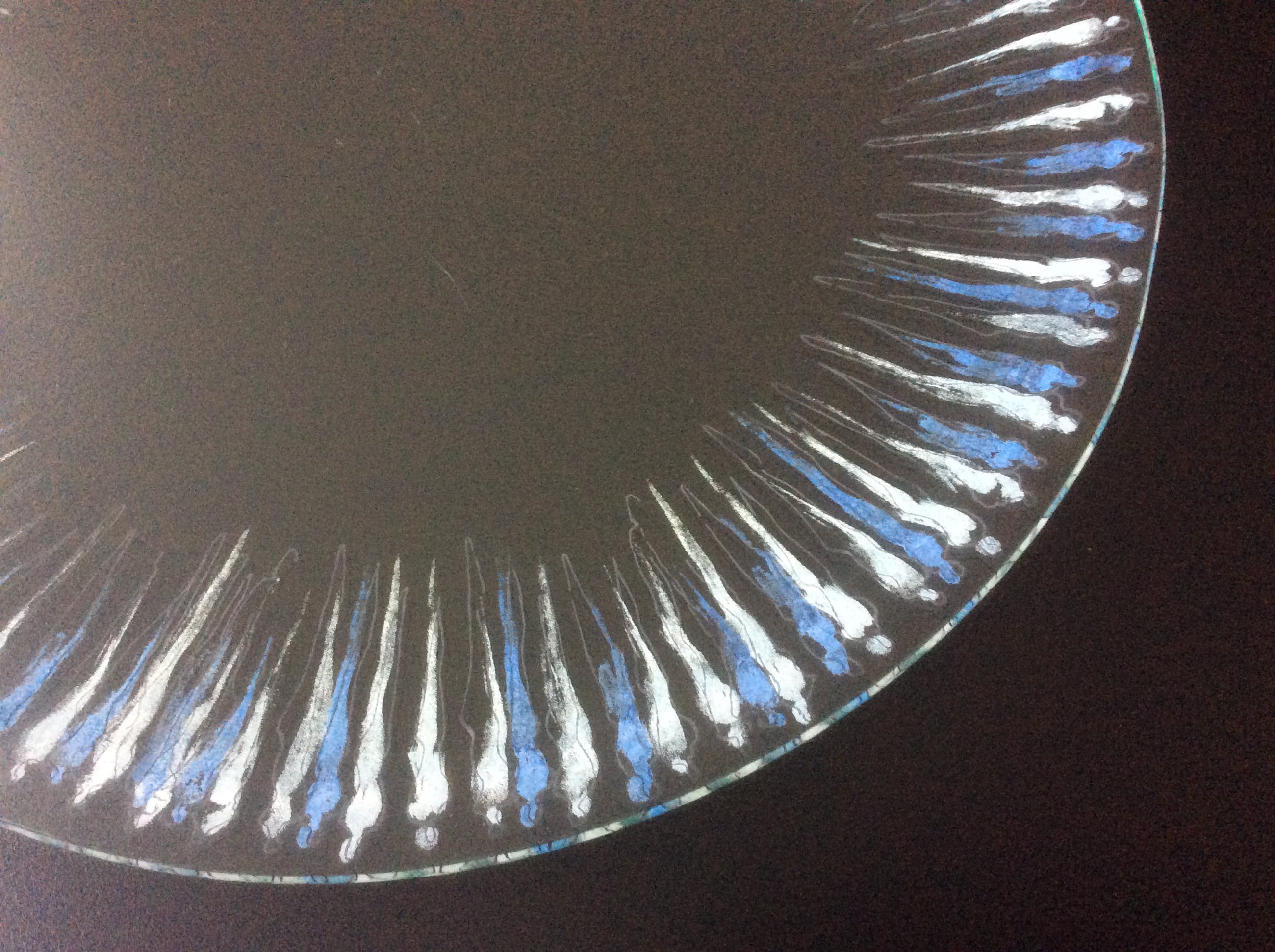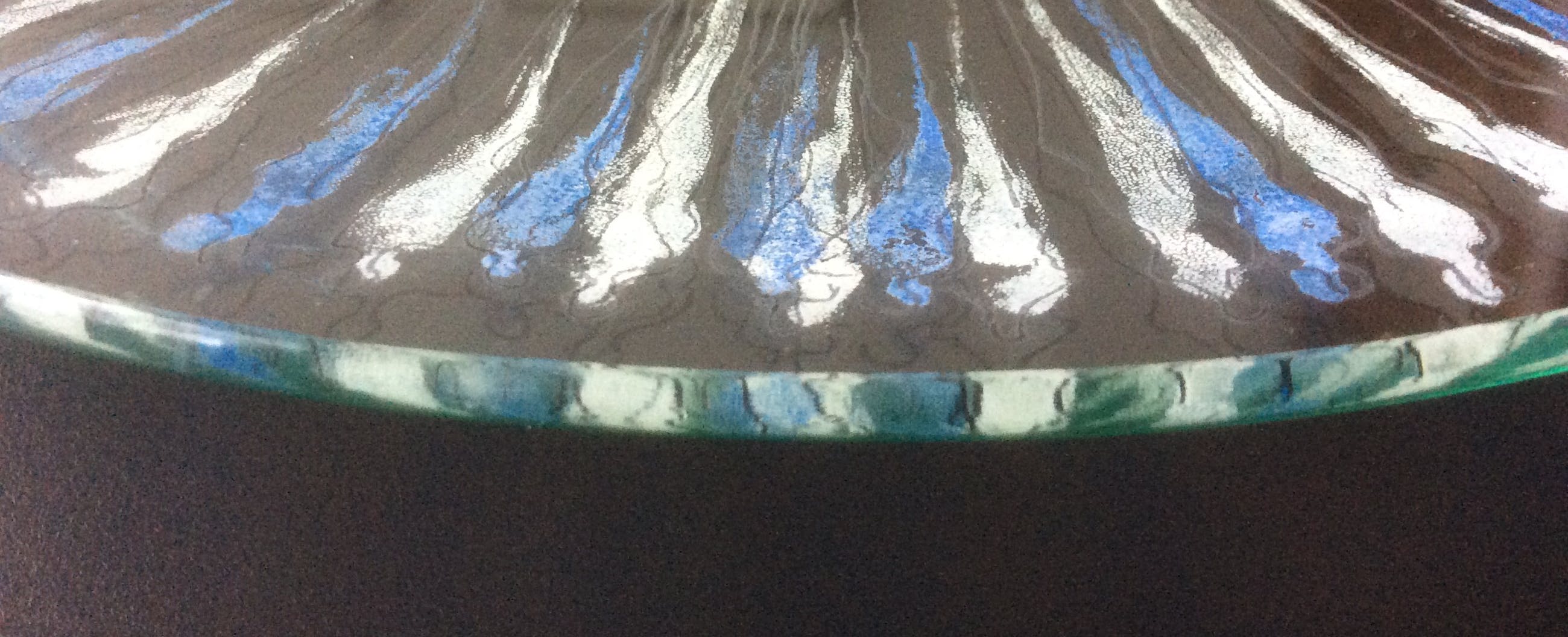 Glazen schaal met de voor Corry Ammerlaan kenmerkende mensfiguren. De schaal heeft bij strijklicht een enkel oppervlakkig, nauwelijks zichtbaar gebruiksspoortje.