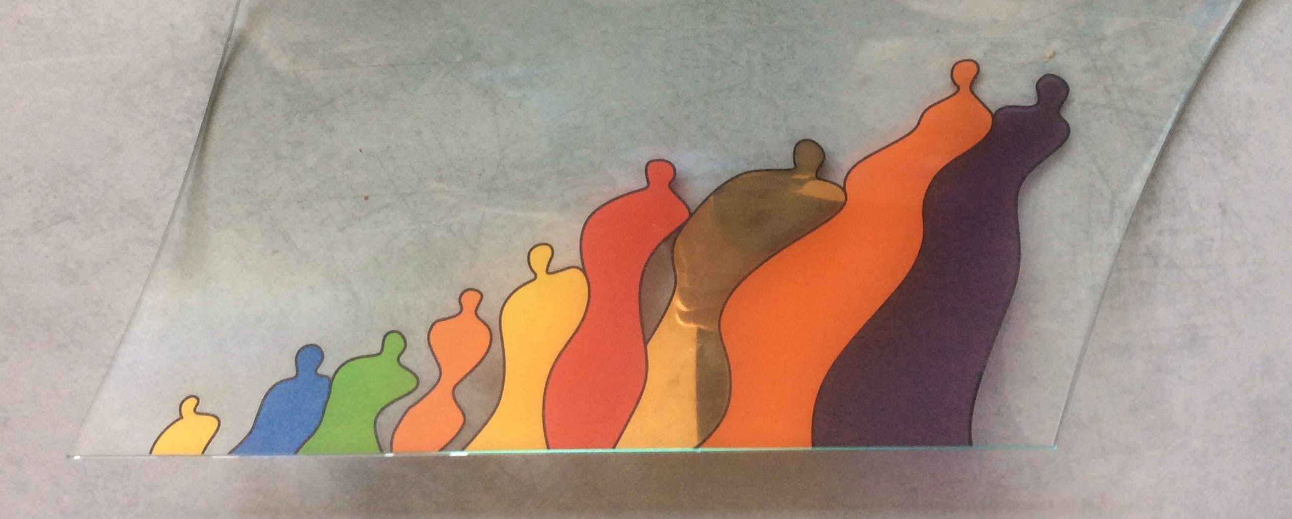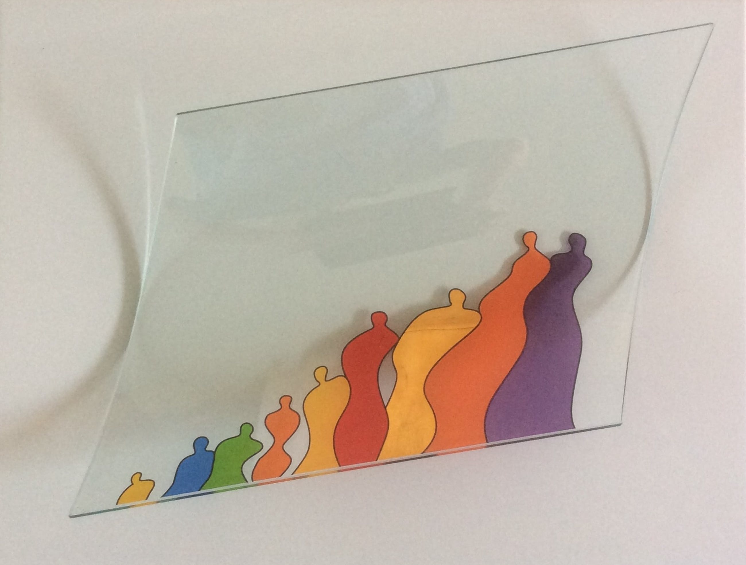 Een glazen schaal met de bekende kleurige Corry Ammerlaan mensfiguren in de vorm van een krom gevormd parallellogram. De schaal is puntgaaf.