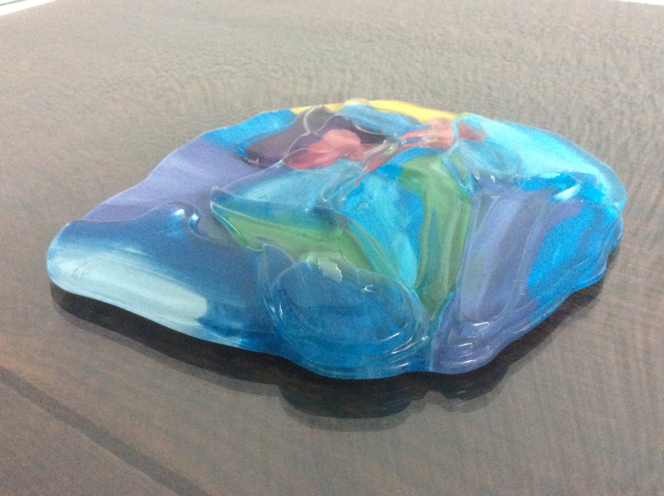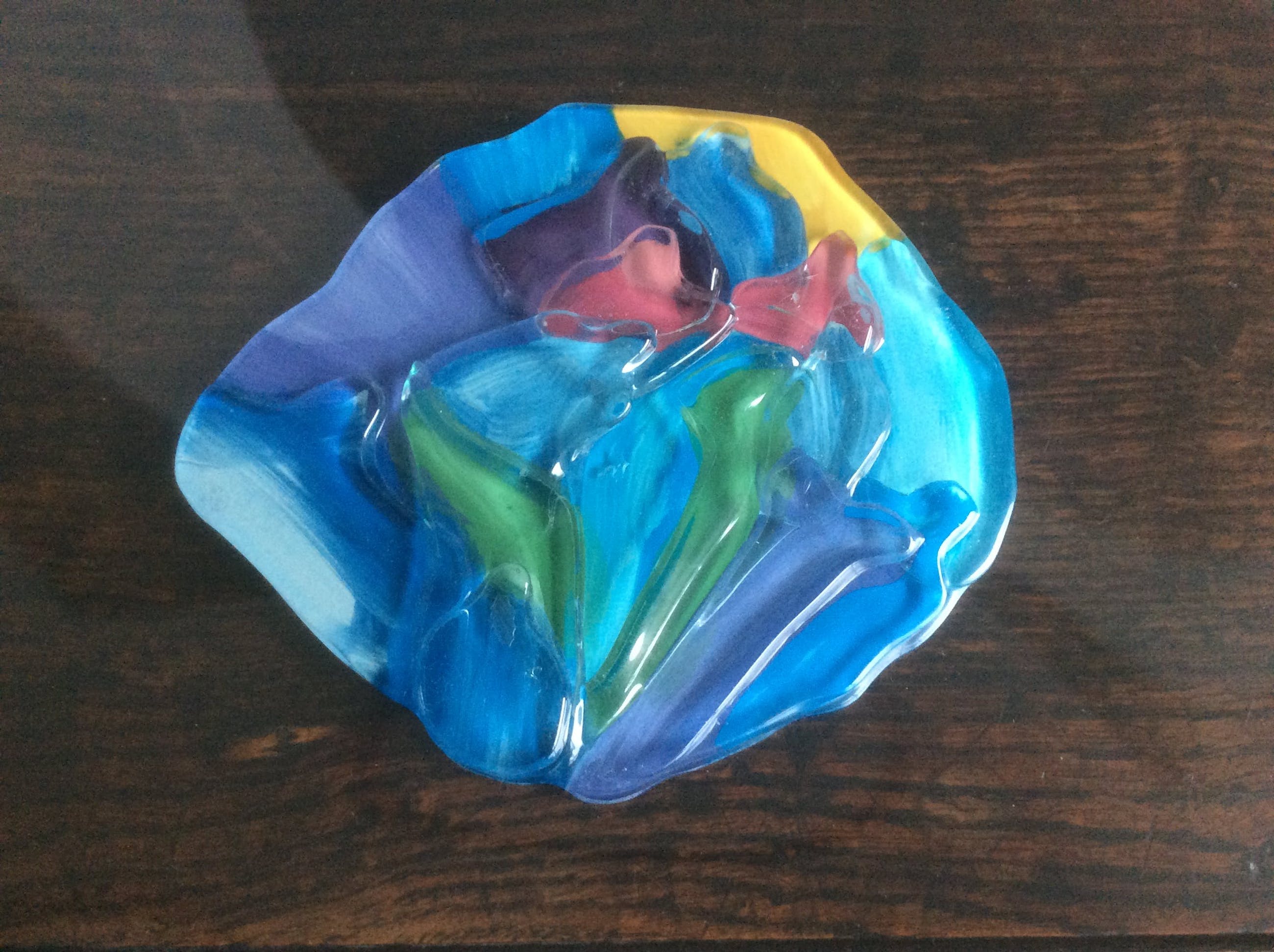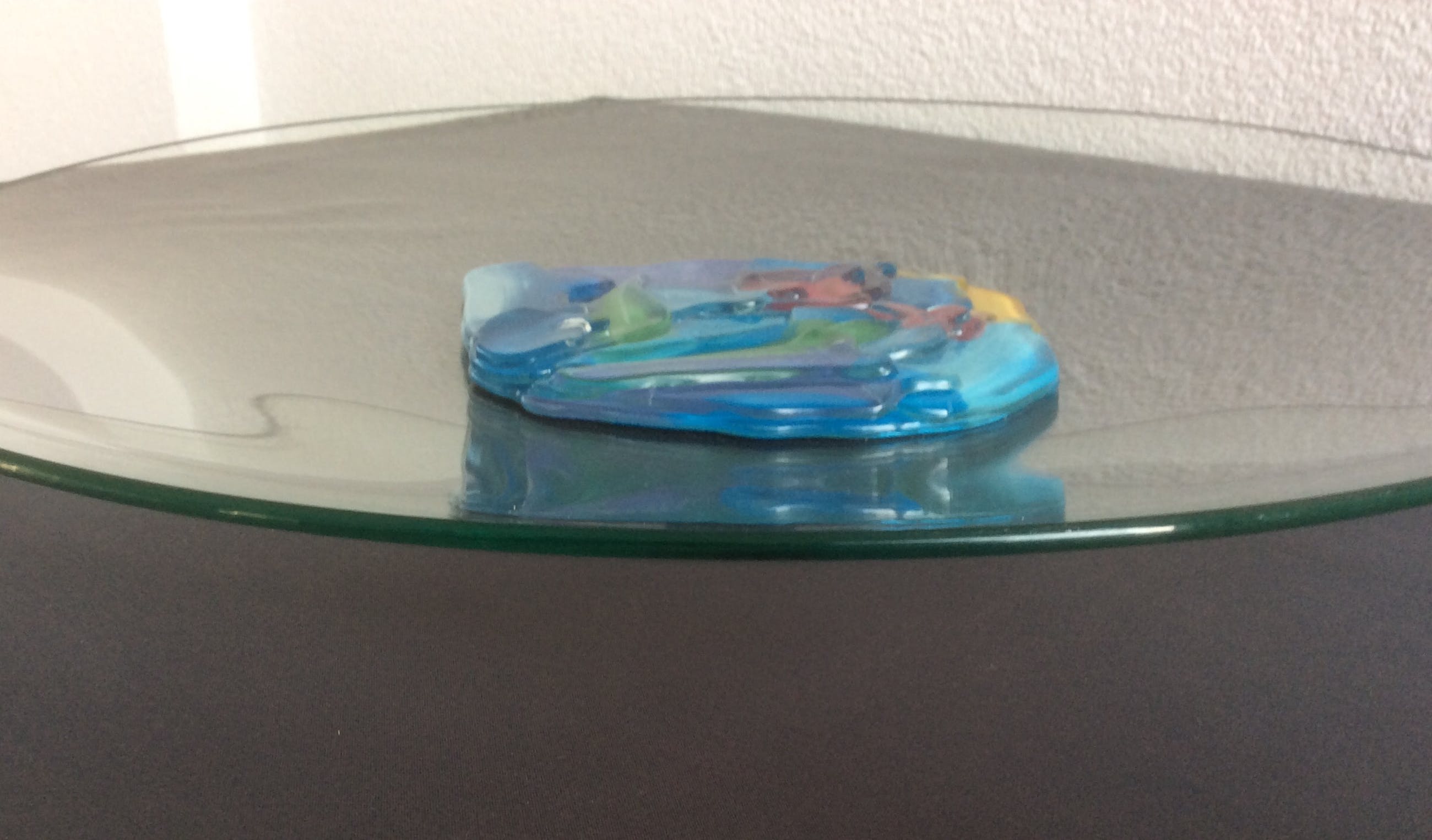 De schaal is ongeveer 15 jaar geleden door Corry Ammerlaan gemaakt. De schaal is rond, lichtgebogen en van helder glas. In het centrum een opgelegde veelkleurige glasafbeelding. De afbeelding bevat de voor Corry Ammerlaan kenmerkende mensfiguren.