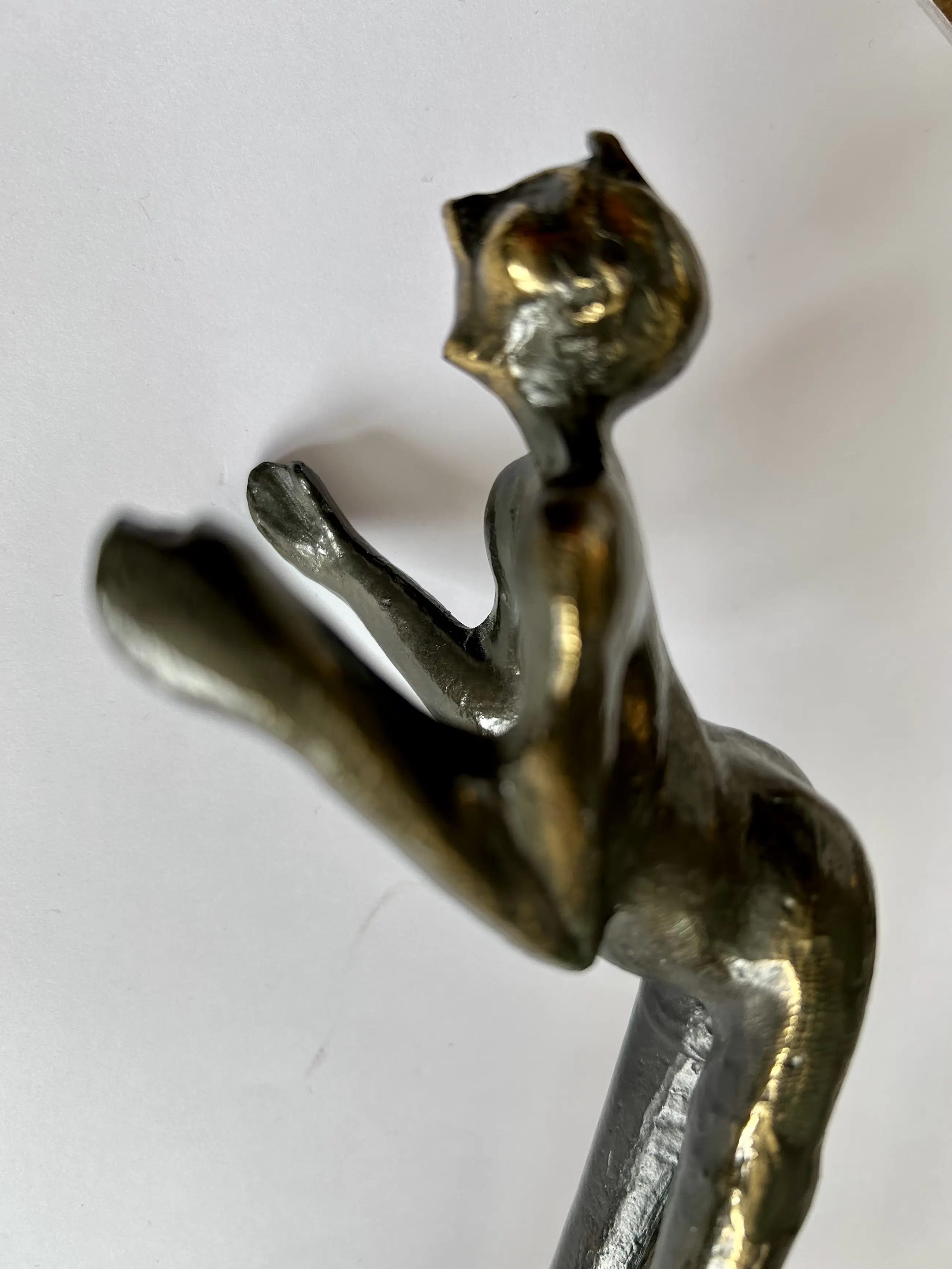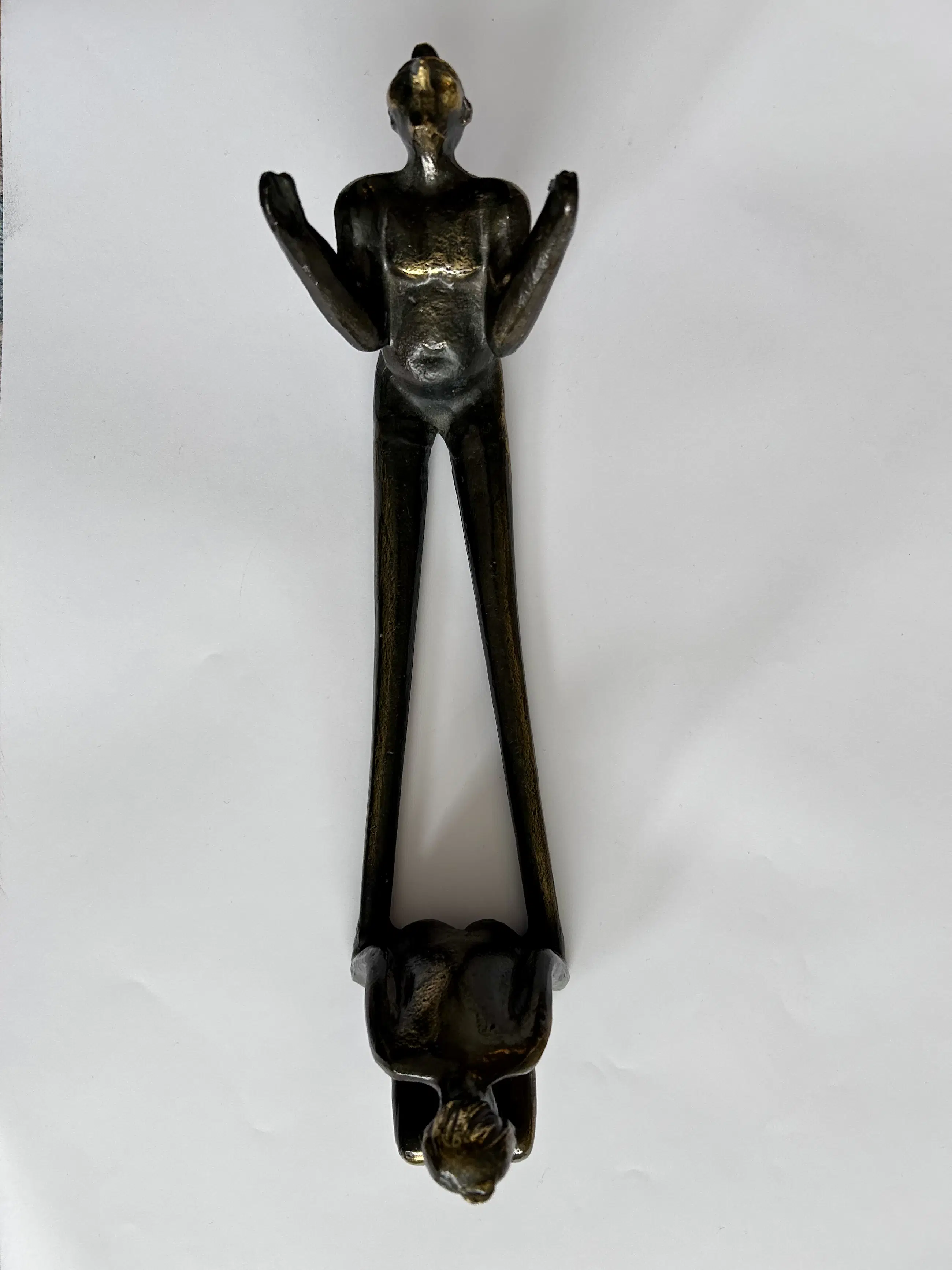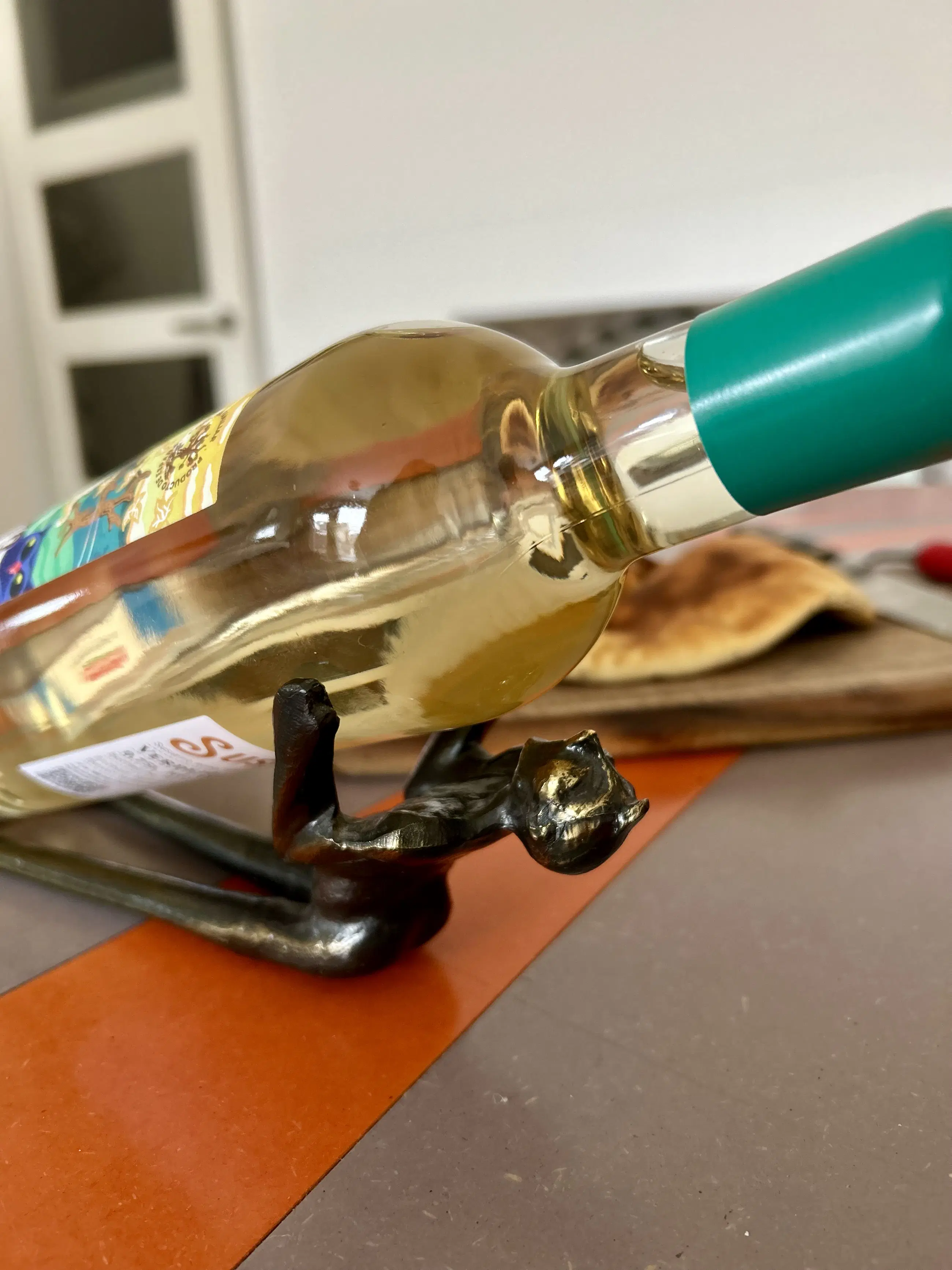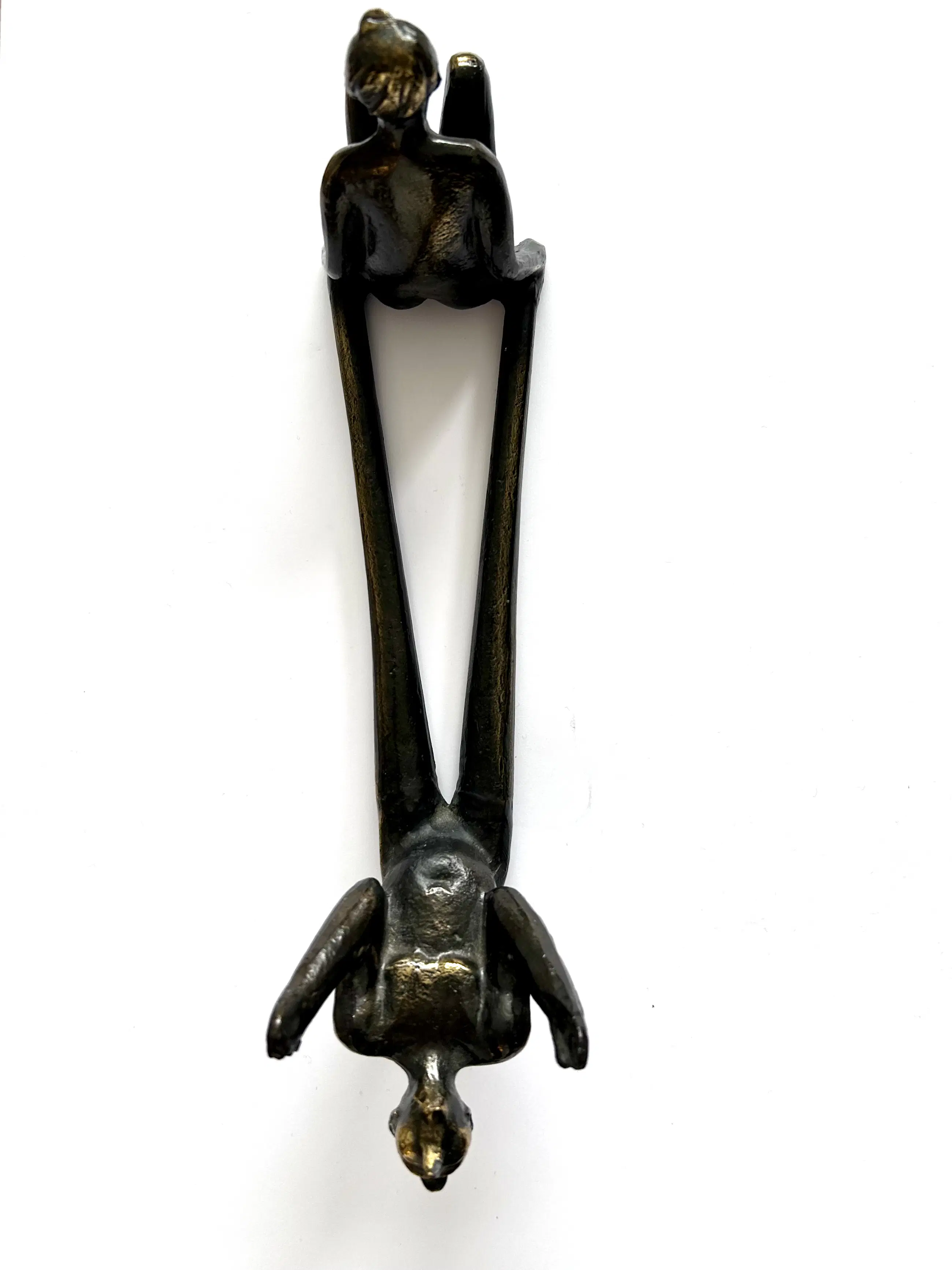 Een prachtig verbronsd metalen sculptuur 'Houvast', ontworpen door Corry Ammerlaan-van Niekerk en vervaardigd door Artihove in de jaren 1980. Dit unieke object dient als een stijlvolle wijnflessenhouder en is tevens een decoratief kunstwerk. De afmetingen zijn H 8,5 cm × B 7 cm × D 28 cm. Verkeert in goede staat. Een echte blikvanger voor elke wijnliefhebber en kunstkenner.