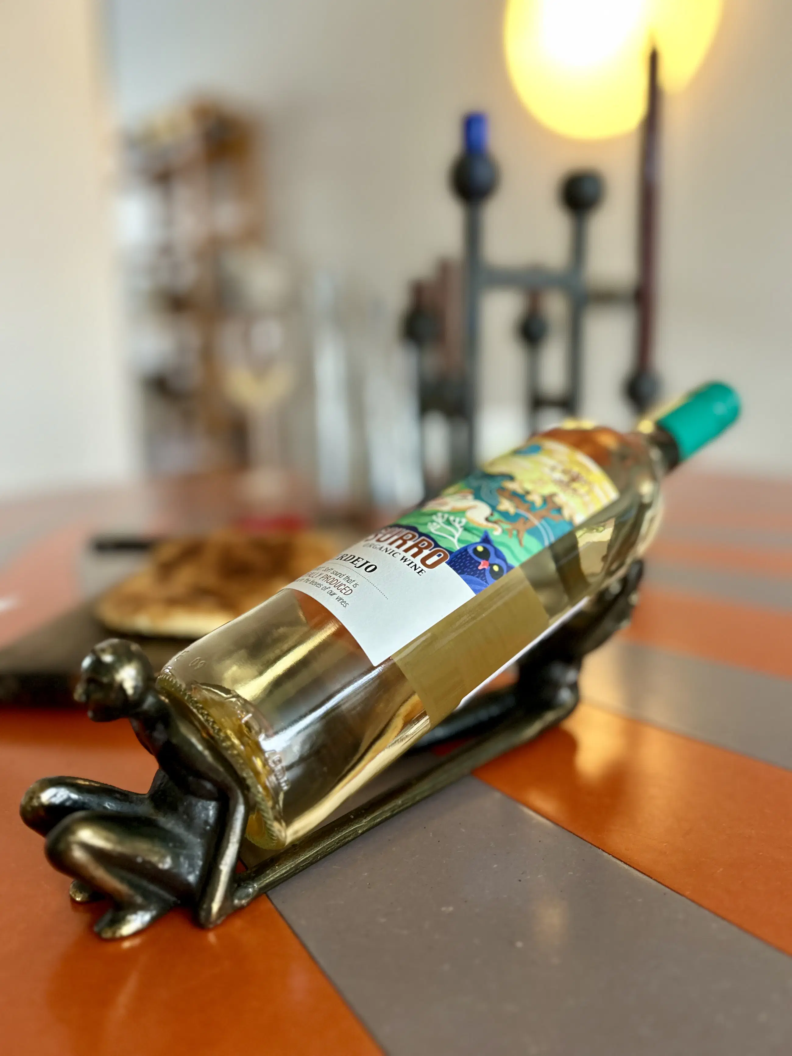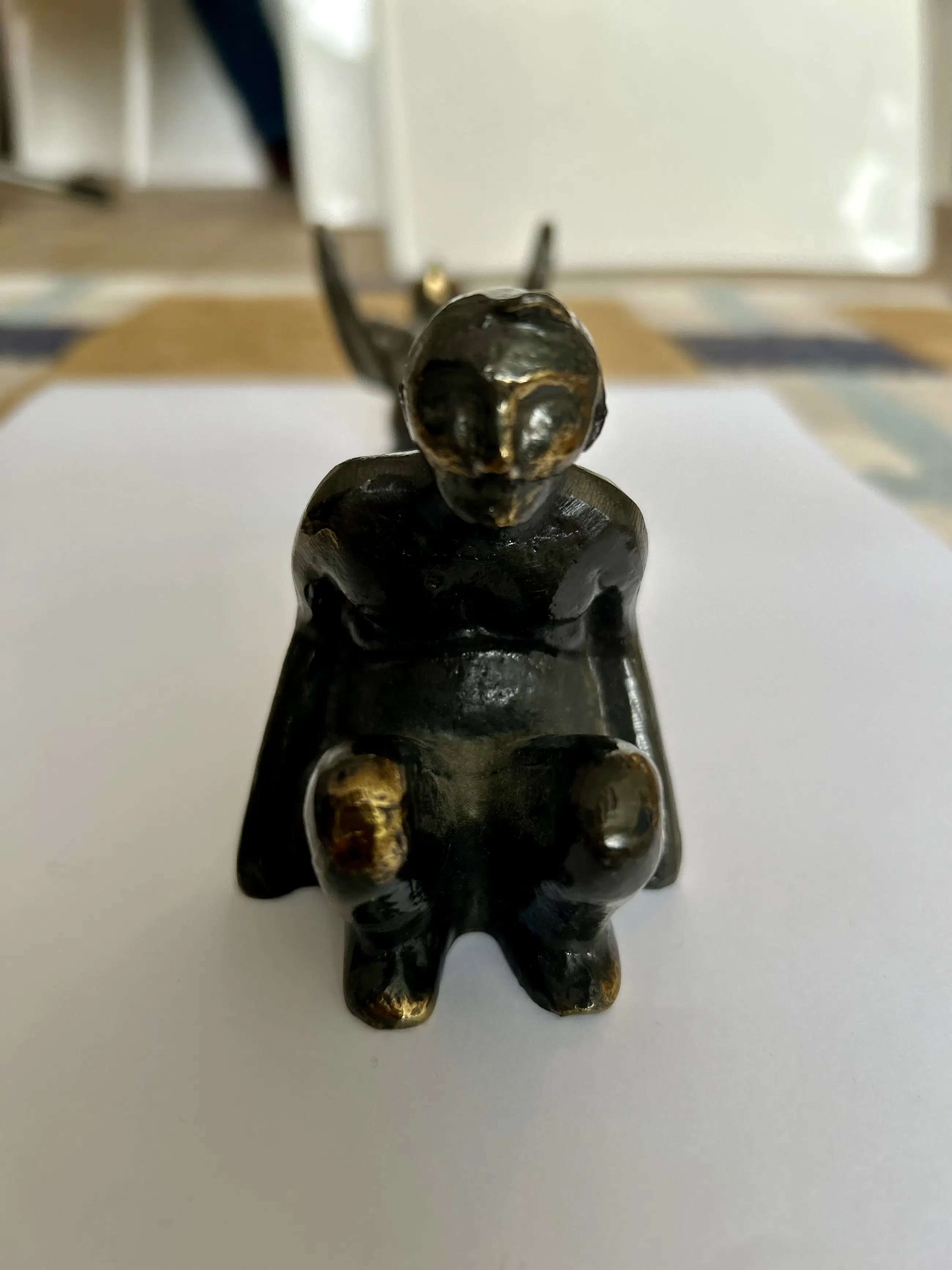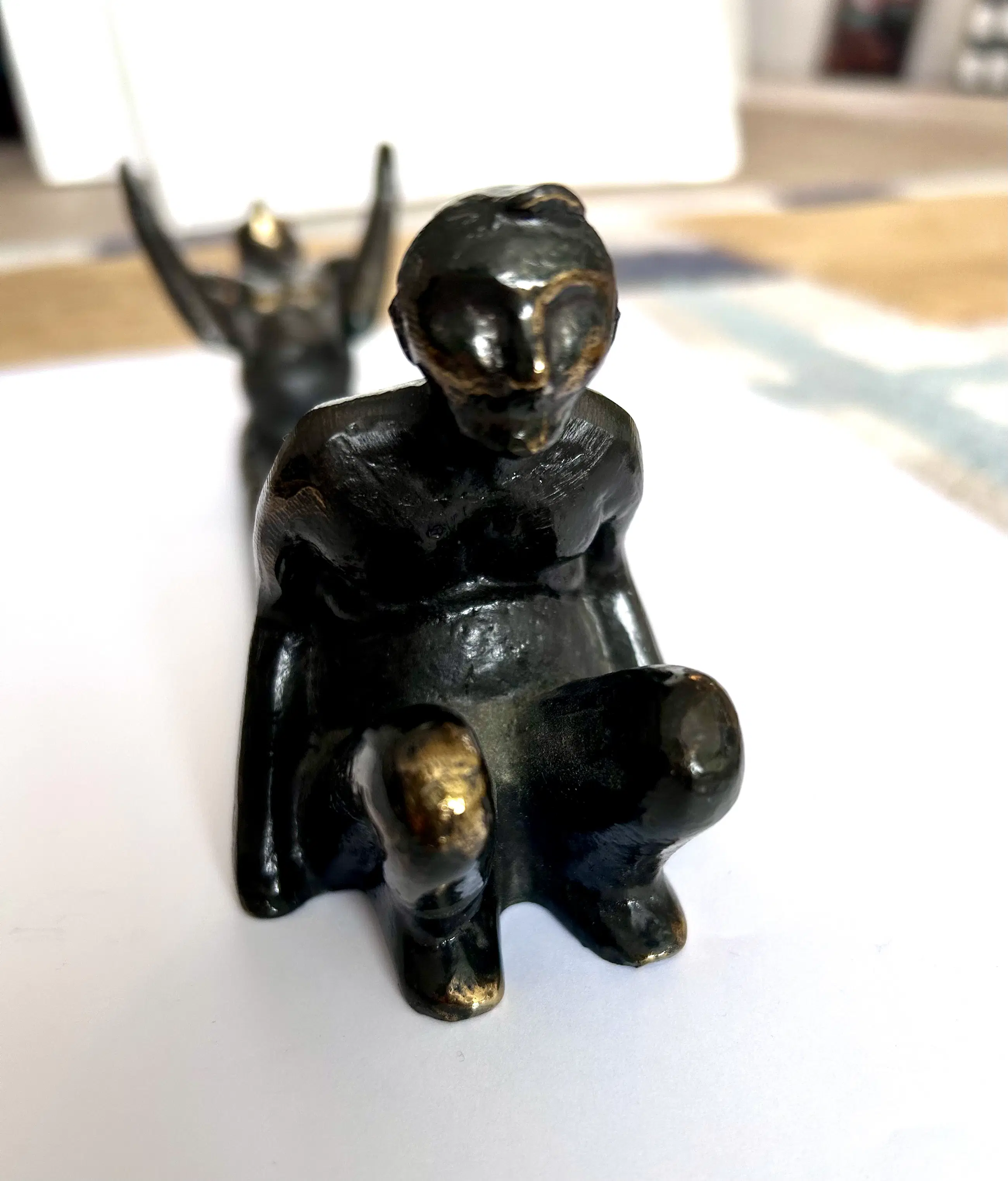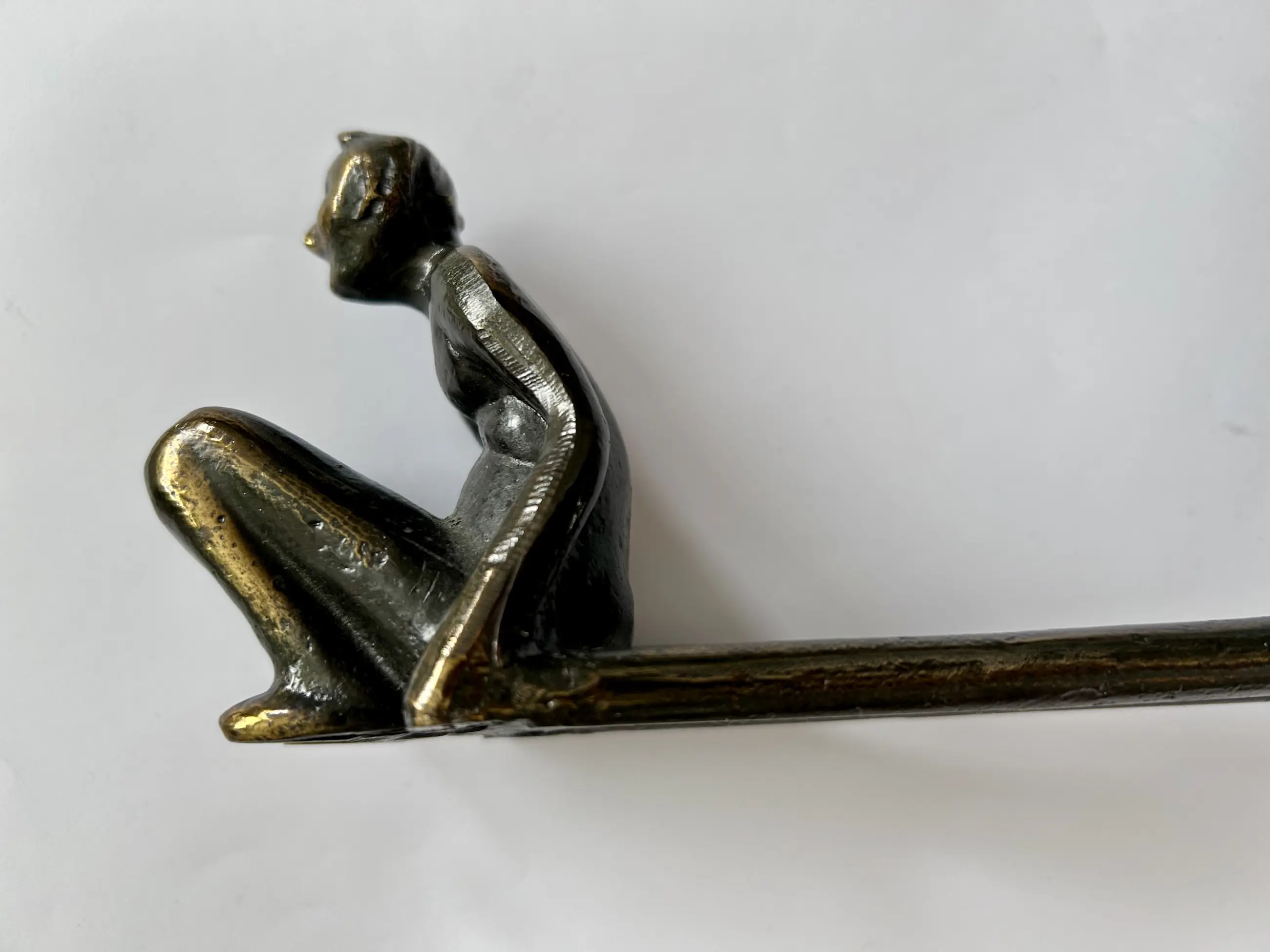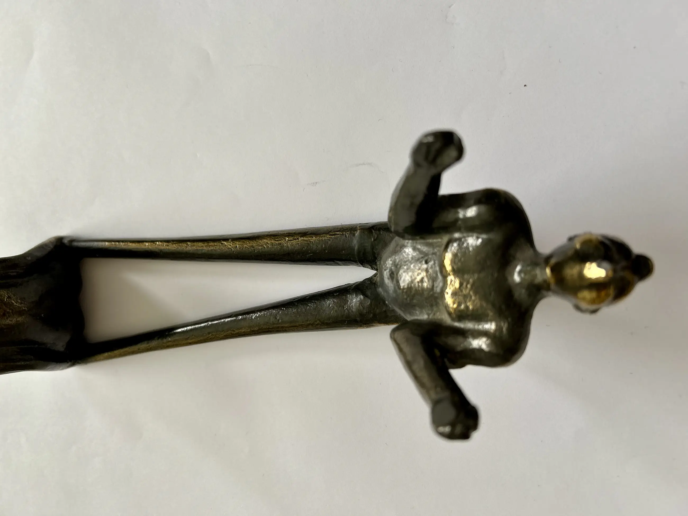 Een prachtig verbronsd metalen sculptuur 'Houvast', ontworpen door Corry Ammerlaan-van Niekerk en vervaardigd door Artihove in de jaren 1980. Dit unieke object dient als een stijlvolle wijnflessenhouder en is tevens een decoratief kunstwerk. De afmetingen zijn H 8,5 cm × B 7 cm × D 28 cm. Verkeert in goede staat. Een echte blikvanger voor elke wijnliefhebber en kunstkenner.