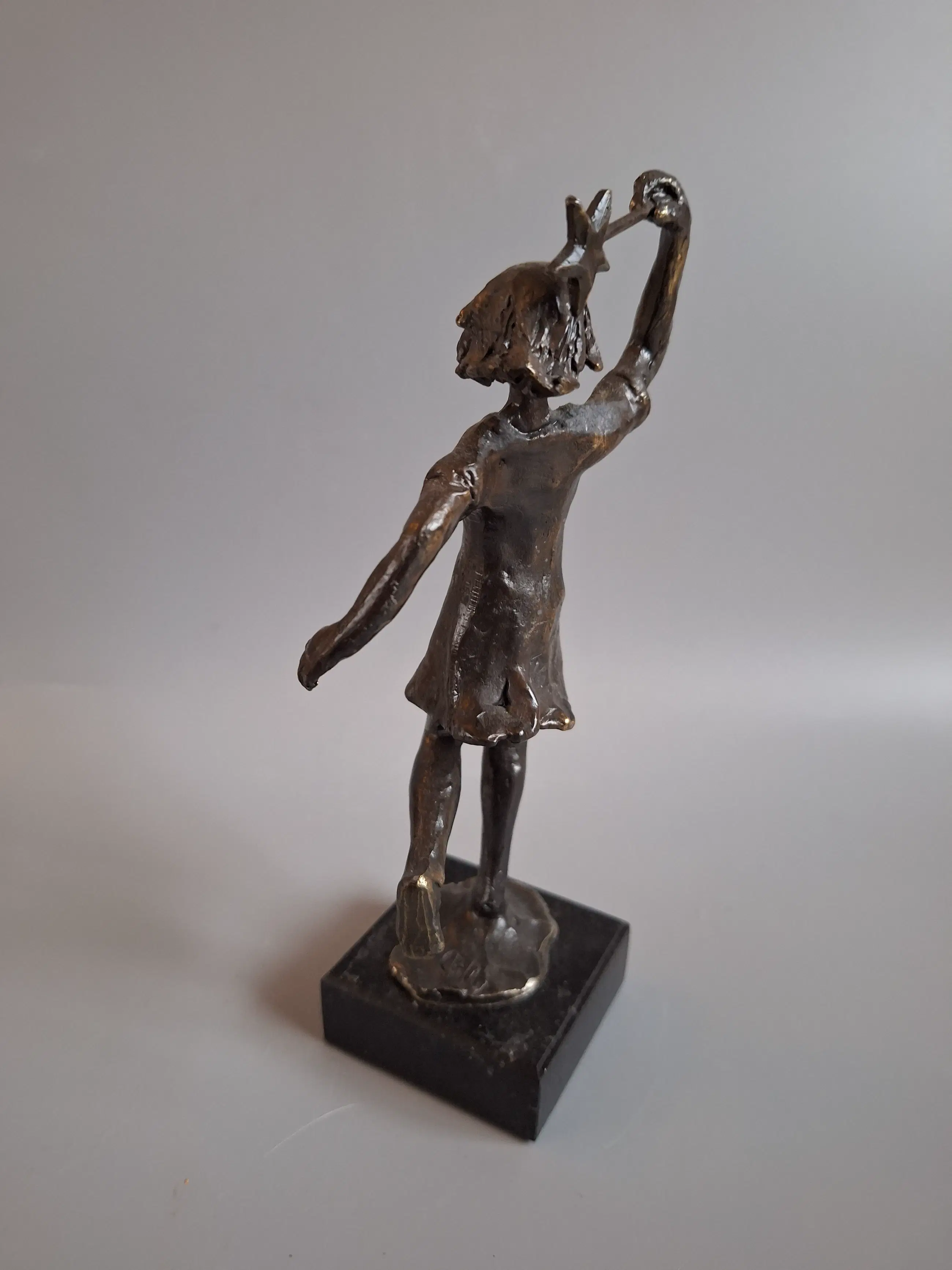 Prachtig sculptuur kunstenares Corry Ammerlaan op granieten sokkel. Titel kunstwerk; " Meisje met toverstaf" In goede staat.