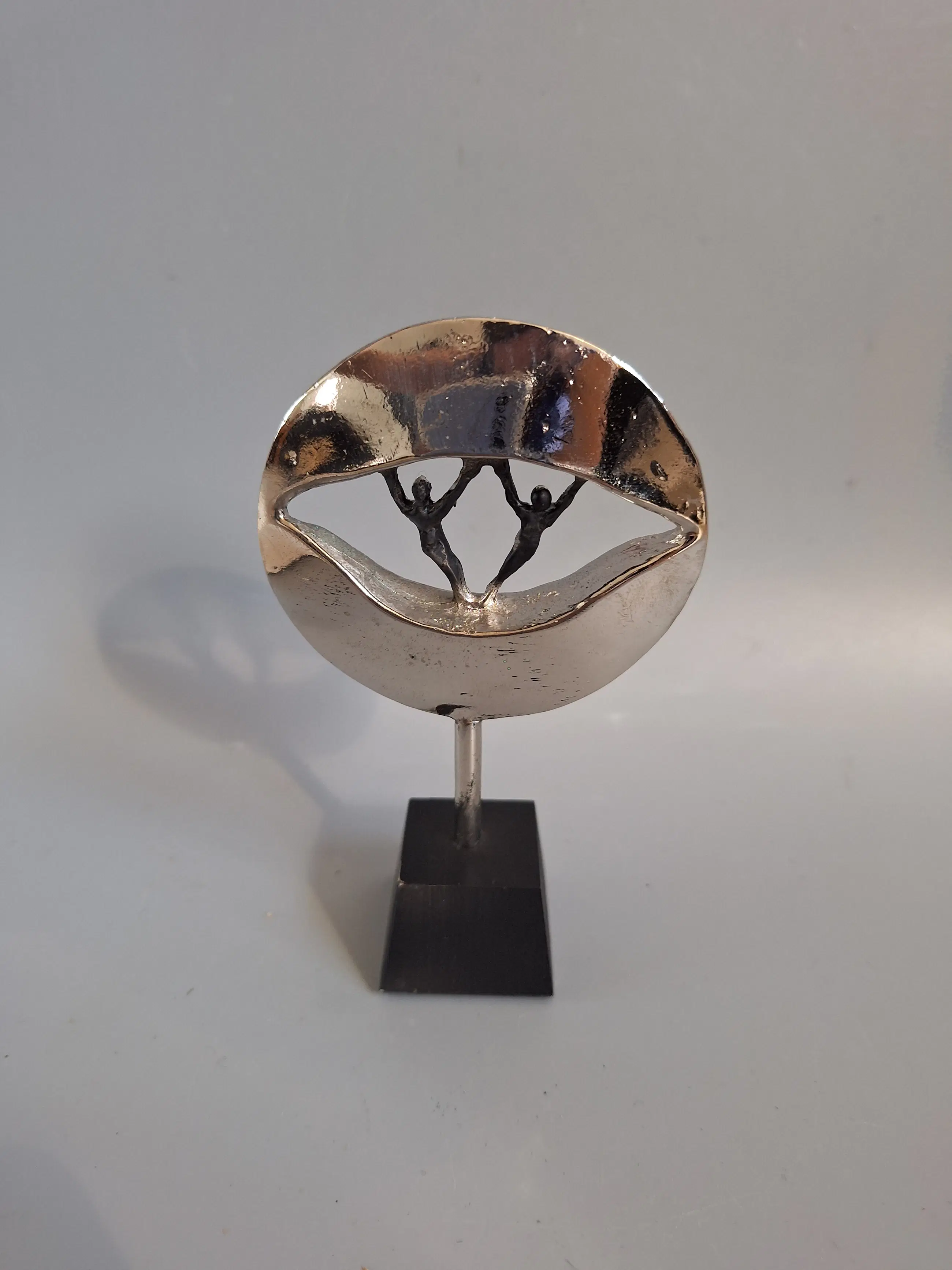 Prachtig sculptuur van kunstenares Corry Ammerlaan. Titel kunstwerk; " oog voor elkaar" Verbronsd/verzilverd Met informatie kunstenares