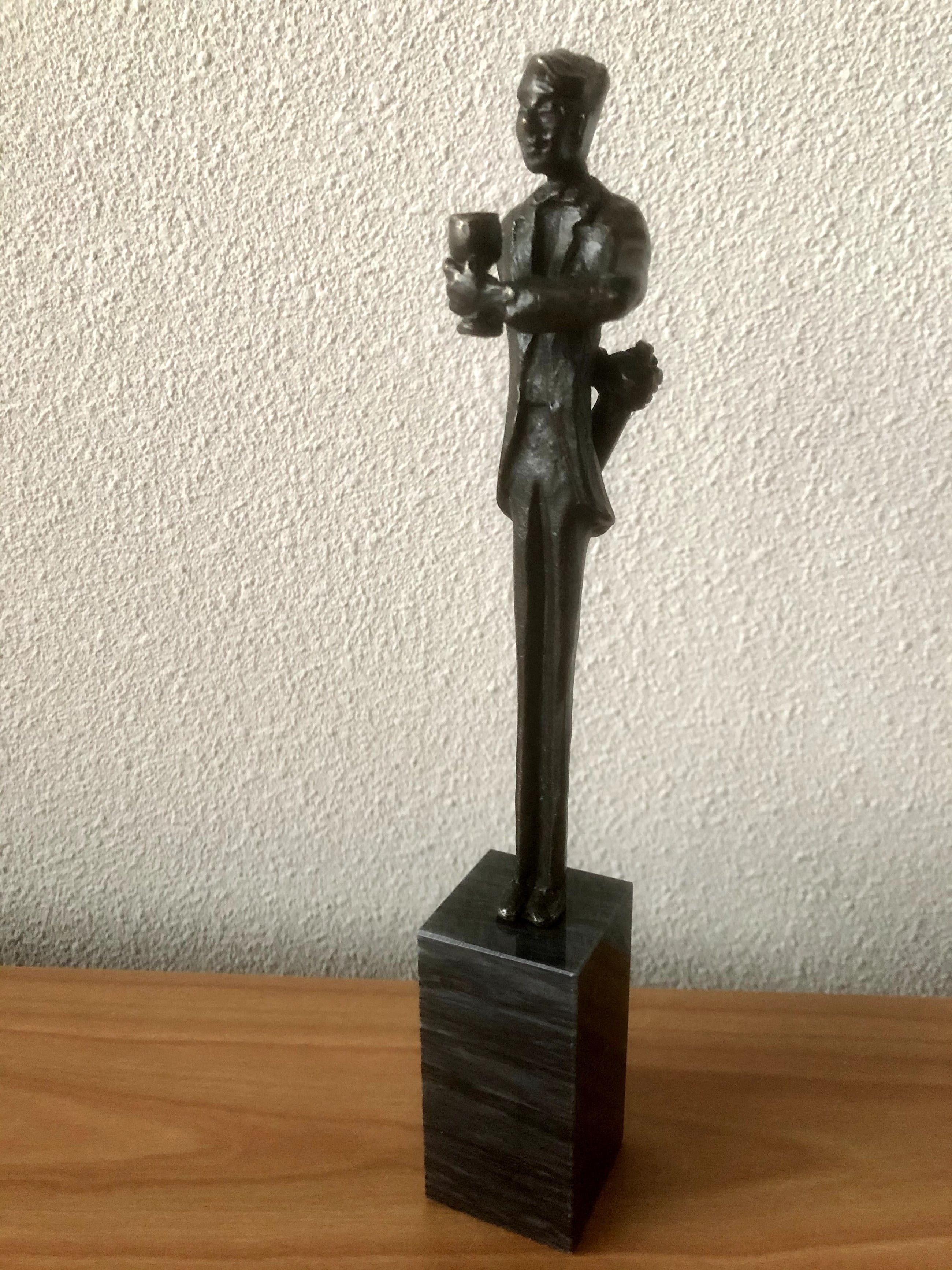 Betreft man met wijnglas in zijn hand en de fles verstopt op zijn rug.