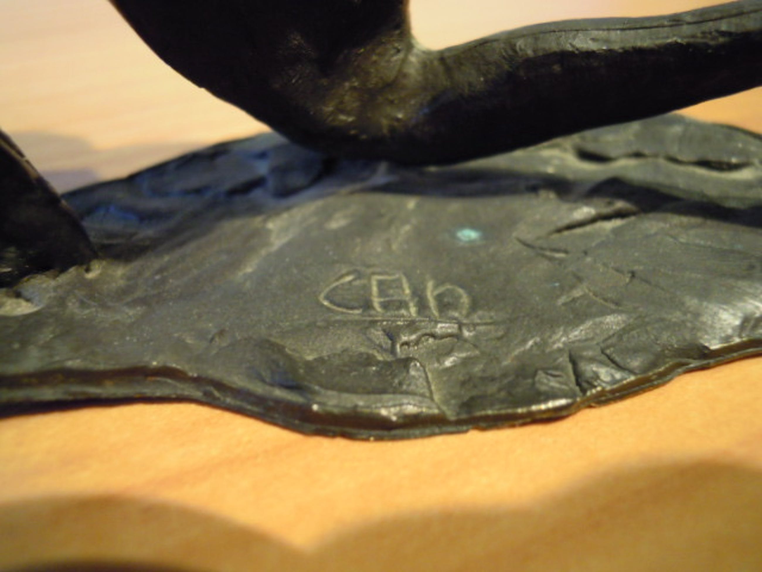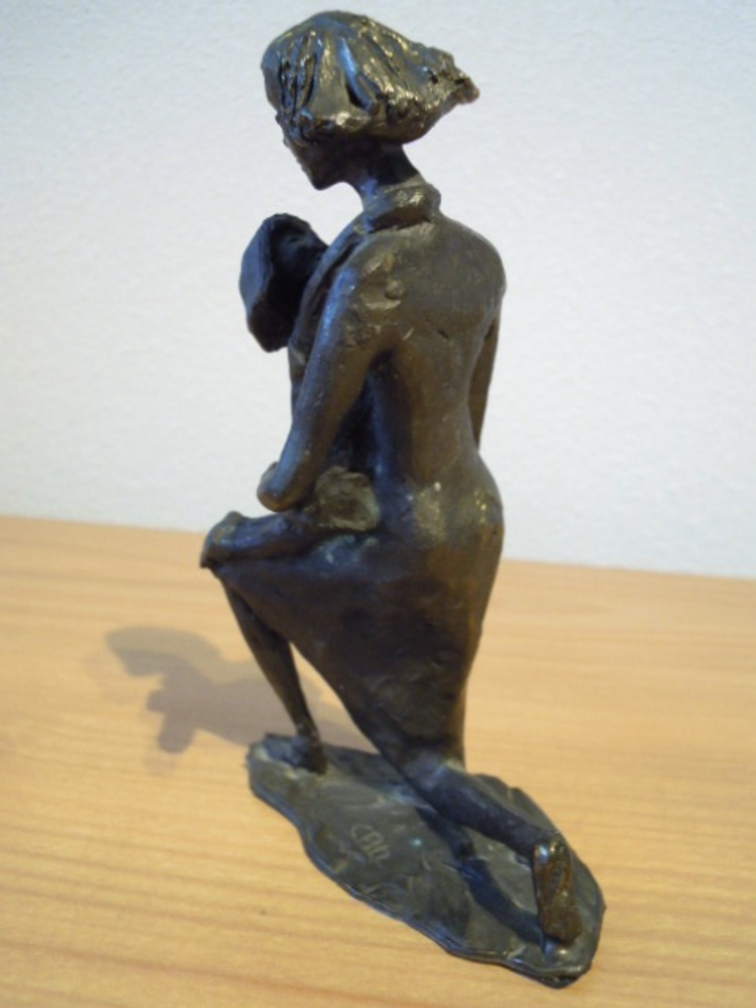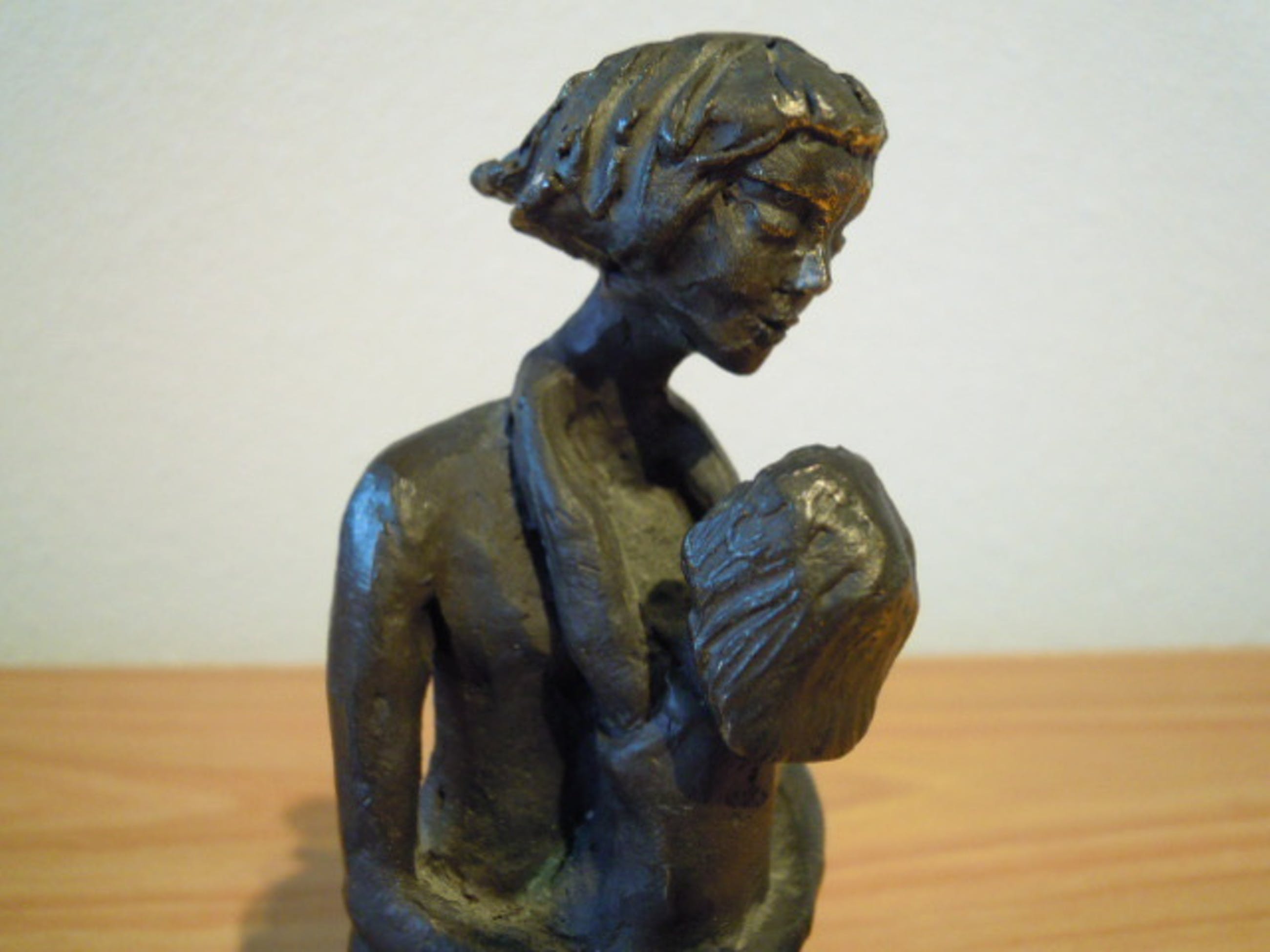Het betreft een mooi weergegeven beeldje van een knielende moeder met haar kind. Het beeldje is op het voetje gesigneerd.