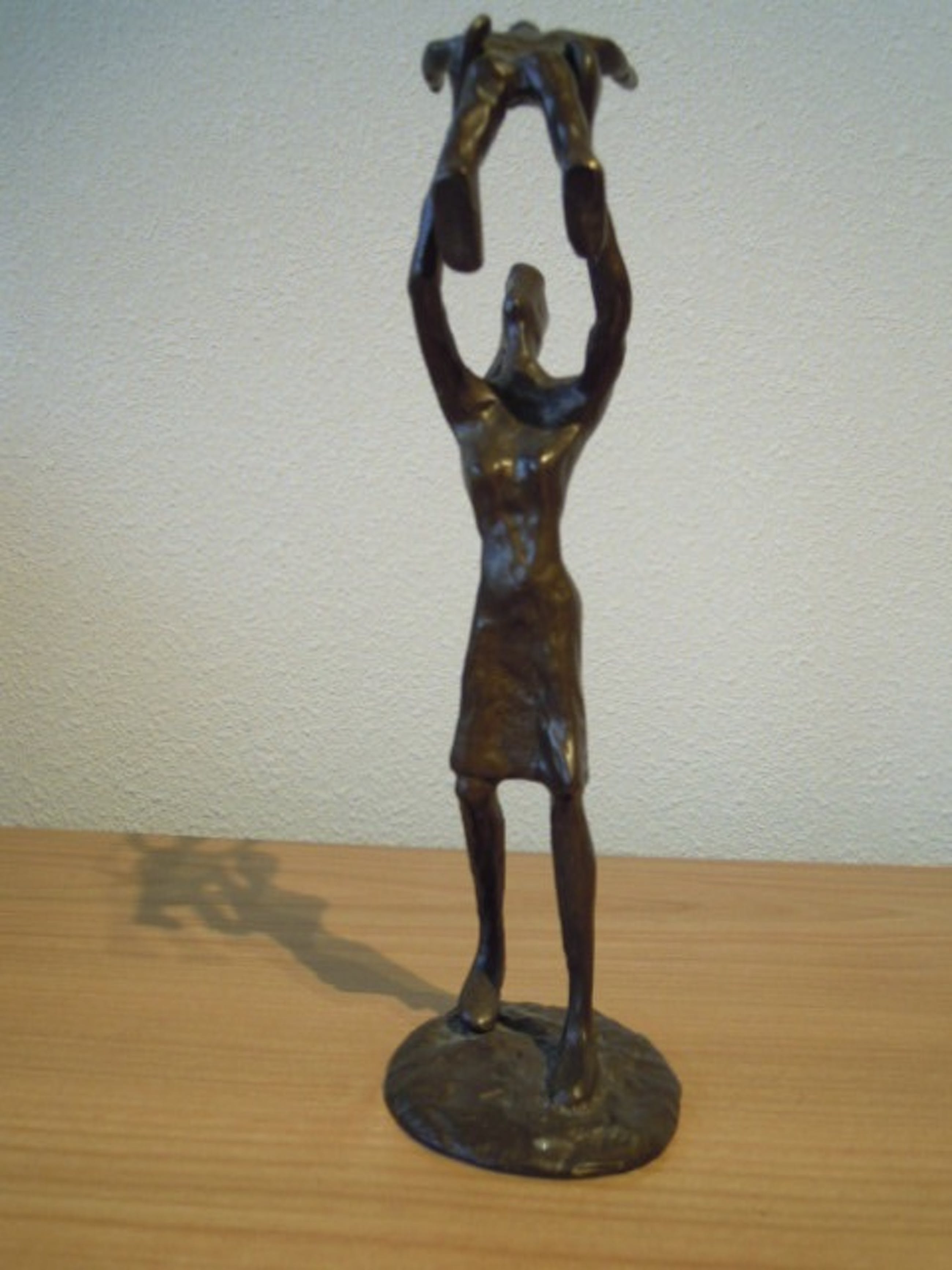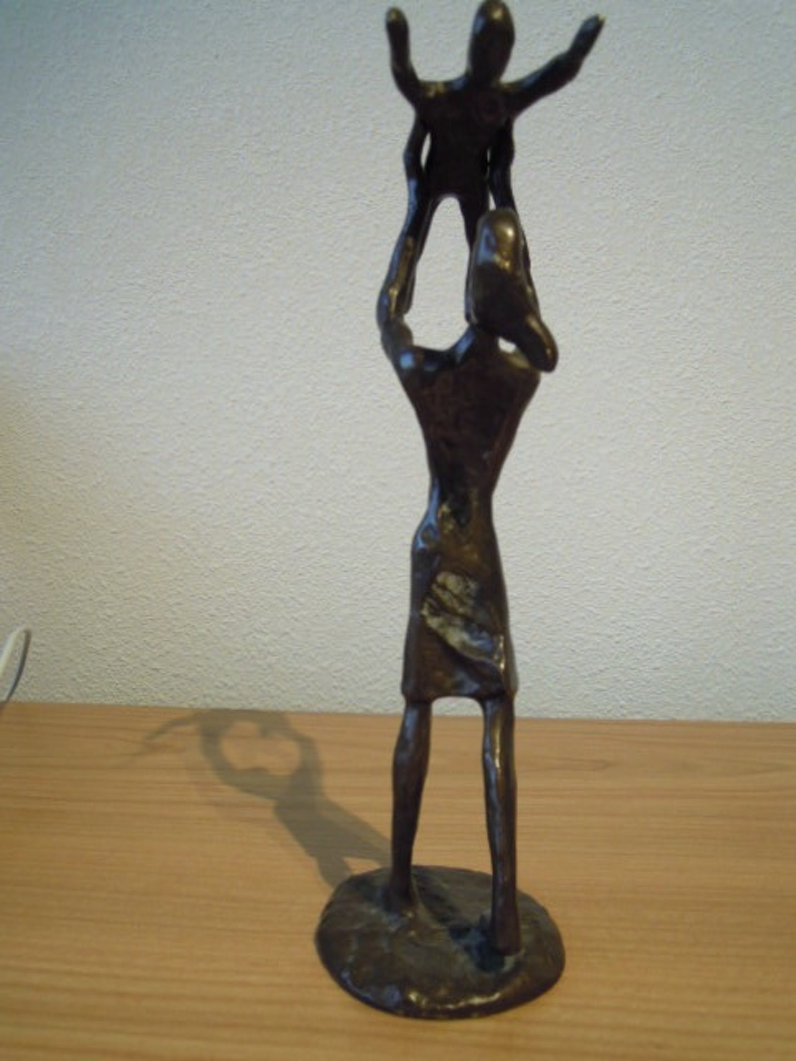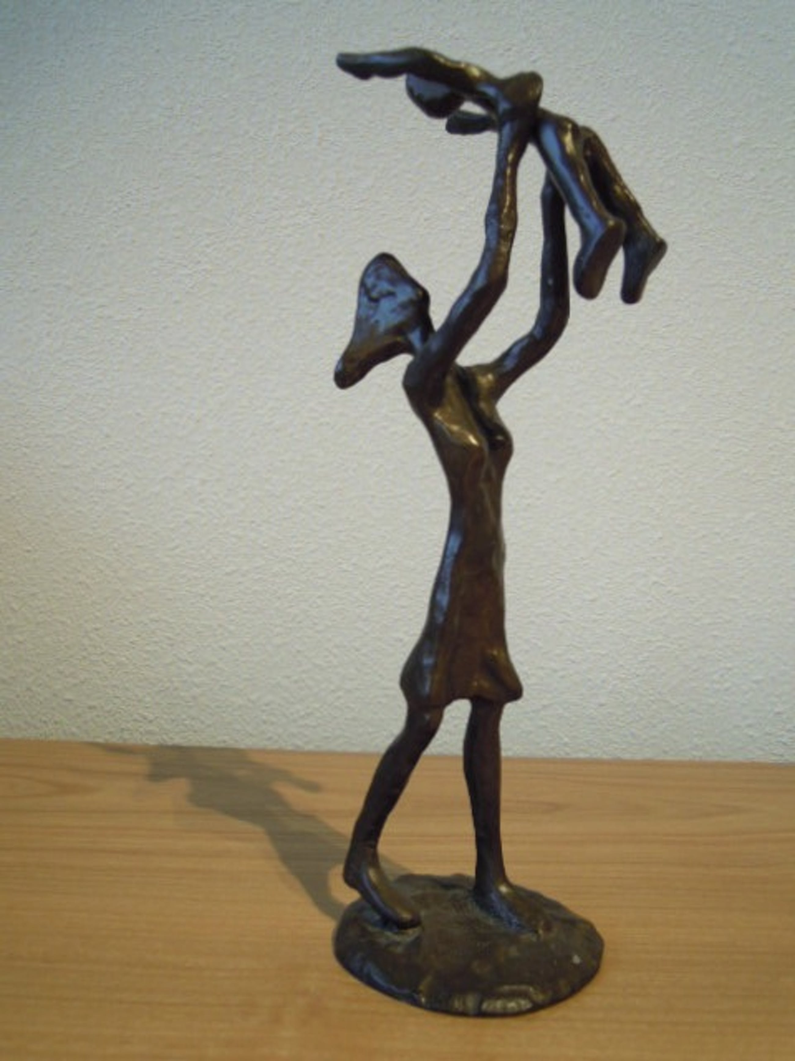 Het betreft een schitterend beeld van een moeder die een kind omhoog houd. Het beeld verkeert in prachtige staat en is gesigneerd op de voet.