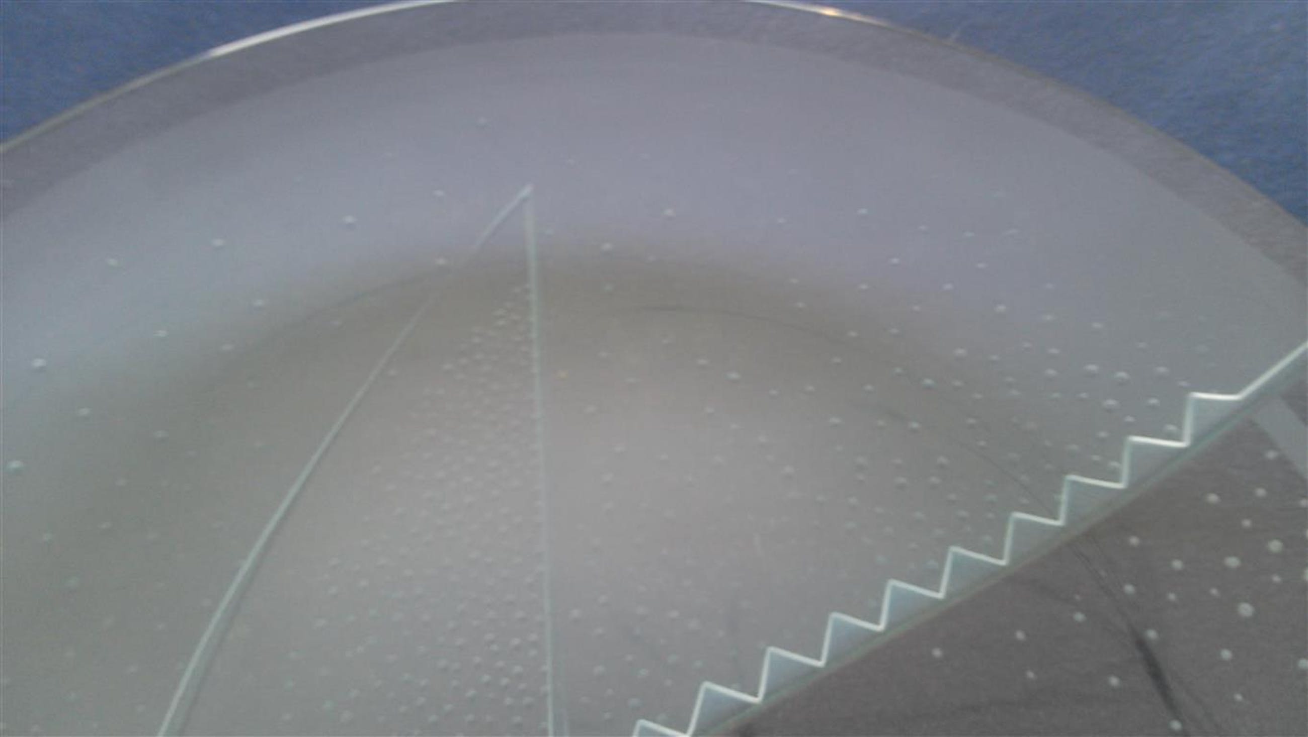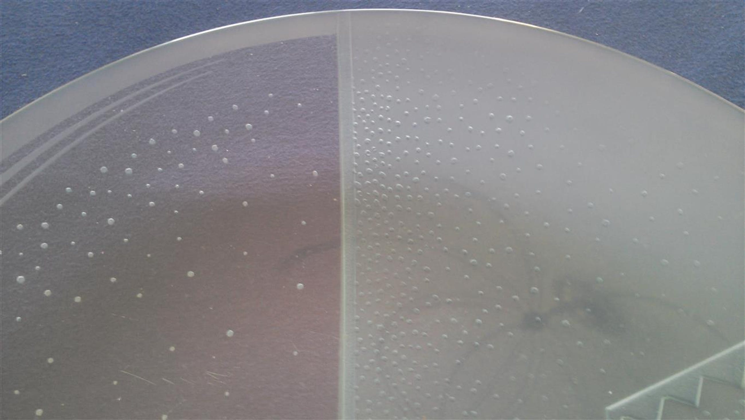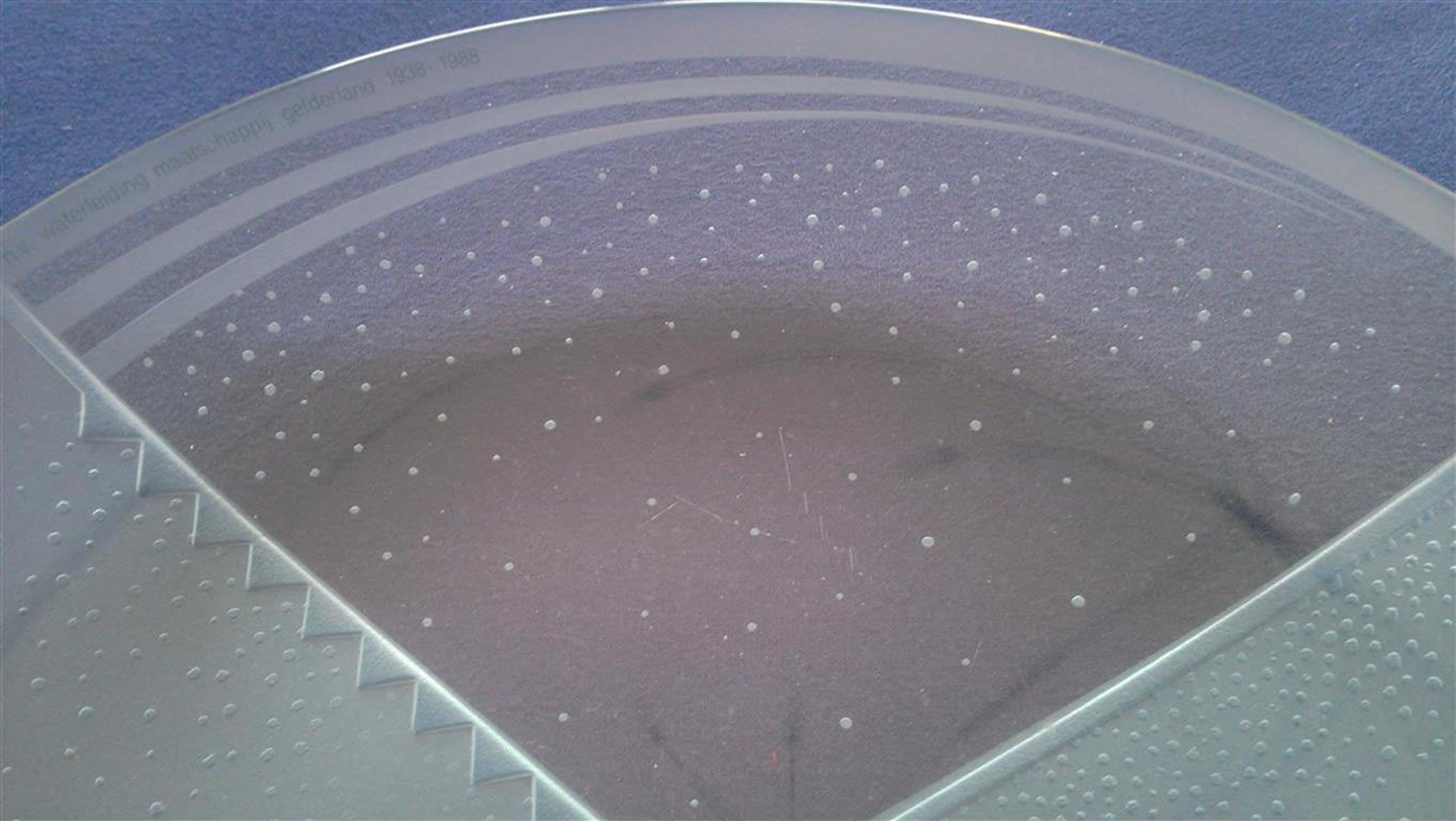 Niet de originele heldere schaal maar een geëtste gelegenheidsschaal naar aanleiding van het 50 jarige jubileum van de waterleiding maatschappij Gelderland 1938 - 1988 in dezelfde grootte en vorm