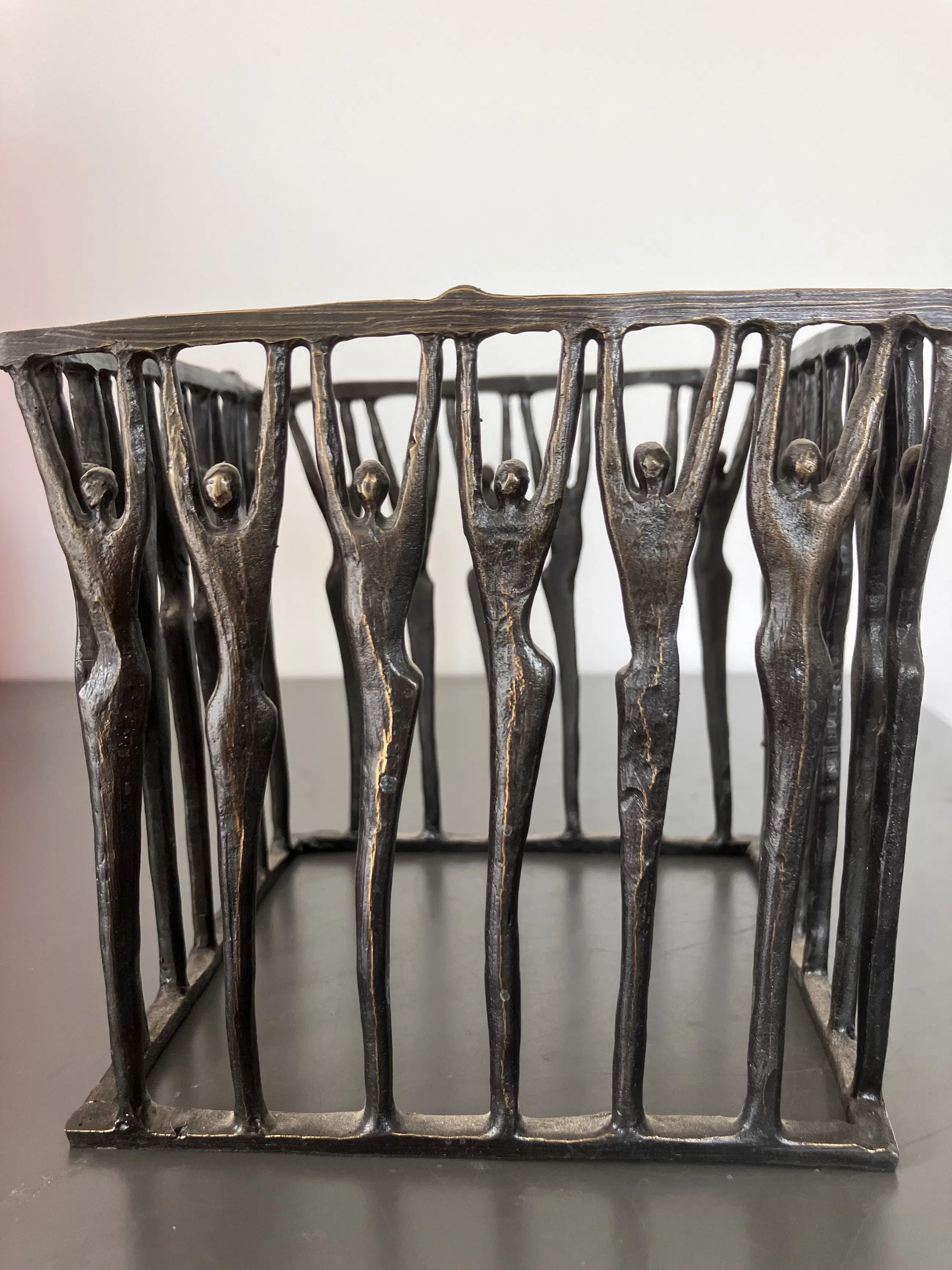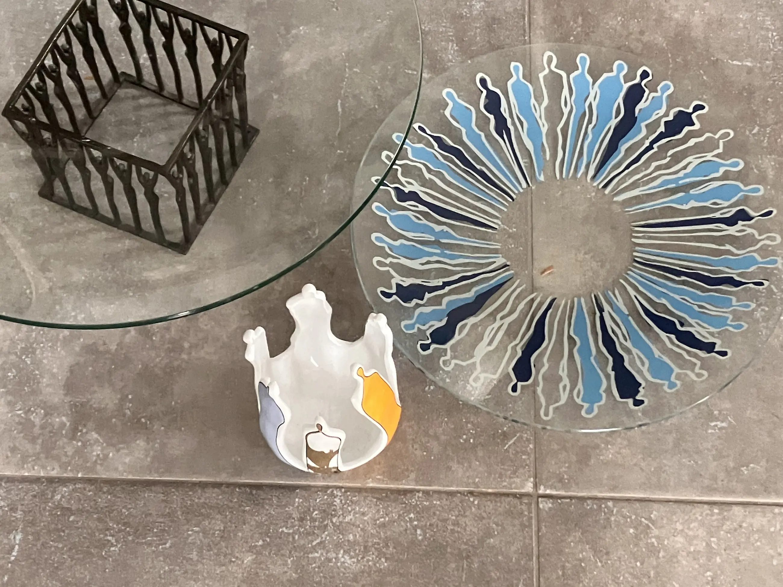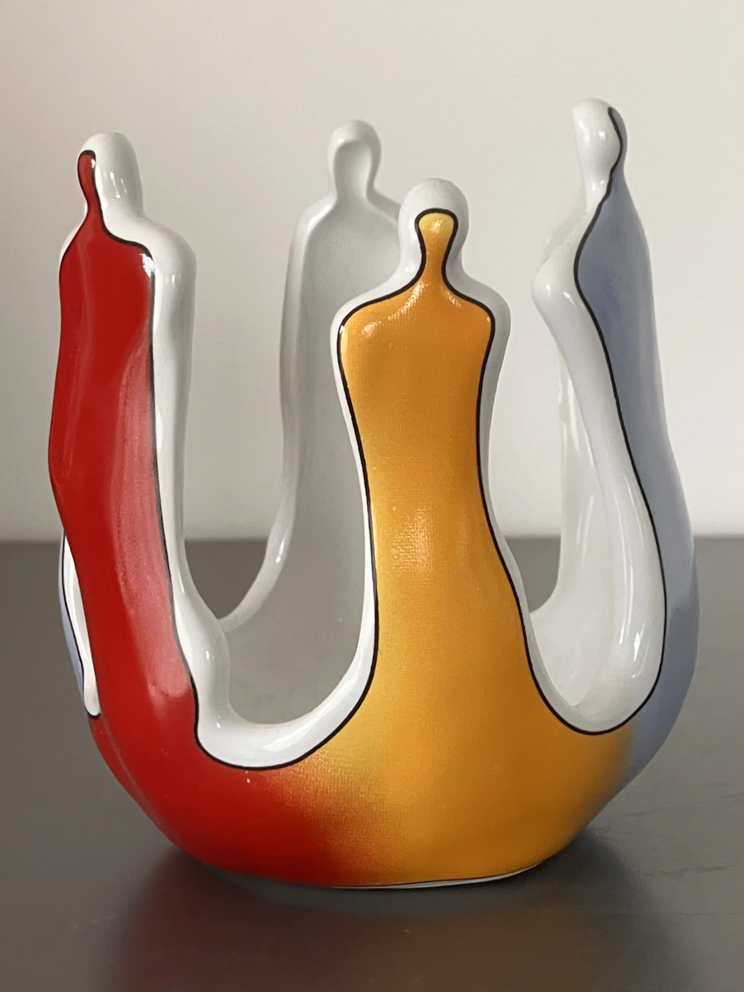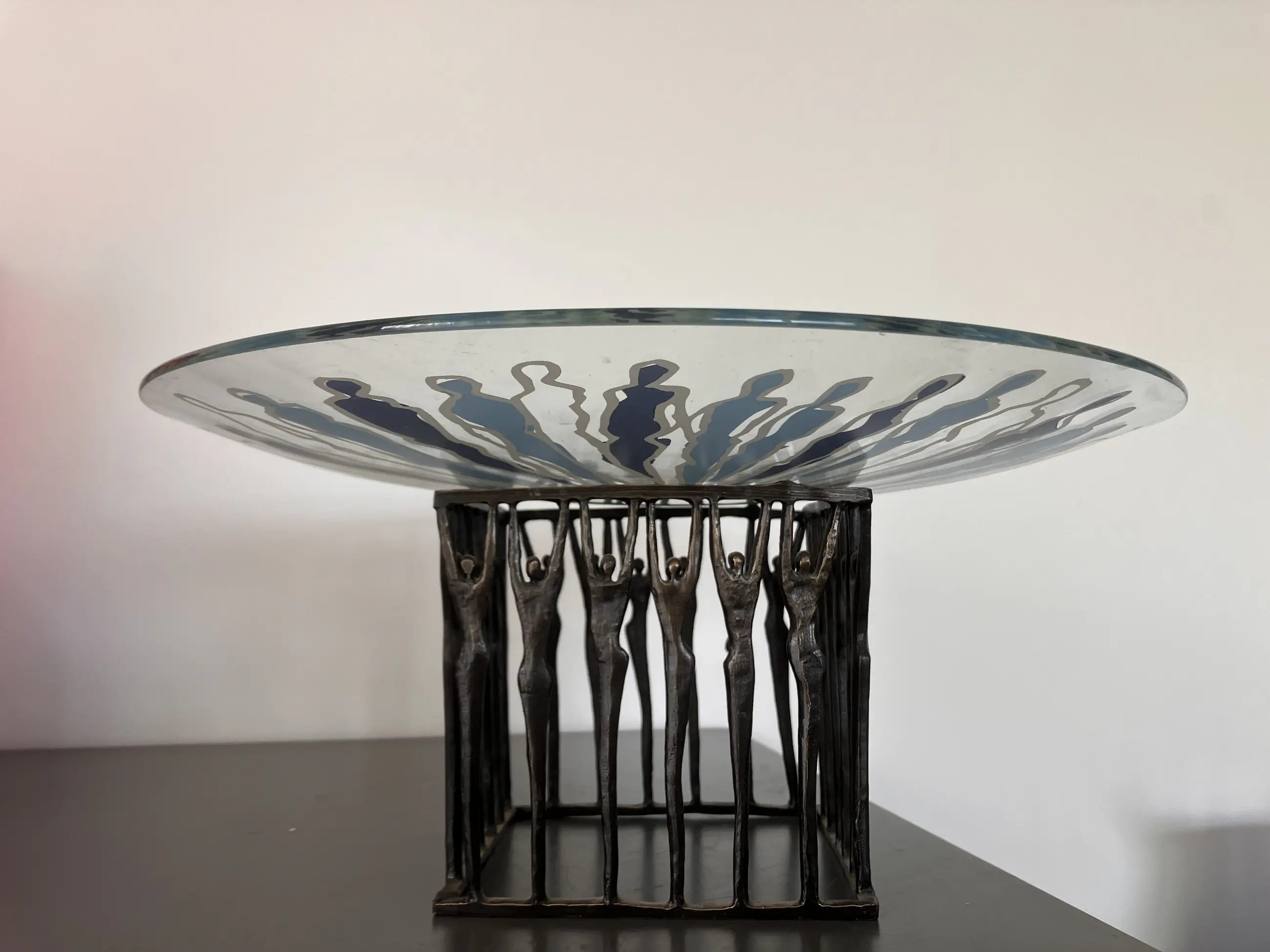 Grote heldere schaal wordt gedragen door personen opgesteld in een vierkant Daarnaast een kleinere schaal met personen En een porseleinen waxinelichtje alle in duidelijk herkenbare stijl van de kunstenaar