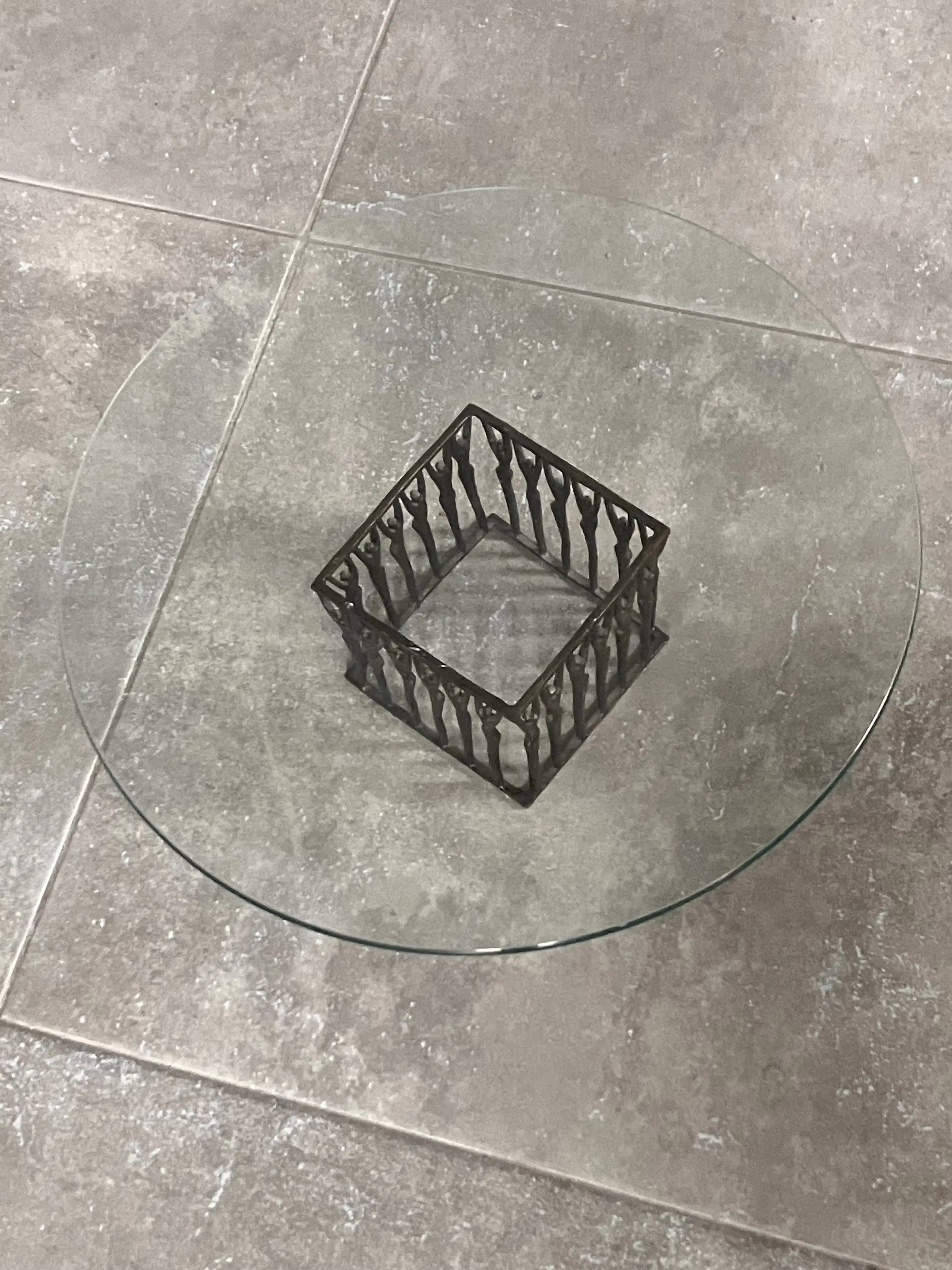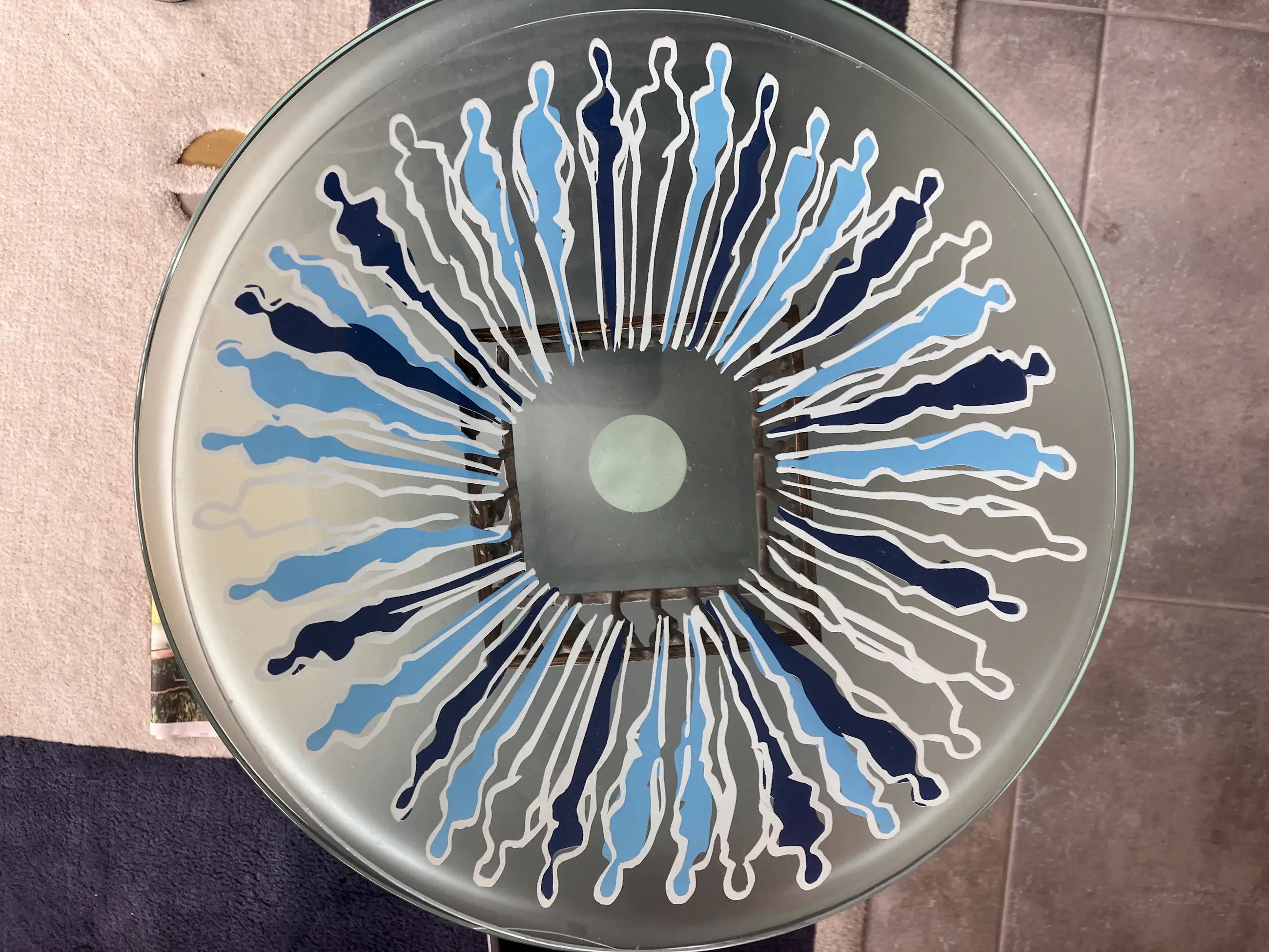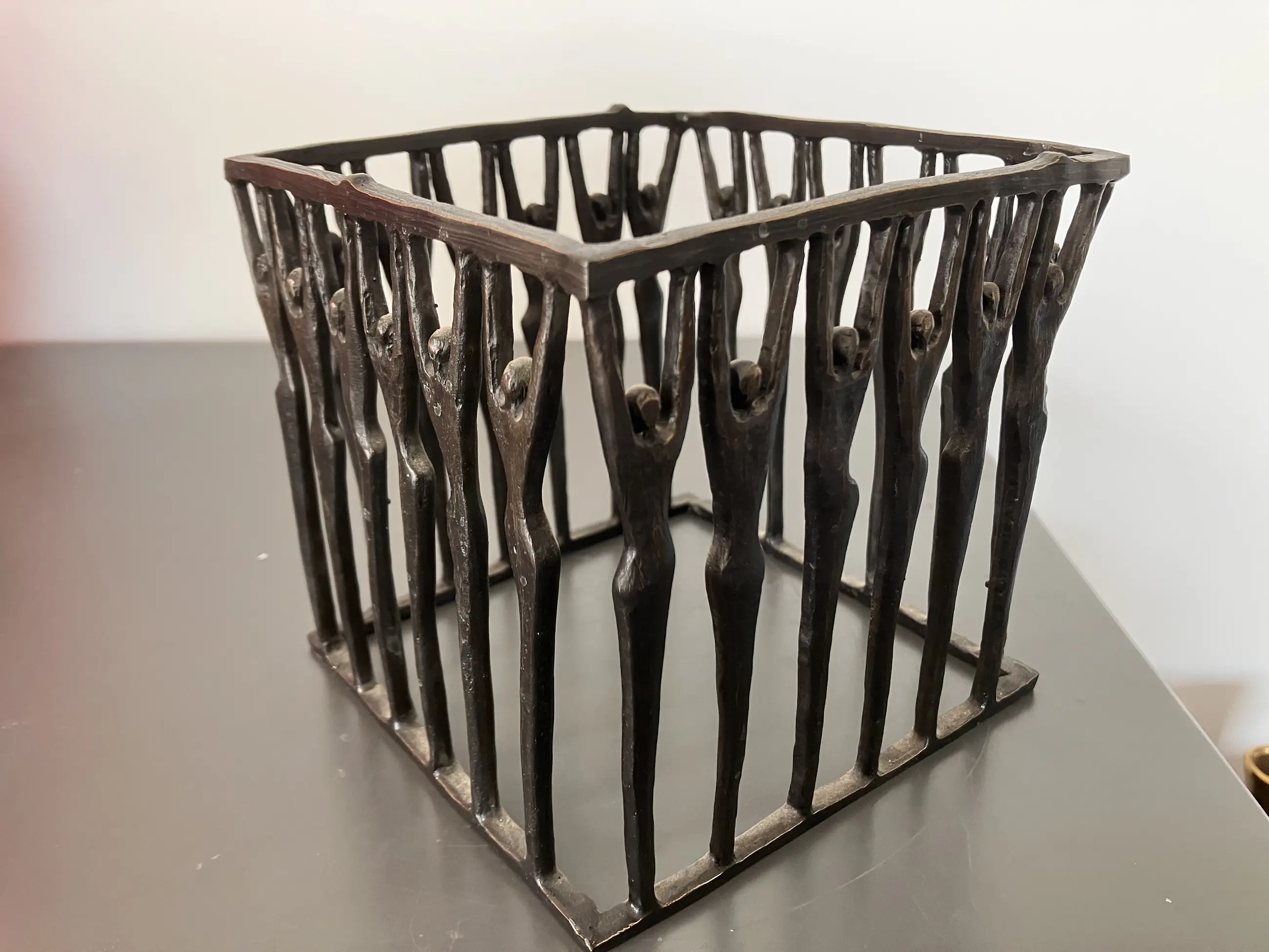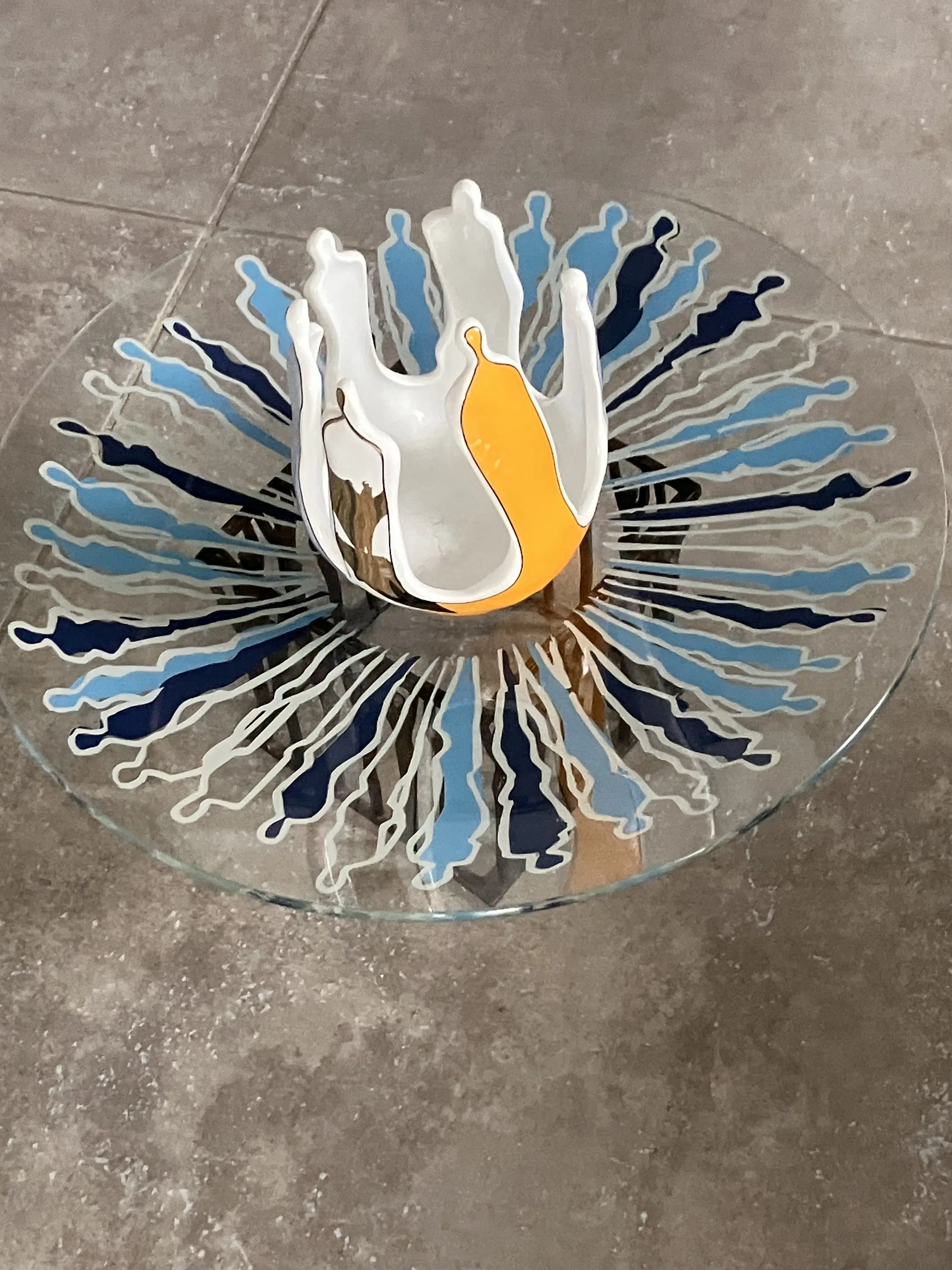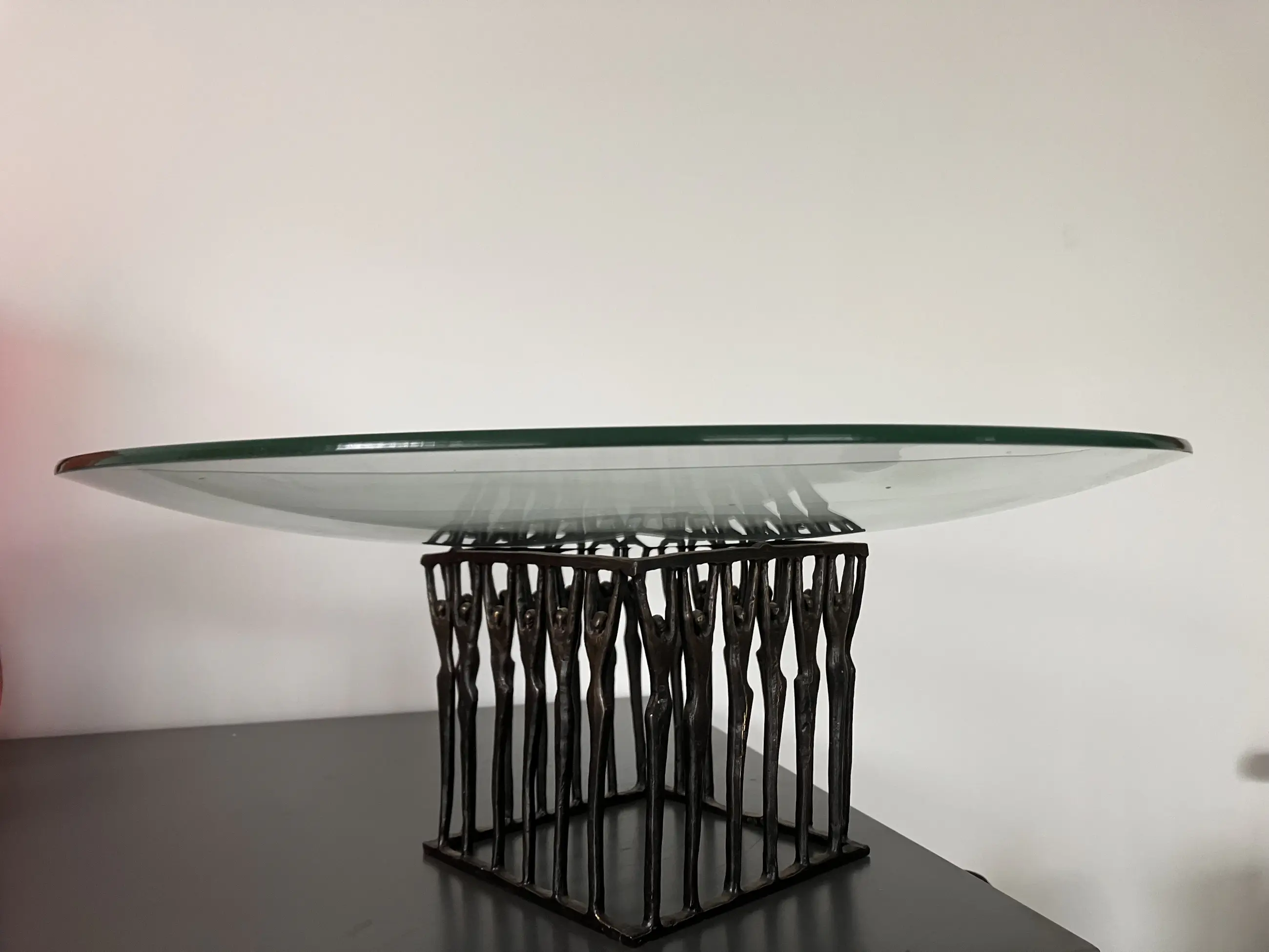 Grote heldere schaal wordt gedragen door personen opgesteld in een vierkant Daarnaast een kleinere schaal met personen En een porseleinen waxinelichtje alle in duidelijk herkenbare stijl van de kunstenaar