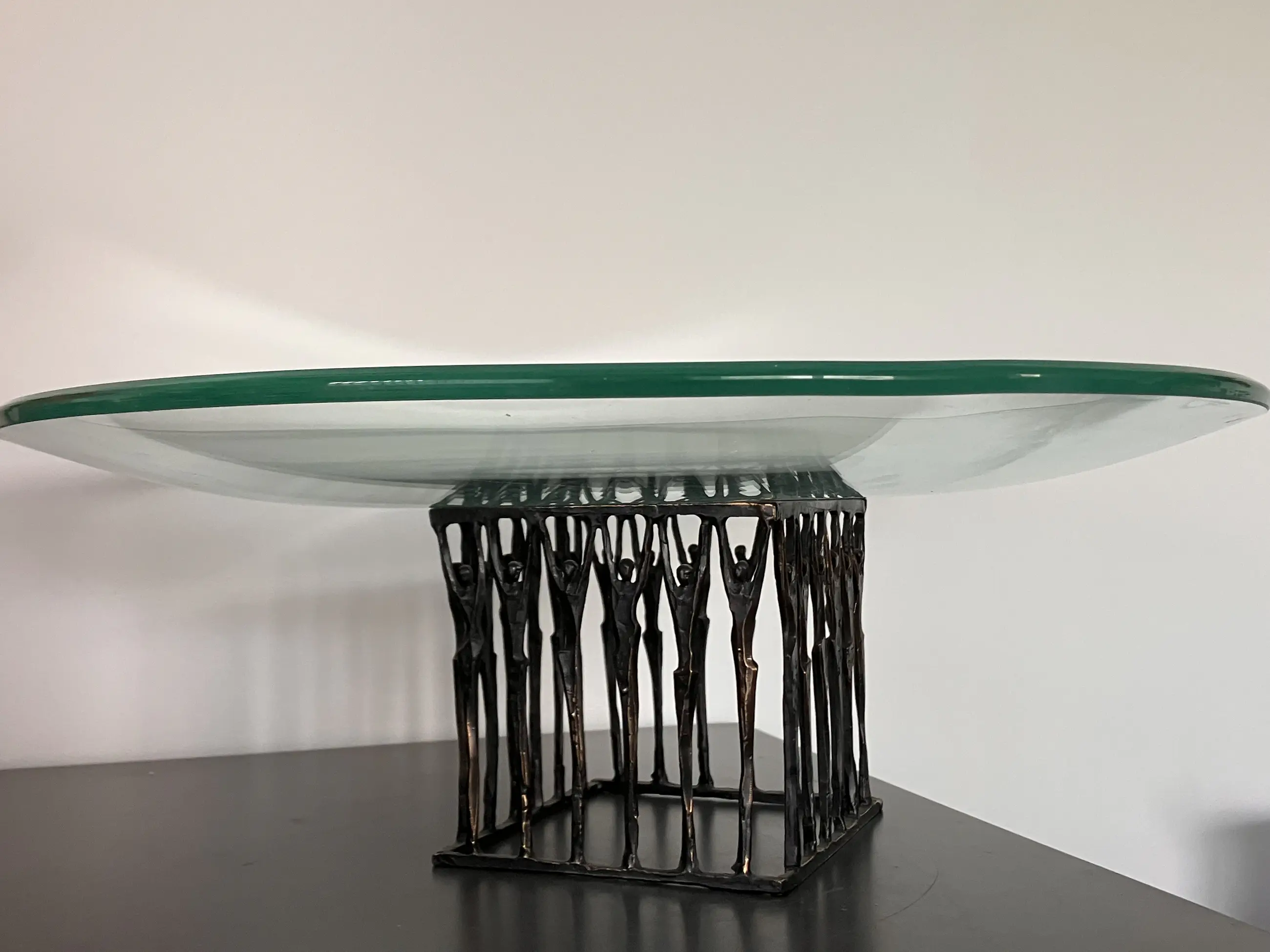 Grote heldere schaal wordt gedragen door personen in een vierkant opgesteld