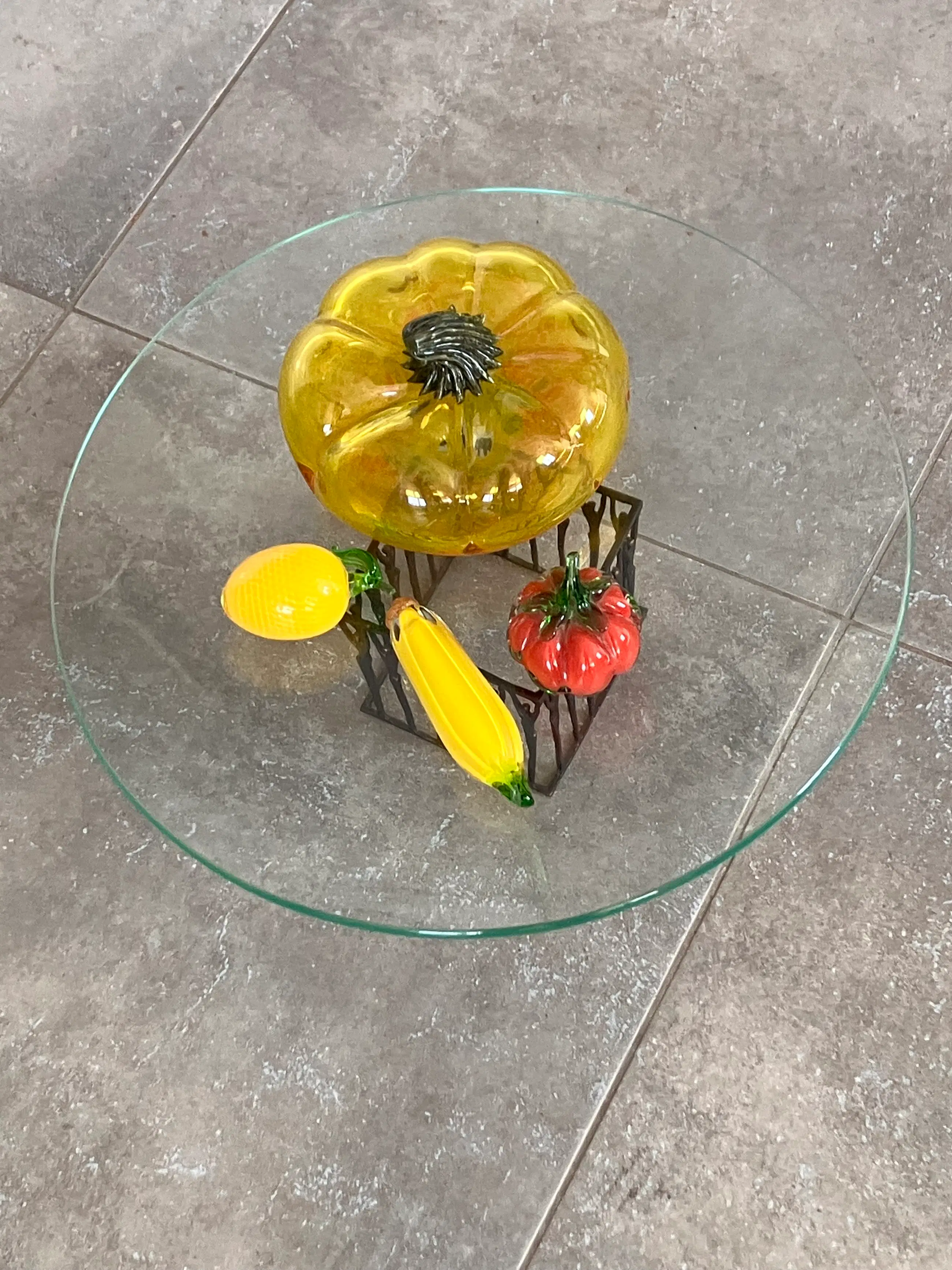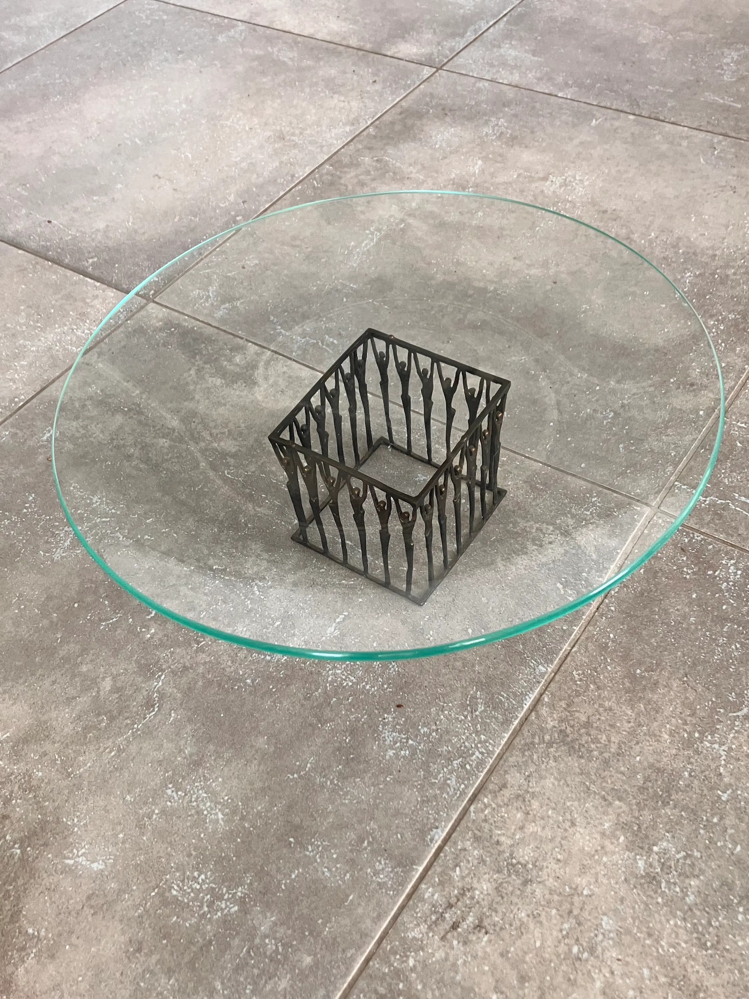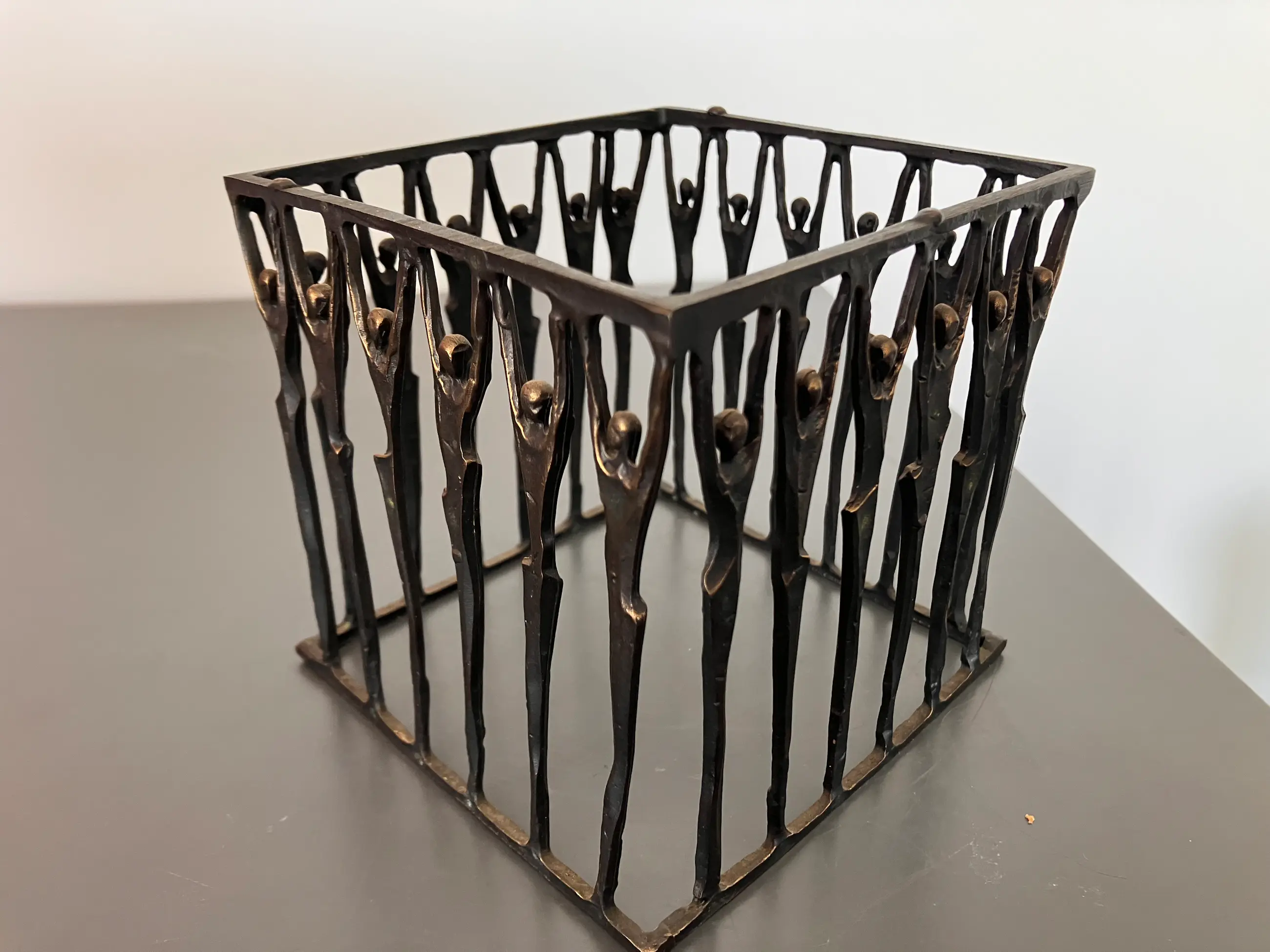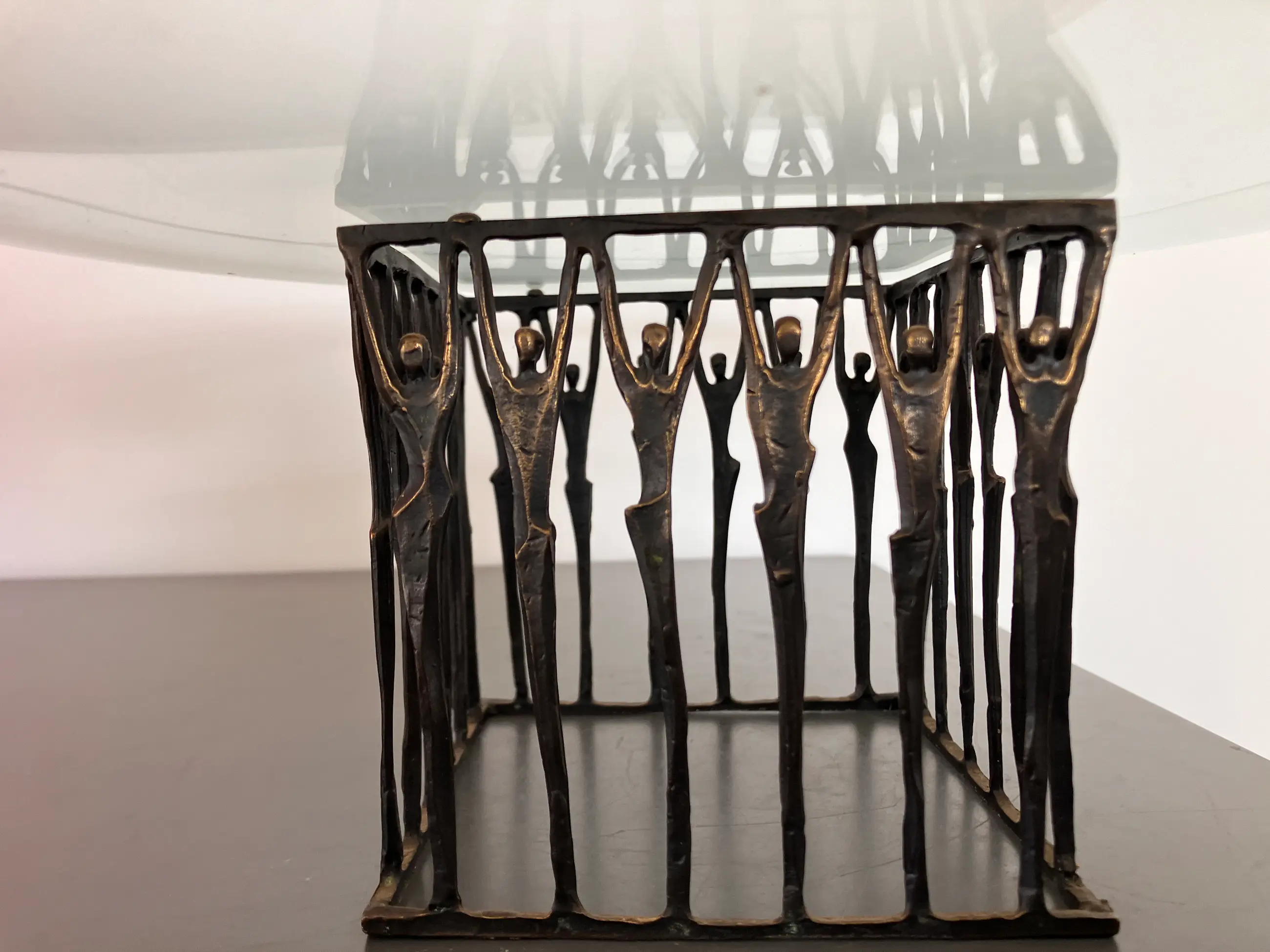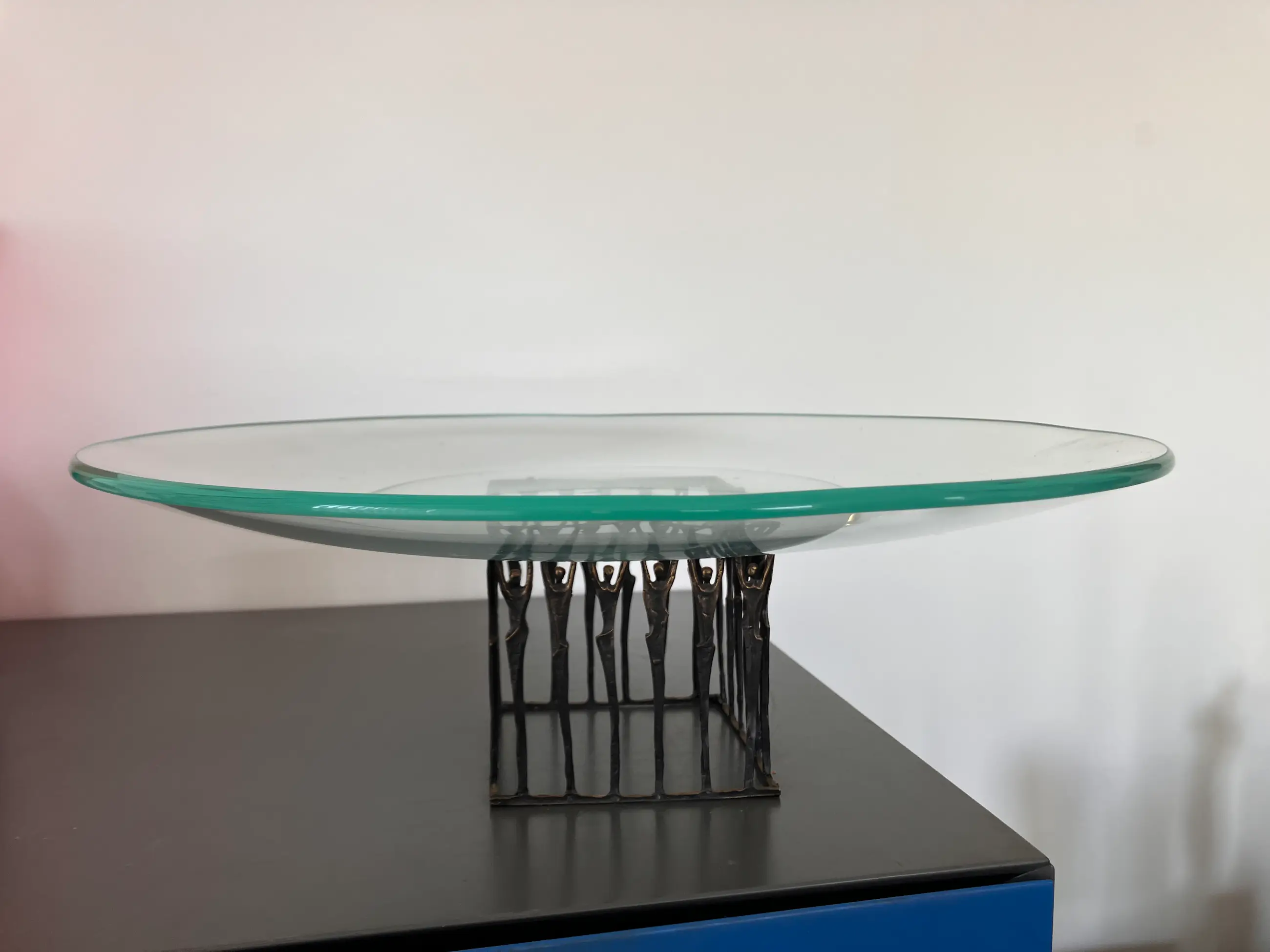 Grote helder glazen schaal wordt omhoog gehouden door in een carré opgestelde personen