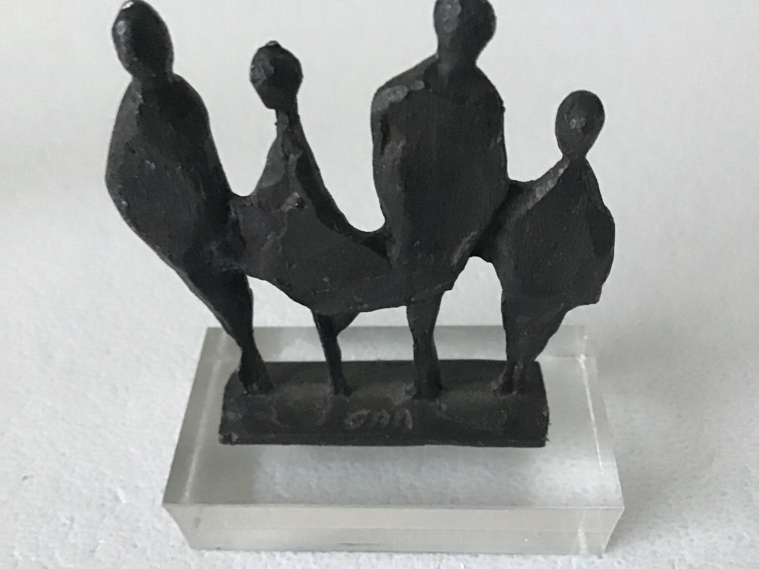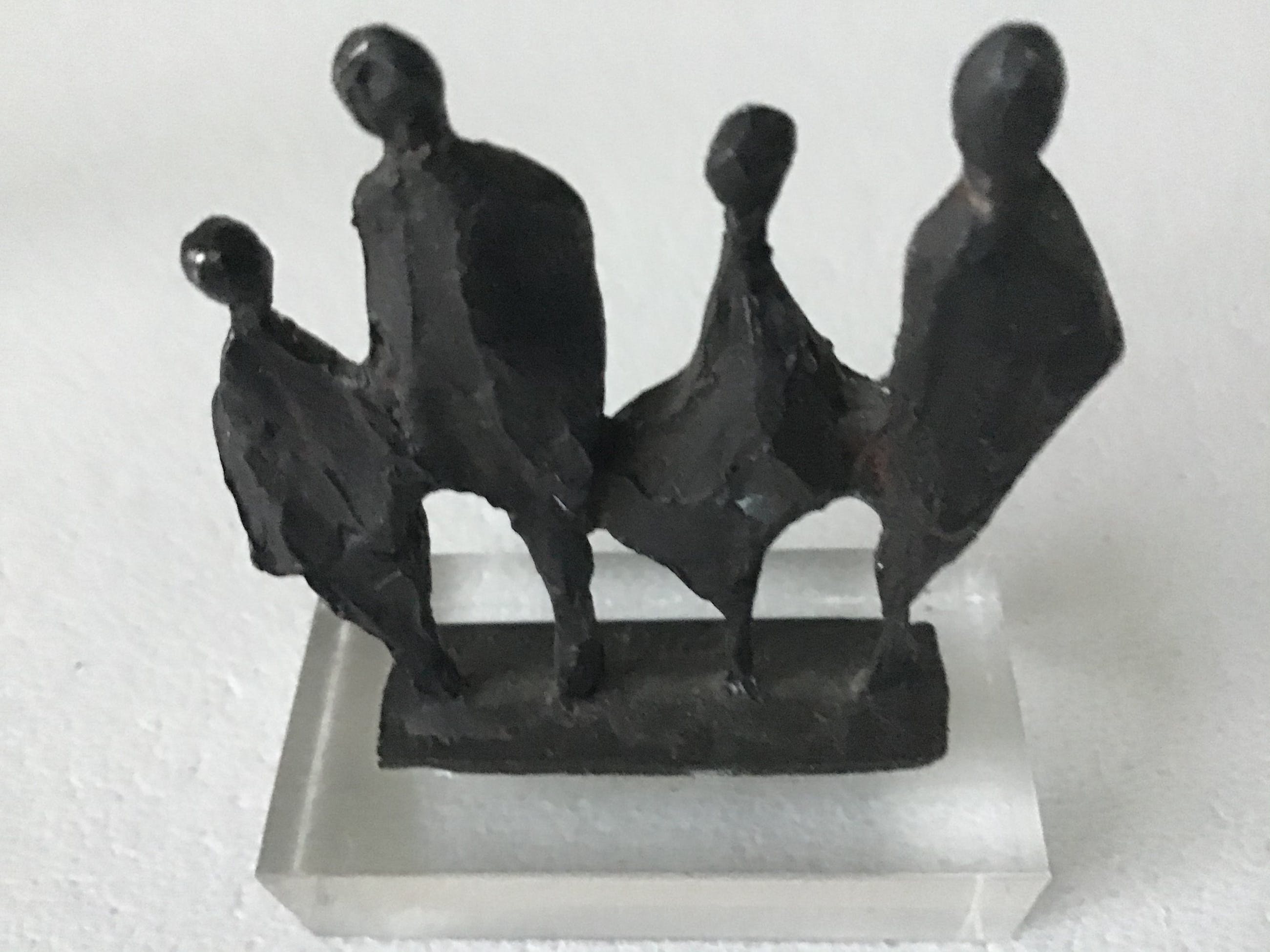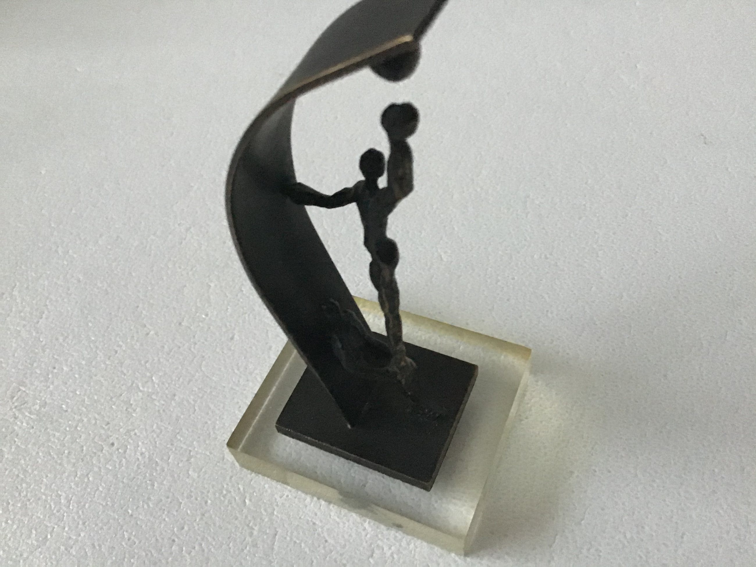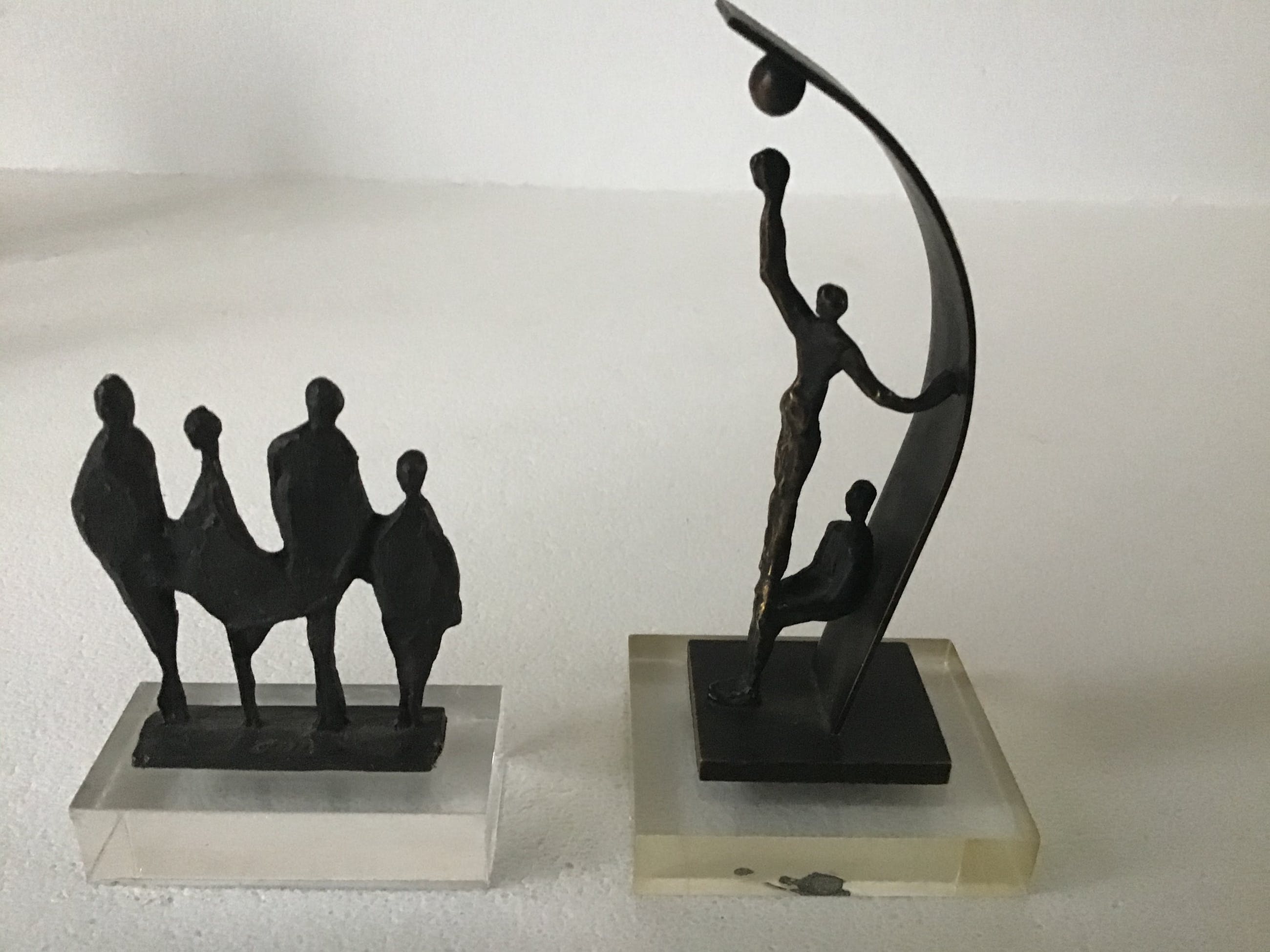 2 beeldjes van Corry Ammerlaan op sokkels van plexiglas. Beeldje 1 “mensen”. Hoogte 8 cm.breedte 6 cm.en diepte 3 cm. Beeldje 2”samensterk”. Hoogte 12cm.breedte 6 cm.endiepte 5 cm. Materiaal verbronsd metaal of alloy.