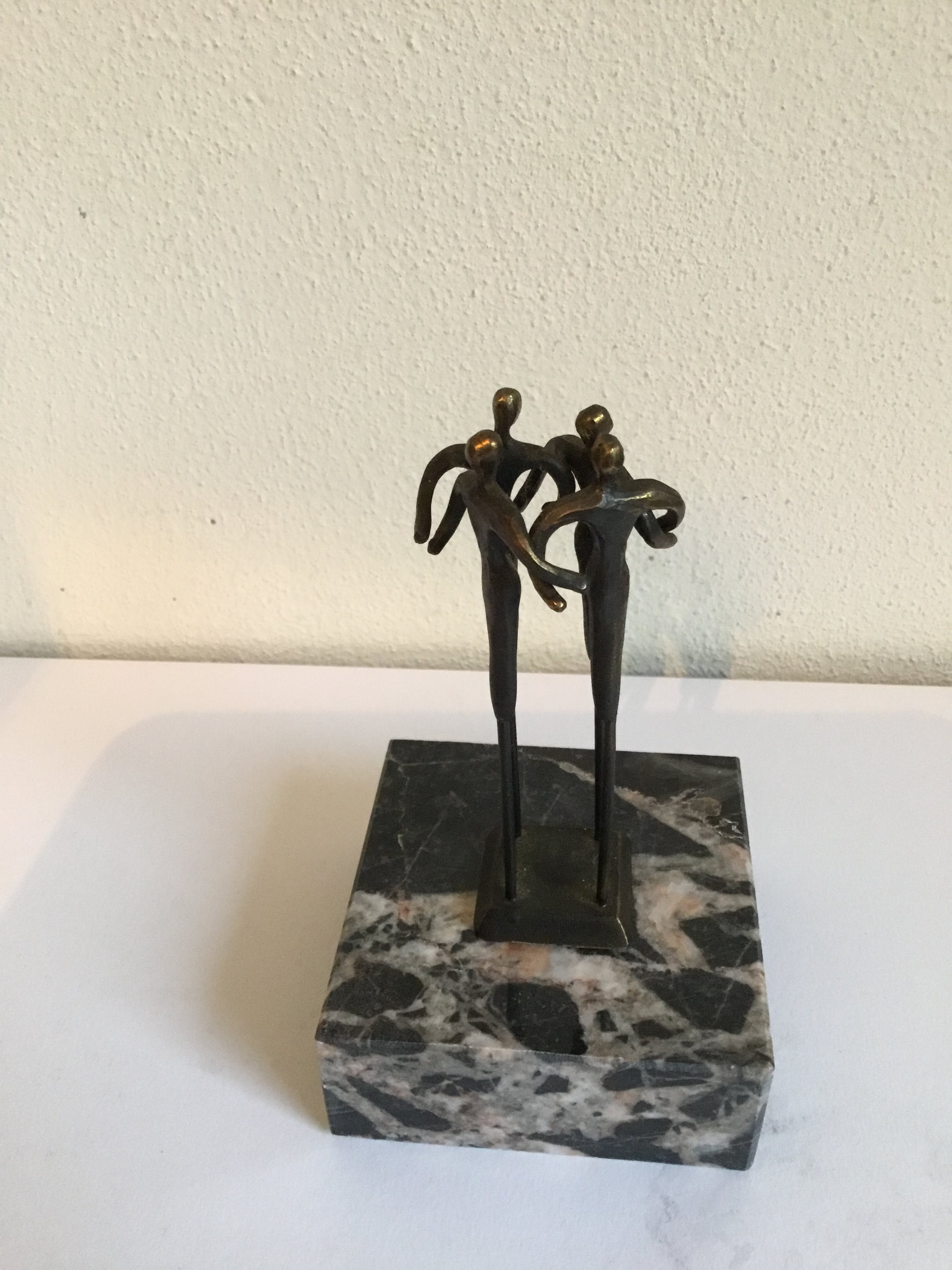Twee bronzen beelden: Drie figuren op een pyramide: het beeld (exclusief sokkel) is 10 cm hoog, de sokkel is 8x8x4 cm De 4 figuren in omarming: het beeld is 10 cm hoog, de sokkel is de 7,5x7,5 x 3 cm