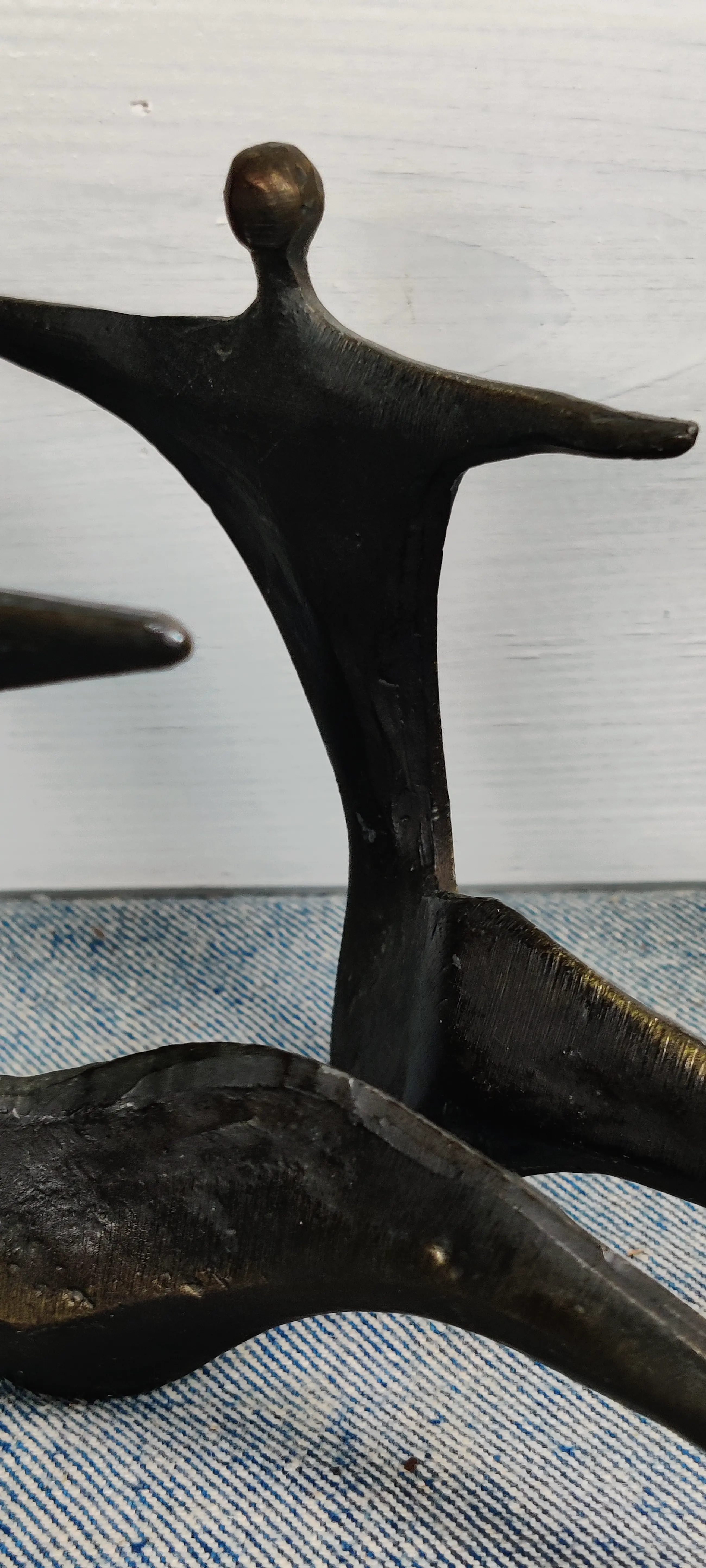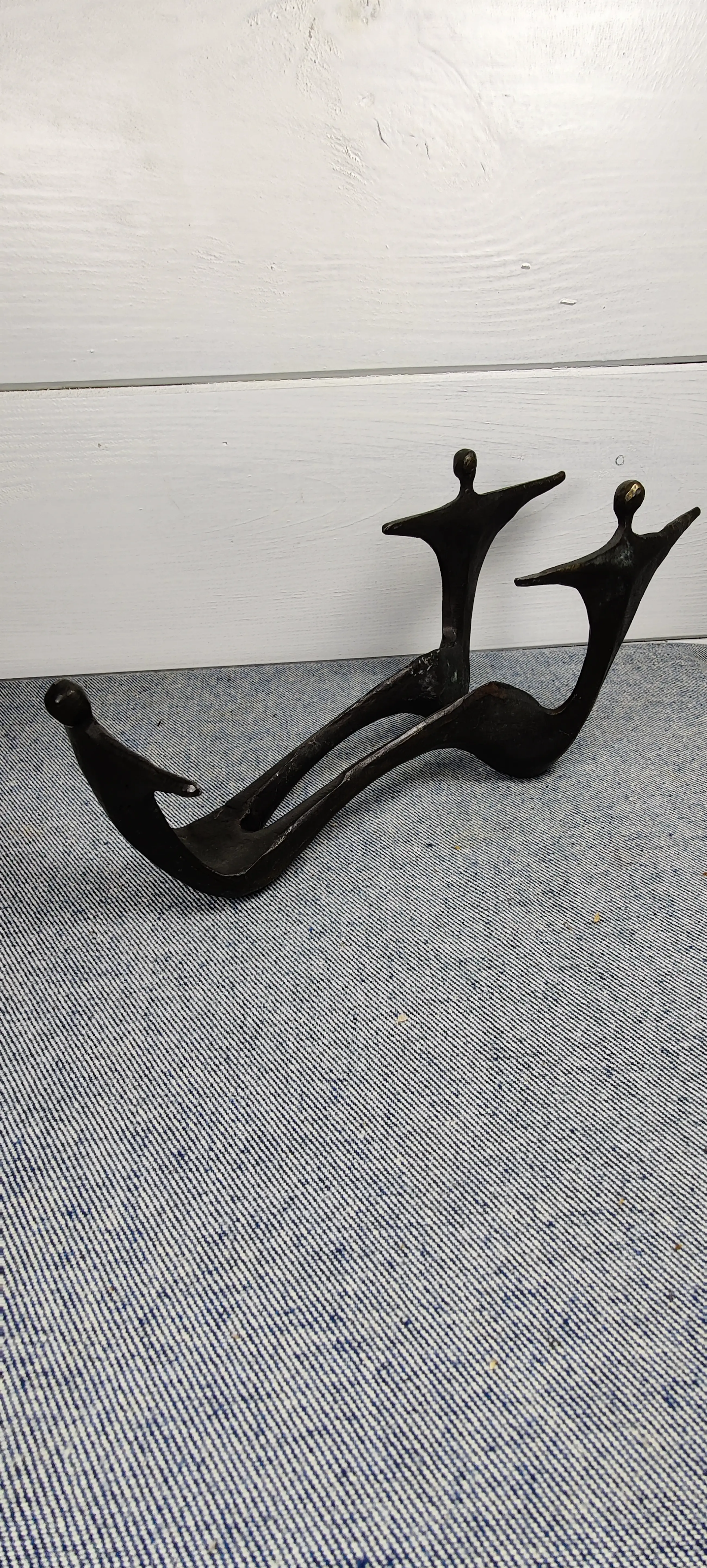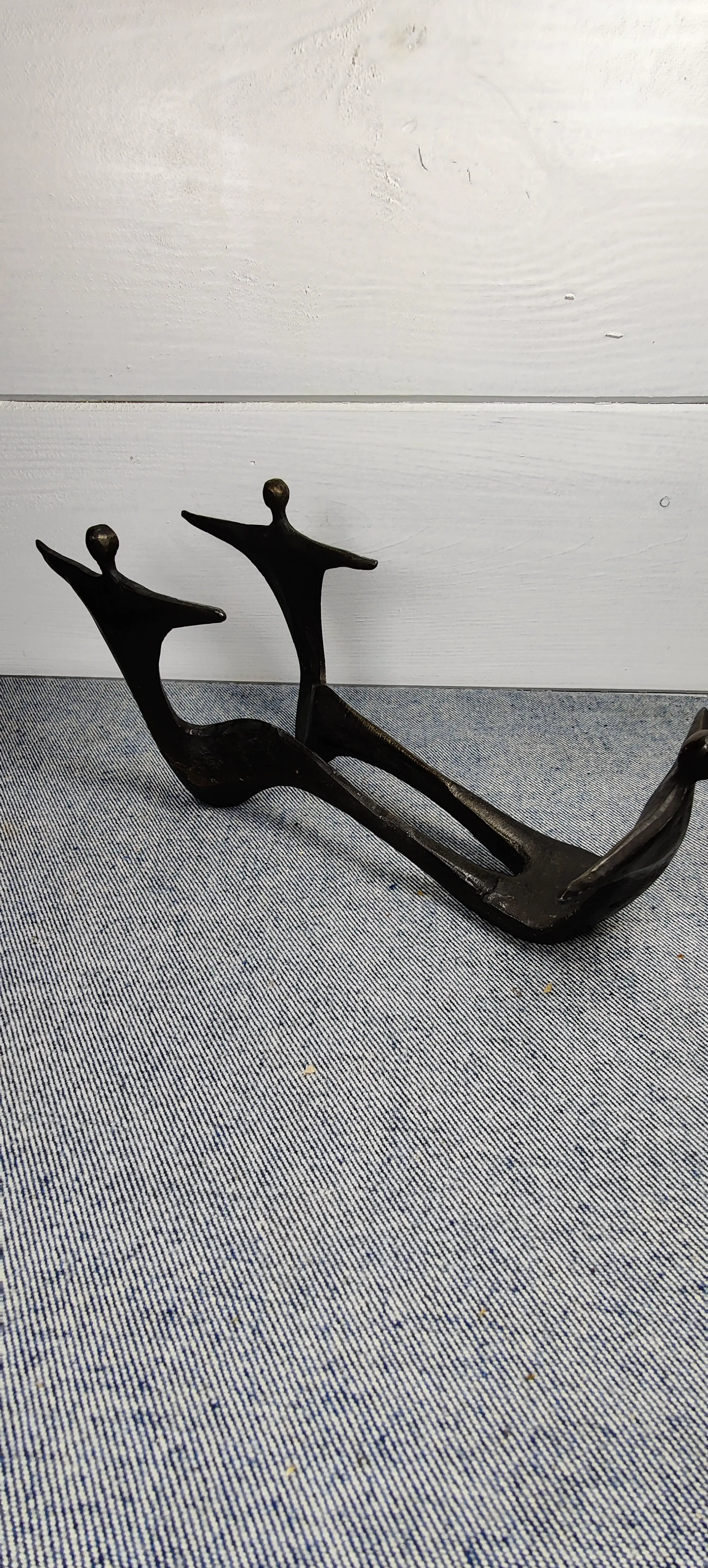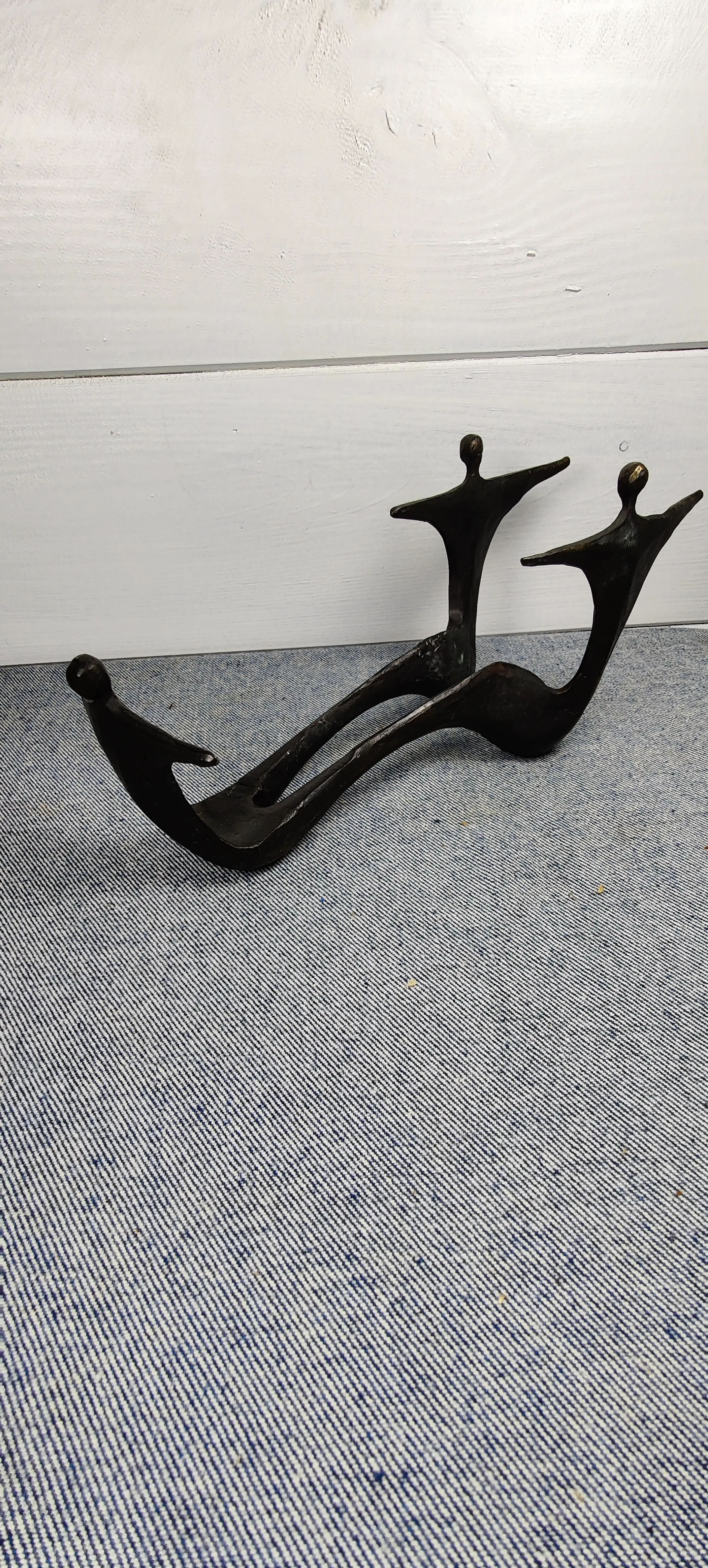 Zeldzaam en bijzonder fraai sculptuur van een muurtje van keramiek met daarop twee mensfiguren die elkaar helpen hogerop te komen Titel “ Samensterk“ Het is een vrij zeldzaam sculptuur, niet meer in de vrije verkoop te krijgen. Kunstenares : Corry Ammerlaan. Hoogte : 22,5 cm. Breedte : 10 x 9cm Materiaal : Massief bronzen beeld/wijnfleshouder