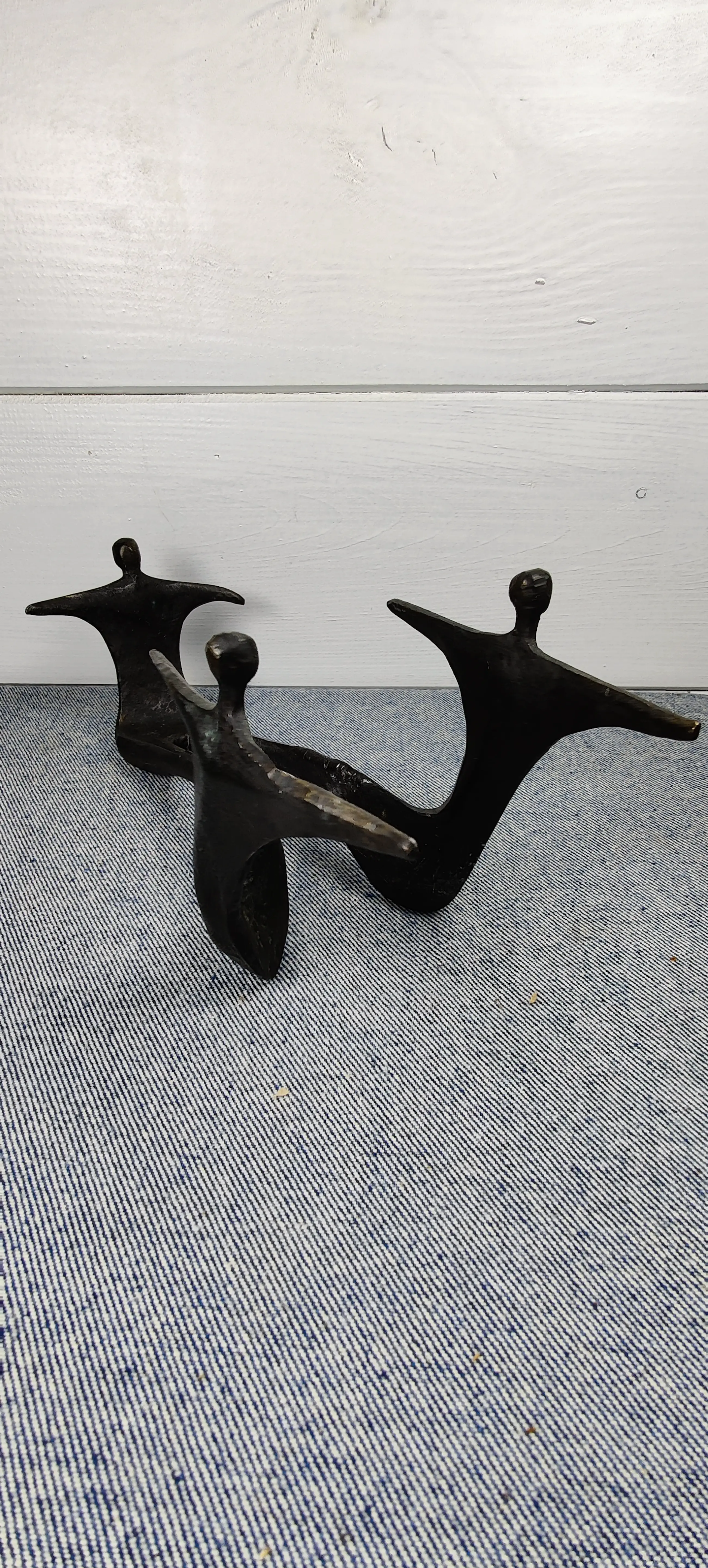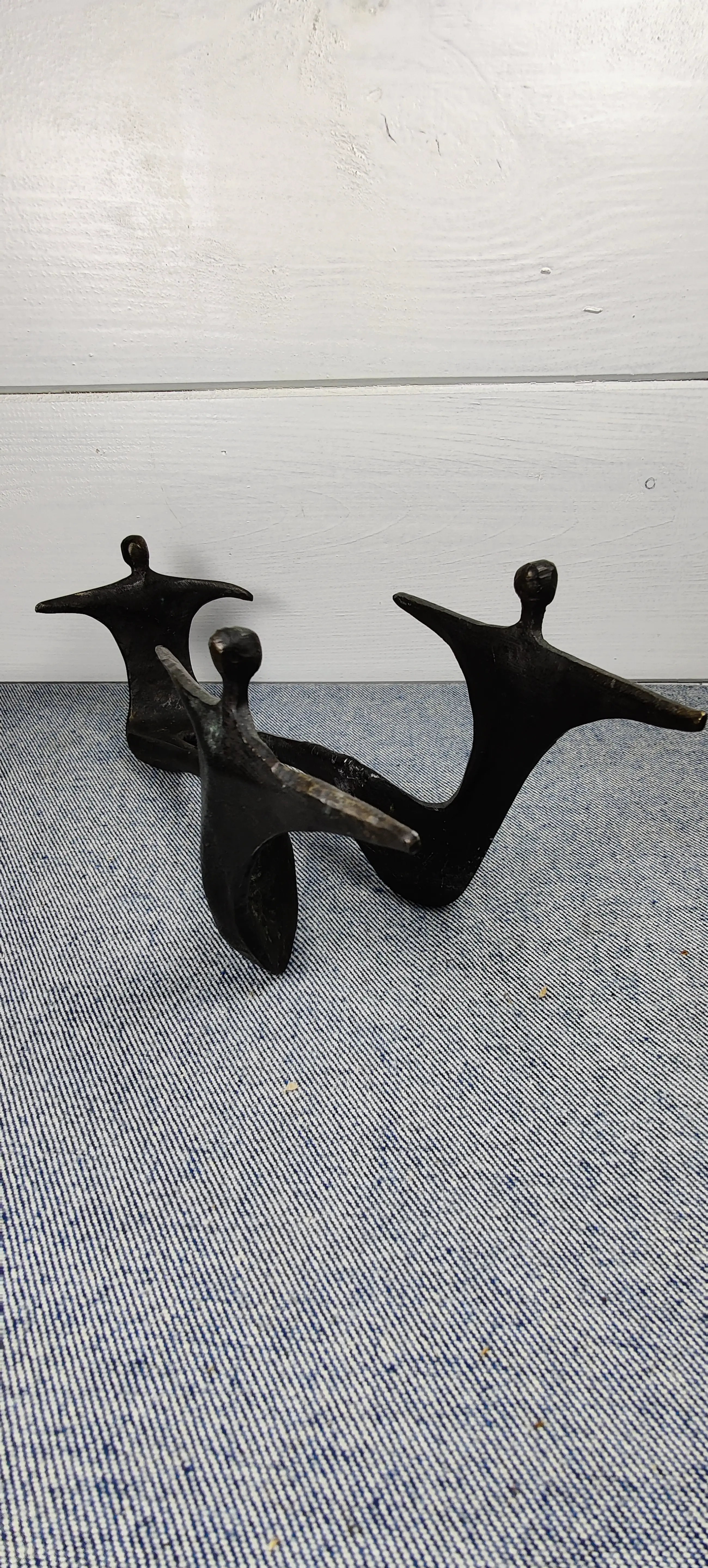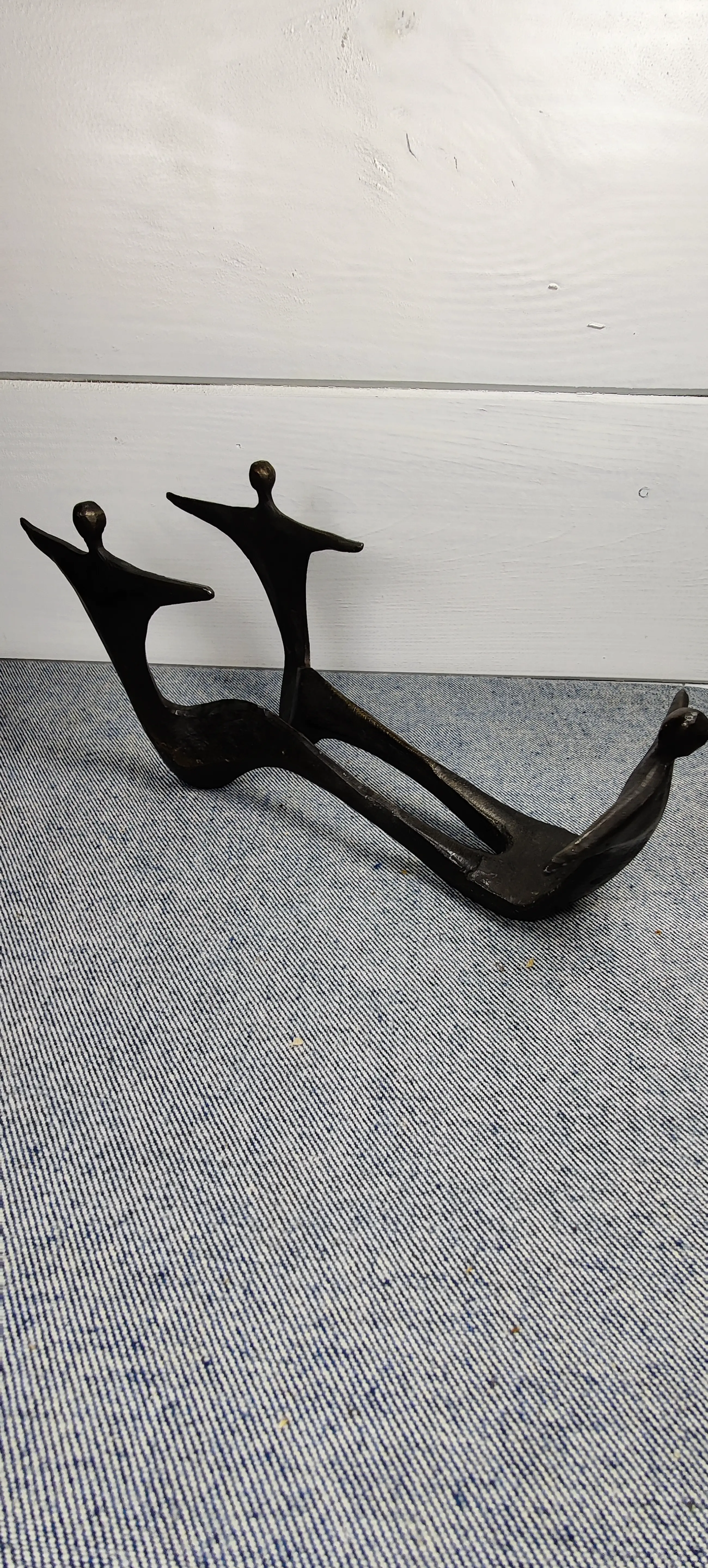 Zeldzaam en bijzonder fraai sculptuur van een muurtje van keramiek met daarop twee mensfiguren die elkaar helpen hogerop te komen Titel “ Samensterk“ Het is een vrij zeldzaam sculptuur, niet meer in de vrije verkoop te krijgen. Kunstenares : Corry Ammerlaan. Hoogte : 22,5 cm. Breedte : 10 x 9cm Materiaal : Massief bronzen beeld/wijnfleshouder