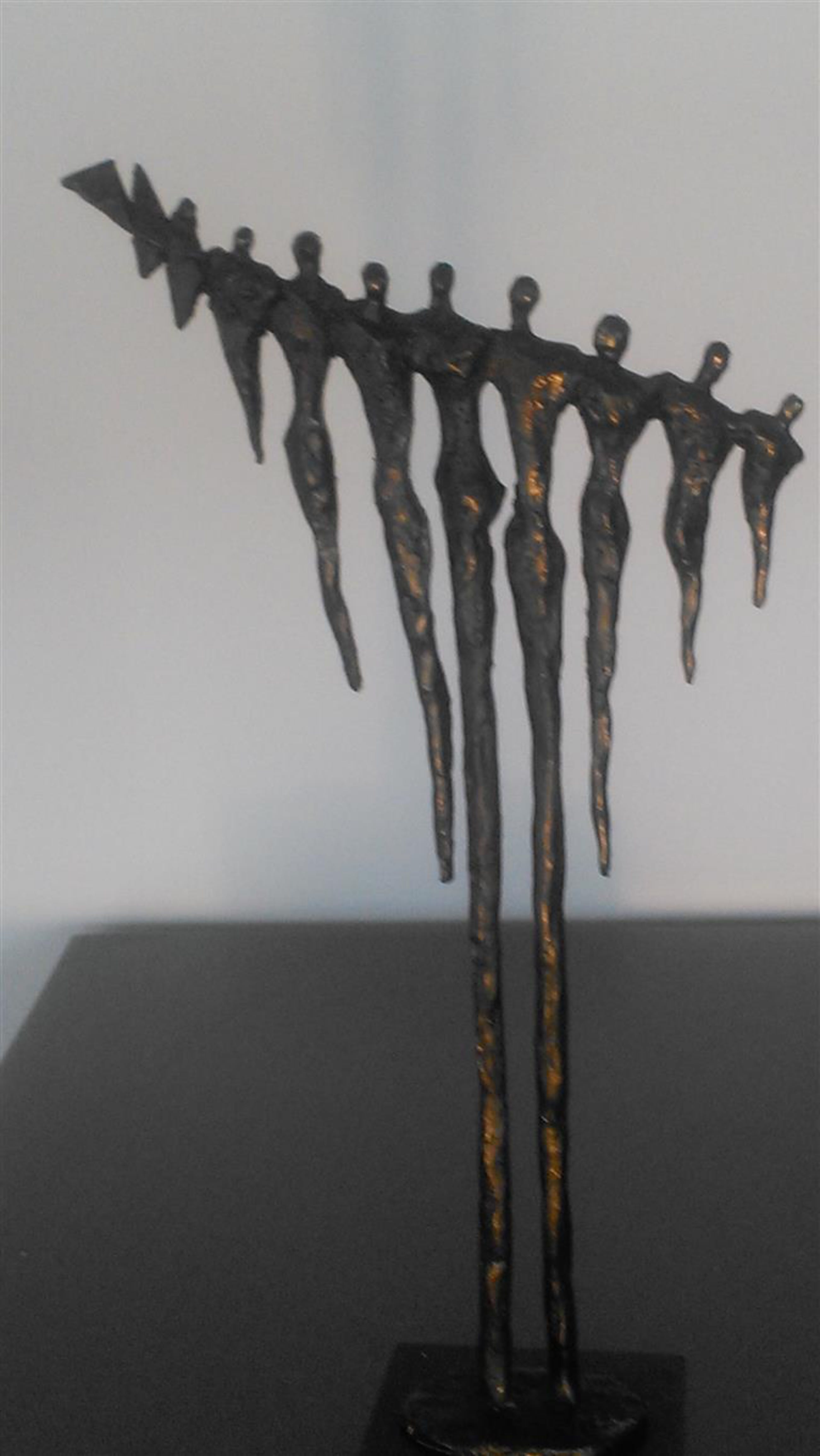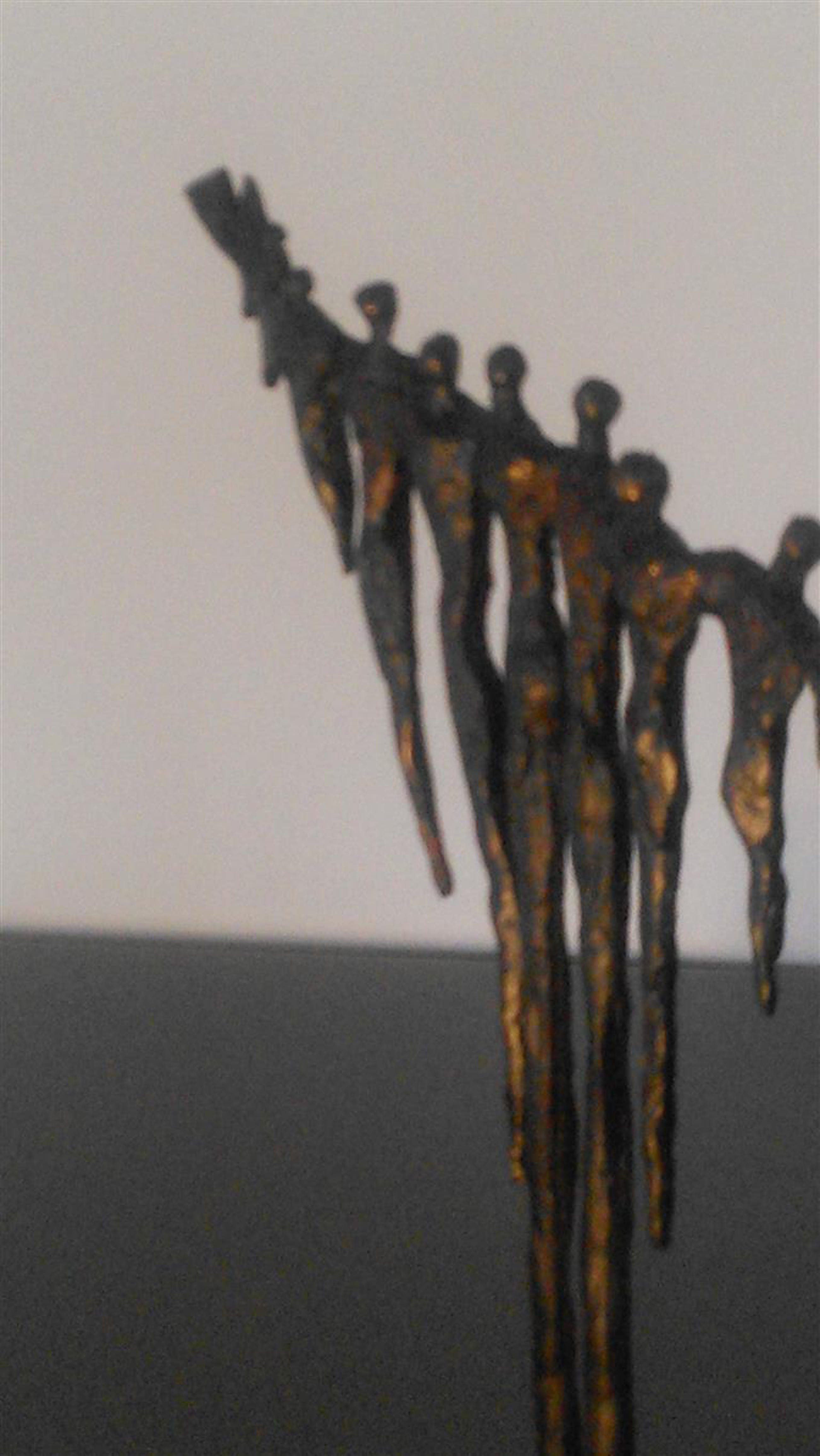 Acht staande figuren schouder aan schouder op natuurstenen sokkel 5 x 5 x 2 cm Gesigneerd CAN Corry Ammerlaan van Niekerk de artistiek directeur van Artihove