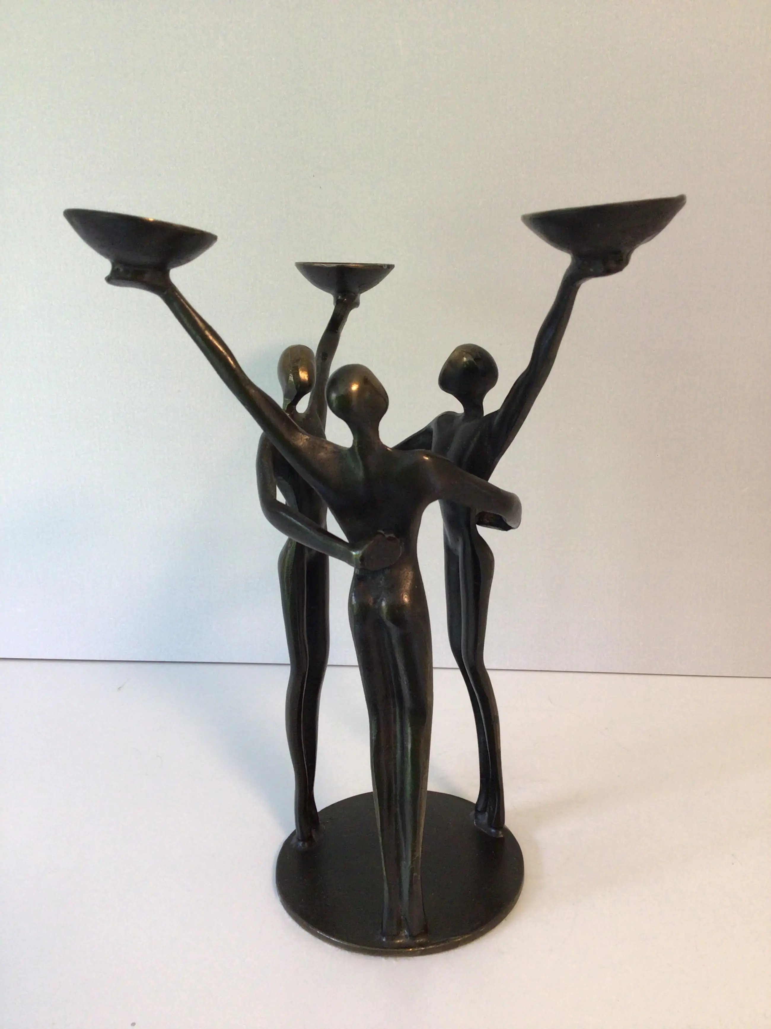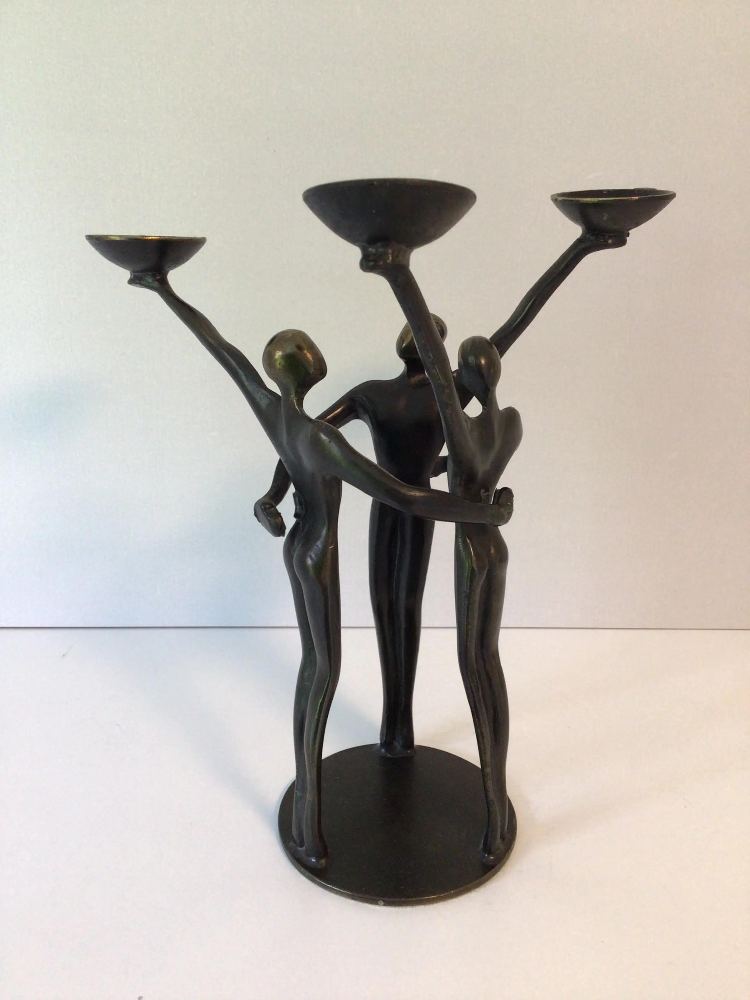 Zeer fraai , zeldzaam en symbolisch sculptuur/ kaarsenstandaard waar drie mensfiguren elkaar en de kandelaren vasthouden- ze vormen een goed team ! Kunstenares: Corry Ammerlaan Titel: “ Teamspirit “ Hoogte : 21 cm Materiaal: Legering Het beeld verkeert in goede staat en wordt zorgvuldig verpakt verzonden.