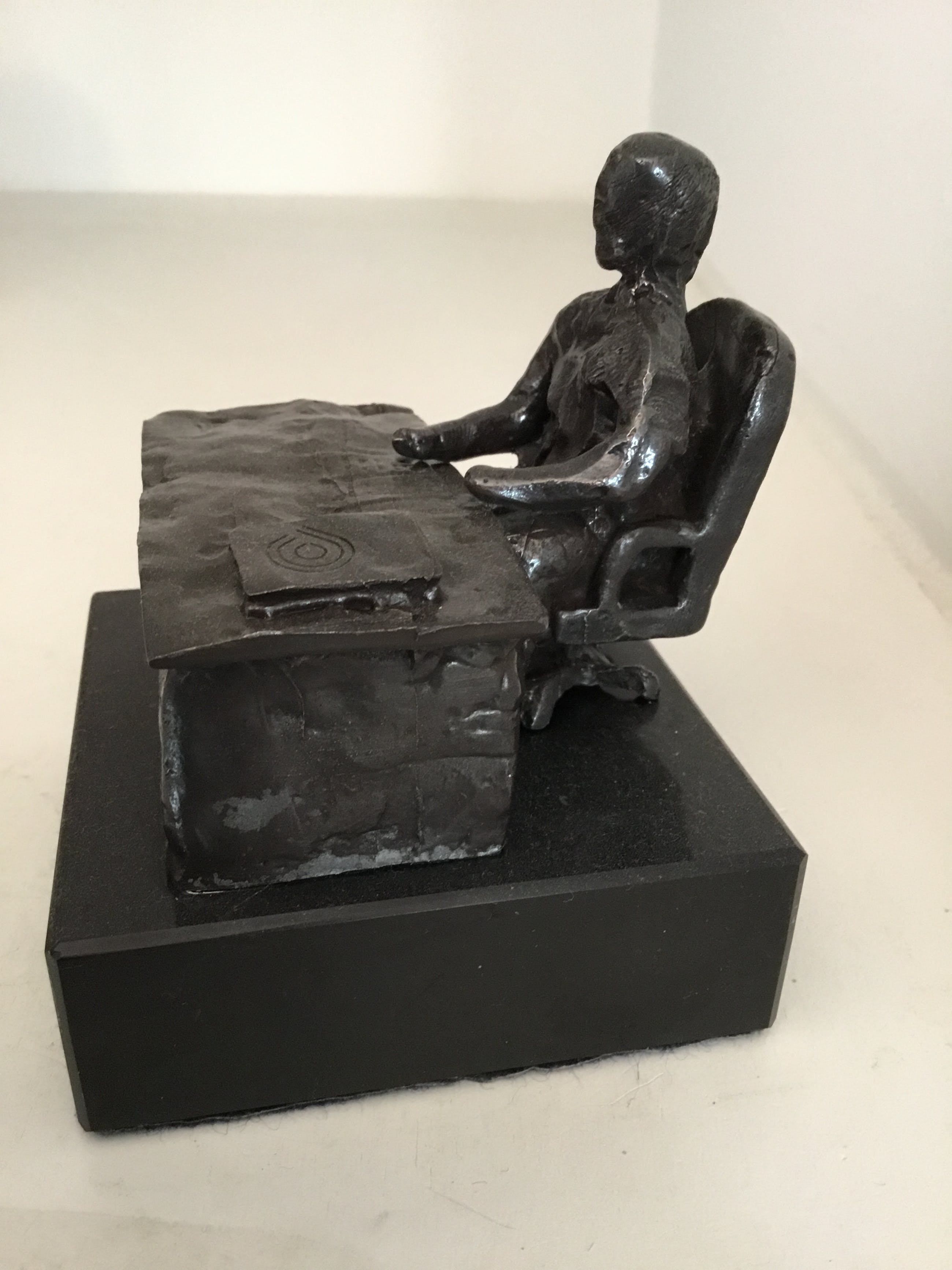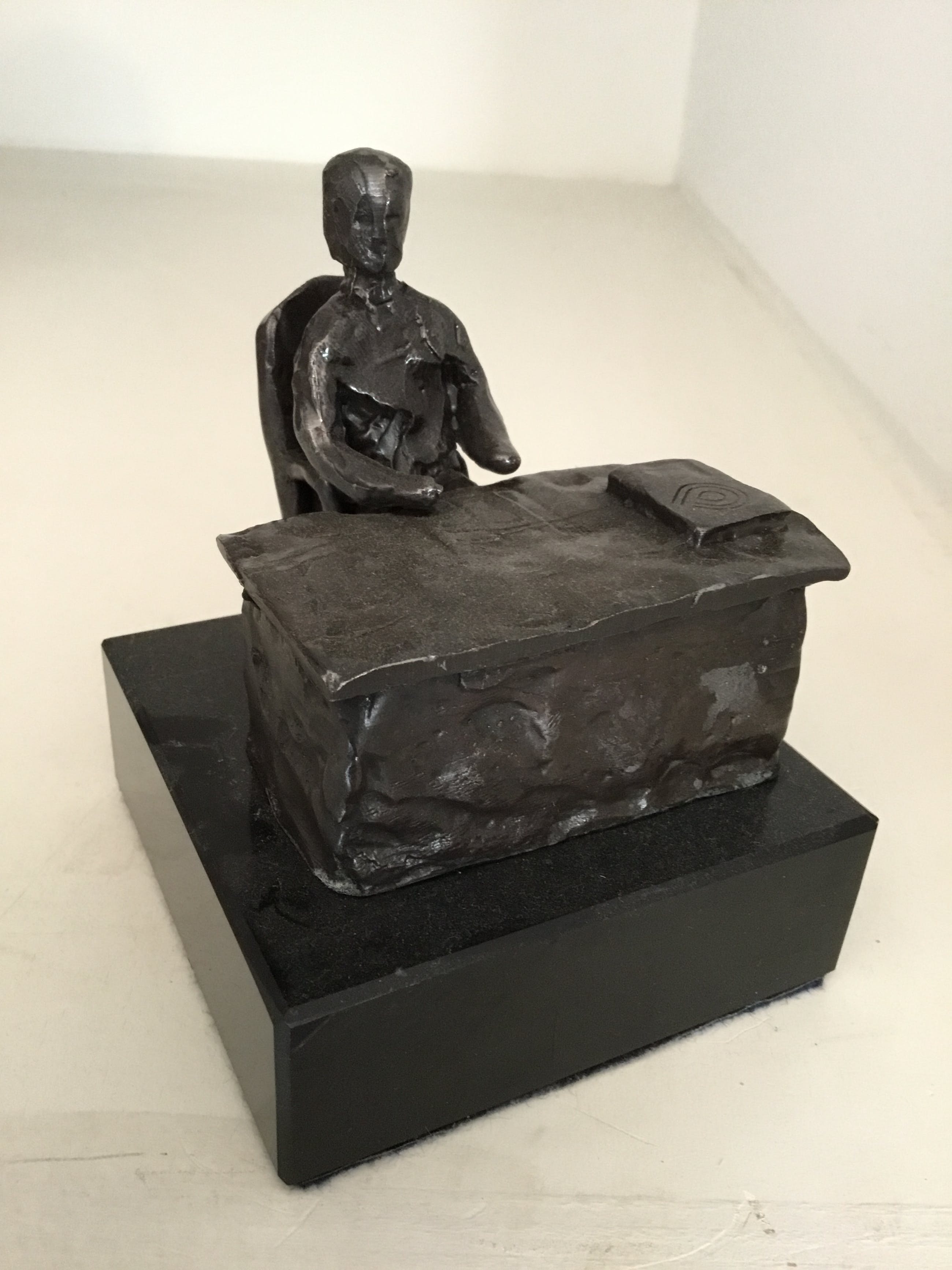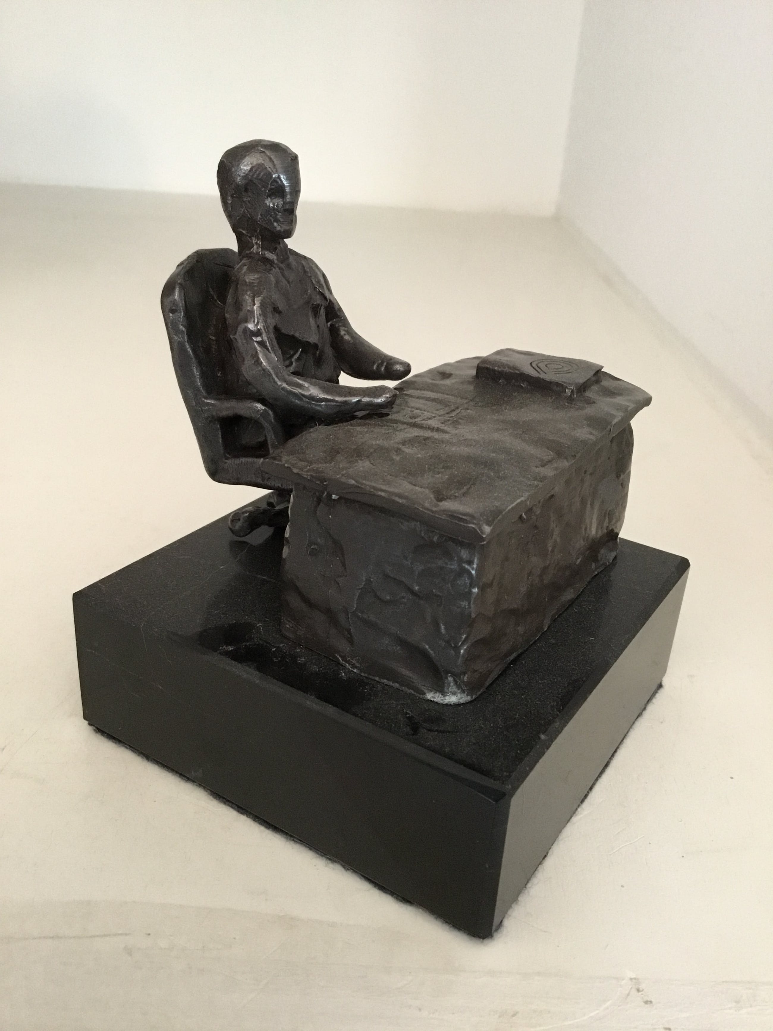 Mooi en zwaar verbronsd sculptuur van een mensfiguur dat achter zijn bureau aan het werk is. Materiaal : verbronsd metaal op marmeren voet. Kunstenares : Corry Ammerlaan Het sculptuur verkeert in zeer goede staat en wordt zorgvuldig verpakt en aangetekend verzonden