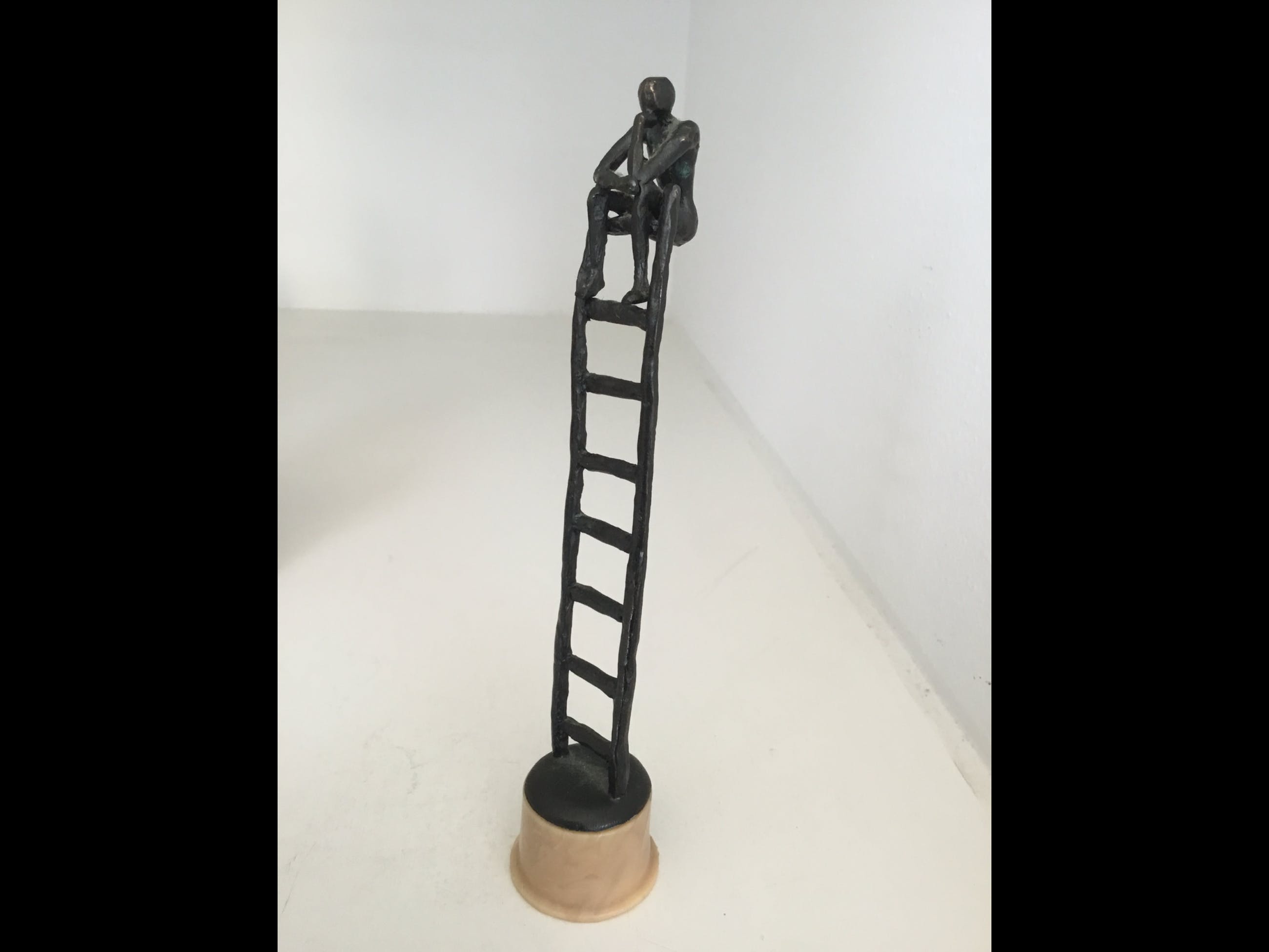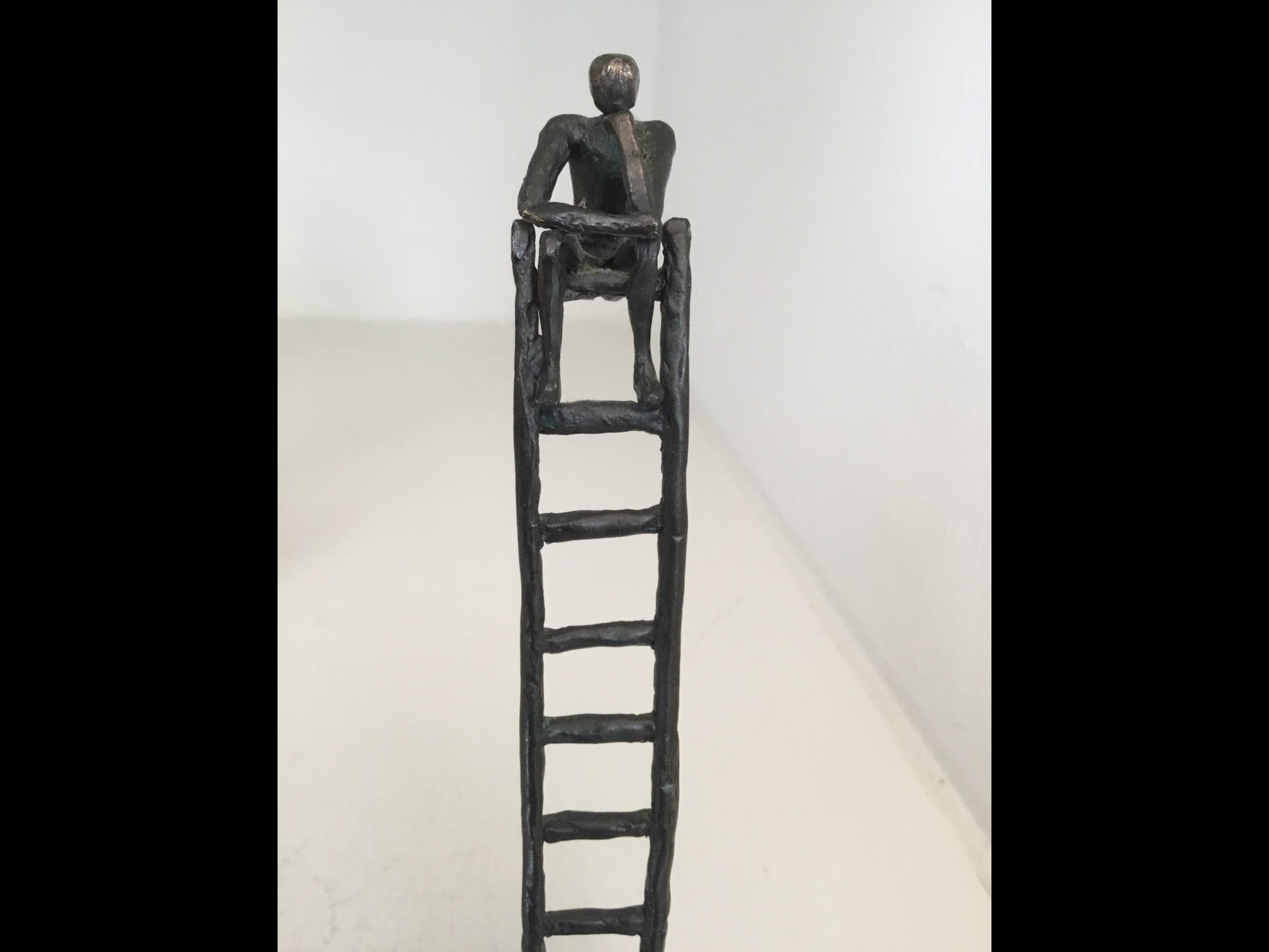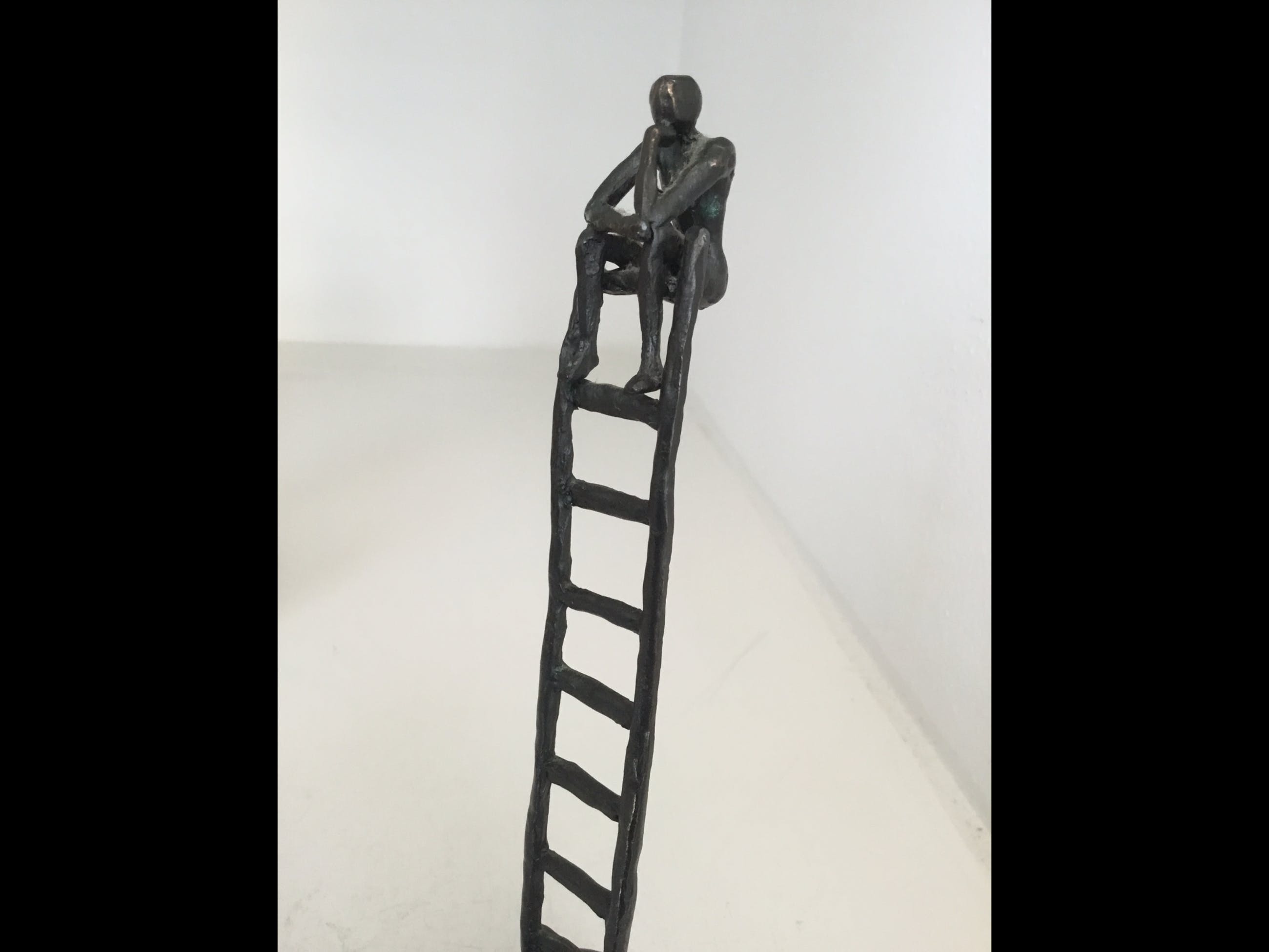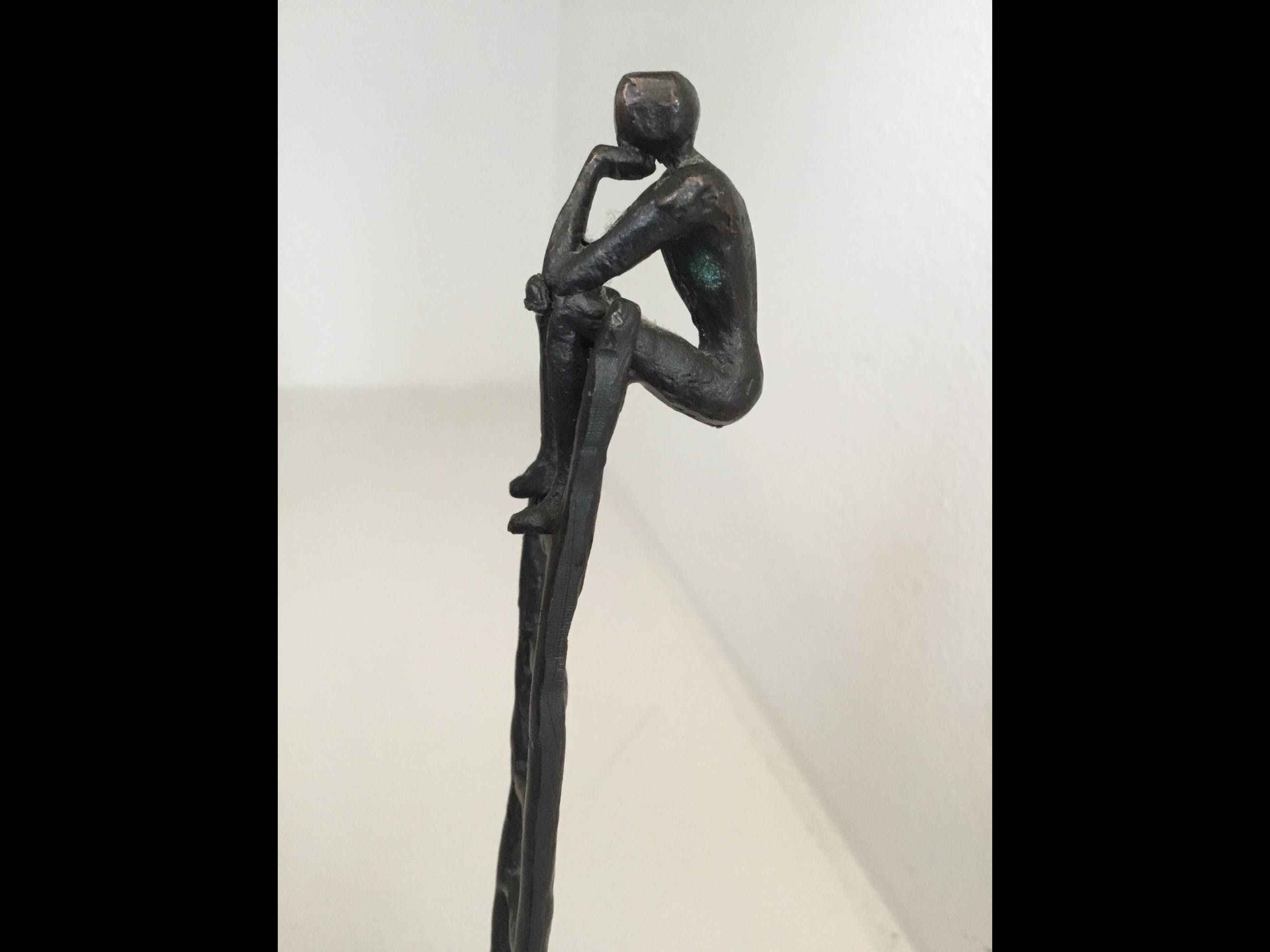 Mooi symbolisch sculptuur van een mensfiguur die mijmerend boven op een ladder zit. Titel “ De denkende mens “ Hoogte : 18 cm Kunstenares : Corry Ammerlaan Gesigneerd op onderkant : CAN Het sculptuur verkeert in goede staat en wordt zorgvuldig verpakt en aangetekend verzonden .