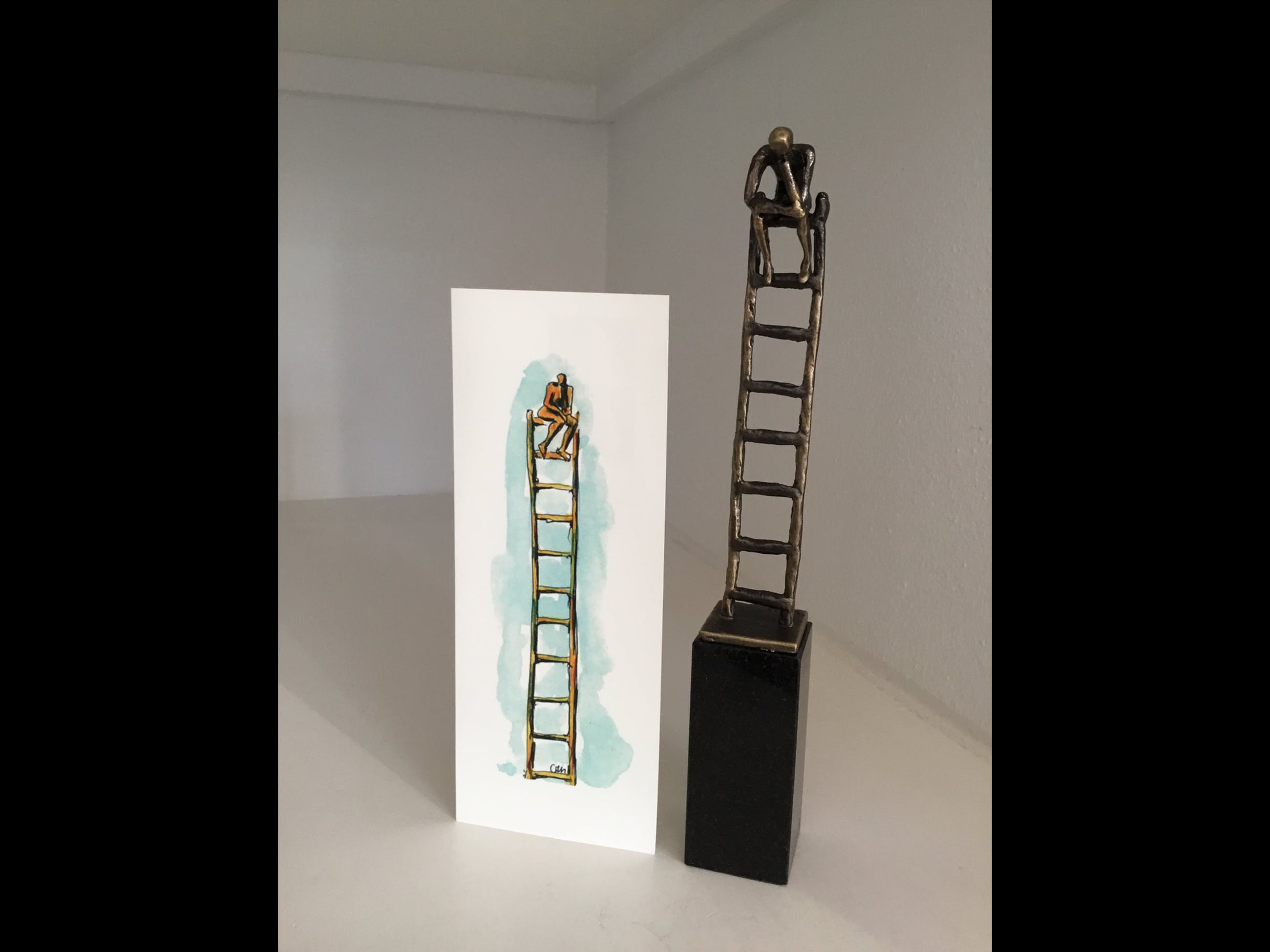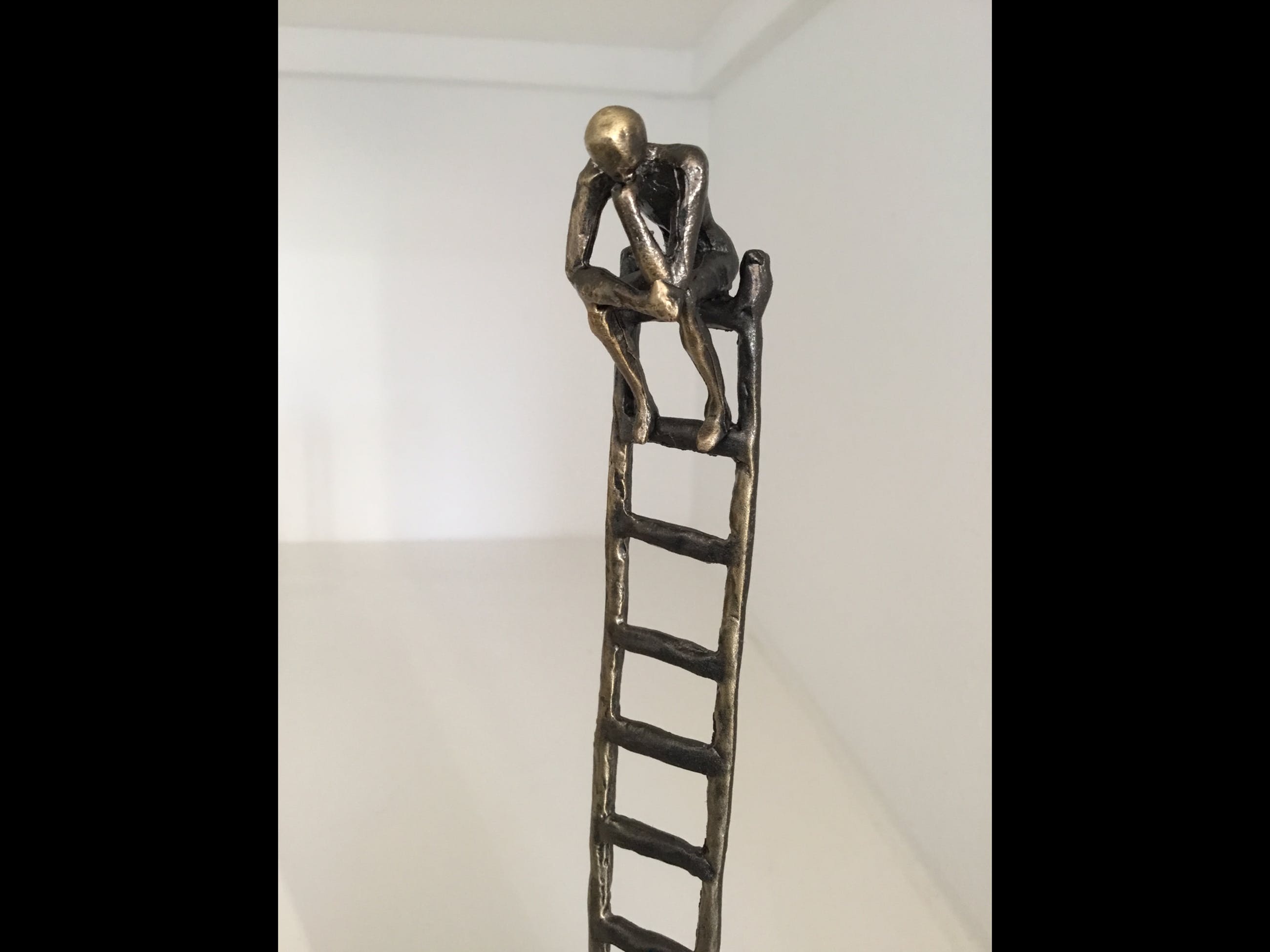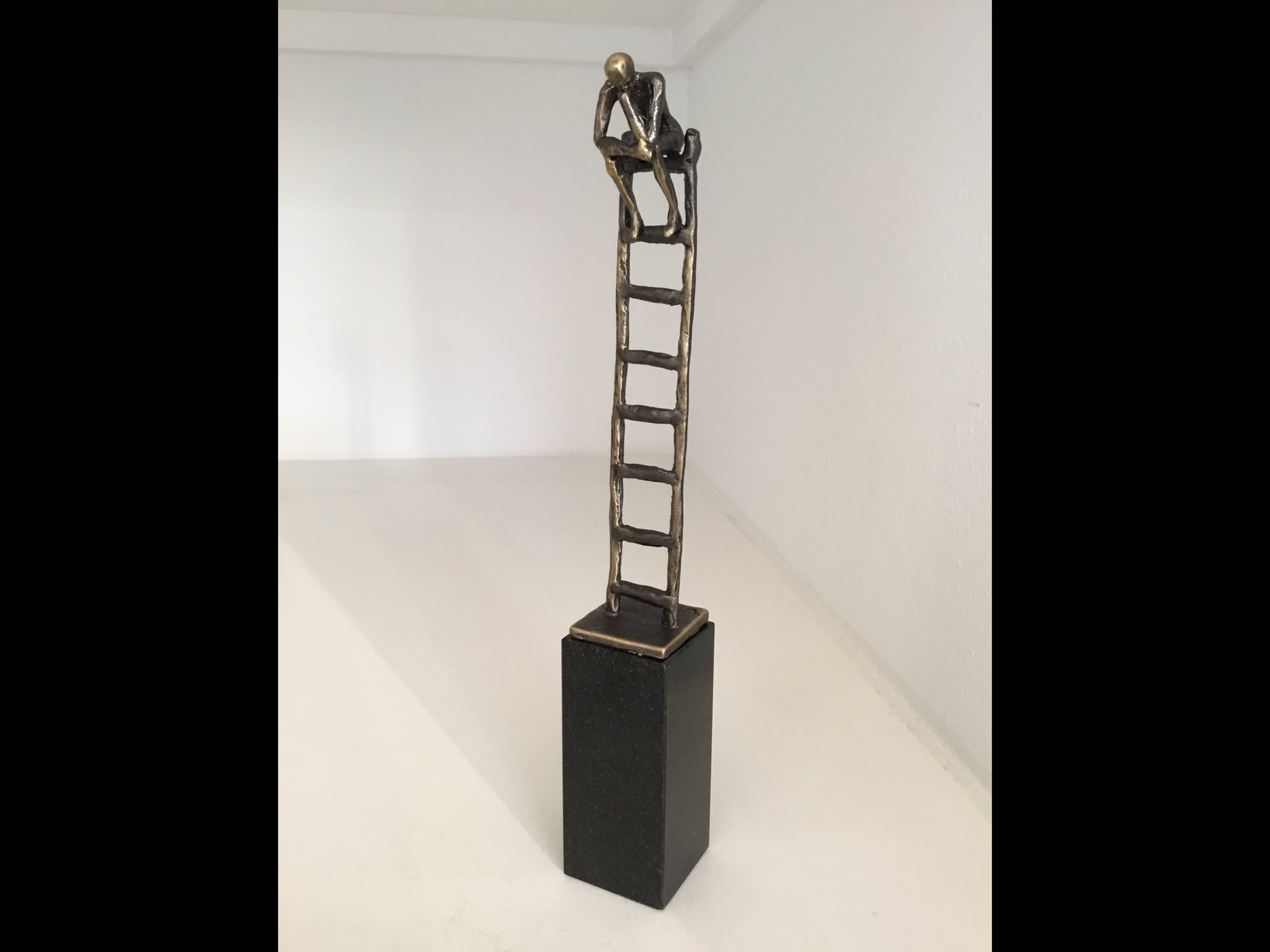 Mooi symbolisch sculptuur van een mensfiguur in overdenking boven op een ladder. Titel “ De denkende mens “ Hoogte : 23 cm Materiaal : brons en marmer Kunstenares : Corry Ammerlaan Het sculptuur verkeert in nieuwstaat en wordt zorgvuldig verpakt en aangetekend verzonden