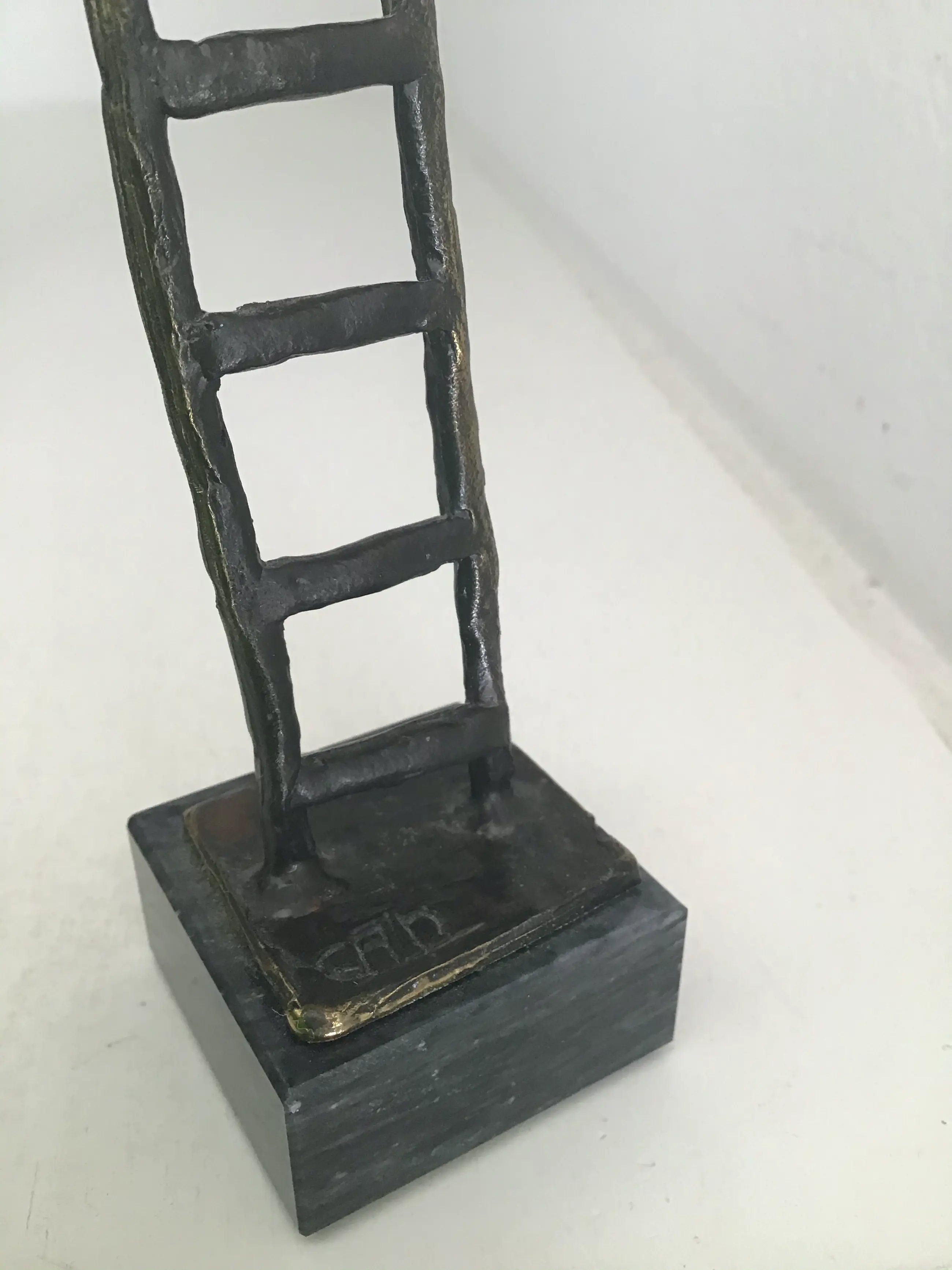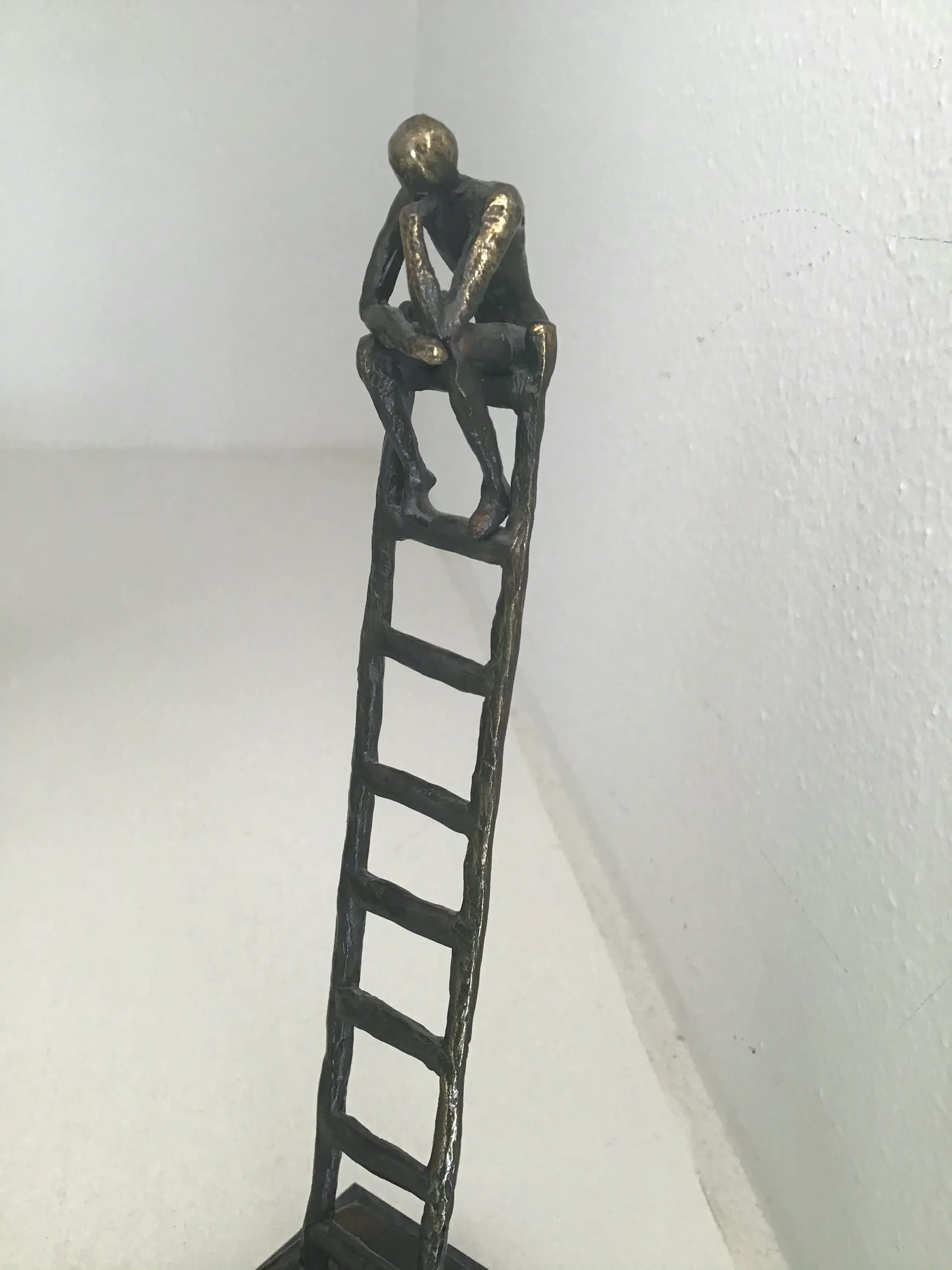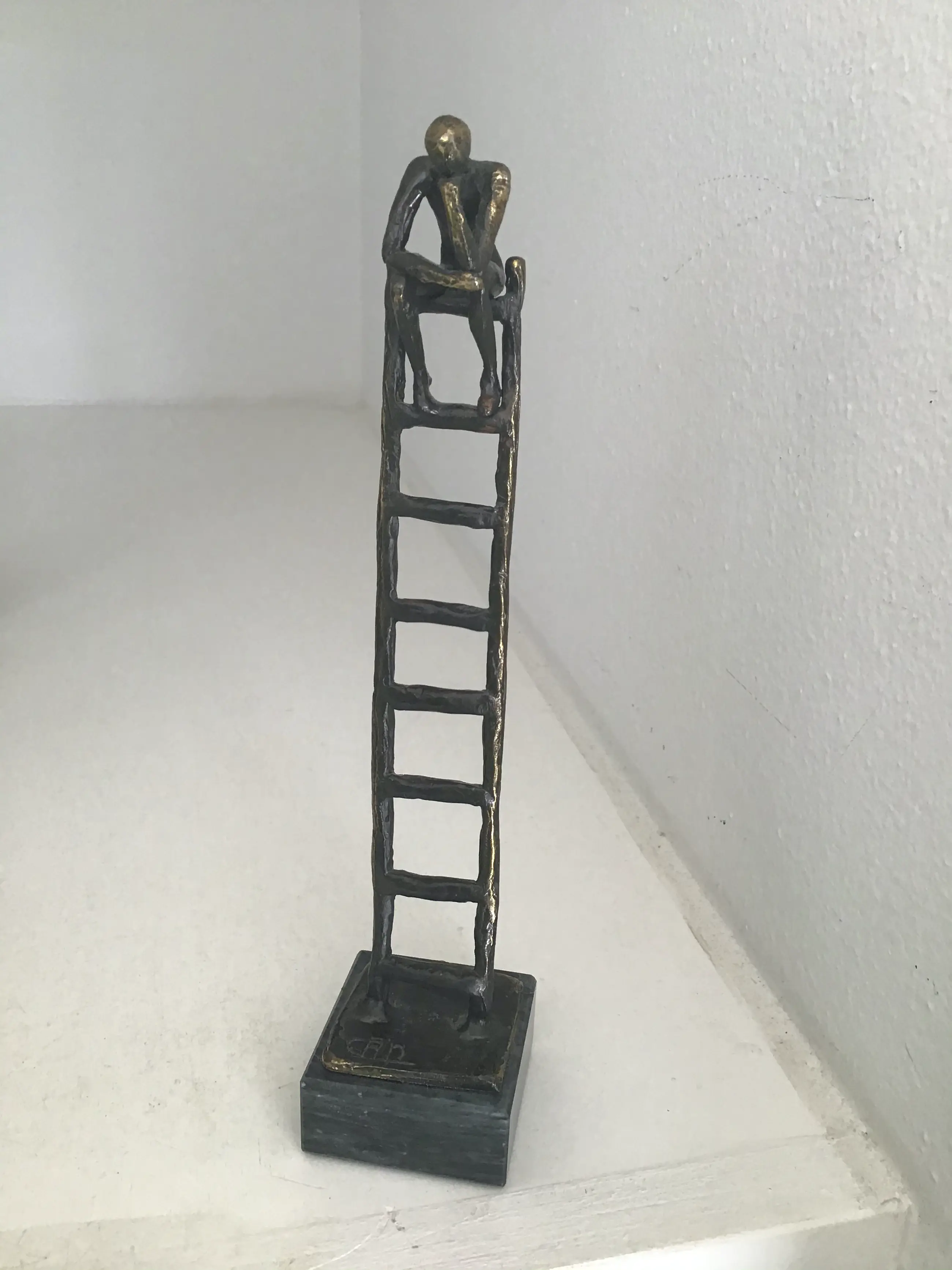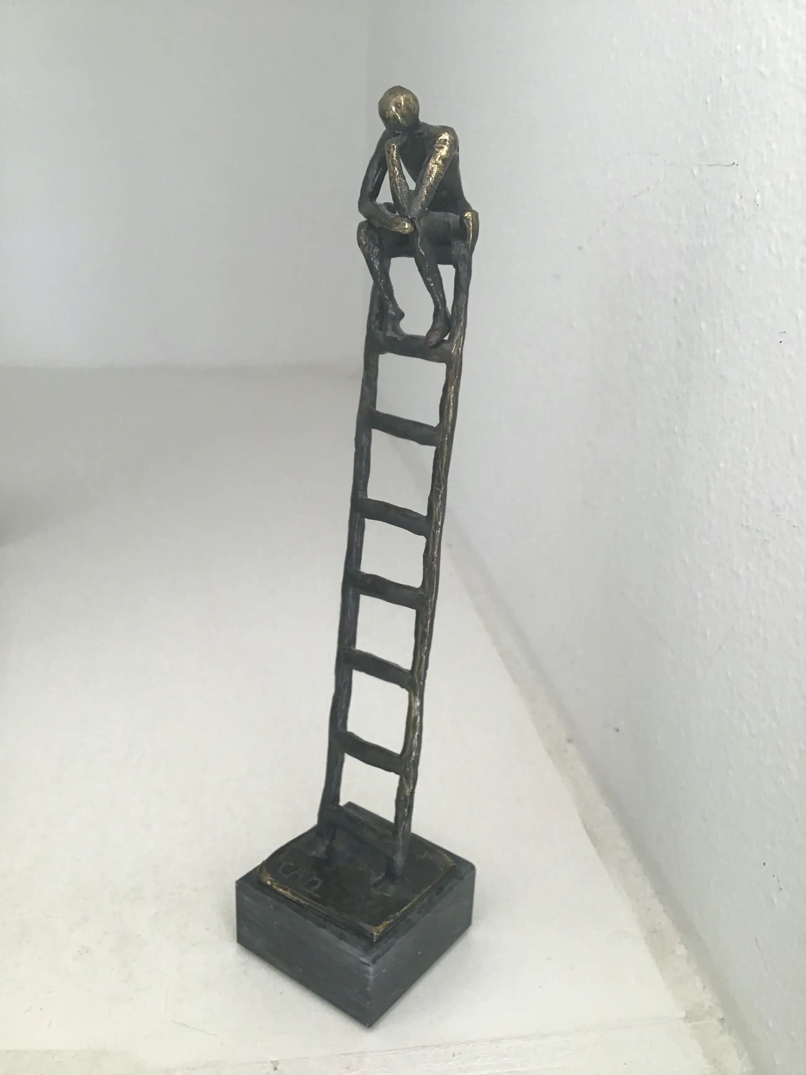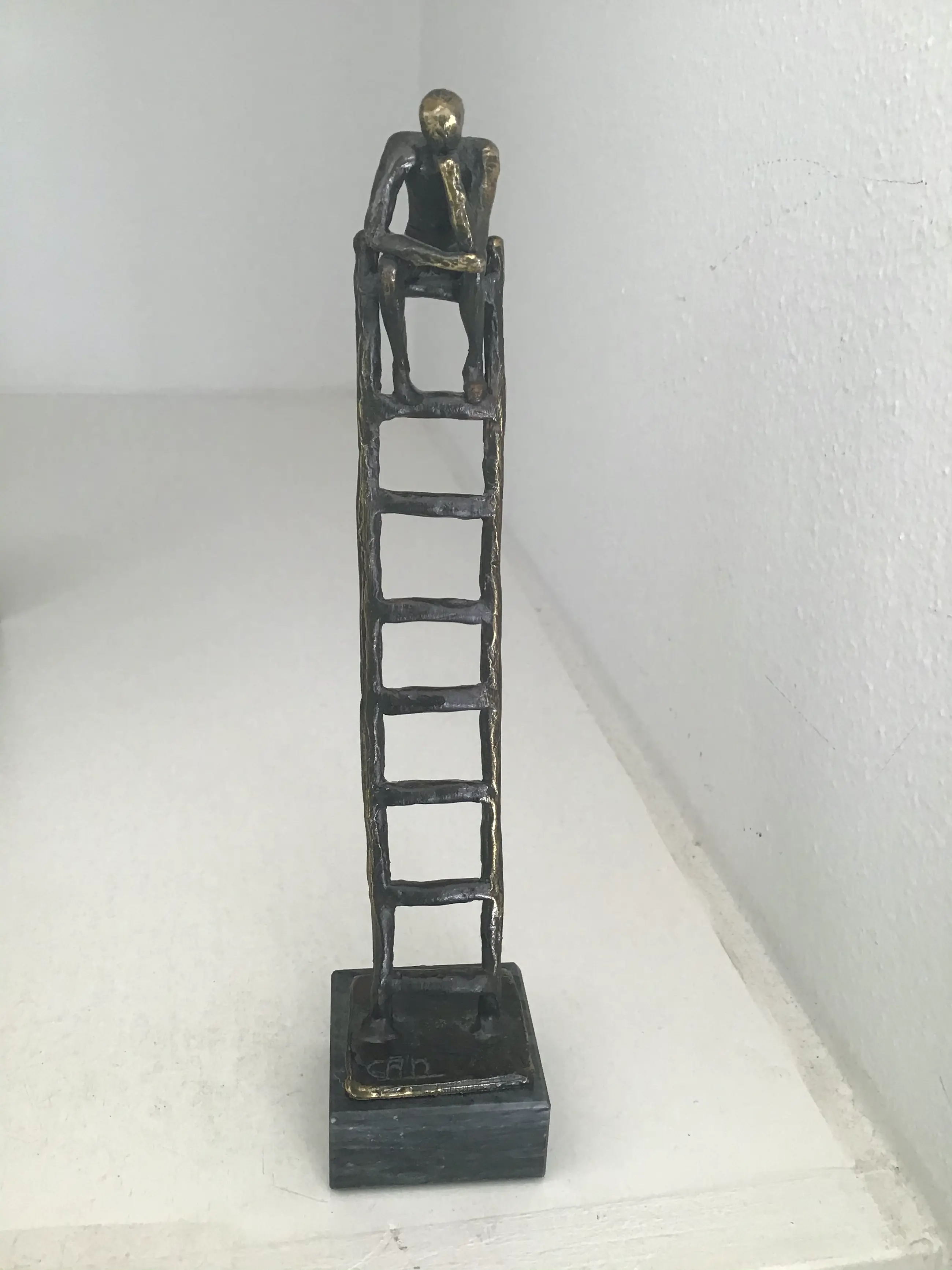 Mooi symbolisch sculptuur van een mensfiguur in overdenking boven op een ladder. Het betreft de originele variant met acht treden, een zeldzaam exemplaar! Hoogte : 18 cm Materiaal : Alloy en marmer Kunstenares : Corry Ammerlaan Het sculptuur verkeert in goede staat en wordt zorgvuldig verpakt en aangetekend verzonden