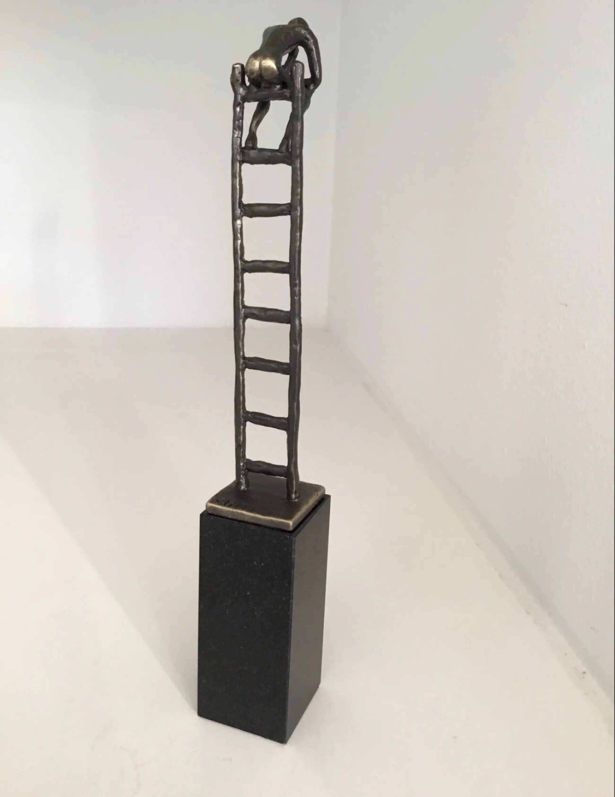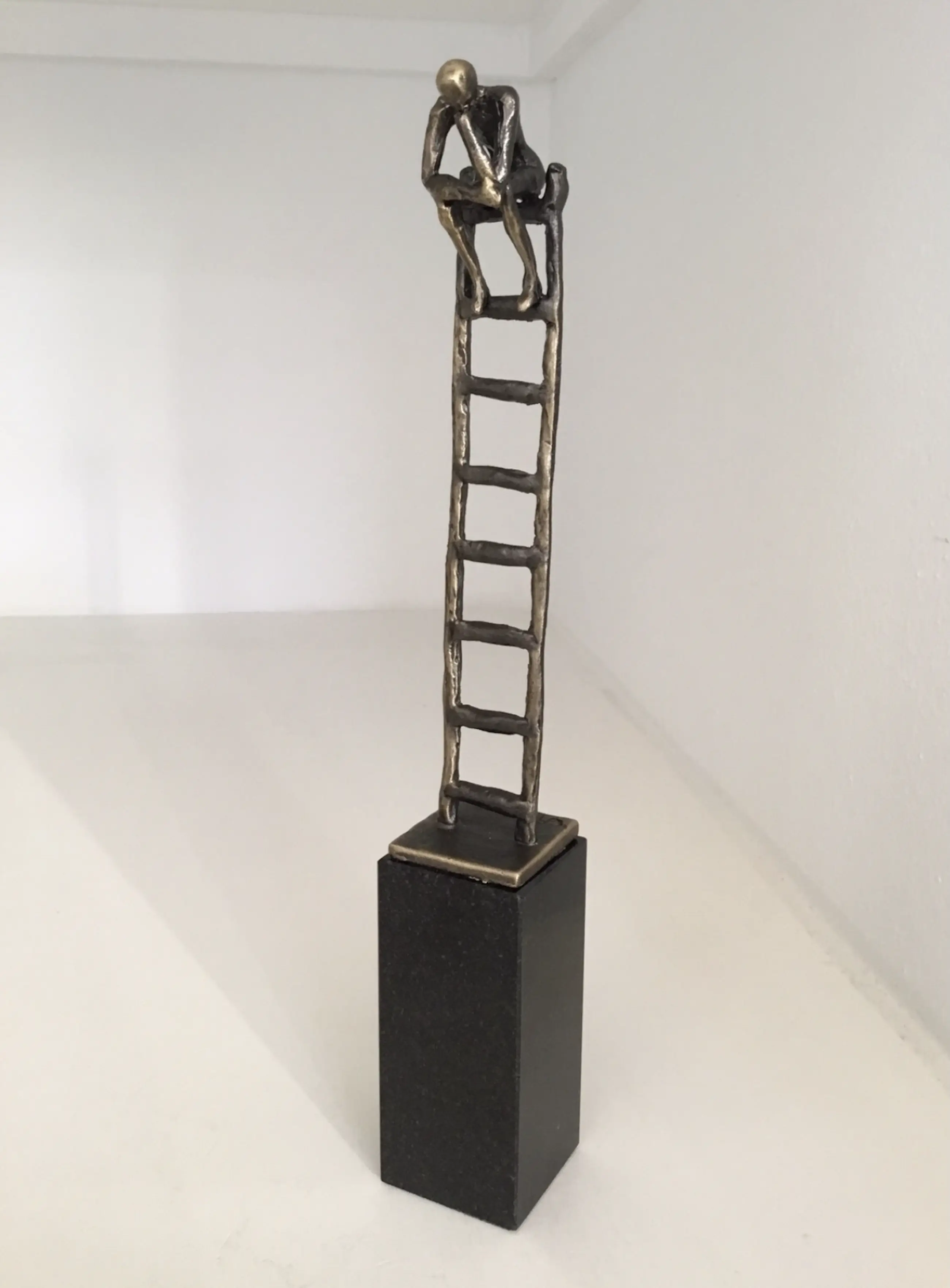 Mooi symbolisch sculptuur van een mensfiguur in overdenking boven op een ladder. Titel “ De denkende mens “ Hoogte : 23 cm Materiaal : verbronsd en marmer Kunstenares : Corry Ammerlaan Inclusief originele verpakking en info kaartje. Het sculptuur verkeert in nieuwstaat en wordt zorgvuldig verpakt en aangetekend verzonden