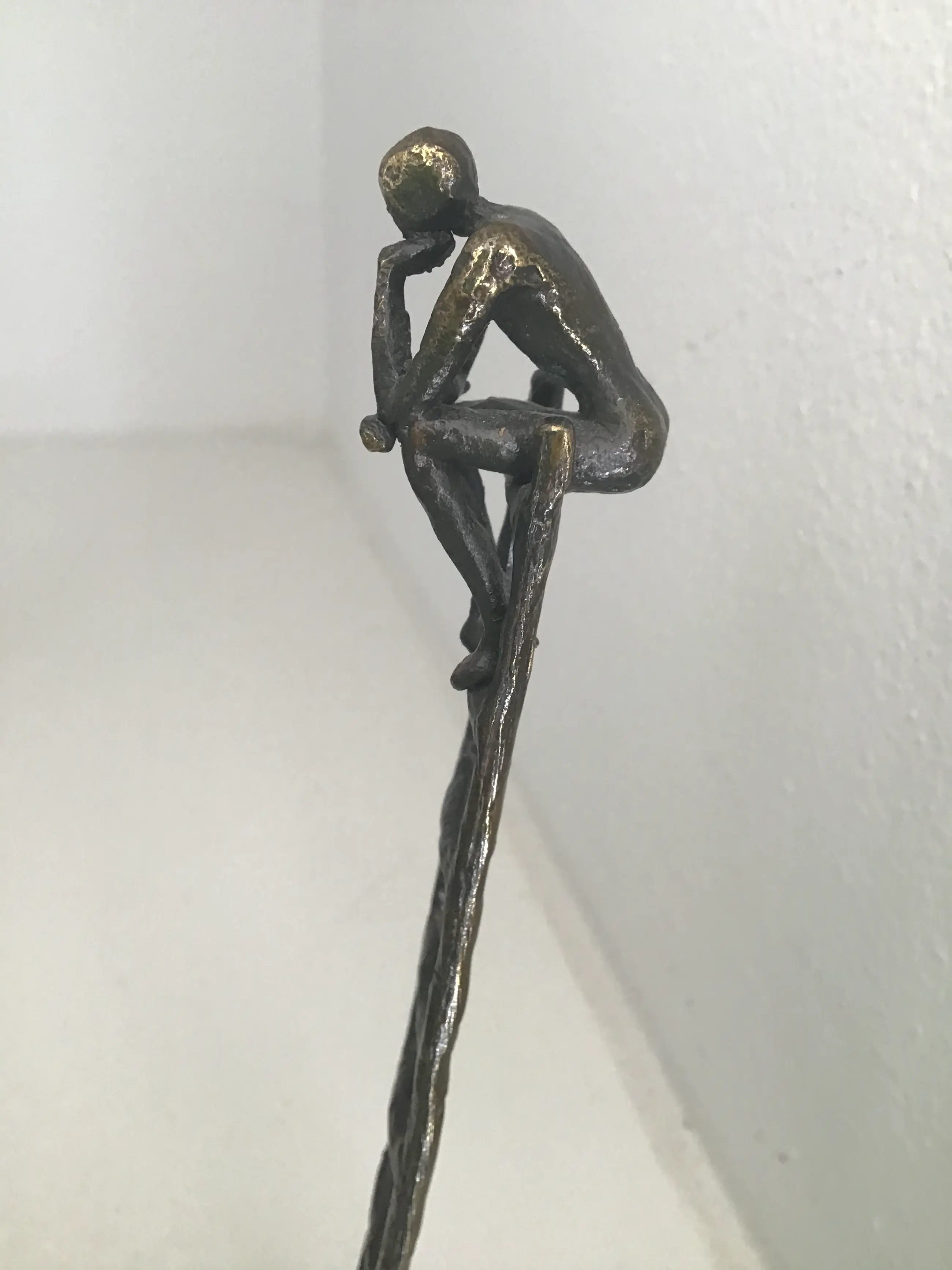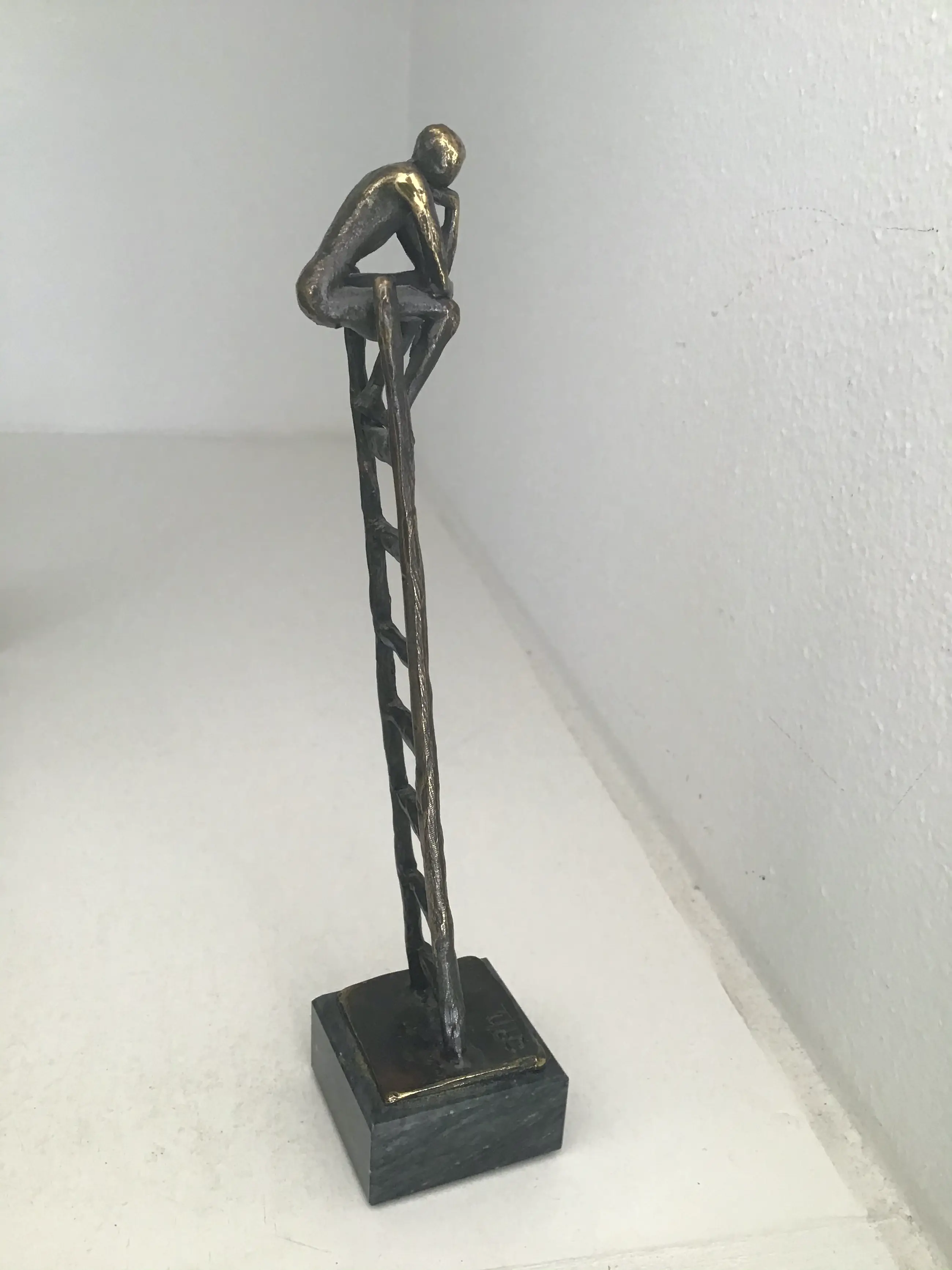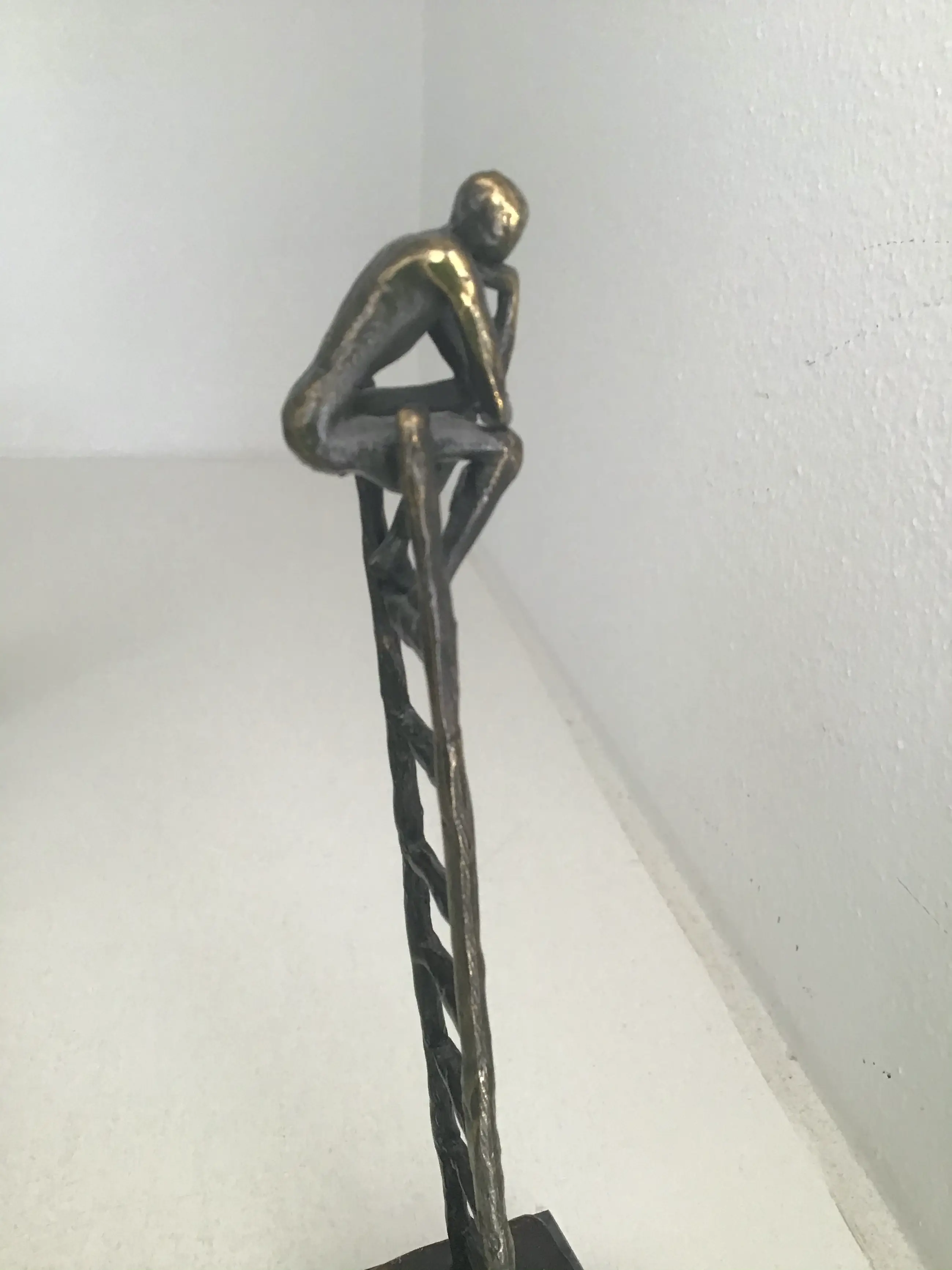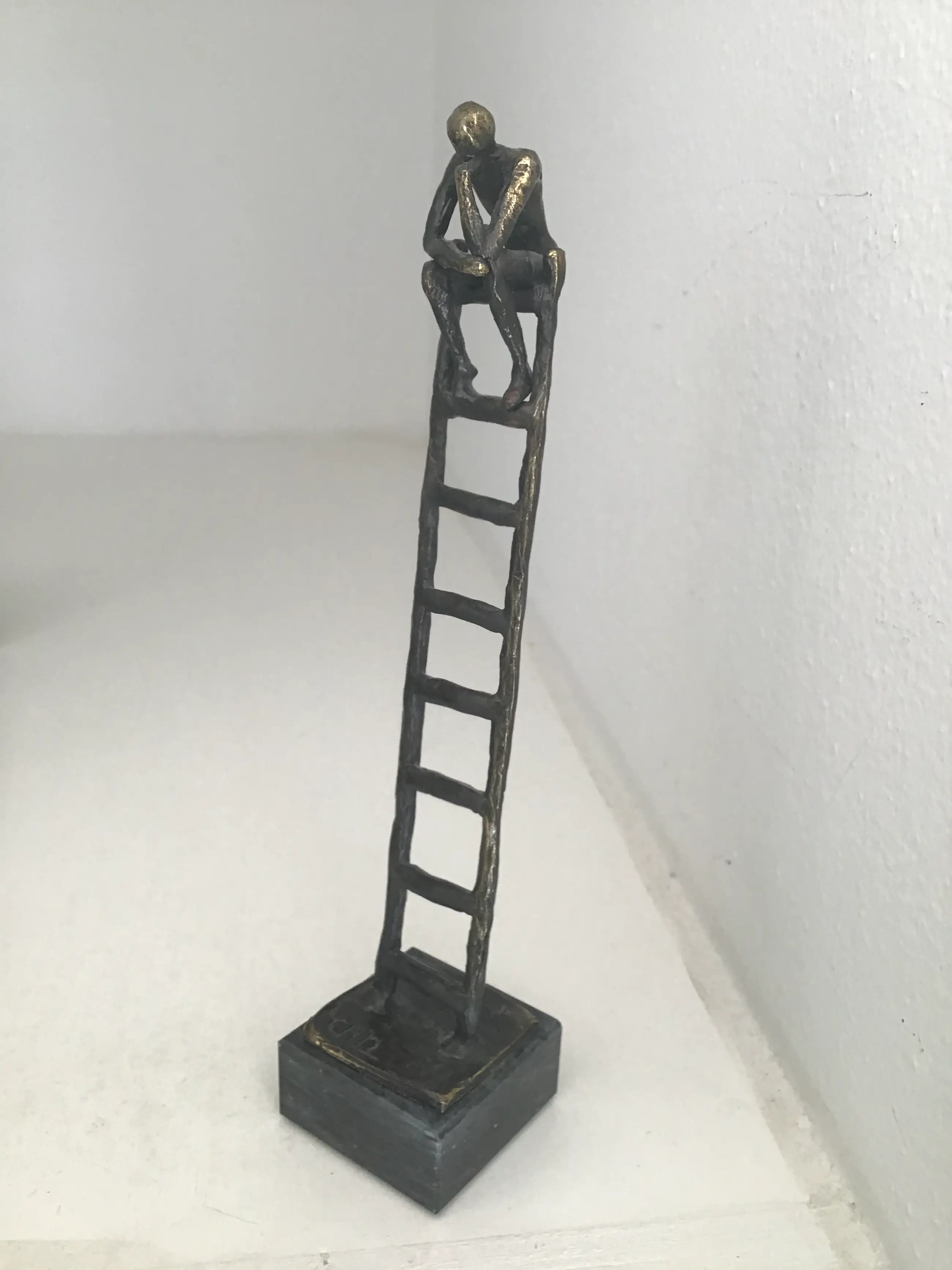 Mooi symbolisch sculptuur van een mensfiguur in overdenking boven op een ladder. Het betreft de originele variant met acht treden, een zeldzaam exemplaar! Hoogte : 18 cm Materiaal : Alloy en marmer Kunstenares : Corry Ammerlaan Het beeld is gesigneerd: CAN Het sculptuur verkeert in goede staat en wordt zorgvuldig verpakt en aangetekend verzonden